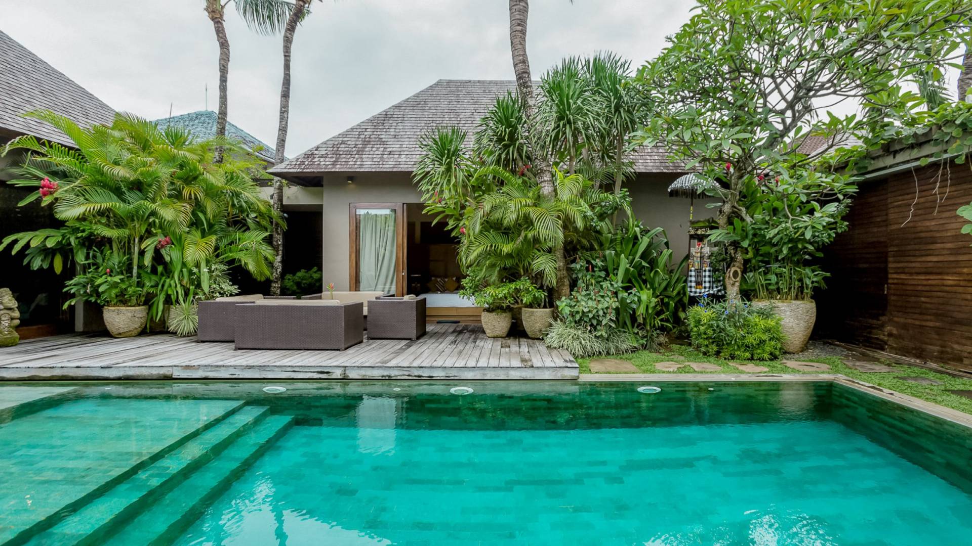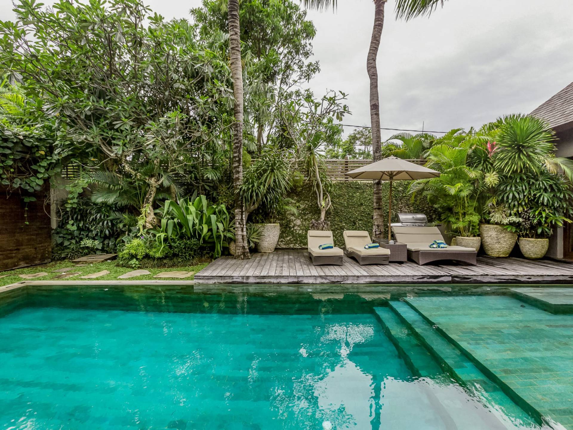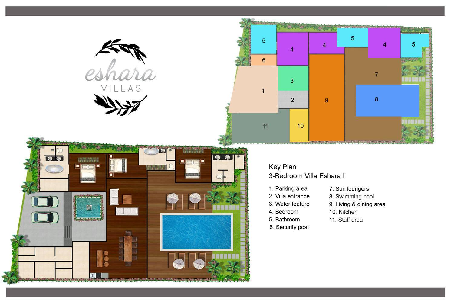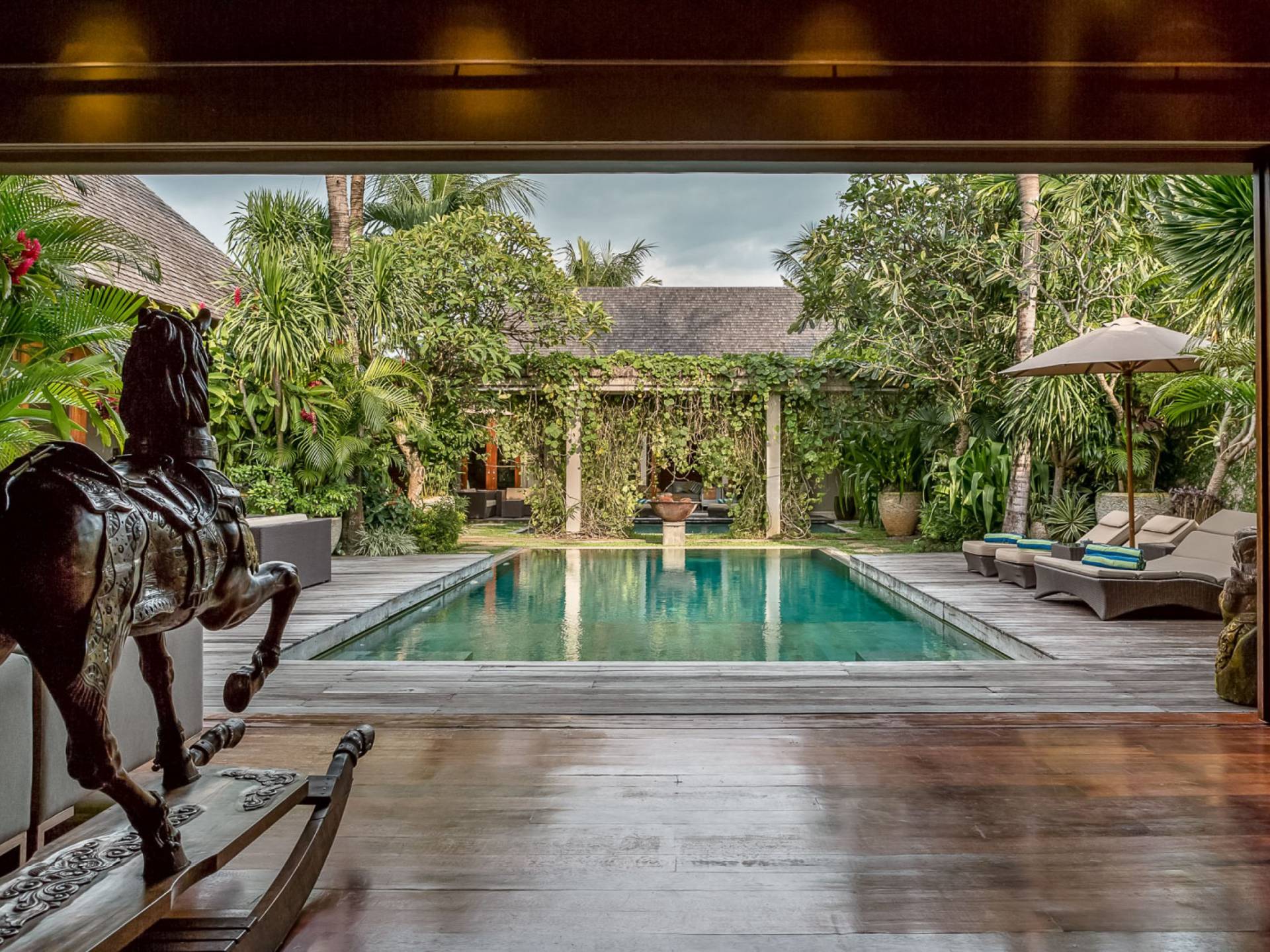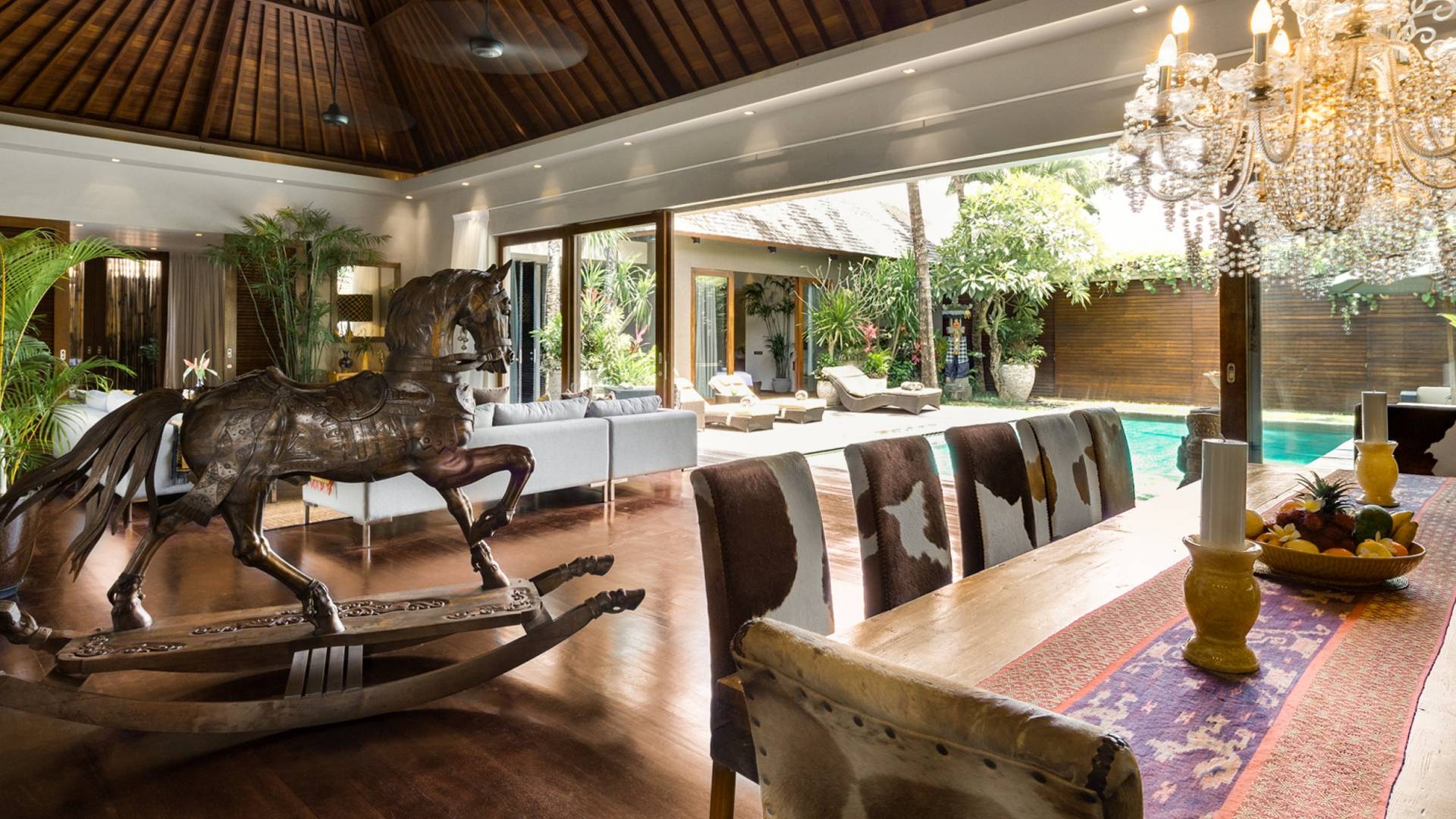 Villa Eshara è una grande villa completamente attrezzata, situata in una strada tranquilla e silenziosa a soli 300 metri dalla spiaggia, dai negozi e dai ristoranti del centro di Seminyak. Questa versatile struttura tre in uno offre la scelta di un'opzione di affitto di 8, 5, 3 o 2 camere da letto grazie a un sistema intelligente di porte scorrevoli e ingressi separati. Ogni villa ha un soggiorno e una sala da pranzo glamour e una cucina integrata, mentre ogni camera da letto con bagno privato ha un letto king-size, una zona spogliatoio e un lettore TV / DVD. Ci sono anche tre piscine immerse in giardini tropicali complete di alberi di frangipani, palme da cocco, lettini e ponti in legno.
