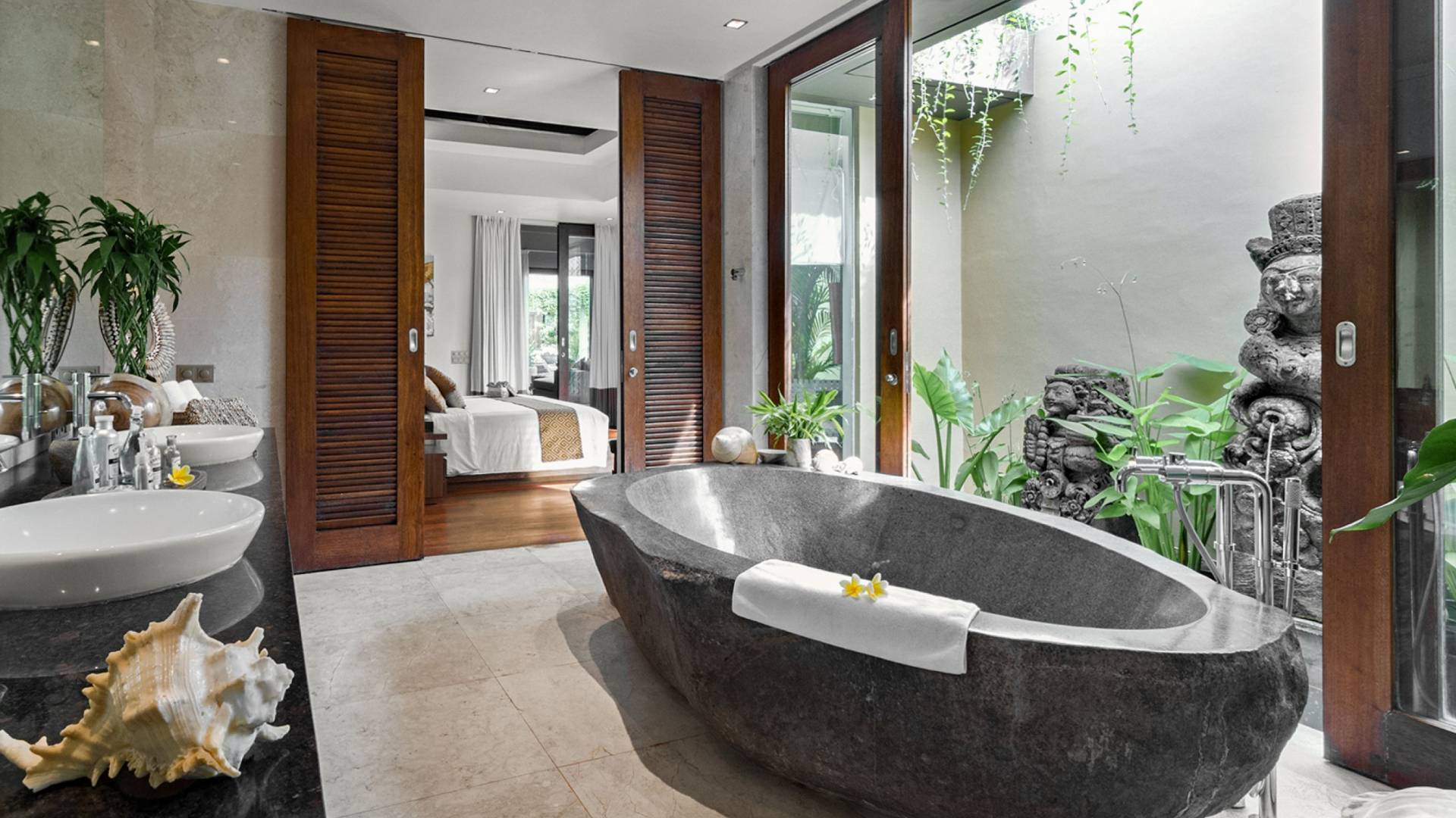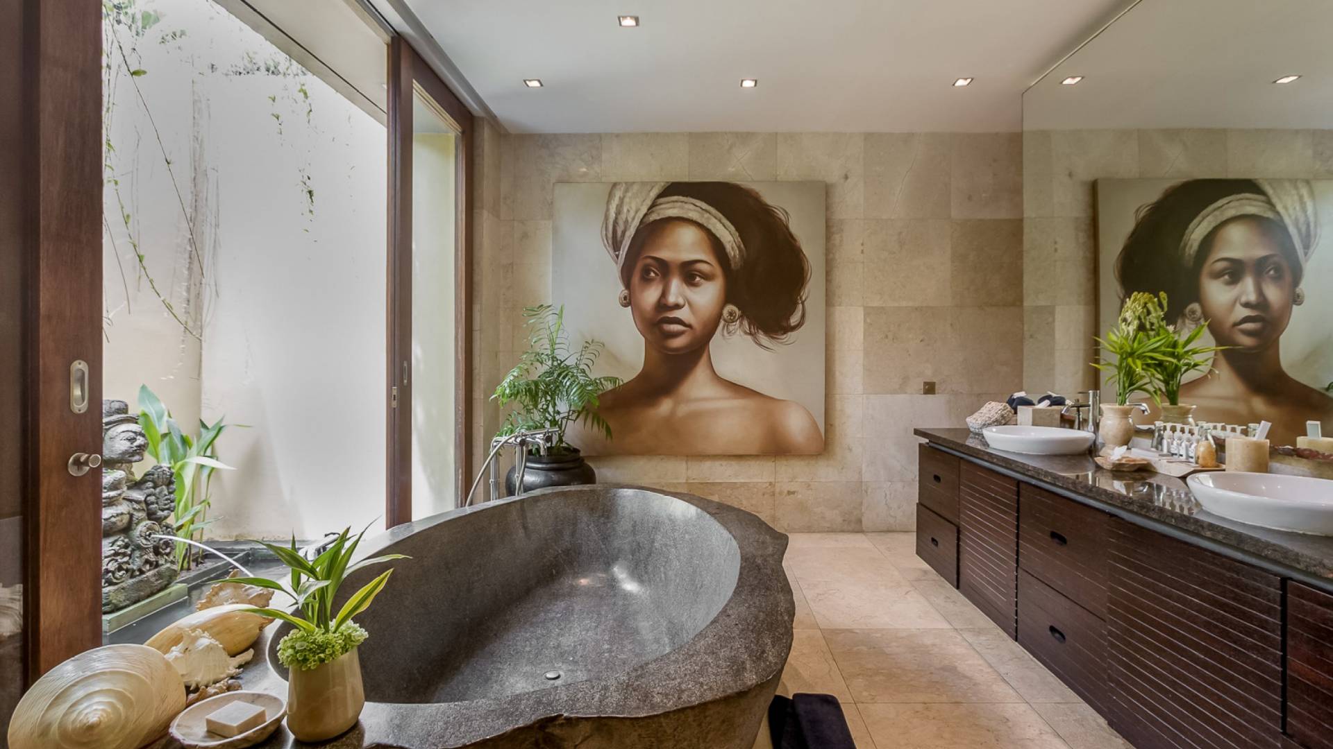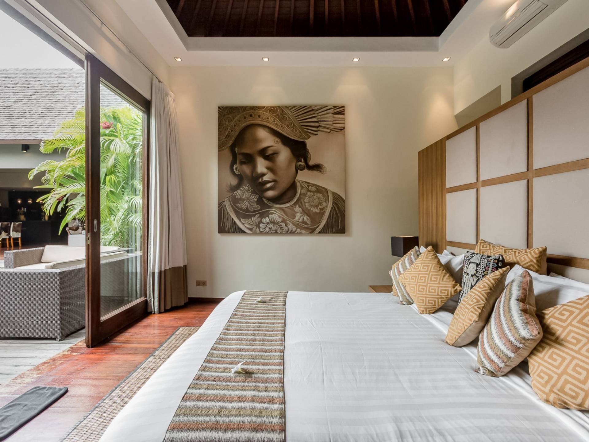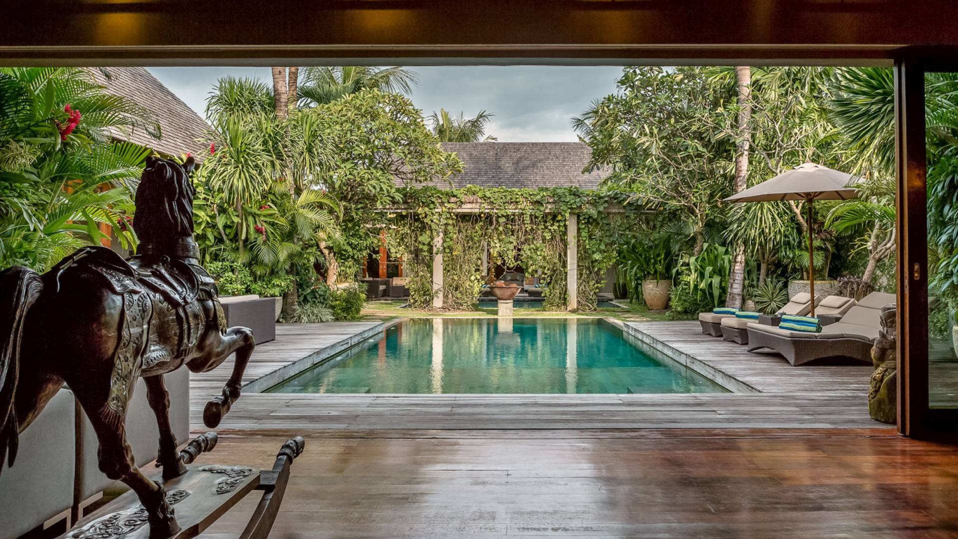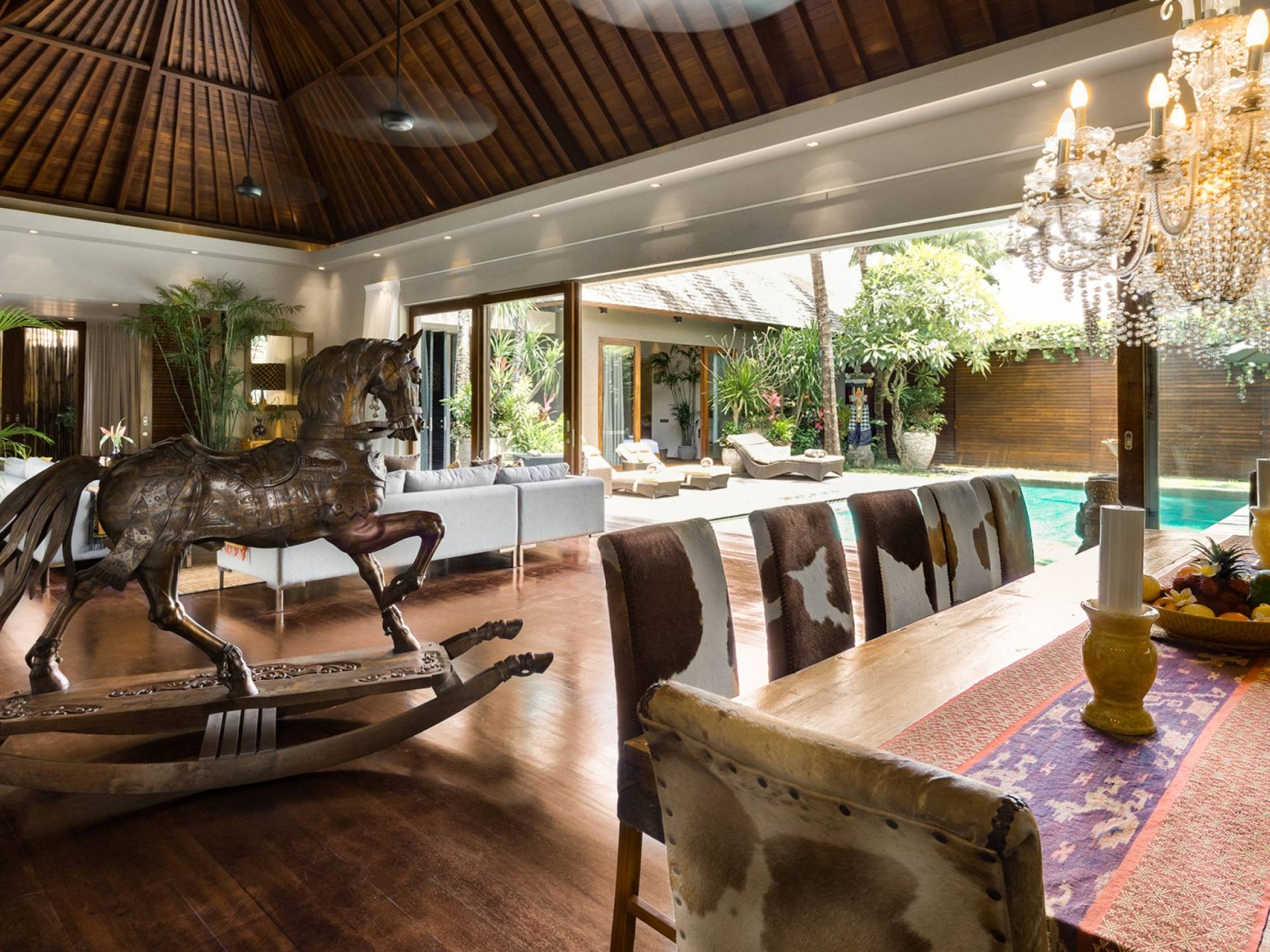 Villa Eshara è una grande villa completamente attrezzata, situata in una strada tranquilla e silenziosa a soli 300 metri dalla spiaggia, dai negozi e dai ristoranti del centro di Seminyak. Questa versatile struttura tre in uno offre la scelta di un'opzione di affitto di 8, 5, 3 o 2 camere da letto grazie a un sistema intelligente di porte scorrevoli e ingressi separati. Ogni villa ha un soggiorno e una sala da pranzo glamour e una cucina integrata, mentre ogni camera da letto con bagno privato ha un letto king-size, una zona spogliatoio e un lettore TV / DVD. Ci sono anche tre piscine immerse in giardini tropicali complete di alberi di frangipani, palme da cocco, lettini e ponti in legno.