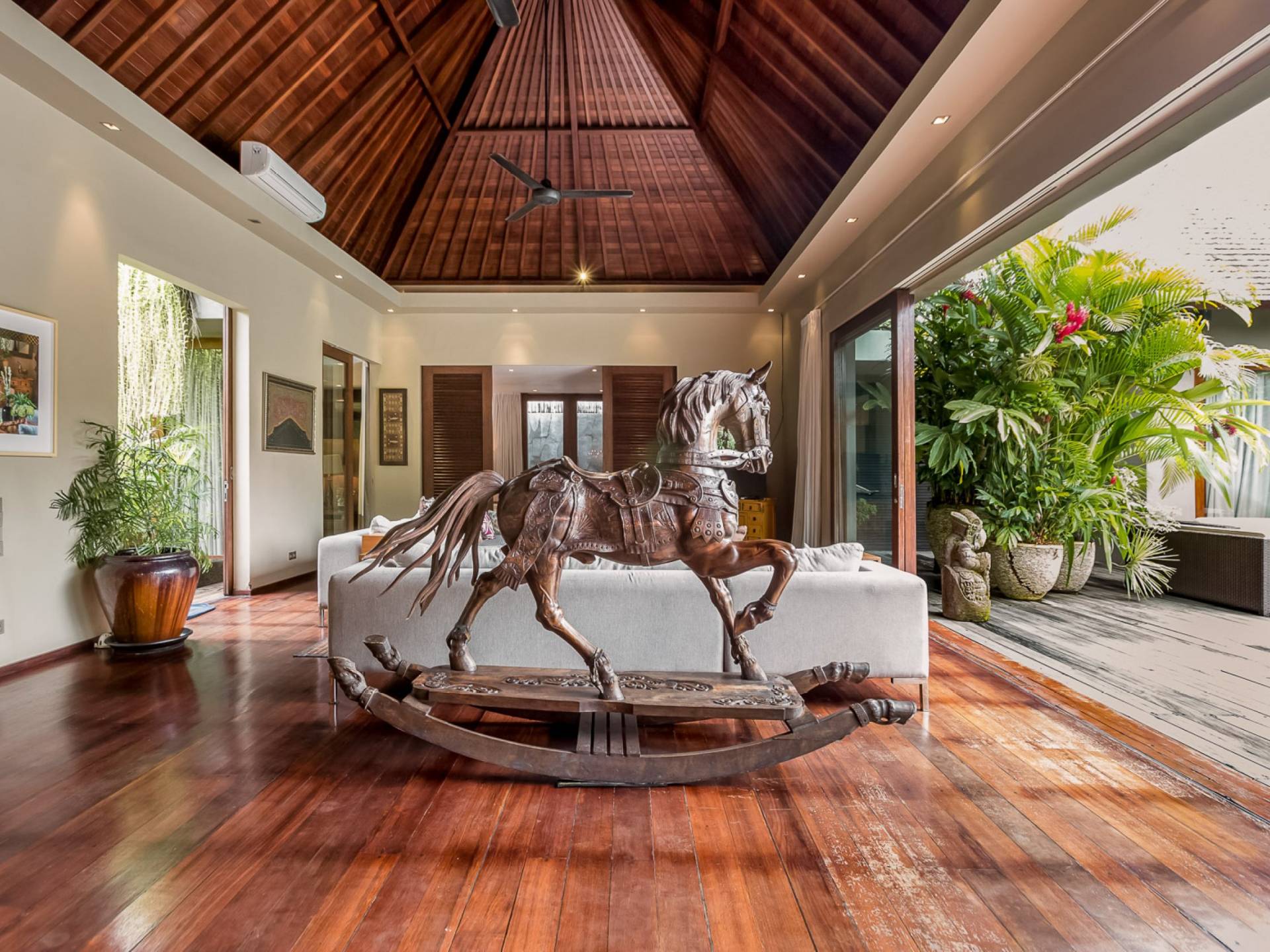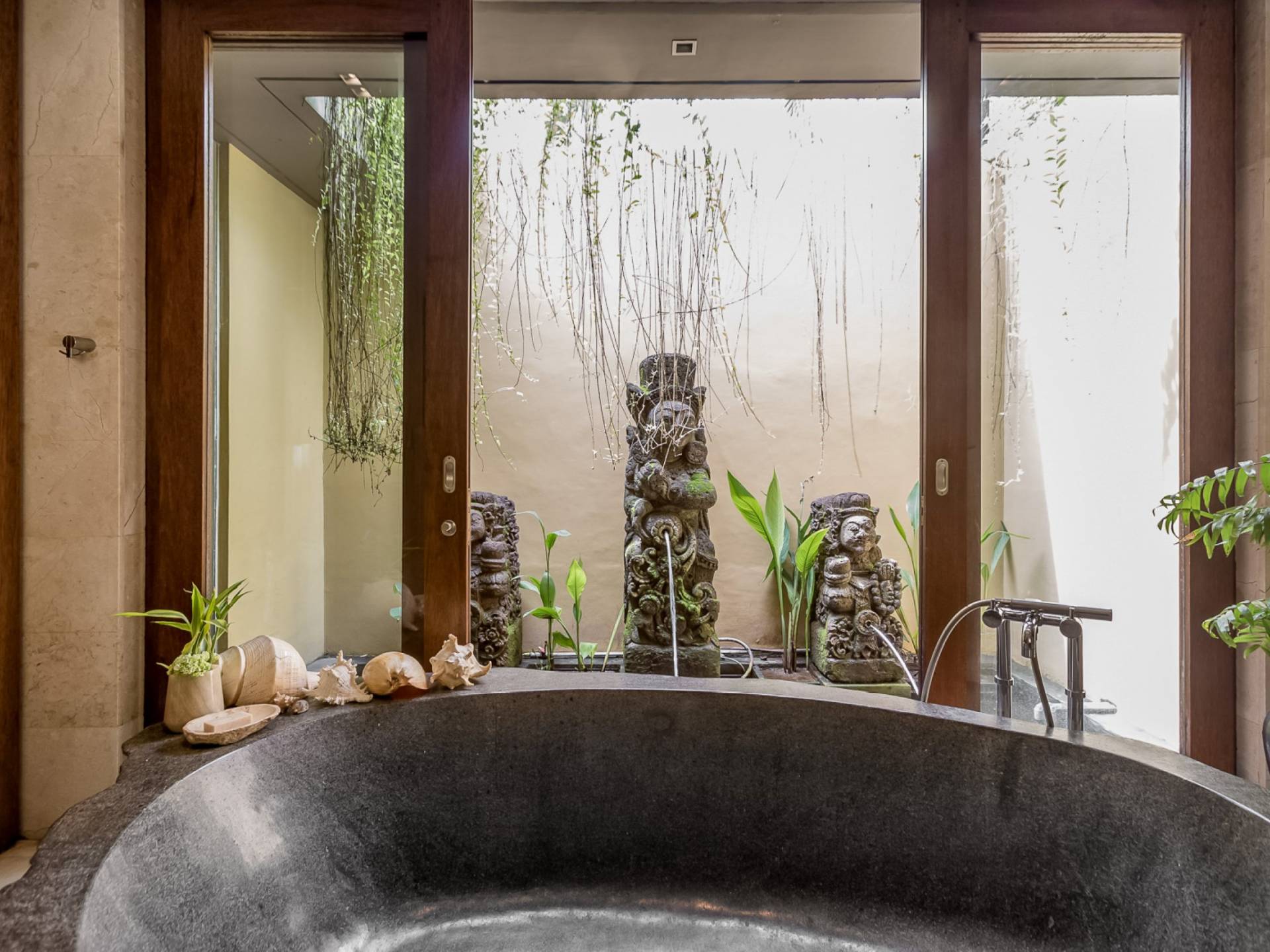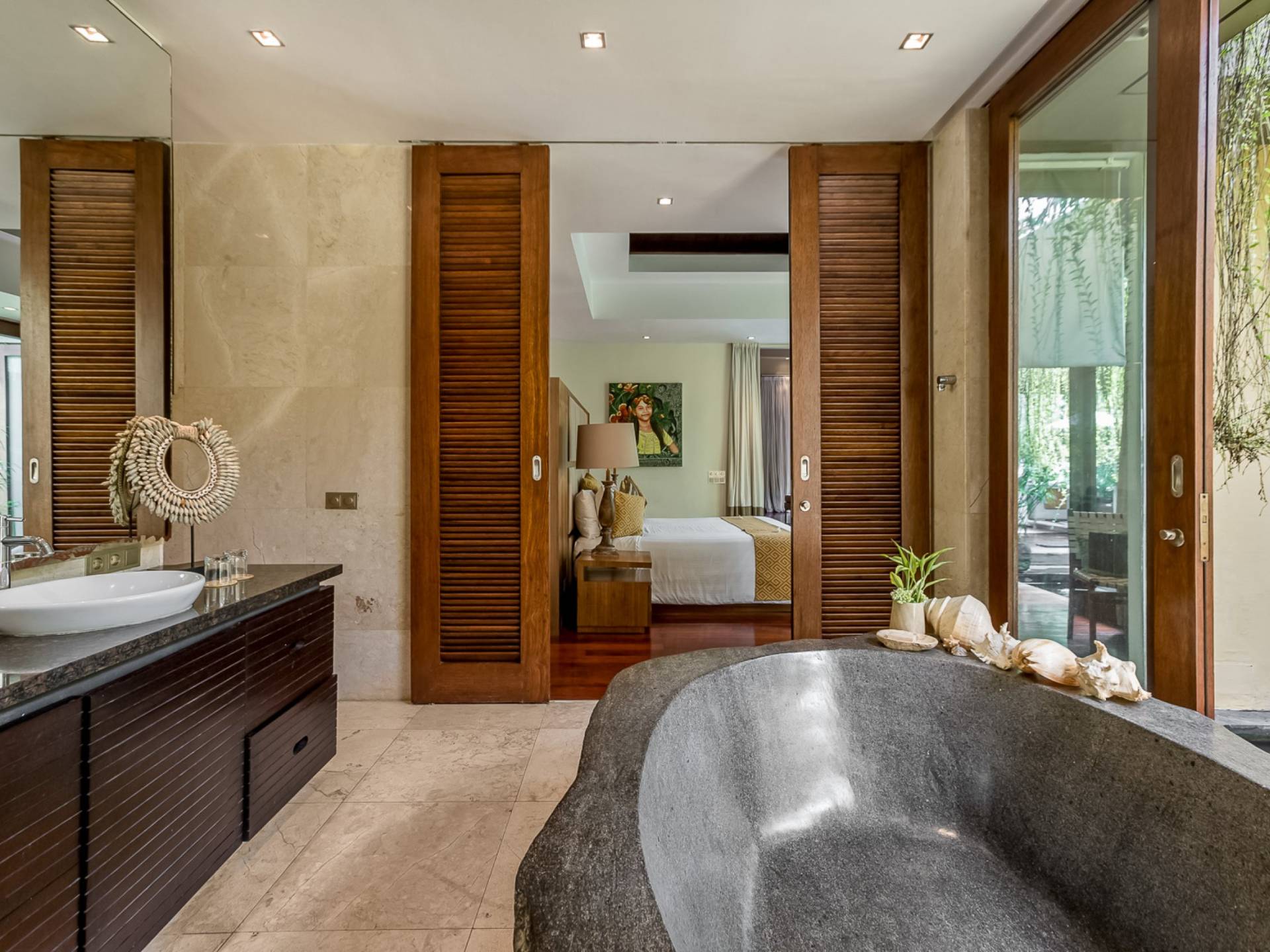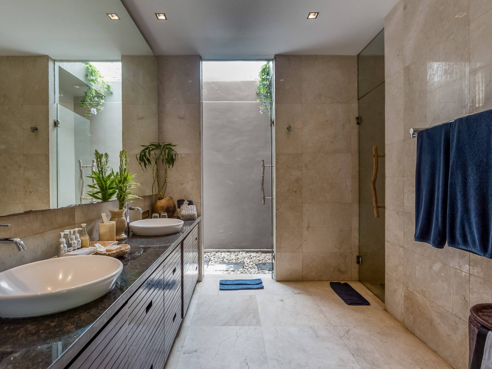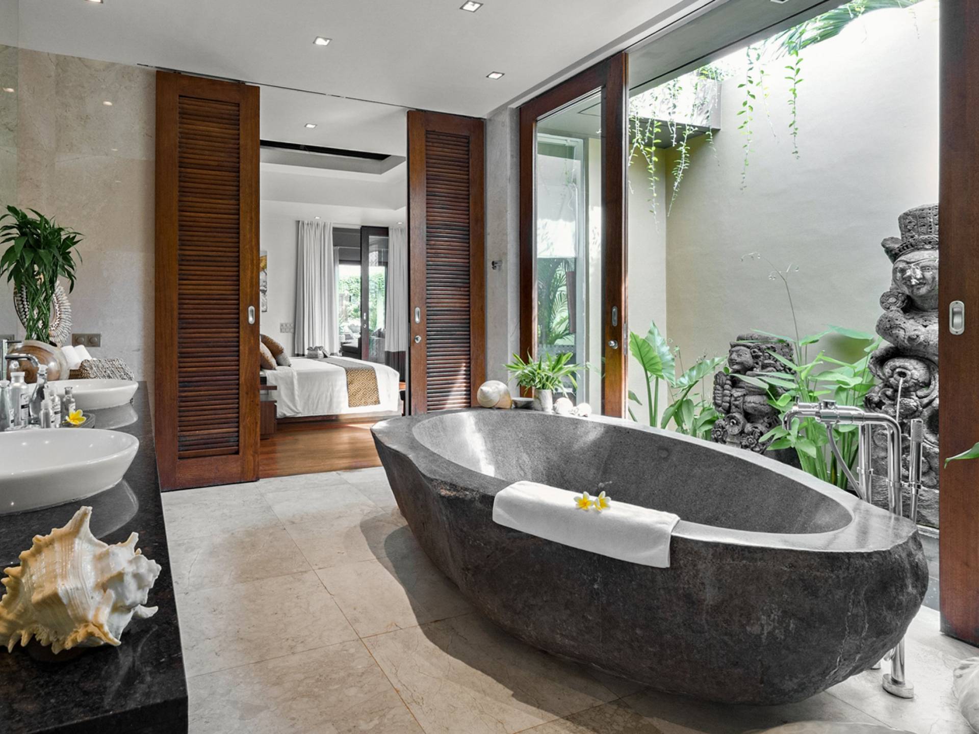 Villa Eshara è una grande villa completamente attrezzata, situata in una strada tranquilla e silenziosa a soli 300 metri dalla spiaggia, dai negozi e dai ristoranti del centro di Seminyak. Questa versatile struttura tre in uno offre la scelta di un'opzione di affitto di 8, 5, 3 o 2 camere da letto grazie a un sistema intelligente di porte scorrevoli e ingressi separati. Ogni villa ha un soggiorno e una sala da pranzo glamour e una cucina integrata, mentre ogni camera da letto con bagno privato ha un letto king-size, una zona spogliatoio e un lettore TV / DVD. Ci sono anche tre piscine immerse in giardini tropicali complete di alberi di frangipani, palme da cocco, lettini e ponti in legno.
