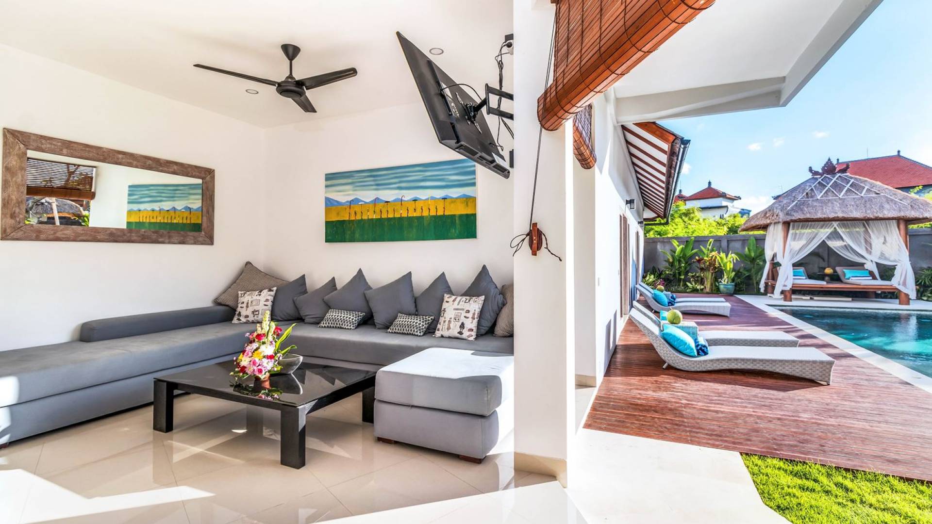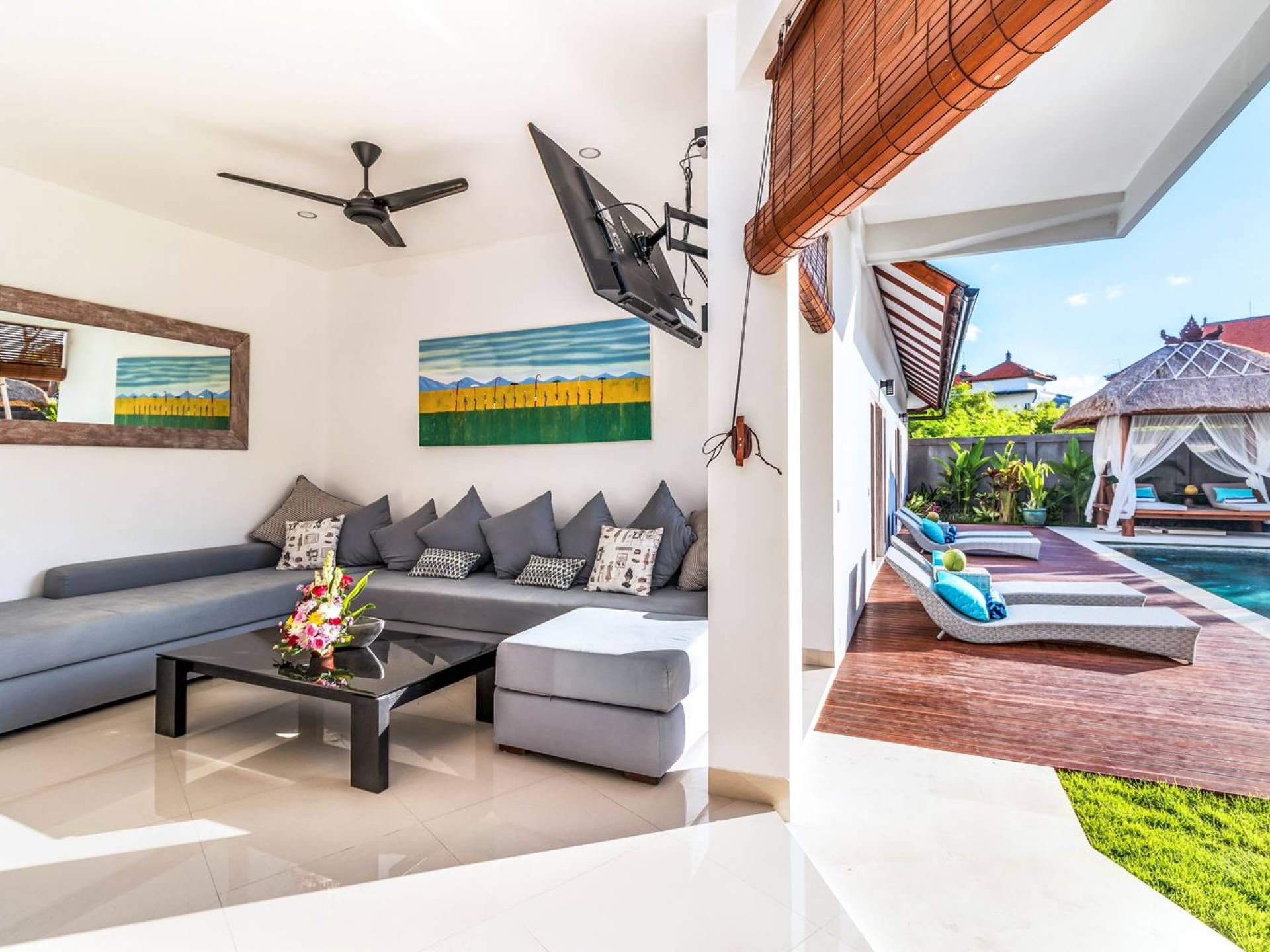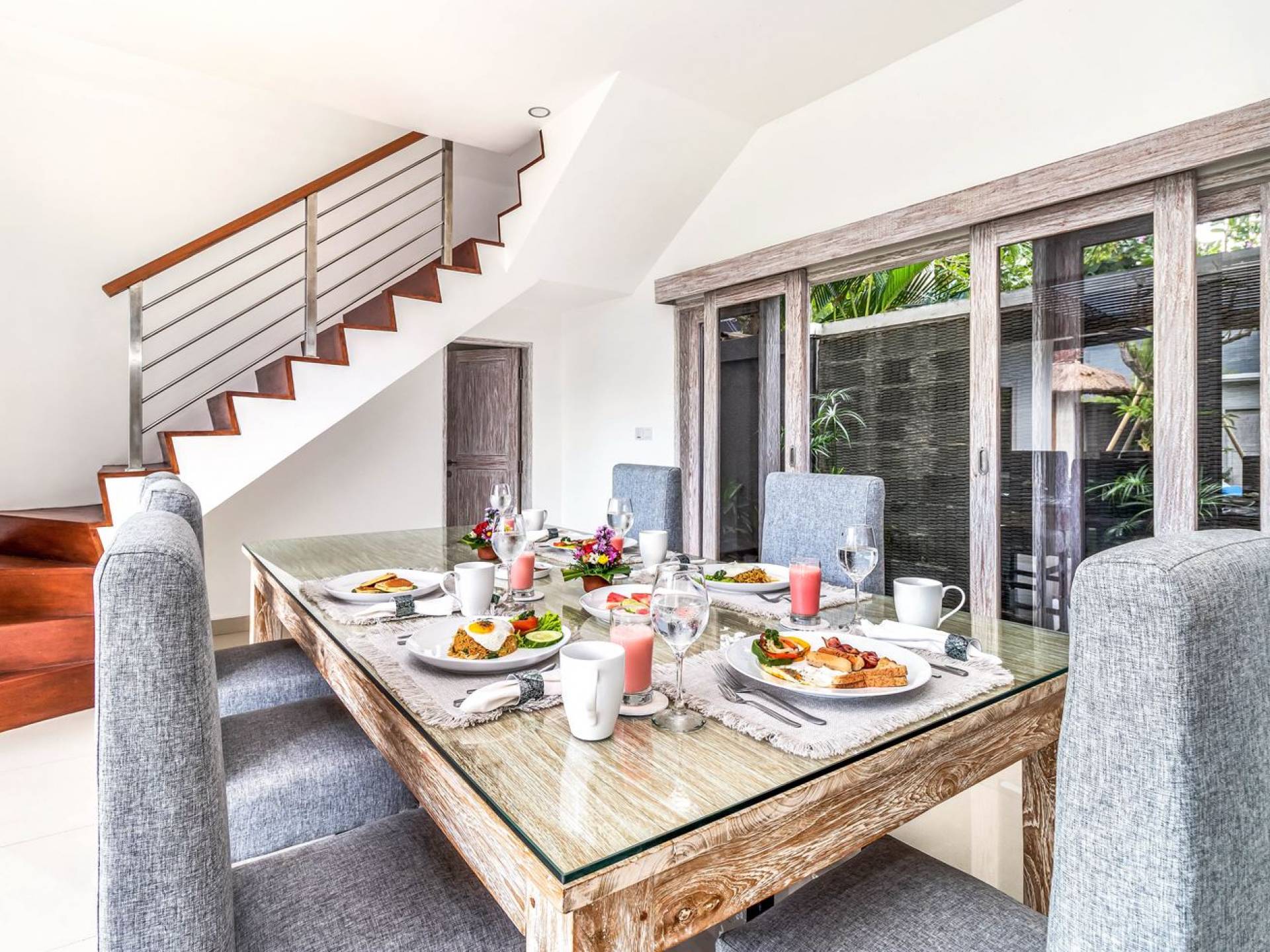 Anche il design architettonico di Villa Hiburan 1 è sbalorditivo e dal giardino si accede direttamente all'ampio soggiorno a pianta aperta, arredato elegantemente con tanto stile contemporaneo e tanto fascino tropicale. Mobili in legno imbiancato, manufatti tropicali, dipinti e comfort moderni come un ampio e comodo divano che si affaccia su una grande TV a schermo piatto con canali via cavo. La cucina è dotata di elettrodomestici all'avanguardia e dispone di un bar per la colazione con seggioloni. Ascolta un po' di musica, prendi delle bibite fresche e avrai un perfetto luogo di ritrovo al coperto! C'è un grande tavolo da pranzo in legno con ripiano in vetro e per rendere l'atmosfera ancora più tranquilla e tropicale, c'è una cascata a cascata nella parte posteriore del soggiorno, proprio dietro alcune porte scorrevoli in vetro a tutta lunghezza. Perfetto! Quindi, vai avanti, tuffati in piscina, rilassati sul divano, guarda un po' di TV, bevi un drink al bar e cena tutti insieme con la vista del giardino e dei suoni della natura, Batu Belig Beach è a pochi passi di distanza e in 5 minuti puoi fare shopping e cenare a Seminyak.