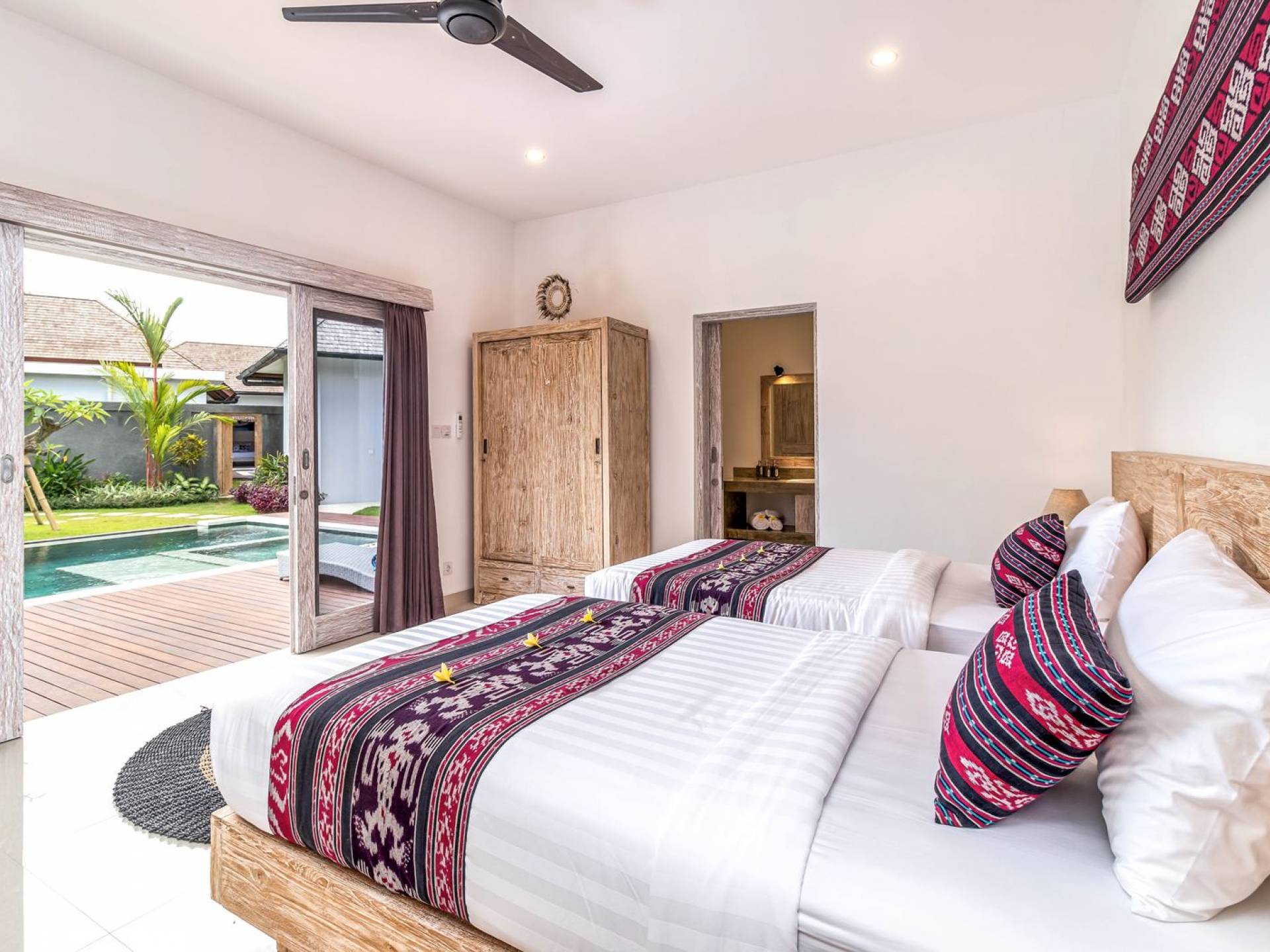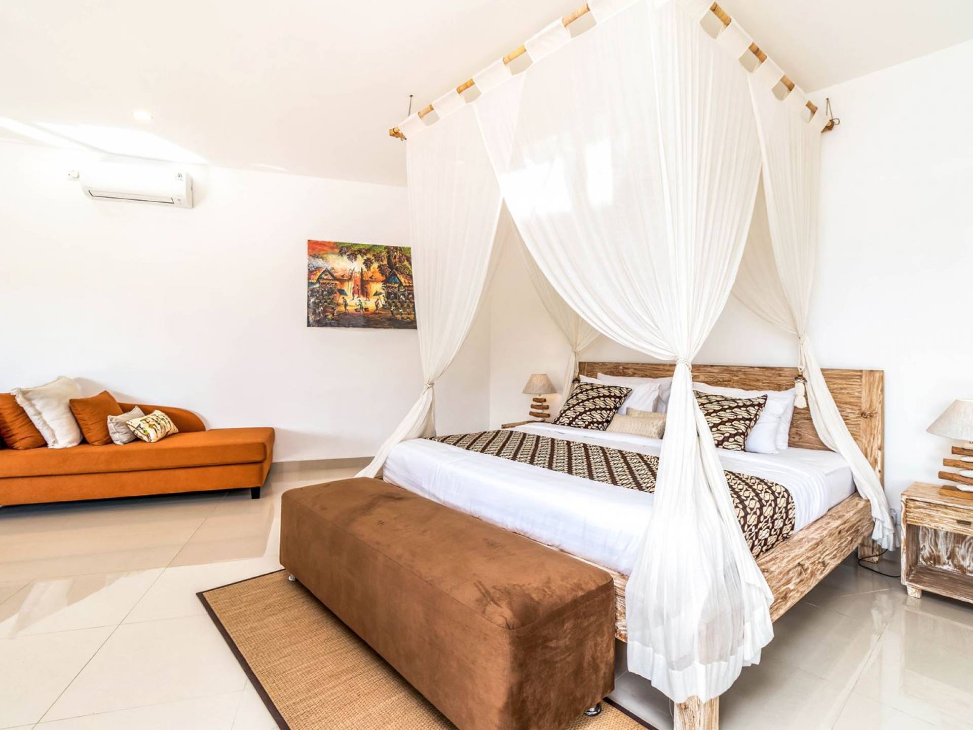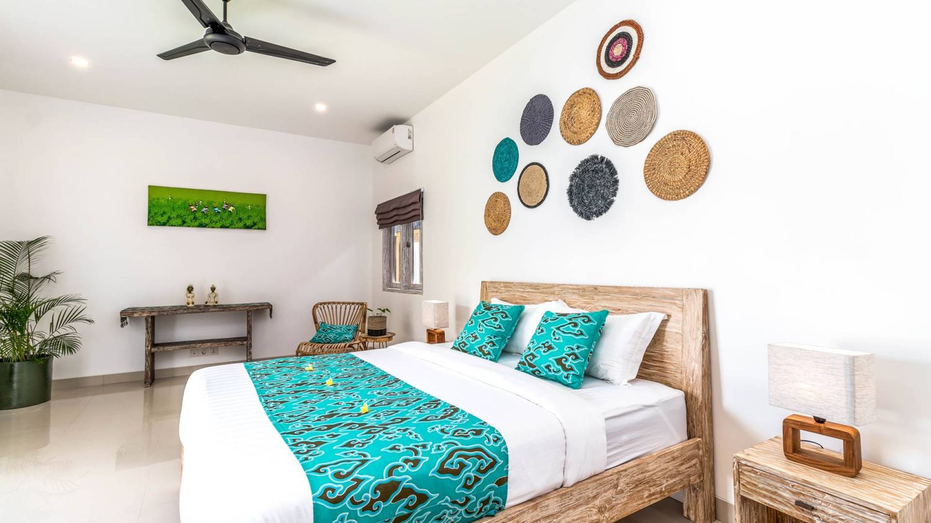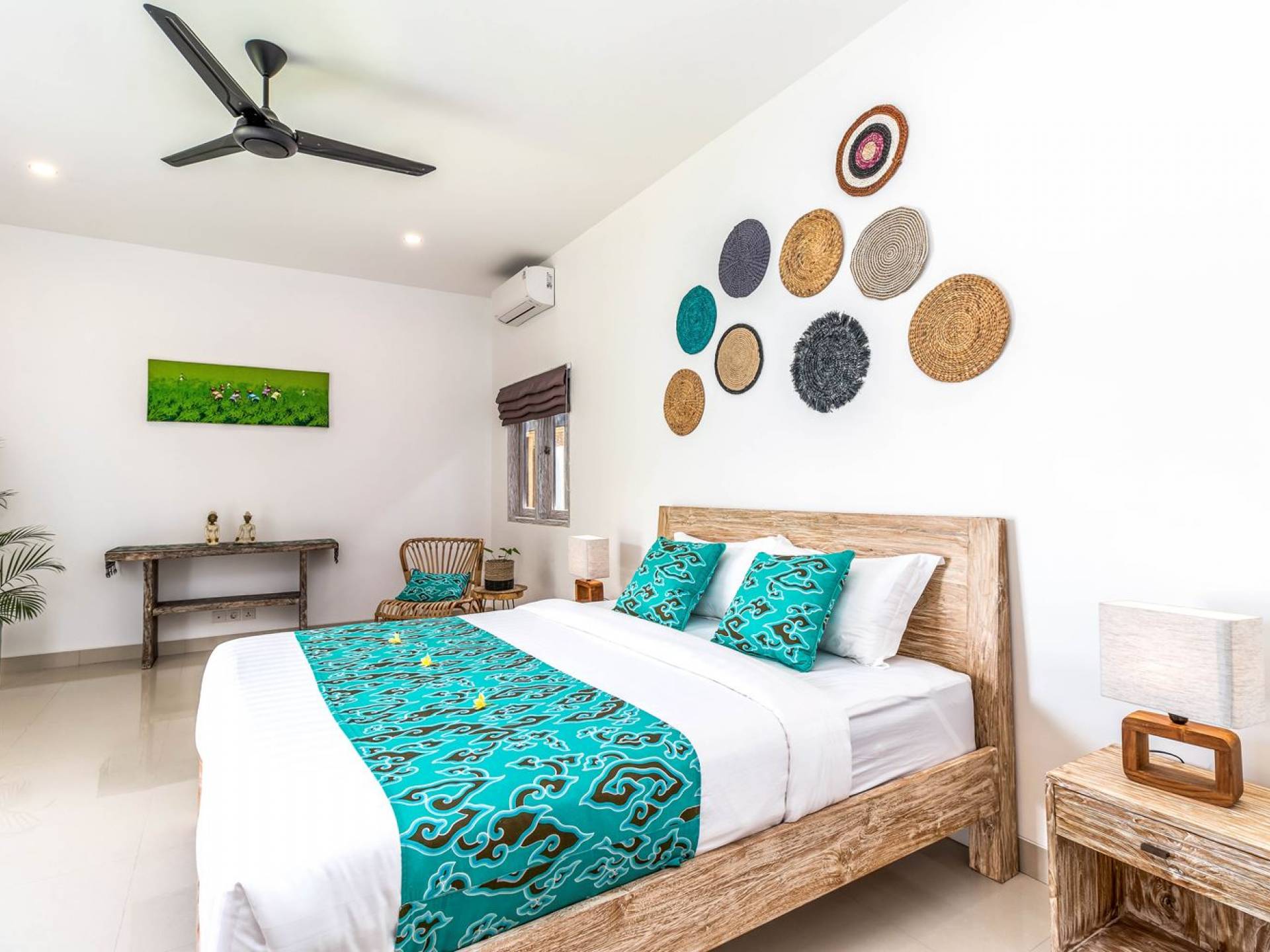 Questa splendida tenuta per le vacanze dispone di 4 spaziose camere da letto con aria condizionata. La camera da letto principale è come la suite di un re, enormemente grande, imbevuta di luce solare naturale e governata da un design d'interni tropicale chic. Questa camera da letto decadente è stata progettata con porte in vetro che si aprono su un ampio balcone con 2 sedie. Un ottimo posto per sedersi e prendere il sole del mattino con una tazza di caffè. Nel pomeriggio, porta una bottiglia di vino e goditi la vista del giardino sullo sfondo o di un cielo abbronzato. Le altre 3 camere da letto si trovano al piano di sotto, attorno al giardino e all'area della piscina. Delle 4 camere da letto, 3 hanno letti matrimoniali e 1 ha due letti singoli. Ogni camera dispone di bagno privato in camera con set di cortesia, doccia con getto a pioggia e cassette di sicurezza.