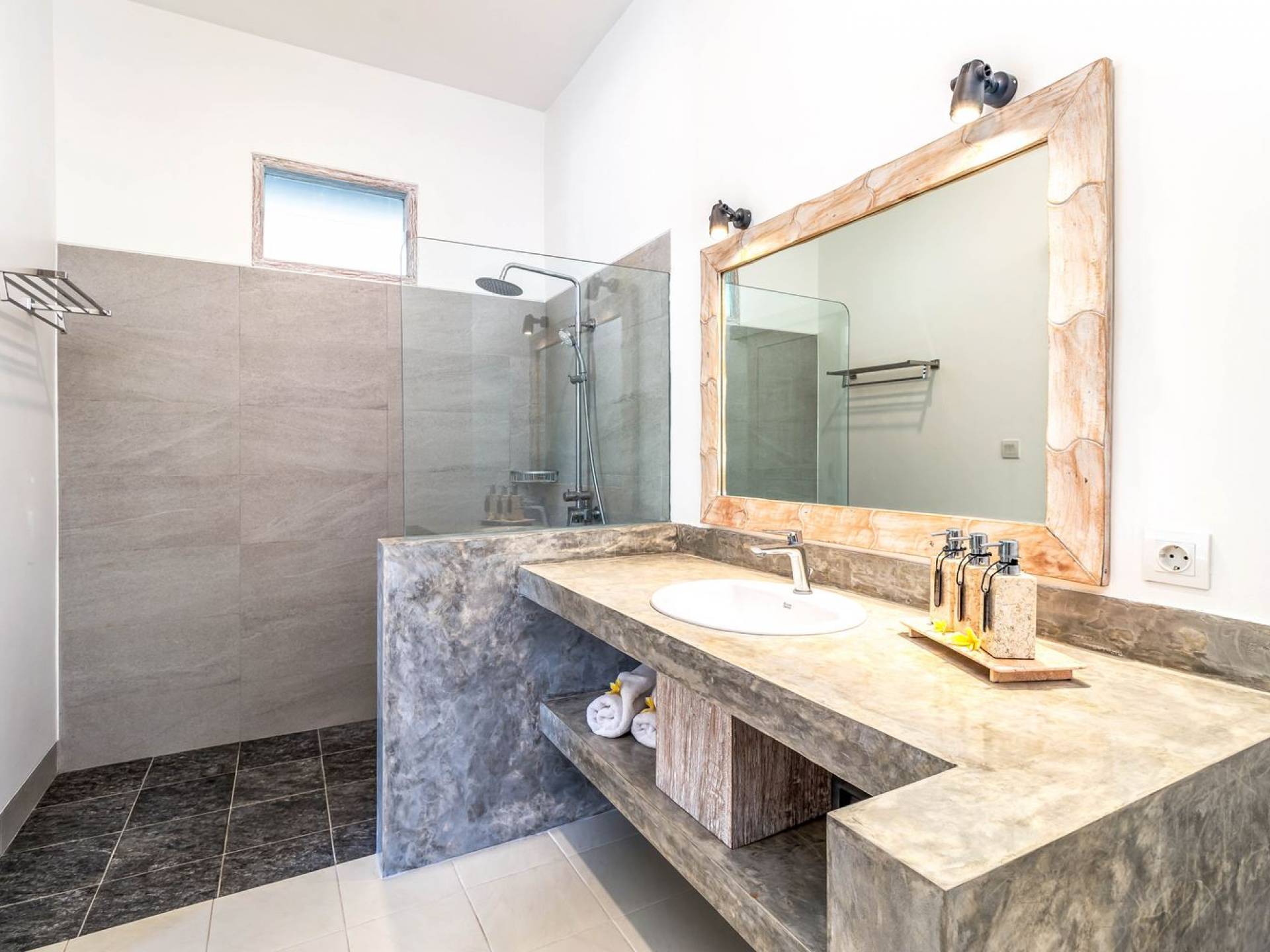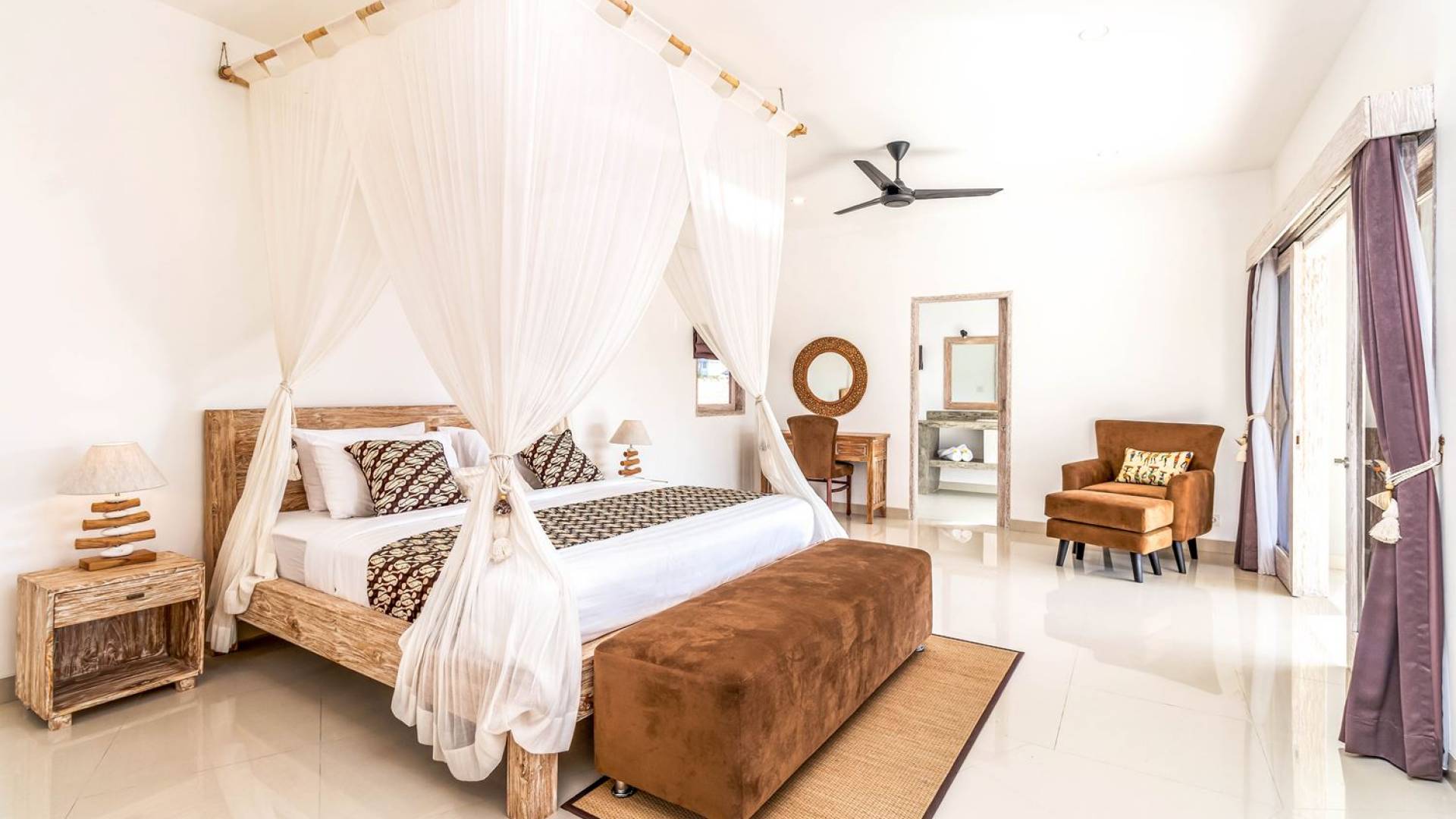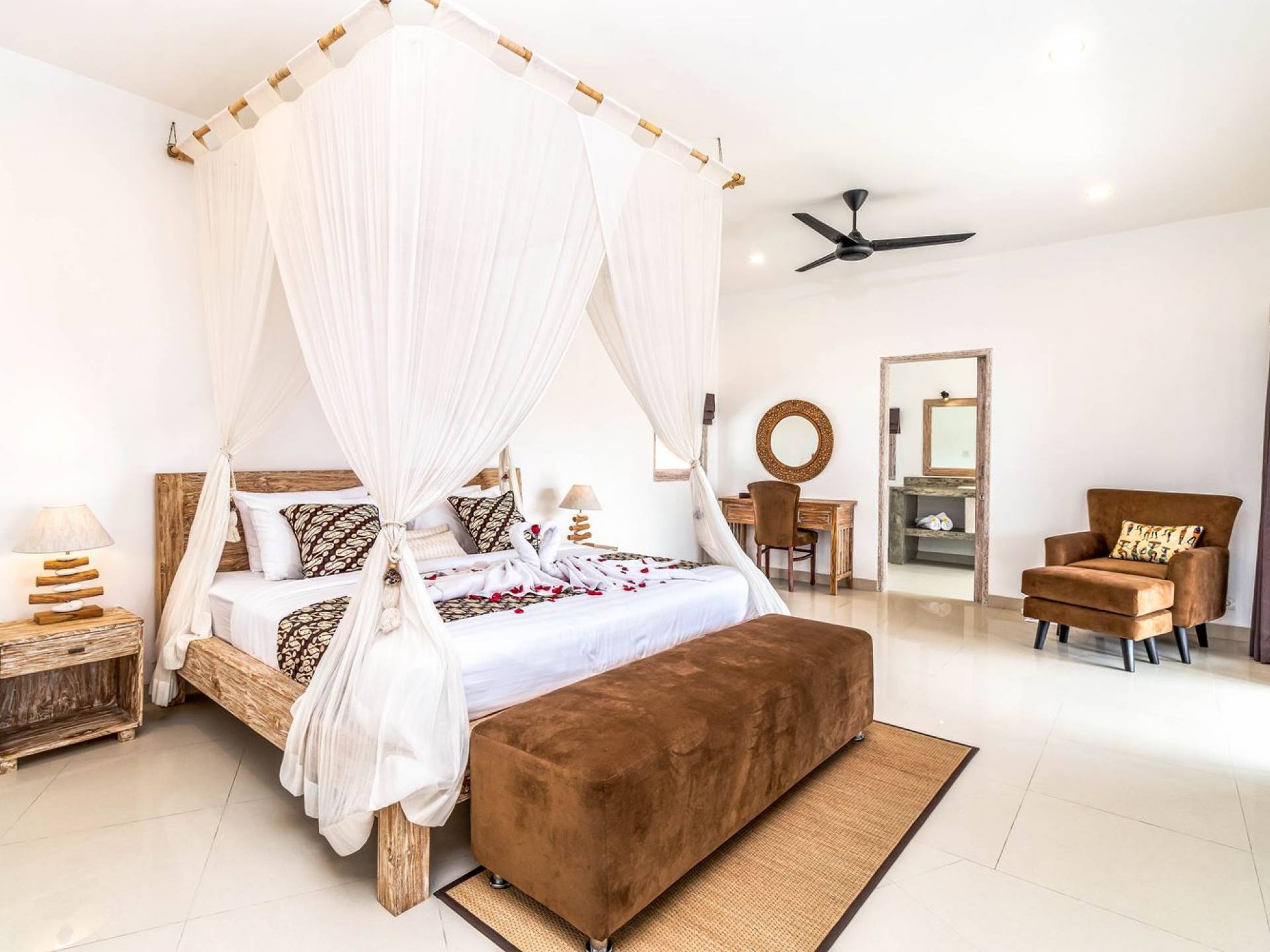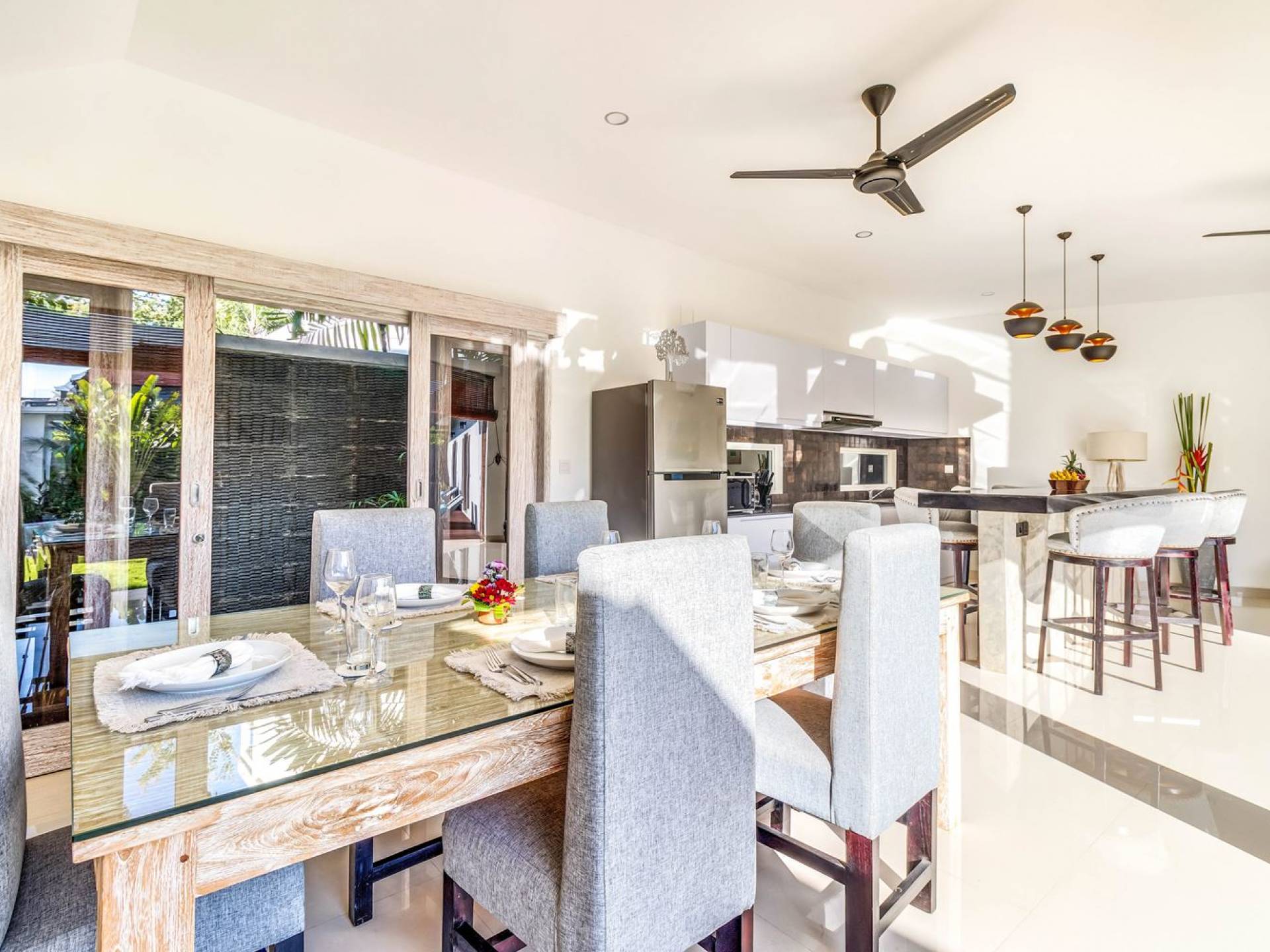 Questa splendida tenuta per le vacanze dispone di 4 spaziose camere da letto con aria condizionata. La camera da letto principale è come la suite di un re, enormemente grande, imbevuta di luce solare naturale e governata da un design d'interni tropicale chic. Questa camera da letto decadente è stata progettata con porte in vetro che si aprono su un ampio balcone con 2 sedie. Un ottimo posto per sedersi e prendere il sole del mattino con una tazza di caffè. Nel pomeriggio, porta una bottiglia di vino e goditi la vista del giardino sullo sfondo o di un cielo abbronzato. Le altre 3 camere da letto si trovano al piano di sotto, attorno al giardino e all'area della piscina. Delle 4 camere da letto, 3 hanno letti matrimoniali e 1 ha due letti singoli. Ogni camera dispone di bagno privato in camera con set di cortesia, doccia con getto a pioggia e cassette di sicurezza.