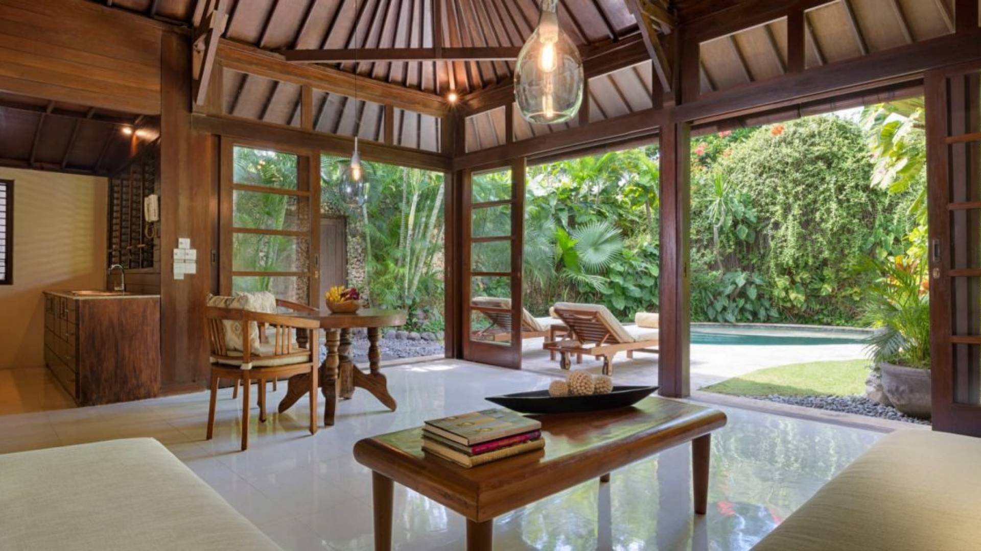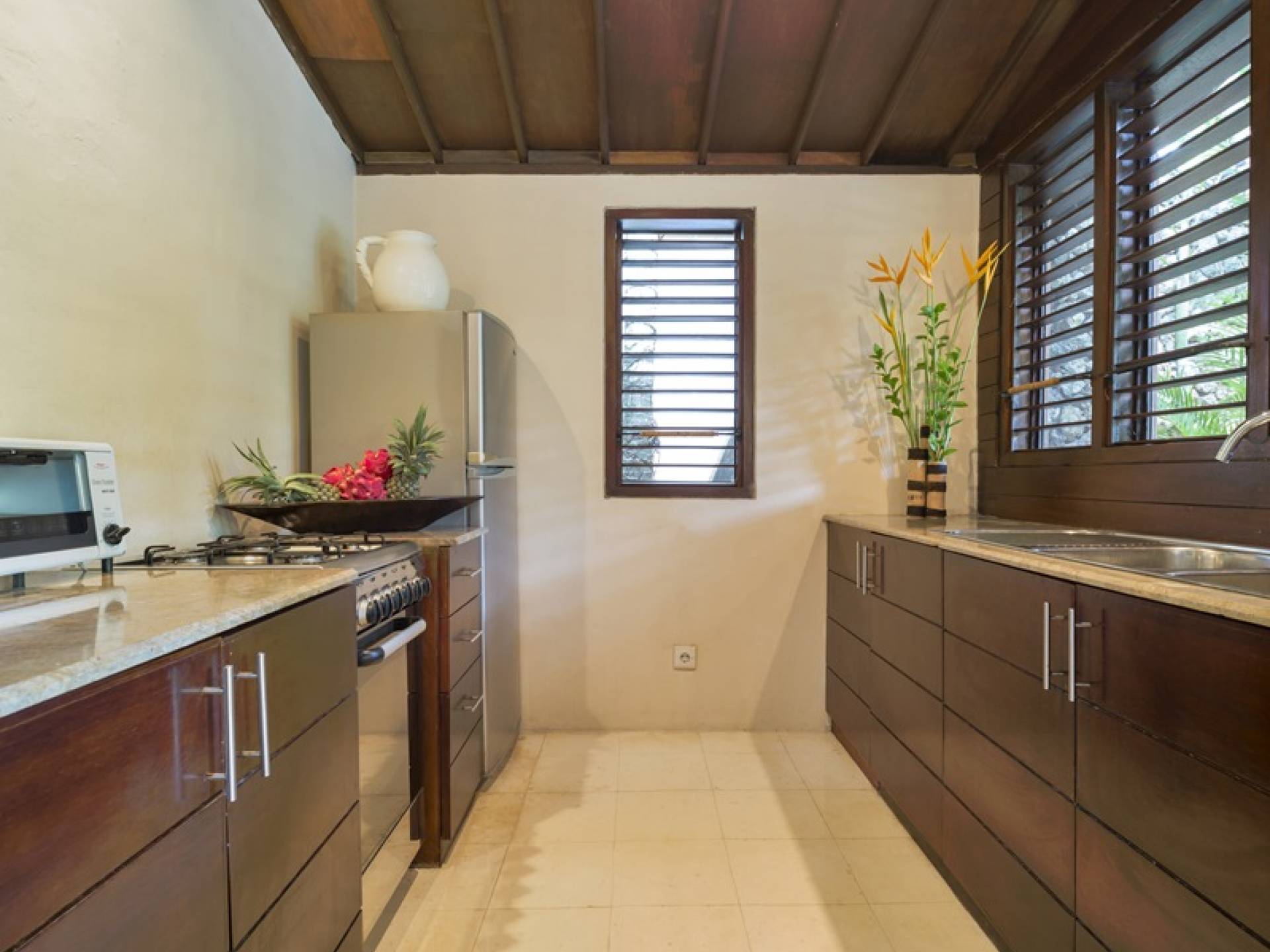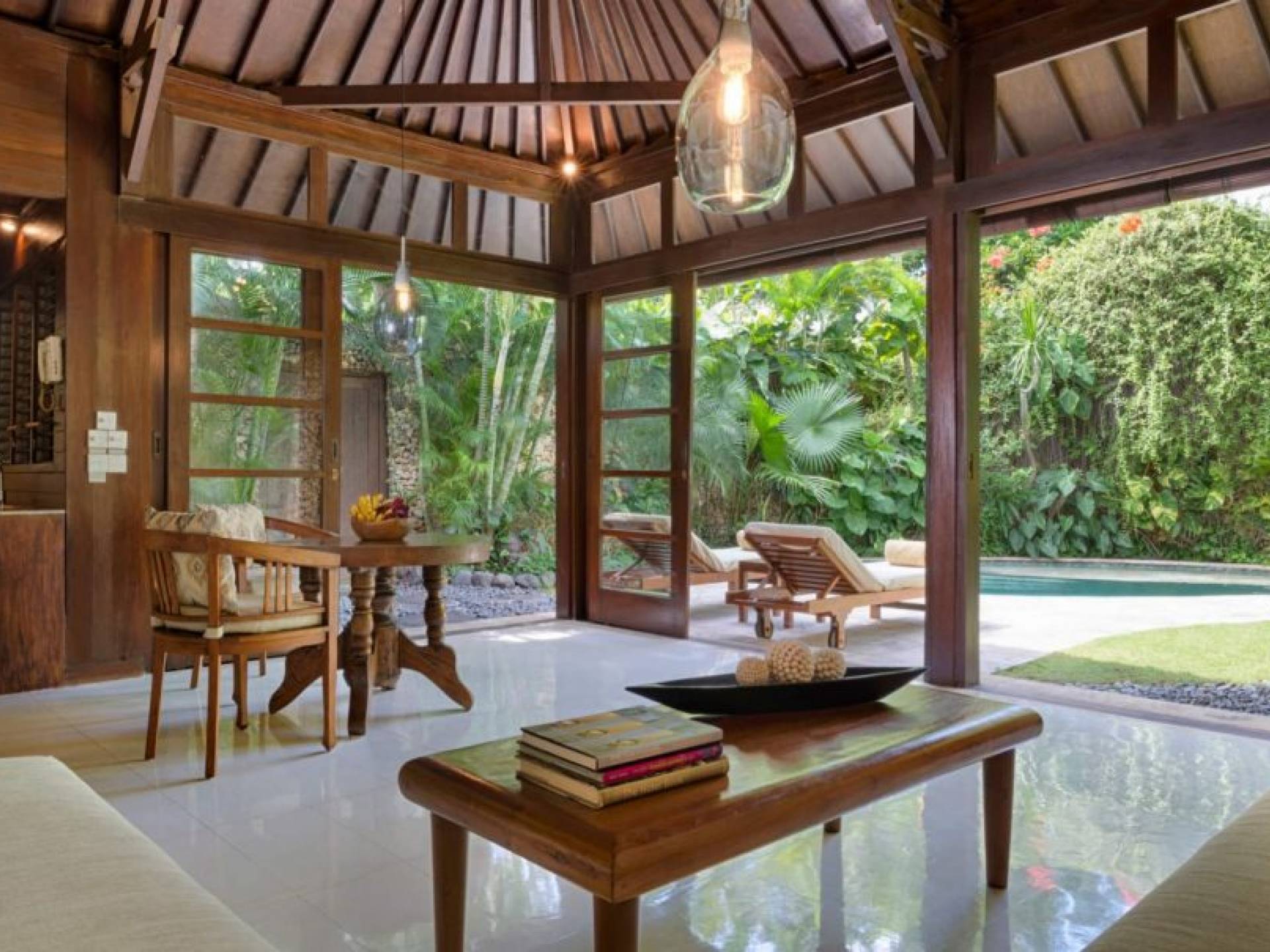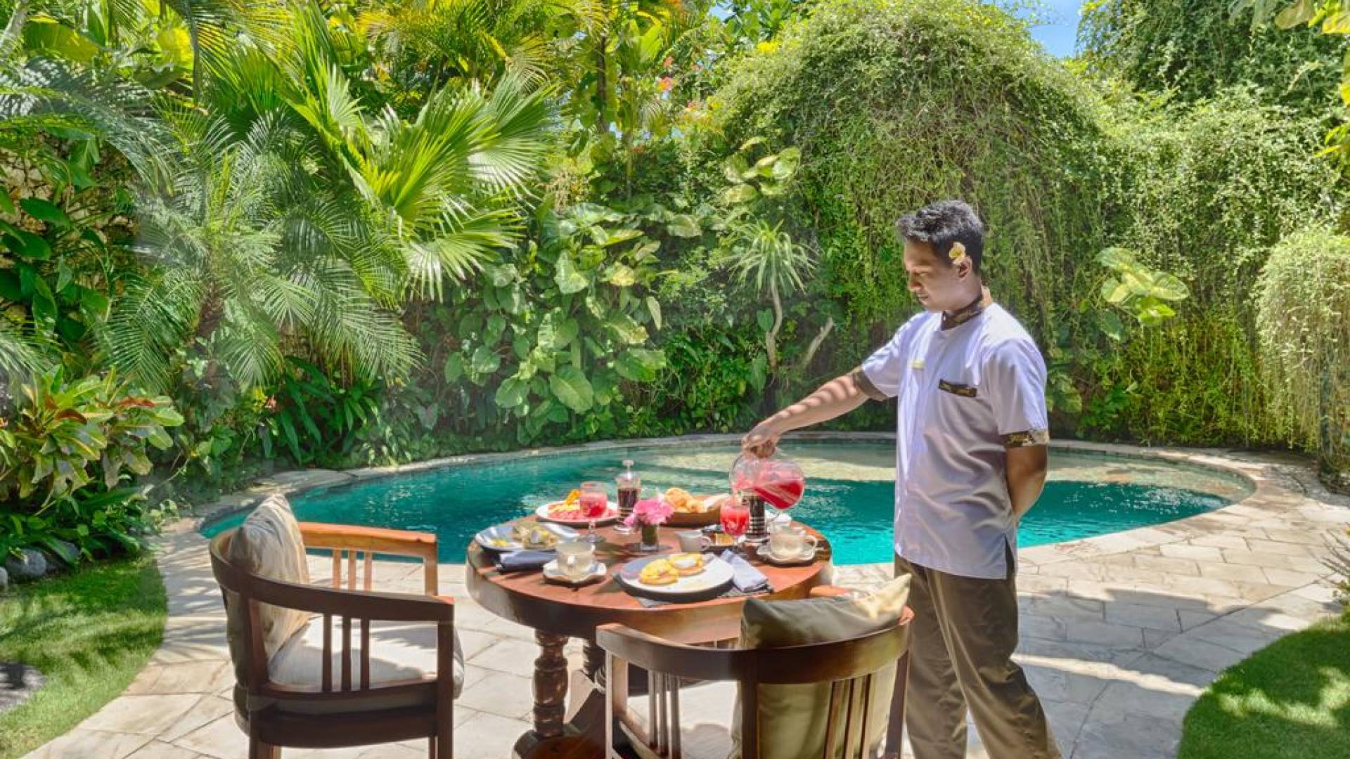 L'ampia area salotto dispone di un tavolo e sedie in legno di teak e di un adiacente angolo cottura completamente attrezzato, tutte con vista sui giardini e sulla piscina. Una camera da letto piena di luce con un letto super king-size e un bagno privato esterno con una decadente vasca da bagno indipendente in terrazzo e una doccia esterna favolosamente romantica completano lo scenario di questa luna di miele unica.