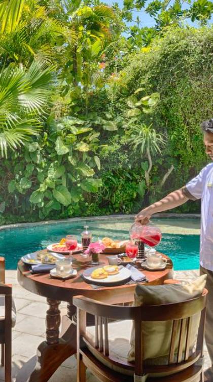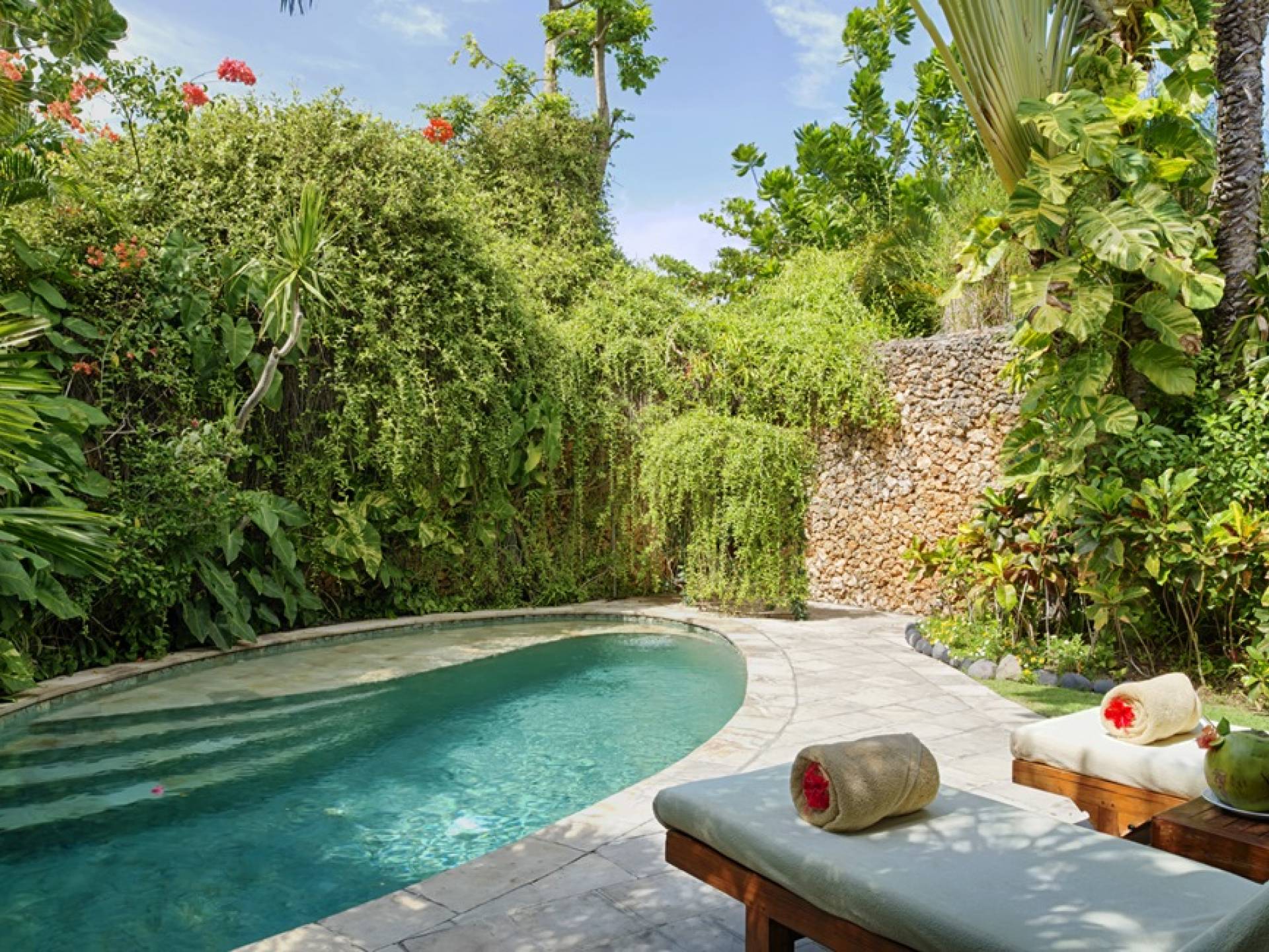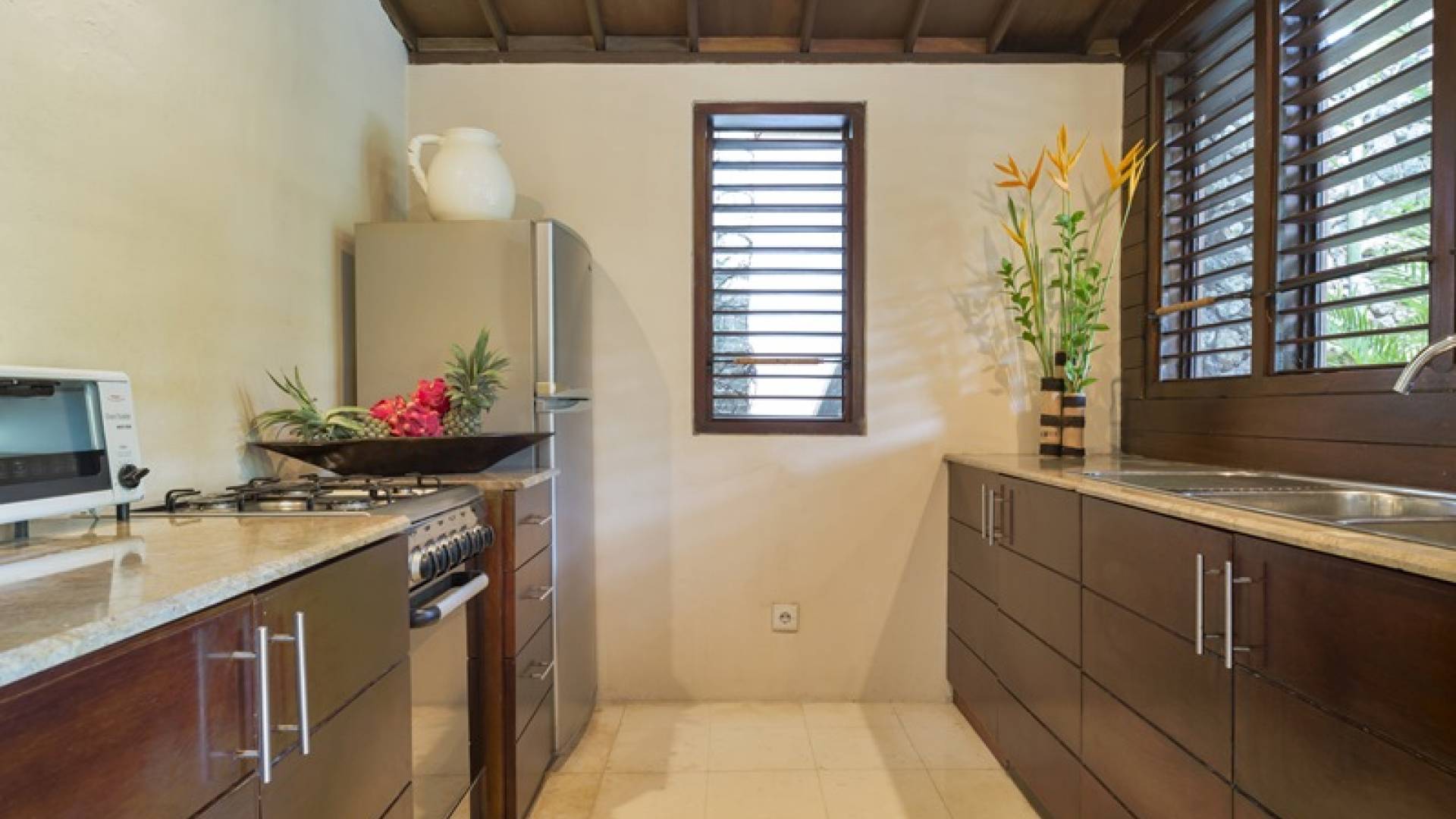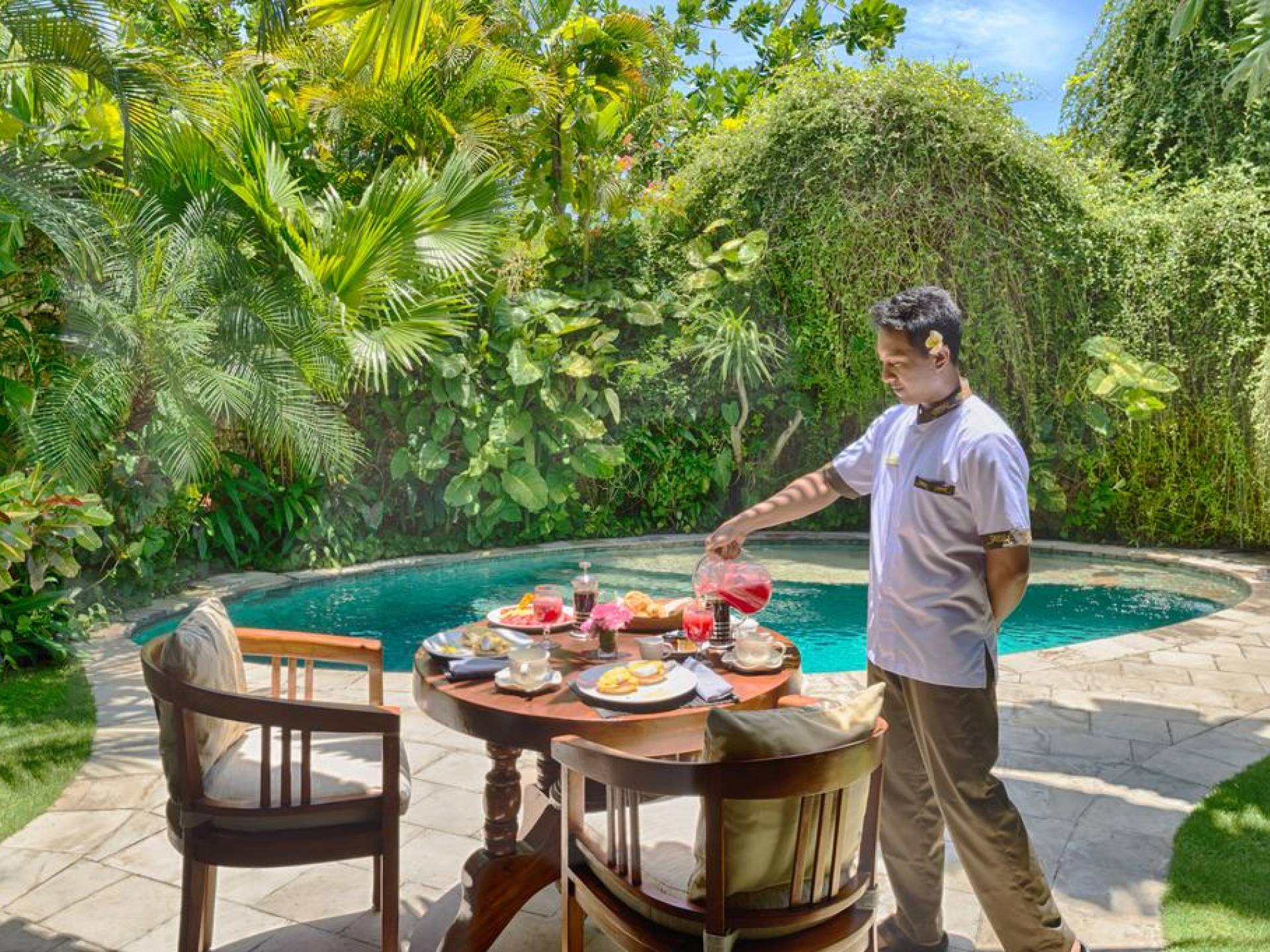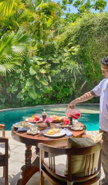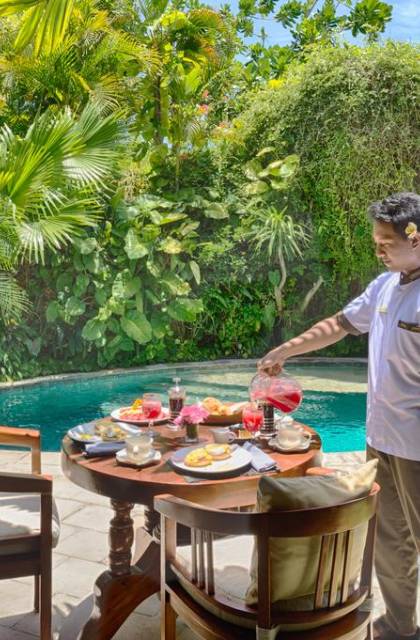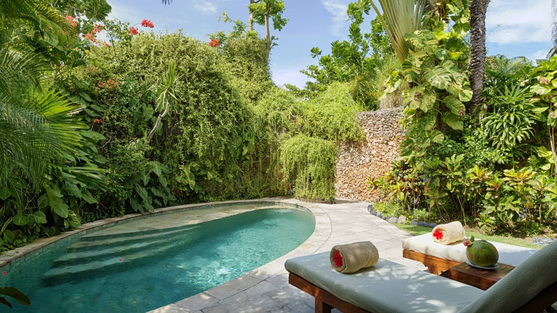L'ampia area salotto dispone di un tavolo e sedie in legno di teak e di un adiacente angolo cottura completamente attrezzato, tutte con vista sui giardini e sulla piscina. Una camera da letto piena di luce con un letto super king-size e un bagno privato esterno con una decadente vasca da bagno indipendente in terrazzo e una doccia esterna favolosamente romantica completano lo scenario di questa luna di miele unica.