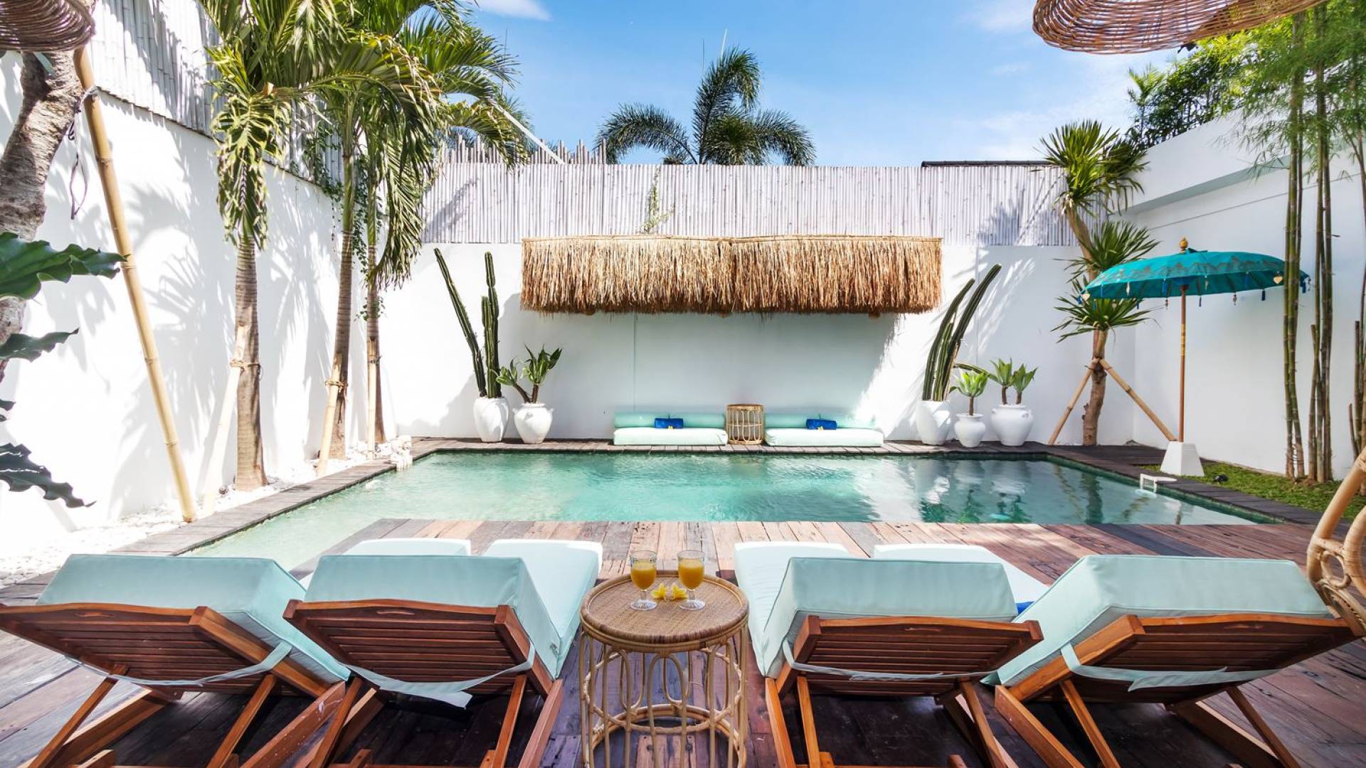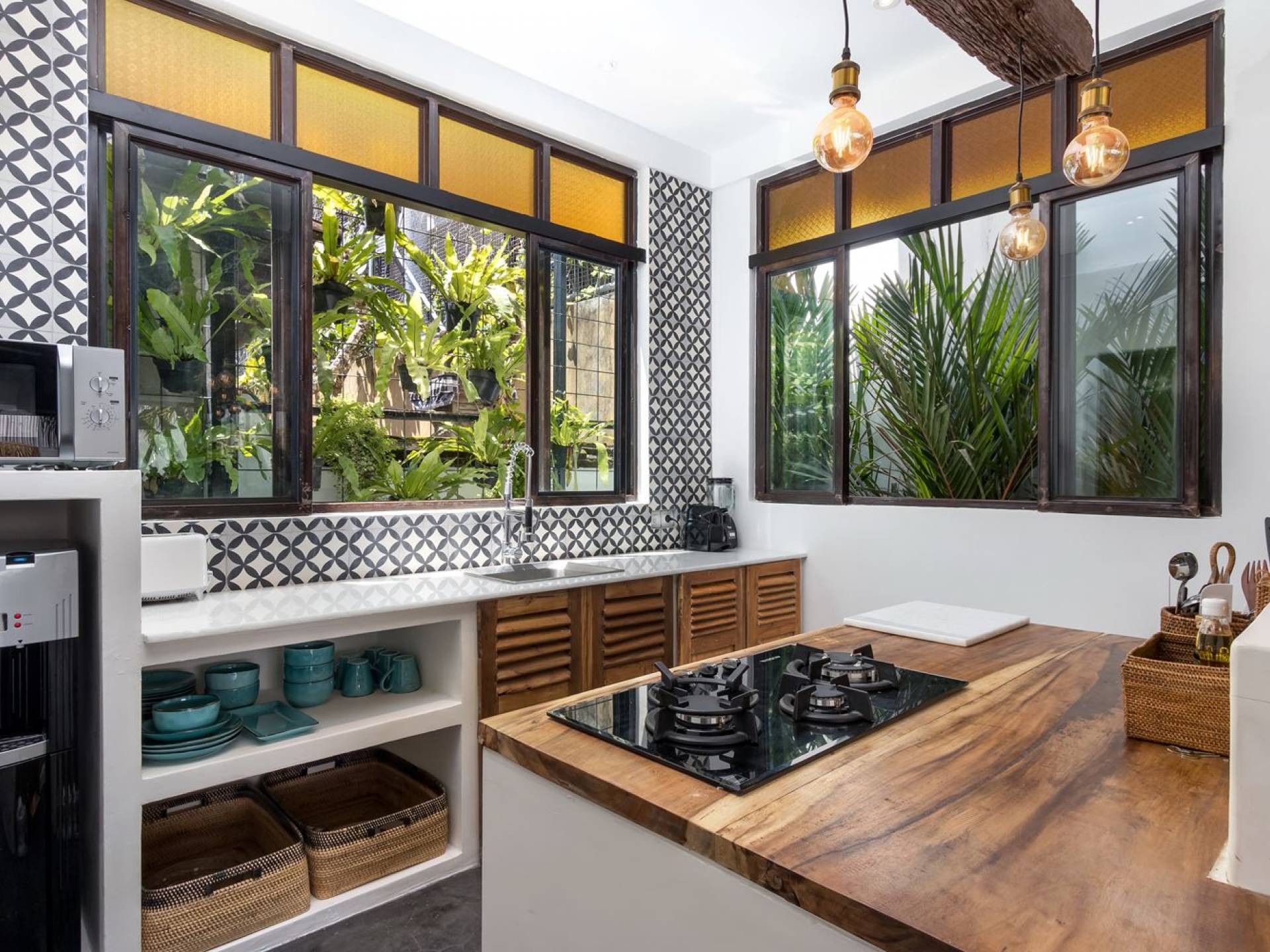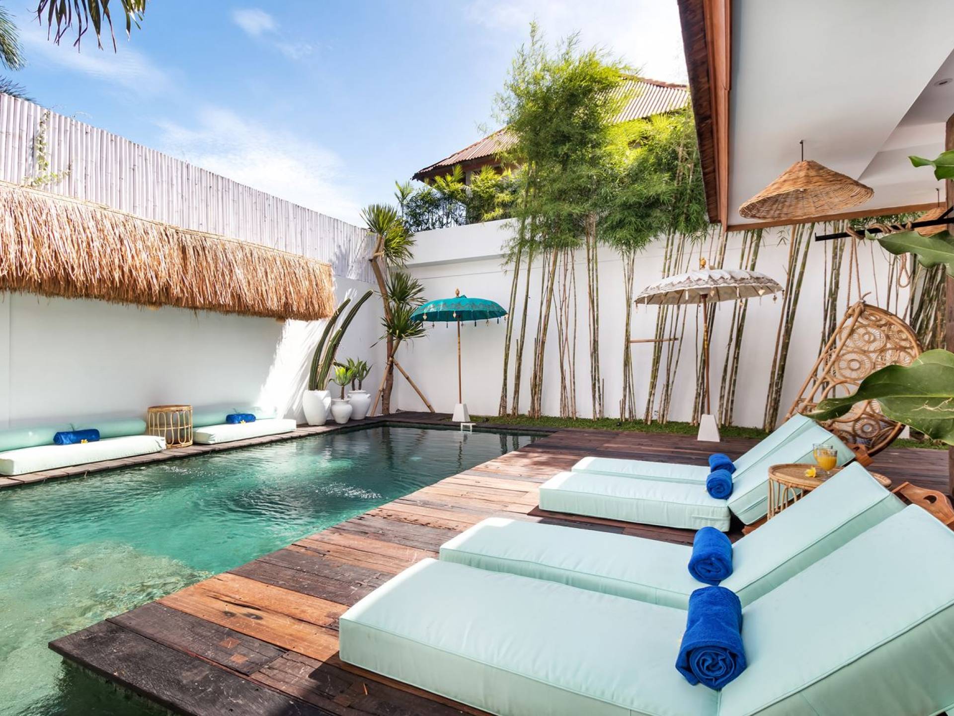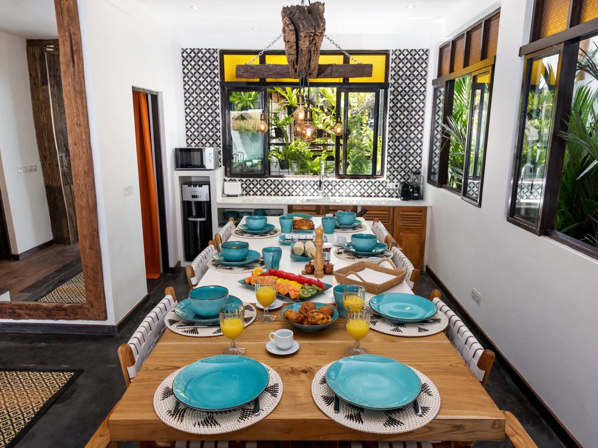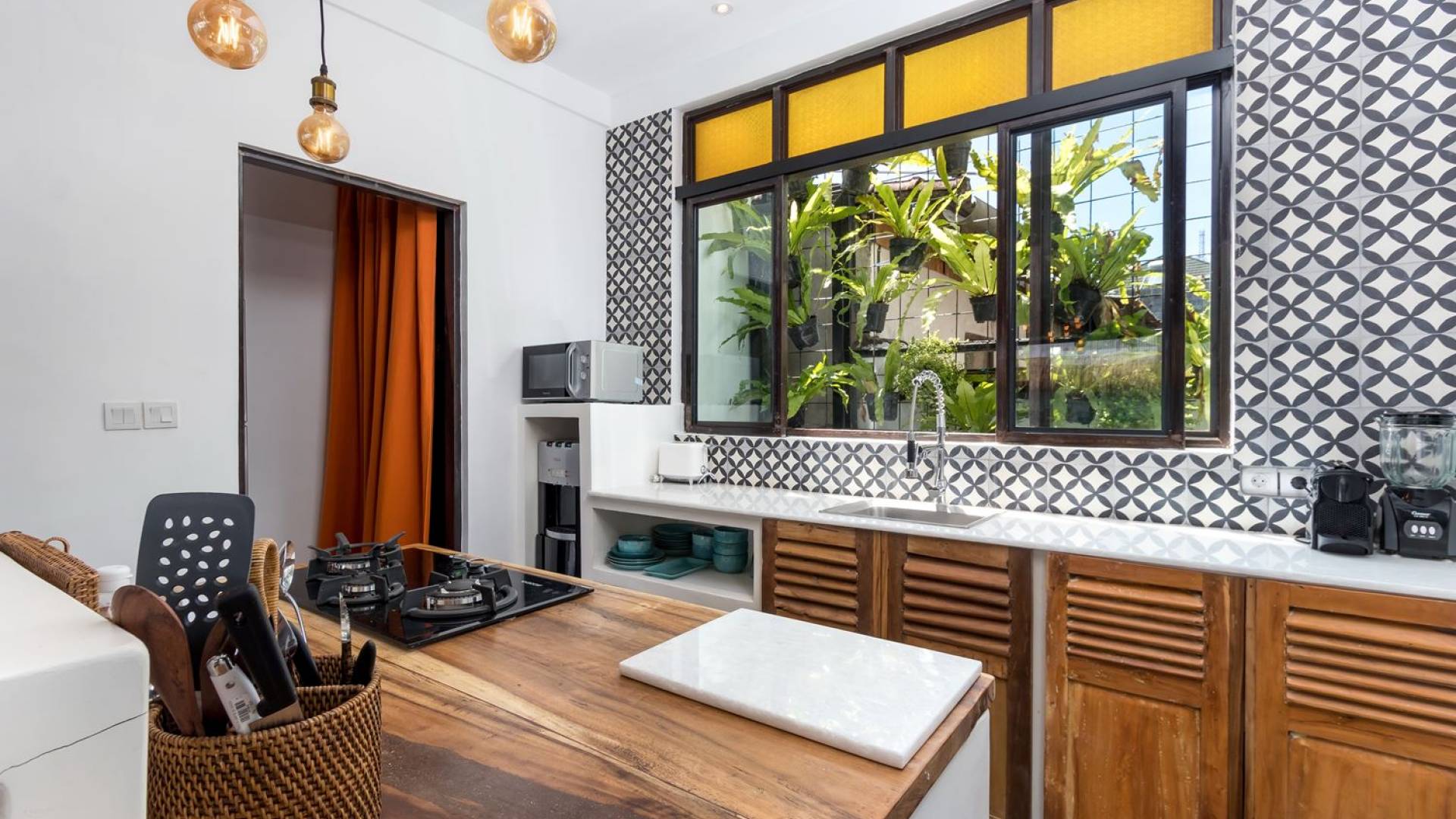 La scintillante piscina privata di 6 metri ha un'area poco profonda dove i bambini possono sguazzare e giocare e la piscina è fiancheggiata da cactus in grandi vasi di pietra dipinti di bianco e piante di bambù, aggiungendo solo l'atmosfera esotica che questa villa trasuda al rovescio. Inoltre, il giardino dispone di un laghetto e di una doccia naturale a cascata all'aperto per rinfrescarsi dopo una nuotata in piscina. Il soggiorno ventilato presenta un pavimento in legno rustico con un grande divano imbottito e un divano letto in bambù situato attorno a un tavolino da caffè finemente intagliato. Il bar bianco con seggioloni funge anche da punto di ristoro informale e dispone di prese elettriche laterali per collegare il laptop o i caricatori del telefono. A lato del soggiorno ci sono finestre aperte che consentono all'aria fresca di circolare in ogni momento. La cucina è caratterizzata da piastrelle dipinte a mano, che le conferiscono un aspetto davvero bello e unico. C'è una grande finestra che si apre su piante pendenti verdi tropicali sul retro e la cucina è attrezzata con tutto ciò di cui la tua casa vacanze Seminyak ha bisogno.