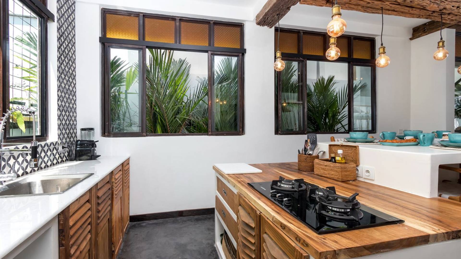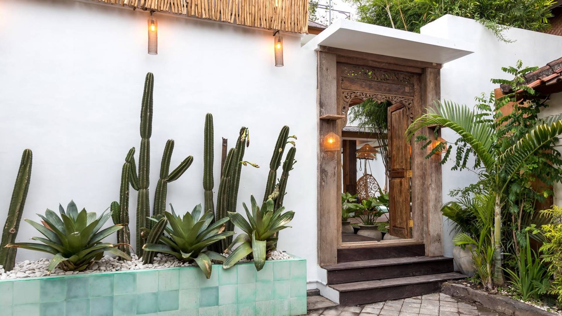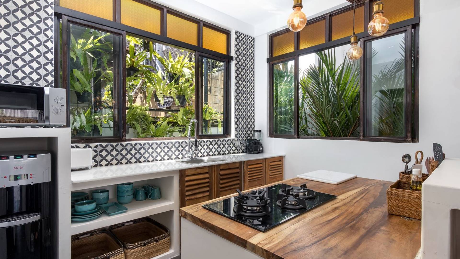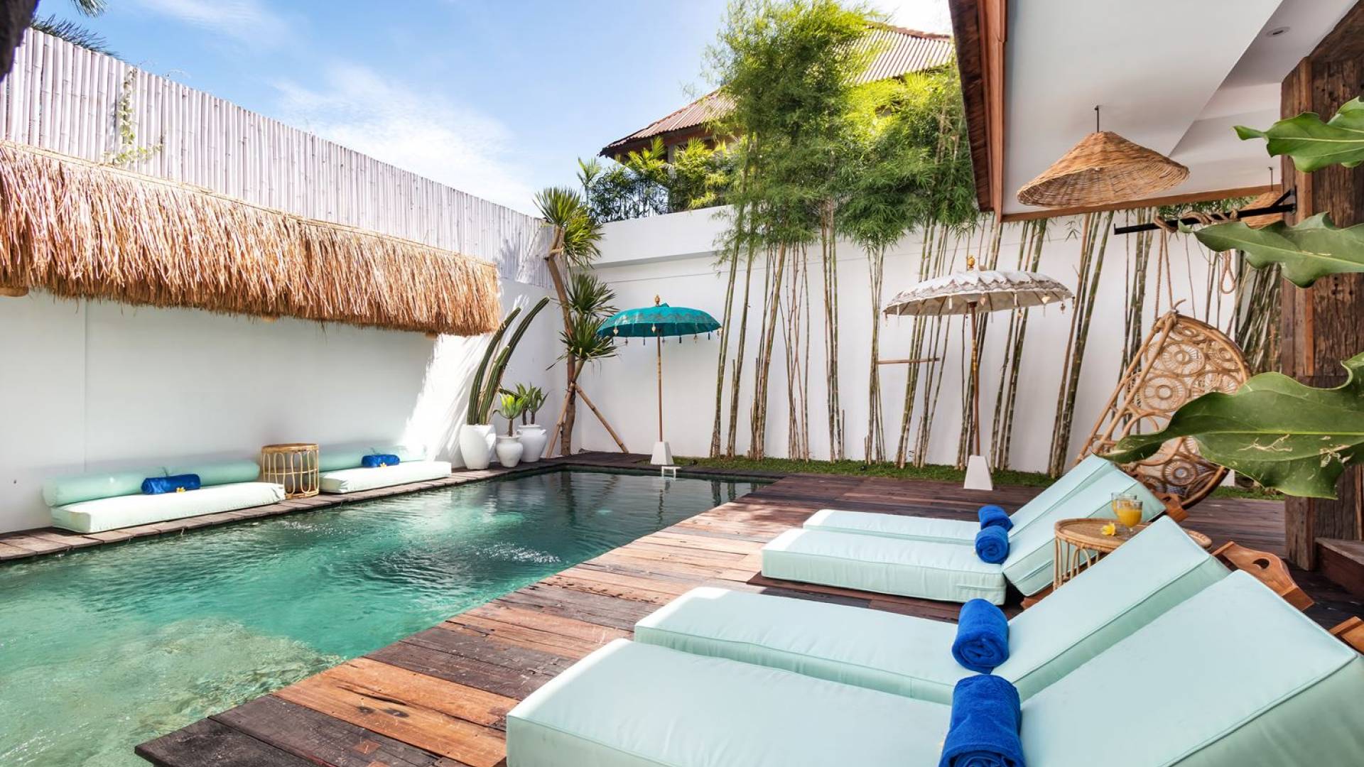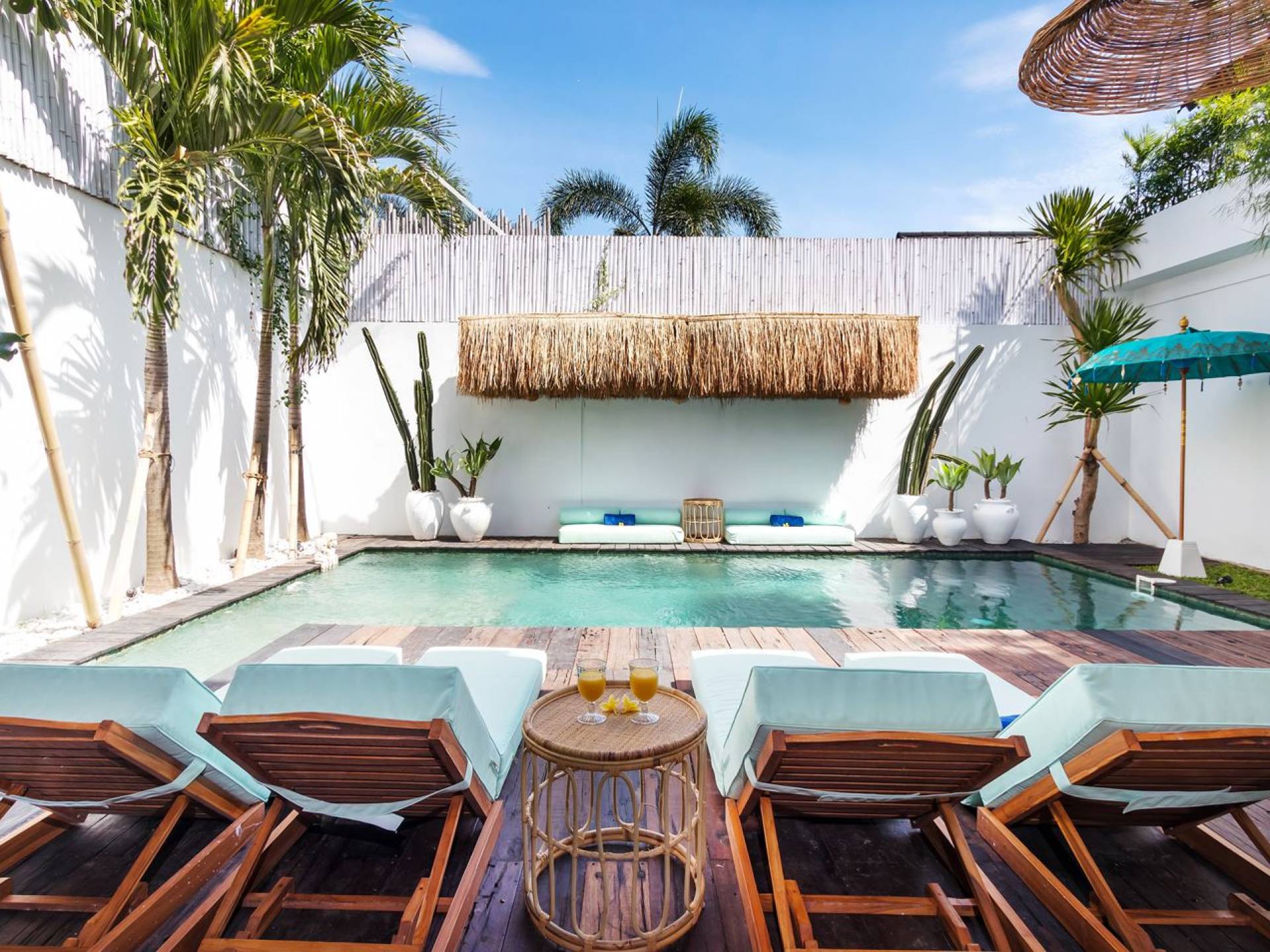 La scintillante piscina privata di 6 metri ha un'area poco profonda dove i bambini possono sguazzare e giocare e la piscina è fiancheggiata da cactus in grandi vasi di pietra dipinti di bianco e piante di bambù, aggiungendo solo l'atmosfera esotica che questa villa trasuda al rovescio. Inoltre, il giardino dispone di un laghetto e di una doccia naturale a cascata all'aperto per rinfrescarsi dopo una nuotata in piscina. Il soggiorno ventilato presenta un pavimento in legno rustico con un grande divano imbottito e un divano letto in bambù situato attorno a un tavolino da caffè finemente intagliato. Il bar bianco con seggioloni funge anche da punto di ristoro informale e dispone di prese elettriche laterali per collegare il laptop o i caricatori del telefono. A lato del soggiorno ci sono finestre aperte che consentono all'aria fresca di circolare in ogni momento. La cucina è caratterizzata da piastrelle dipinte a mano, che le conferiscono un aspetto davvero bello e unico. C'è una grande finestra che si apre su piante pendenti verdi tropicali sul retro e la cucina è attrezzata con tutto ciò di cui la tua casa vacanze Seminyak ha bisogno.