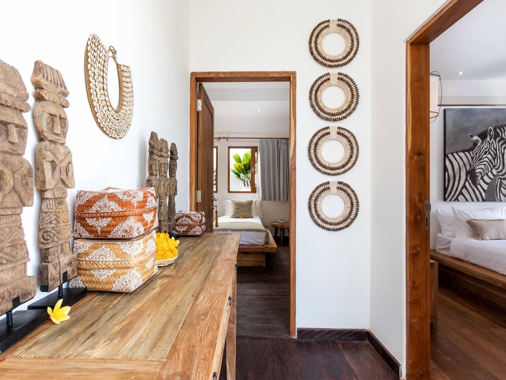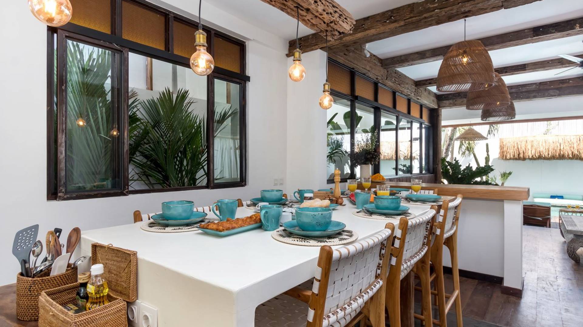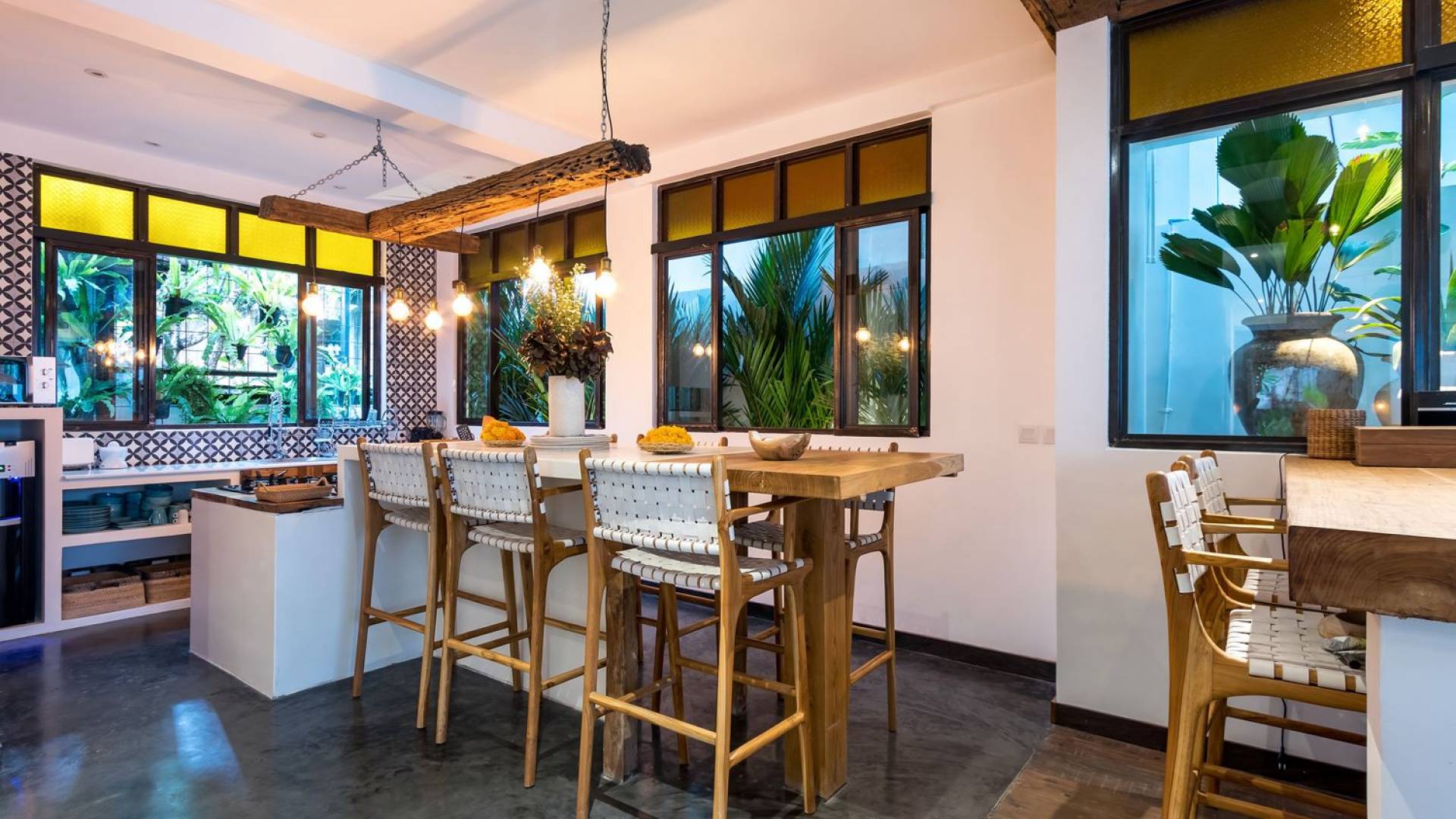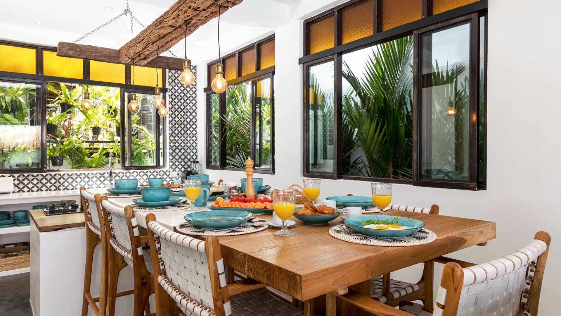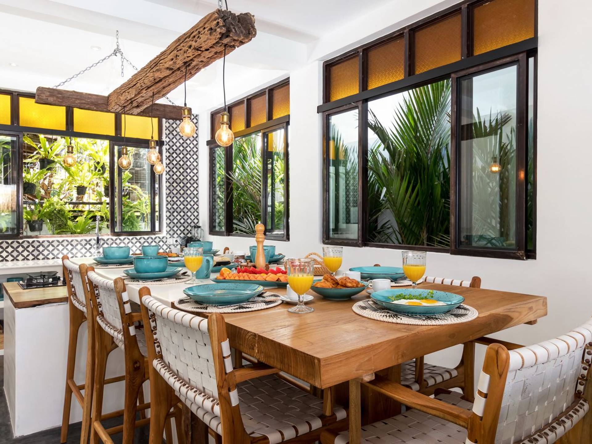 La scintillante piscina privata di 6 metri ha un'area poco profonda dove i bambini possono sguazzare e giocare e la piscina è fiancheggiata da cactus in grandi vasi di pietra dipinti di bianco e piante di bambù, aggiungendo solo l'atmosfera esotica che questa villa trasuda al rovescio. Inoltre, il giardino dispone di un laghetto e di una doccia naturale a cascata all'aperto per rinfrescarsi dopo una nuotata in piscina. Il soggiorno ventilato presenta un pavimento in legno rustico con un grande divano imbottito e un divano letto in bambù situato attorno a un tavolino da caffè finemente intagliato. Il bar bianco con seggioloni funge anche da punto di ristoro informale e dispone di prese elettriche laterali per collegare il laptop o i caricatori del telefono. A lato del soggiorno ci sono finestre aperte che consentono all'aria fresca di circolare in ogni momento. La cucina è caratterizzata da piastrelle dipinte a mano, che le conferiscono un aspetto davvero bello e unico. C'è una grande finestra che si apre su piante pendenti verdi tropicali sul retro e la cucina è attrezzata con tutto ciò di cui la tua casa vacanze Seminyak ha bisogno.