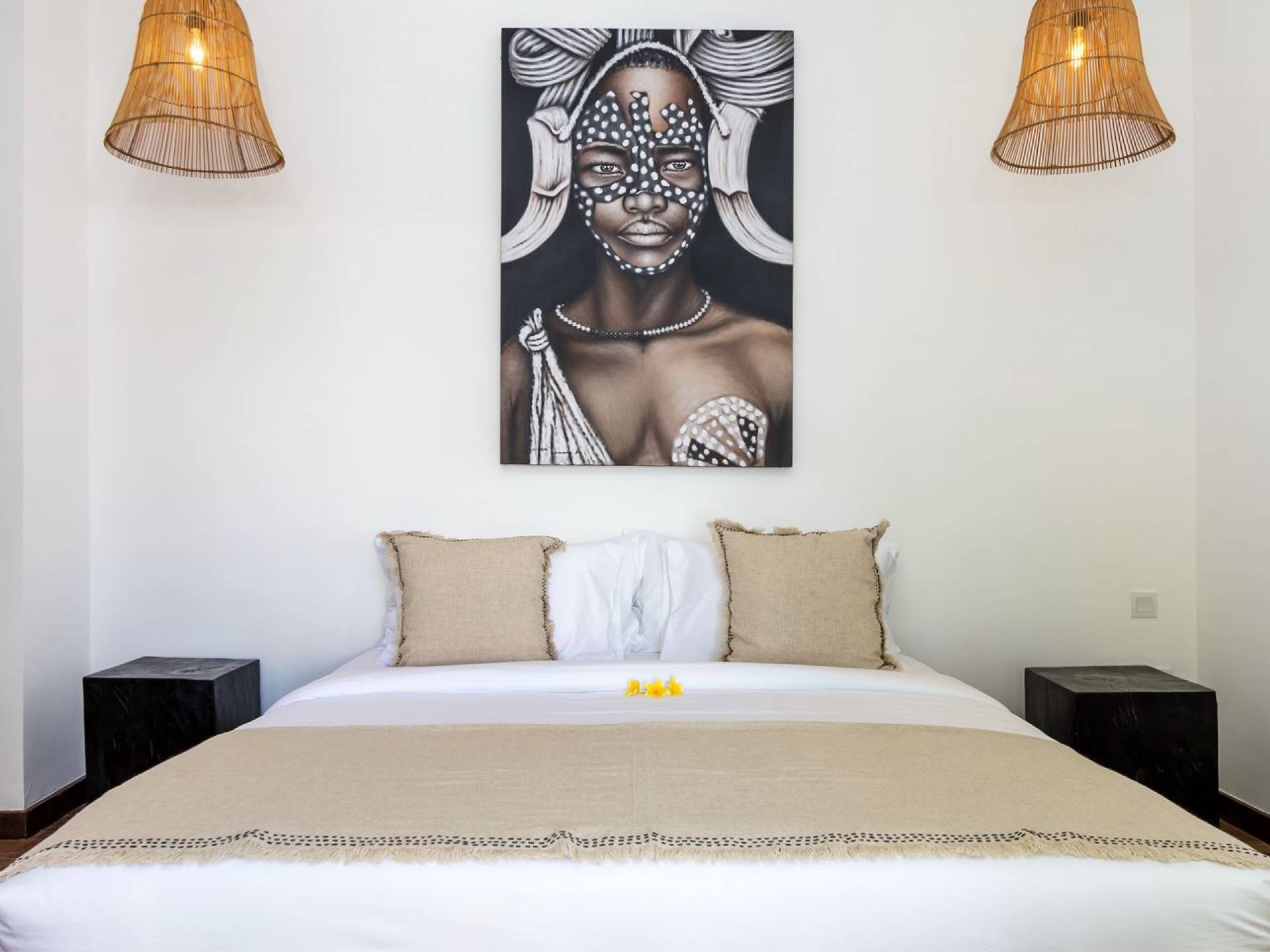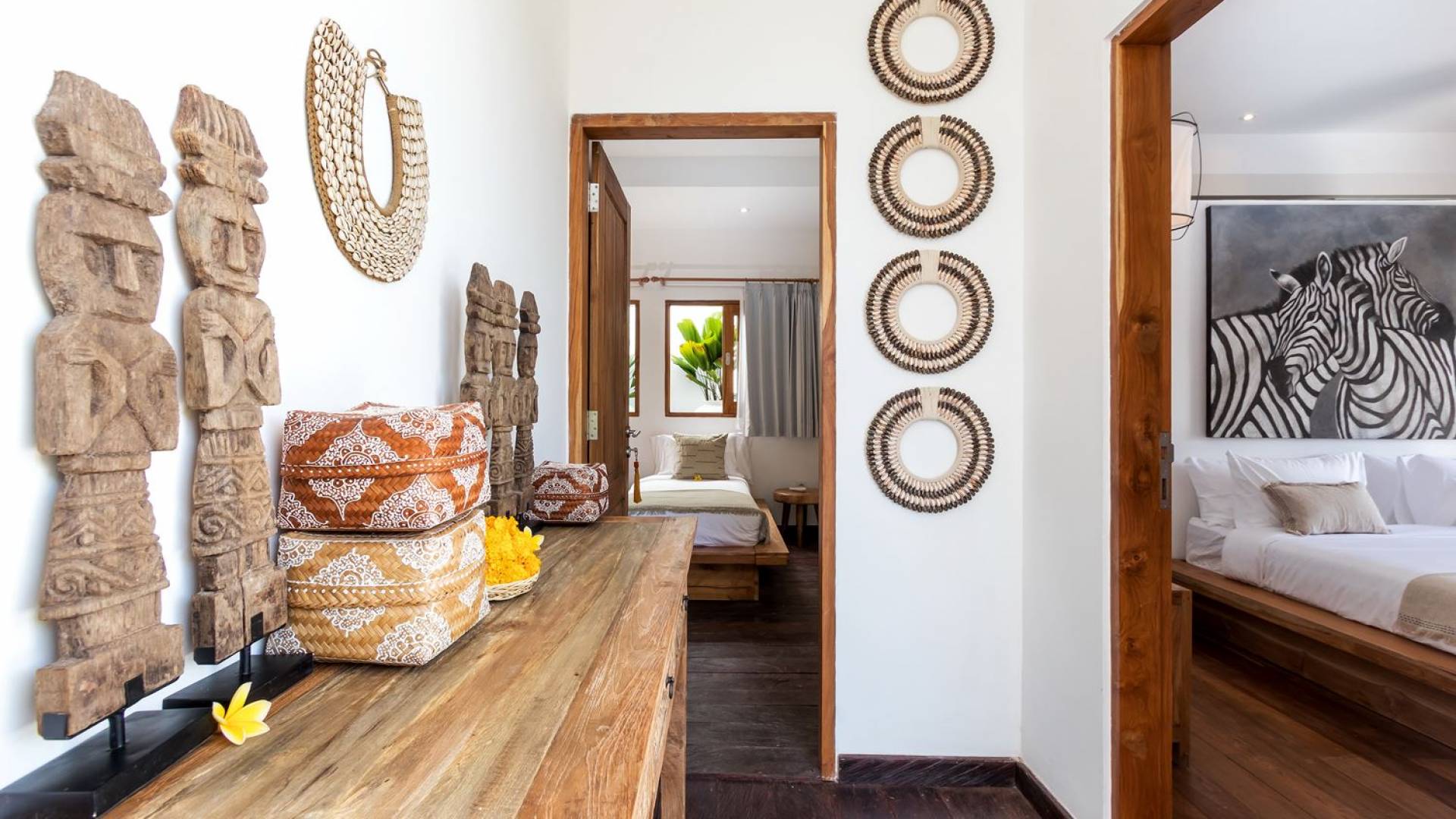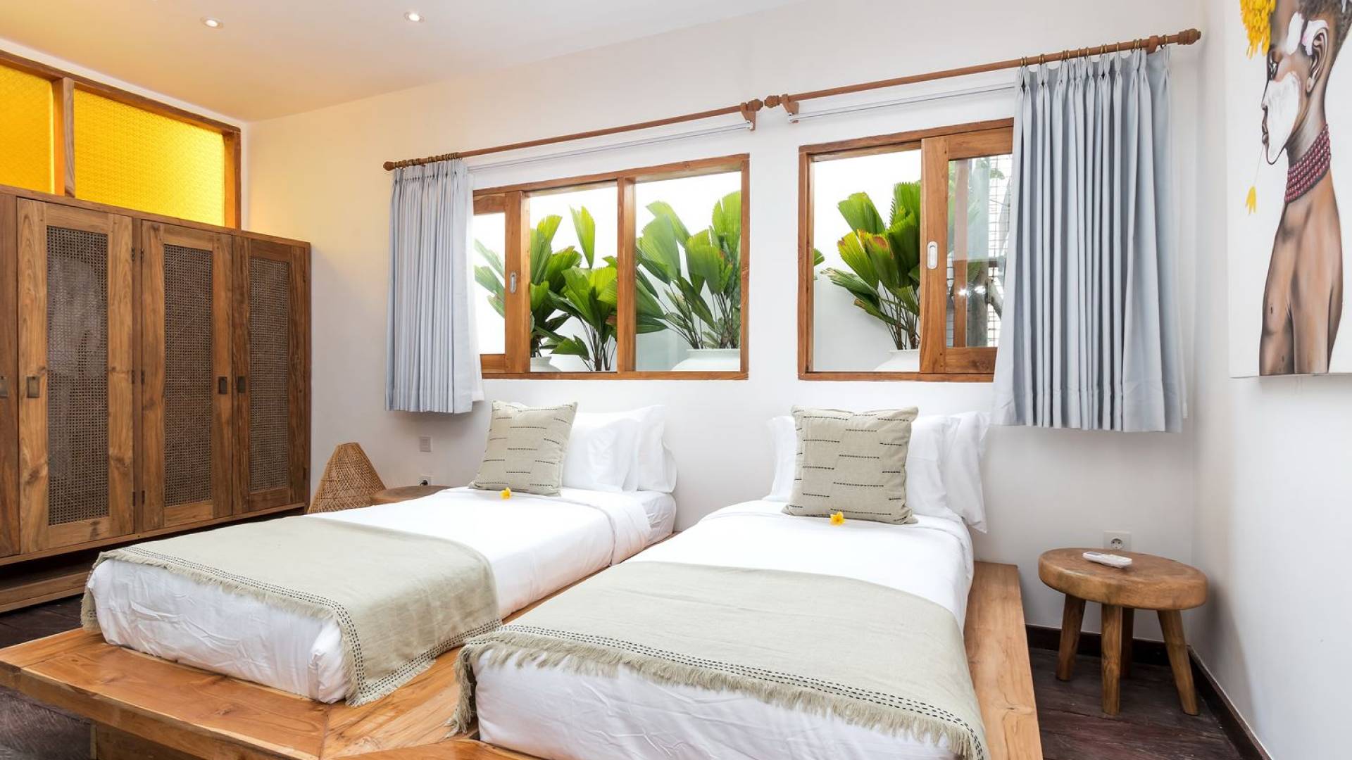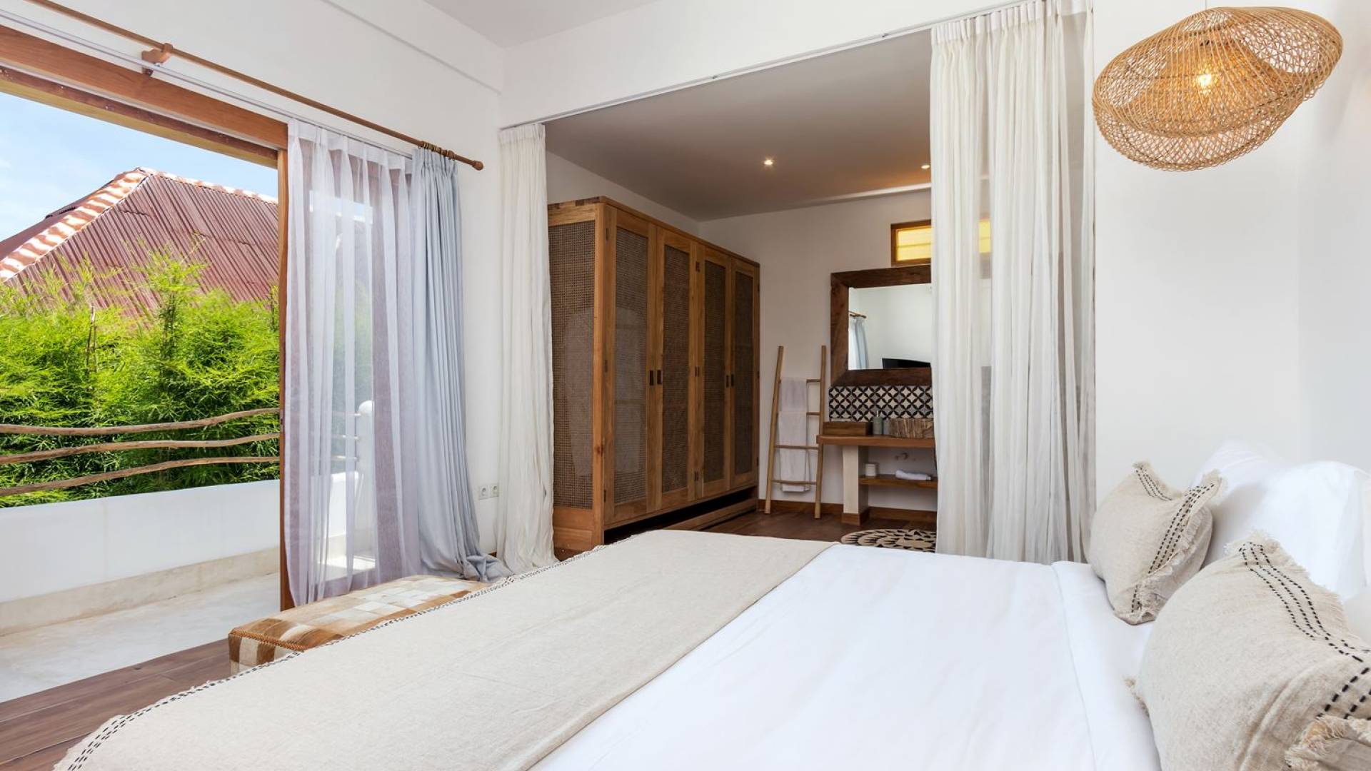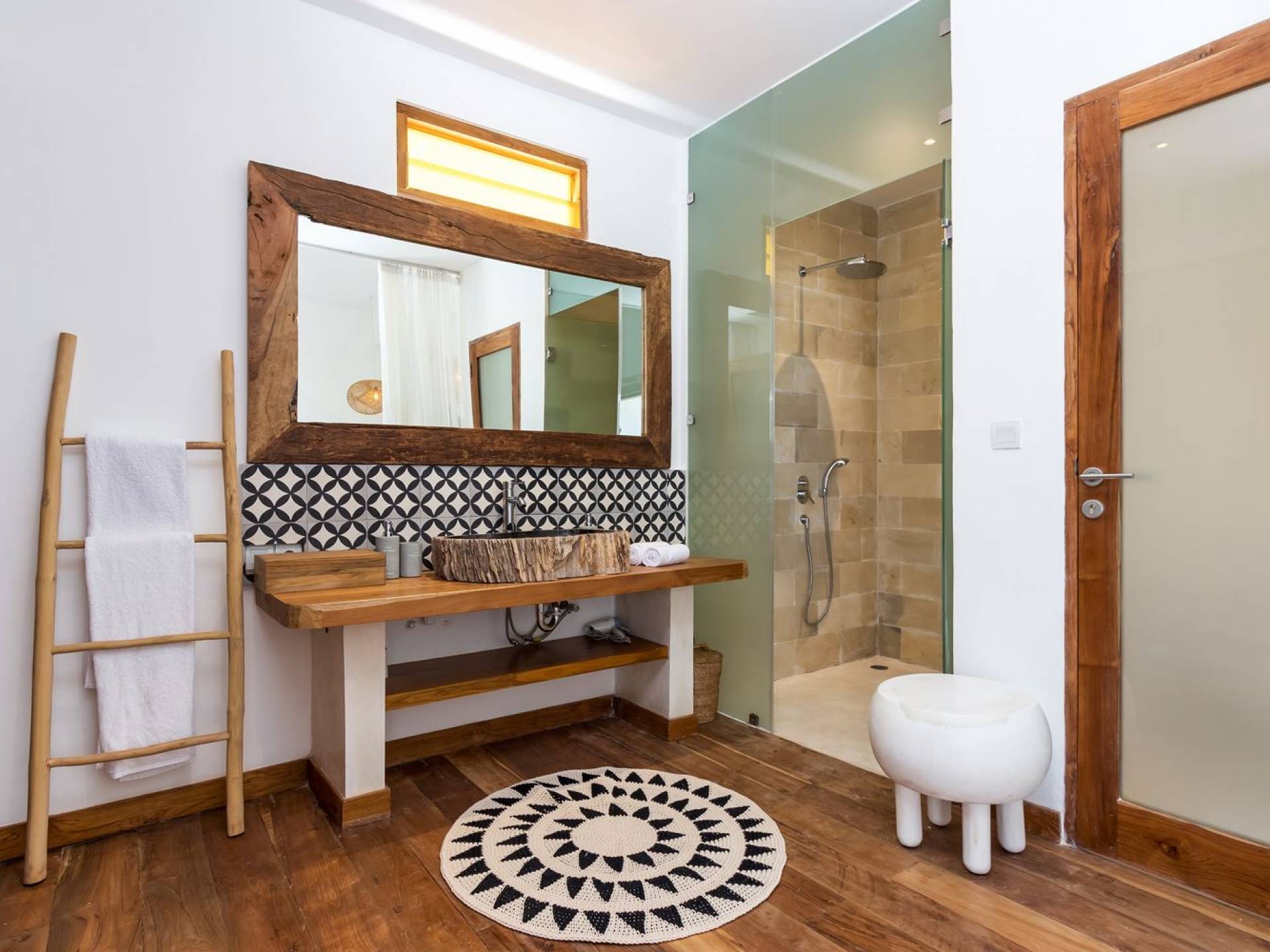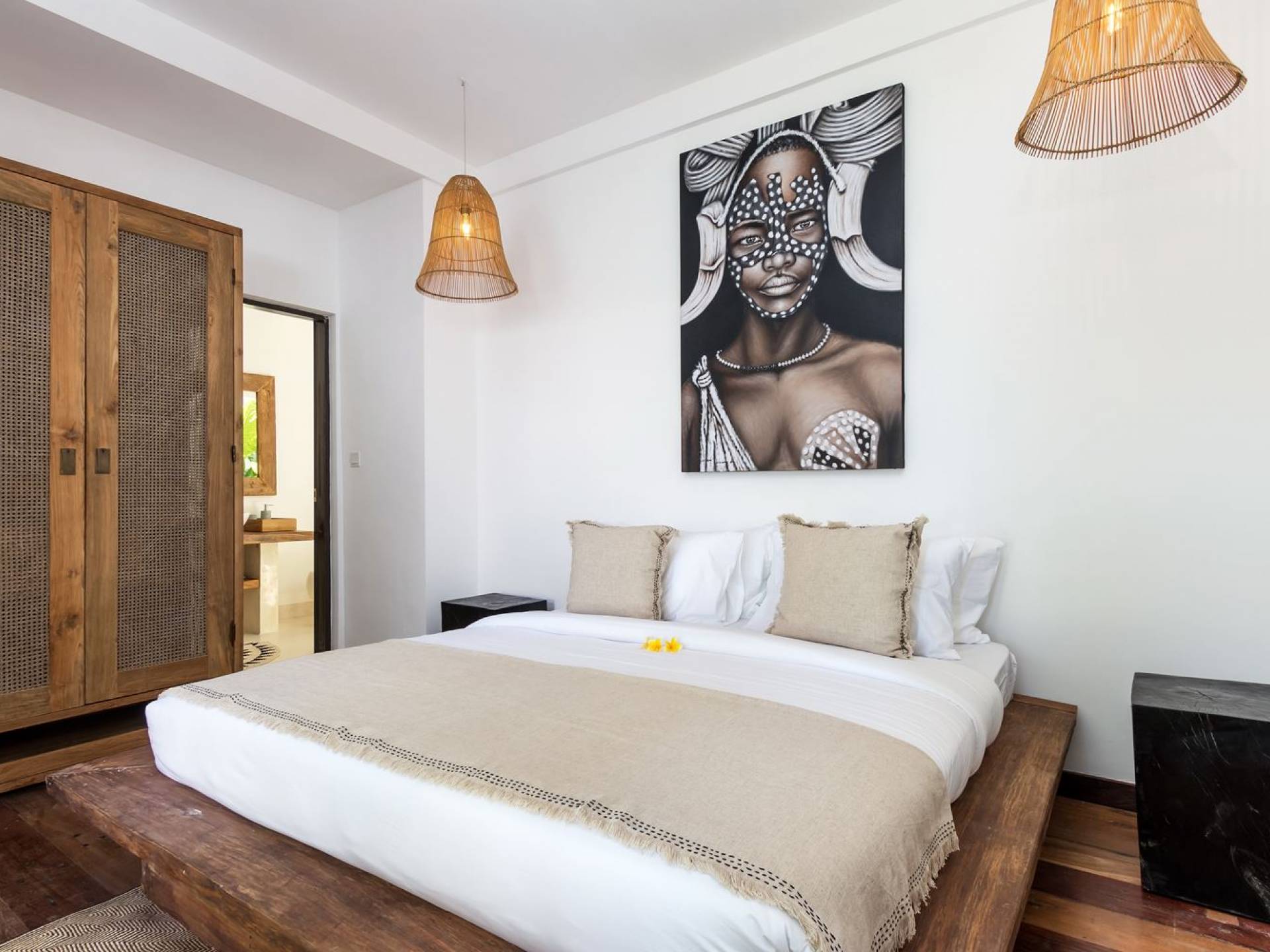 La scintillante piscina privata di 6 metri ha un'area poco profonda dove i bambini possono sguazzare e giocare e la piscina è fiancheggiata da cactus in grandi vasi di pietra dipinti di bianco e piante di bambù, aggiungendo solo l'atmosfera esotica che questa villa trasuda al rovescio. Inoltre, il giardino dispone di un laghetto e di una doccia naturale a cascata all'aperto per rinfrescarsi dopo una nuotata in piscina. Il soggiorno ventilato presenta un pavimento in legno rustico con un grande divano imbottito e un divano letto in bambù situato attorno a un tavolino da caffè finemente intagliato. Il bar bianco con seggioloni funge anche da punto di ristoro informale e dispone di prese elettriche laterali per collegare il laptop o i caricatori del telefono. A lato del soggiorno ci sono finestre aperte che consentono all'aria fresca di circolare in ogni momento. La cucina è caratterizzata da piastrelle dipinte a mano, che le conferiscono un aspetto davvero bello e unico. C'è una grande finestra che si apre su piante pendenti verdi tropicali sul retro e la cucina è attrezzata con tutto ciò di cui la tua casa vacanze Seminyak ha bisogno.