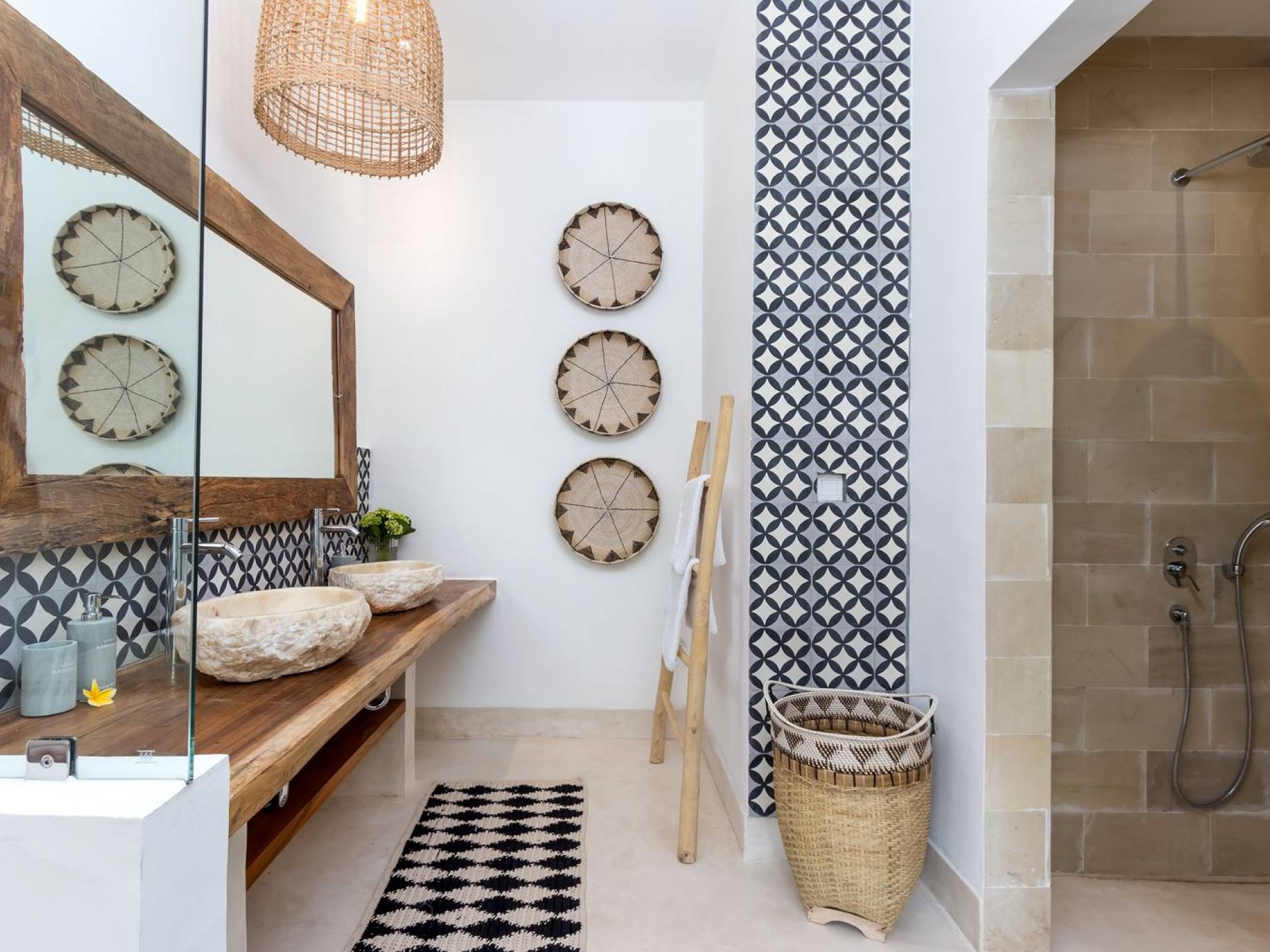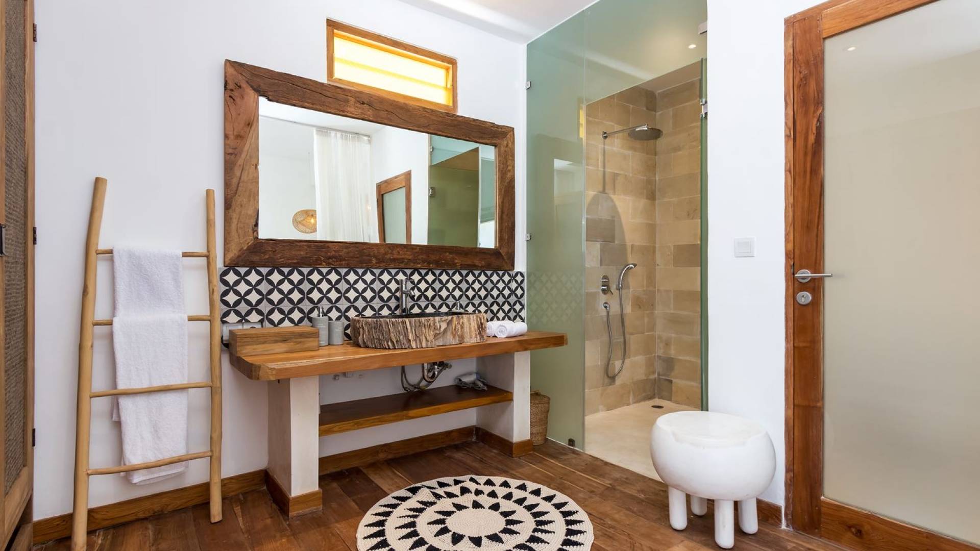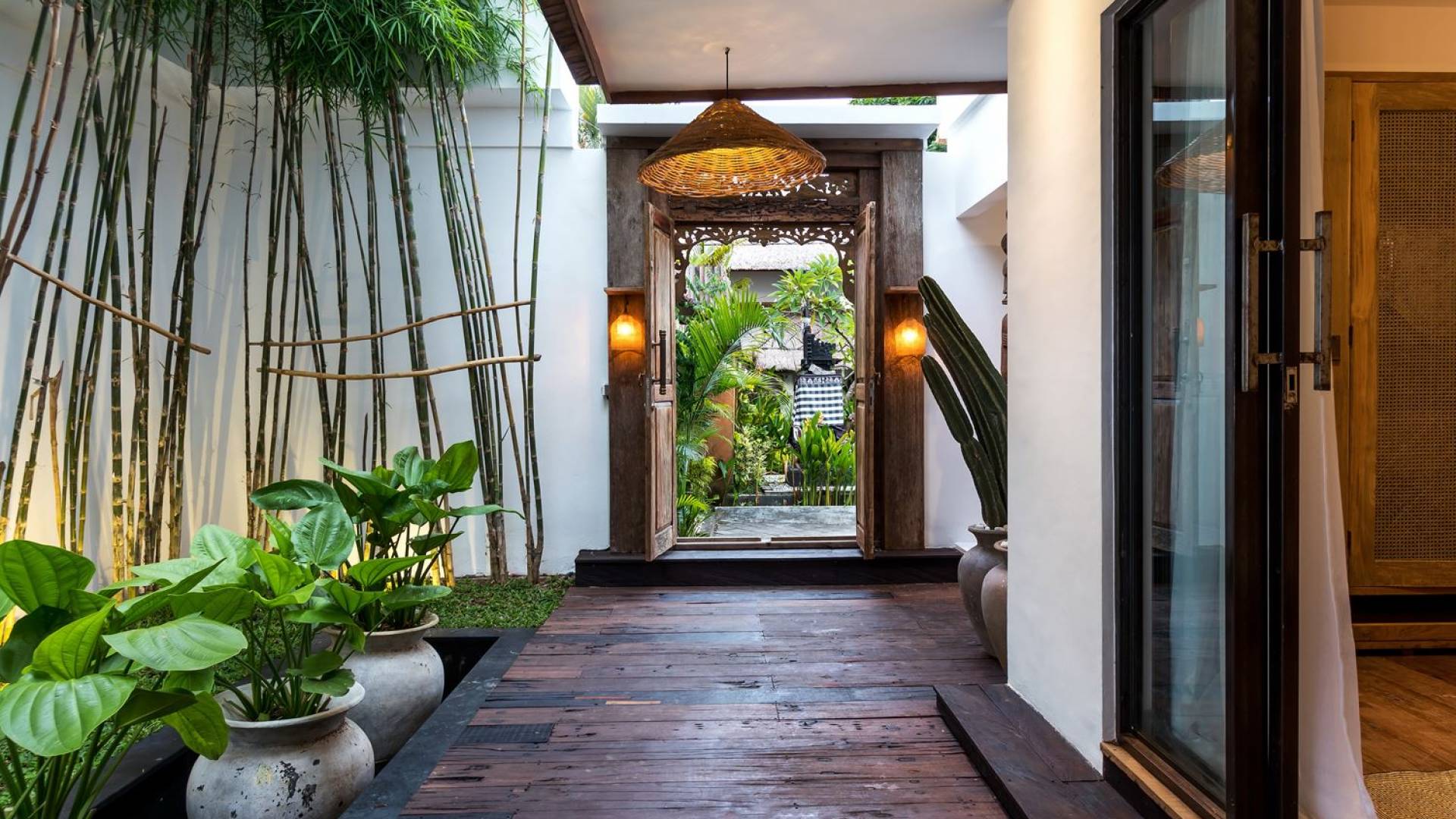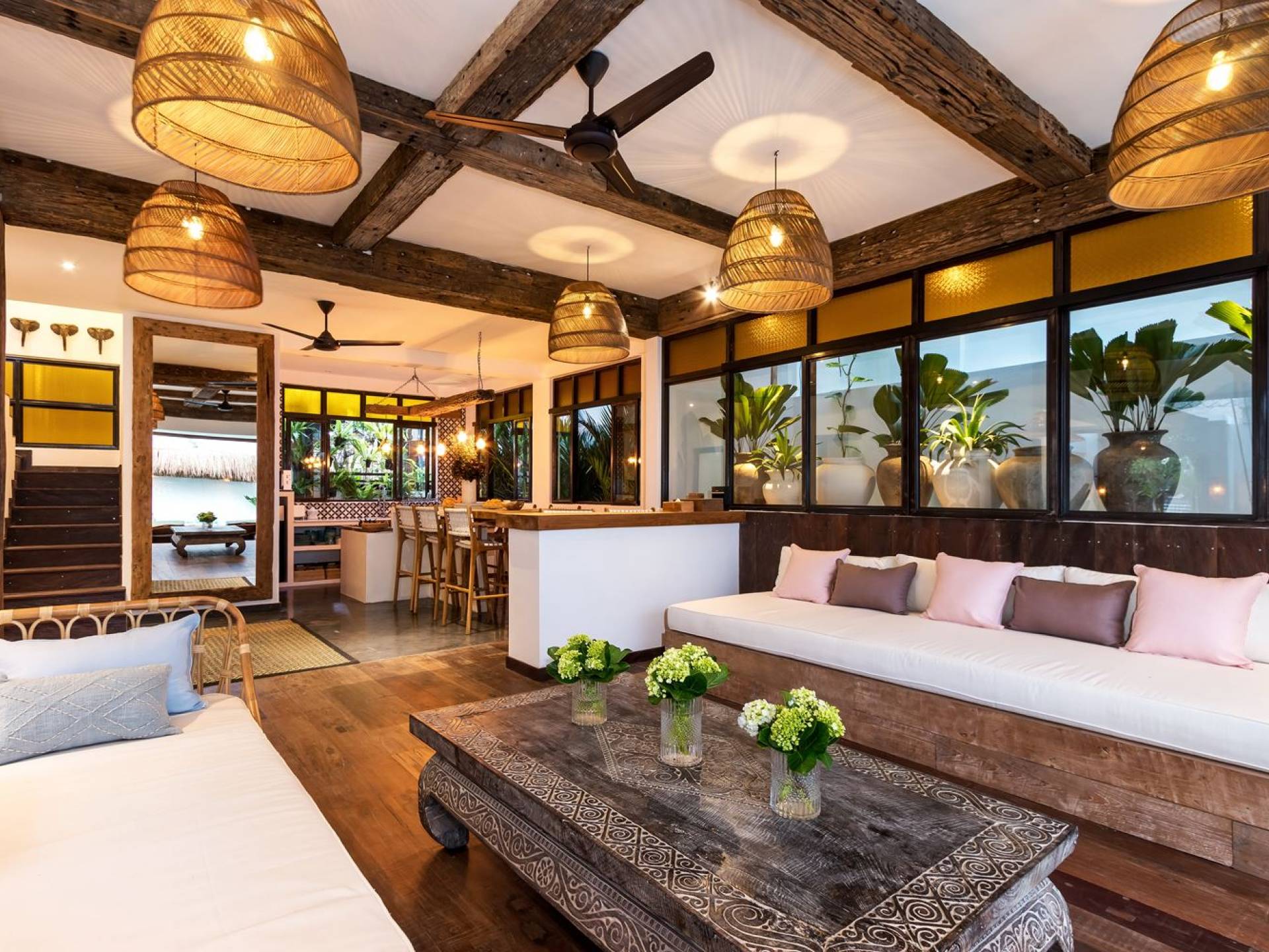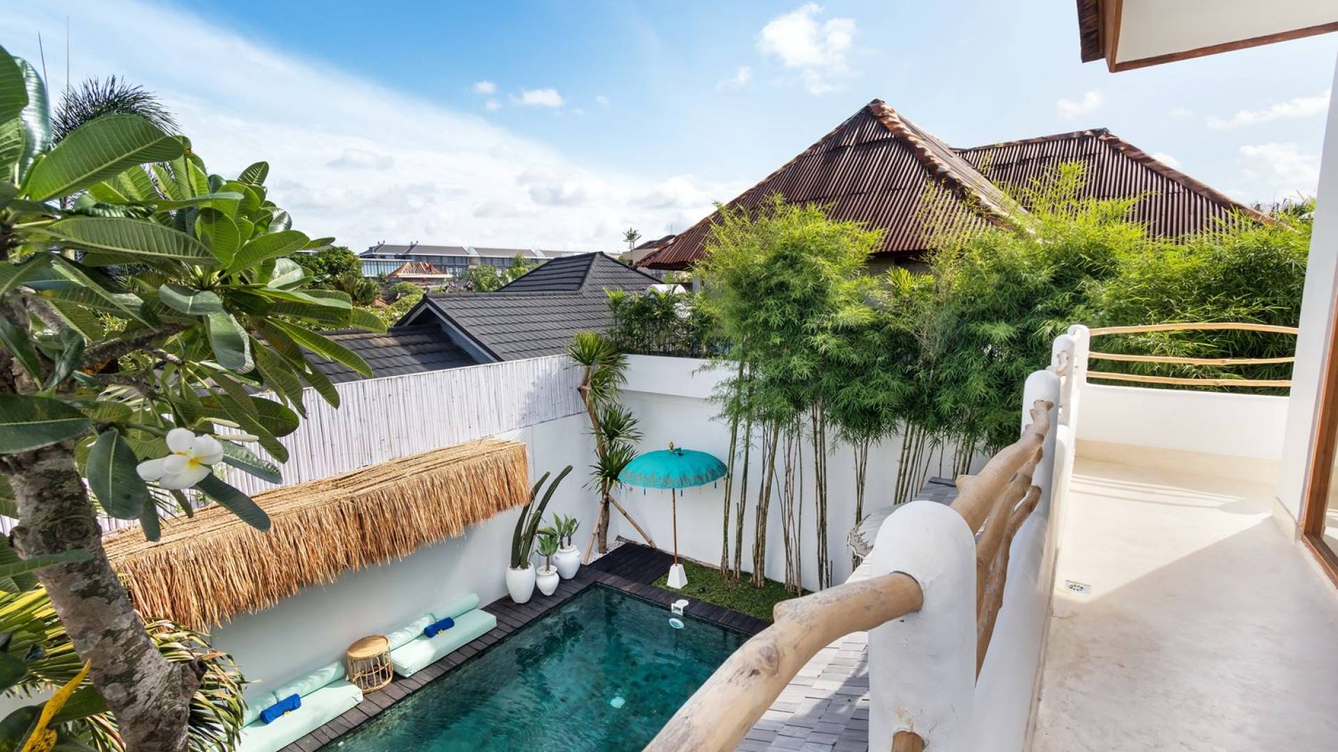 La scintillante piscina privata di 6 metri ha un'area poco profonda dove i bambini possono sguazzare e giocare e la piscina è fiancheggiata da cactus in grandi vasi di pietra dipinti di bianco e piante di bambù, aggiungendo solo l'atmosfera esotica che questa villa trasuda al rovescio. Inoltre, il giardino dispone di un laghetto e di una doccia naturale a cascata all'aperto per rinfrescarsi dopo una nuotata in piscina. Il soggiorno ventilato presenta un pavimento in legno rustico con un grande divano imbottito e un divano letto in bambù situato attorno a un tavolino da caffè finemente intagliato. Il bar bianco con seggioloni funge anche da punto di ristoro informale e dispone di prese elettriche laterali per collegare il laptop o i caricatori del telefono. A lato del soggiorno ci sono finestre aperte che consentono all'aria fresca di circolare in ogni momento. La cucina è caratterizzata da piastrelle dipinte a mano, che le conferiscono un aspetto davvero bello e unico. C'è una grande finestra che si apre su piante pendenti verdi tropicali sul retro e la cucina è attrezzata con tutto ciò di cui la tua casa vacanze Seminyak ha bisogno.