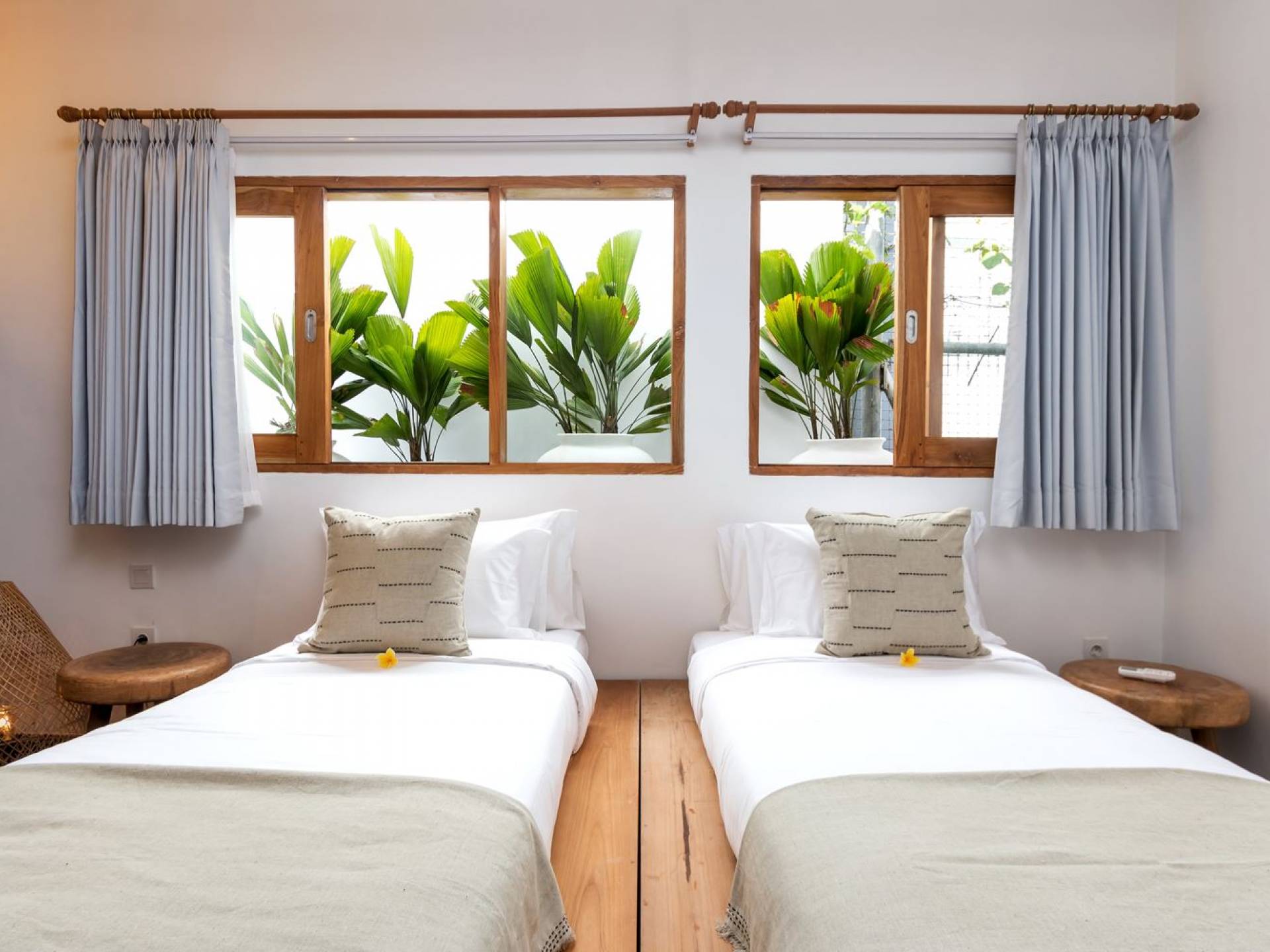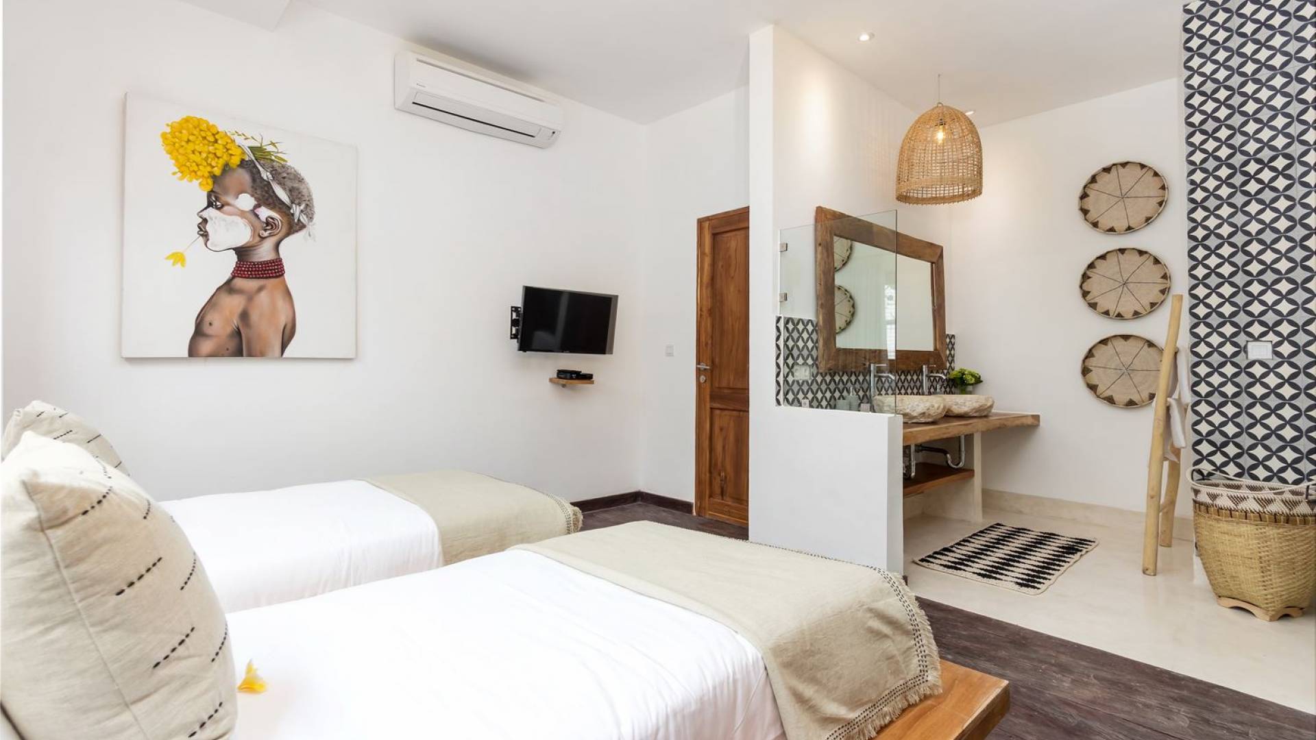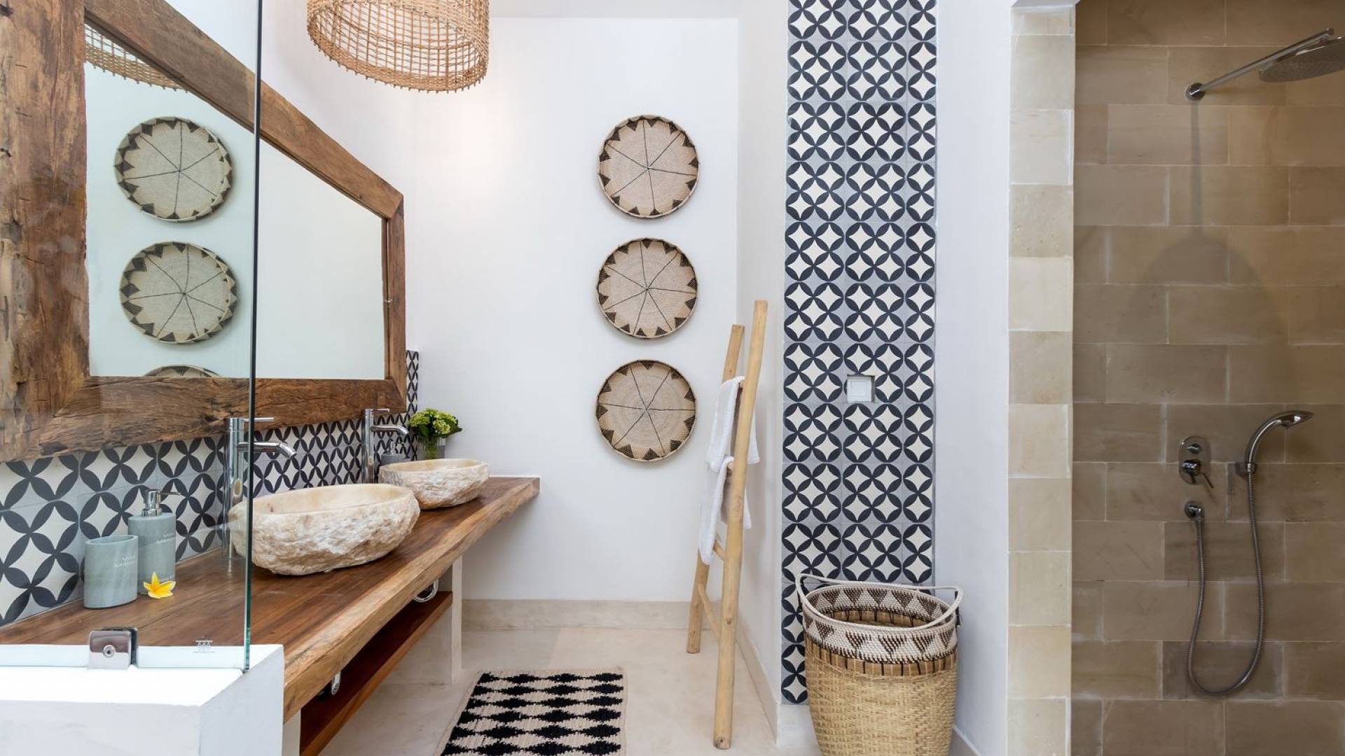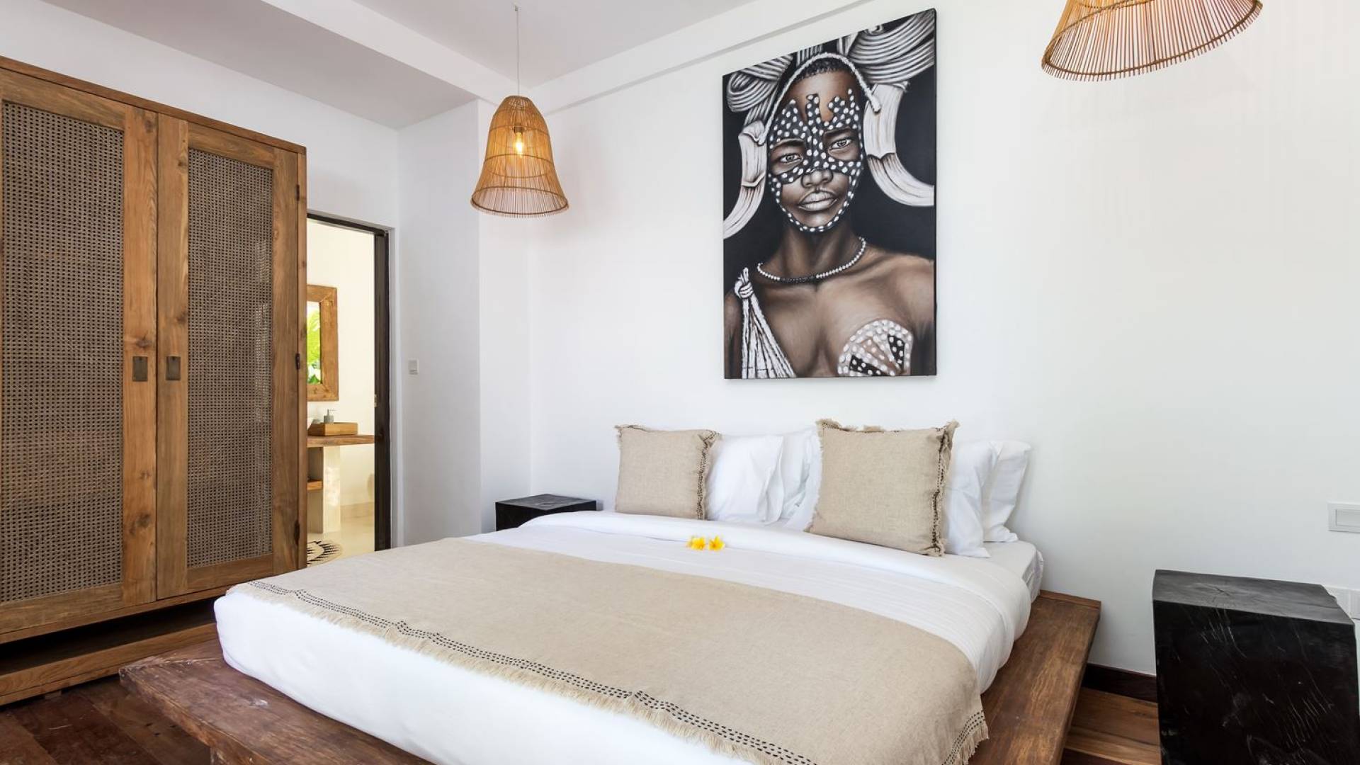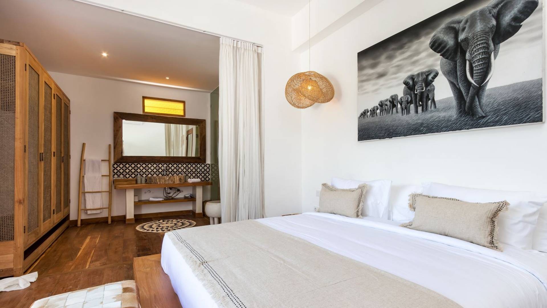 La scintillante piscina privata di 6 metri ha un'area poco profonda dove i bambini possono sguazzare e giocare e la piscina è fiancheggiata da cactus in grandi vasi di pietra dipinti di bianco e piante di bambù, aggiungendo solo l'atmosfera esotica che questa villa trasuda al rovescio. Inoltre, il giardino dispone di un laghetto e di una doccia naturale a cascata all'aperto per rinfrescarsi dopo una nuotata in piscina. Il soggiorno ventilato presenta un pavimento in legno rustico con un grande divano imbottito e un divano letto in bambù situato attorno a un tavolino da caffè finemente intagliato. Il bar bianco con seggioloni funge anche da punto di ristoro informale e dispone di prese elettriche laterali per collegare il laptop o i caricatori del telefono. A lato del soggiorno ci sono finestre aperte che consentono all'aria fresca di circolare in ogni momento. La cucina è caratterizzata da piastrelle dipinte a mano, che le conferiscono un aspetto davvero bello e unico. C'è una grande finestra che si apre su piante pendenti verdi tropicali sul retro e la cucina è attrezzata con tutto ciò di cui la tua casa vacanze Seminyak ha bisogno.