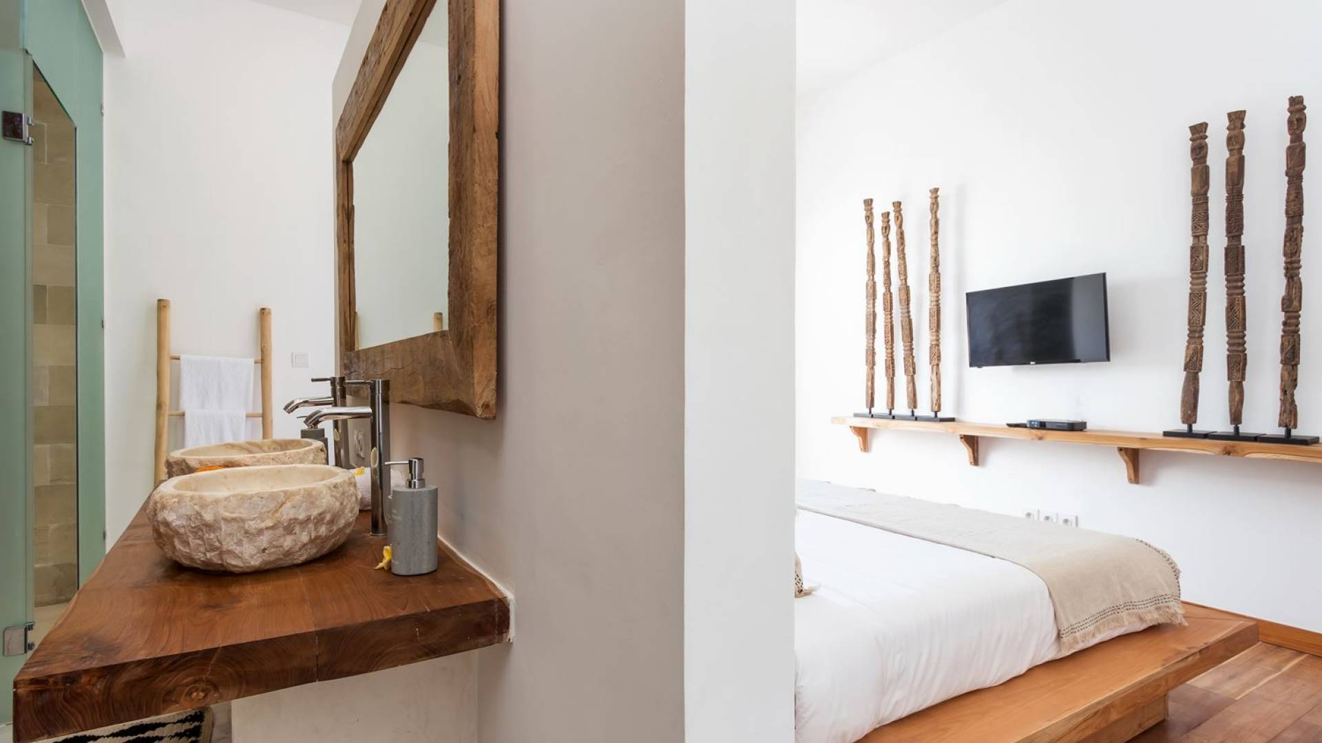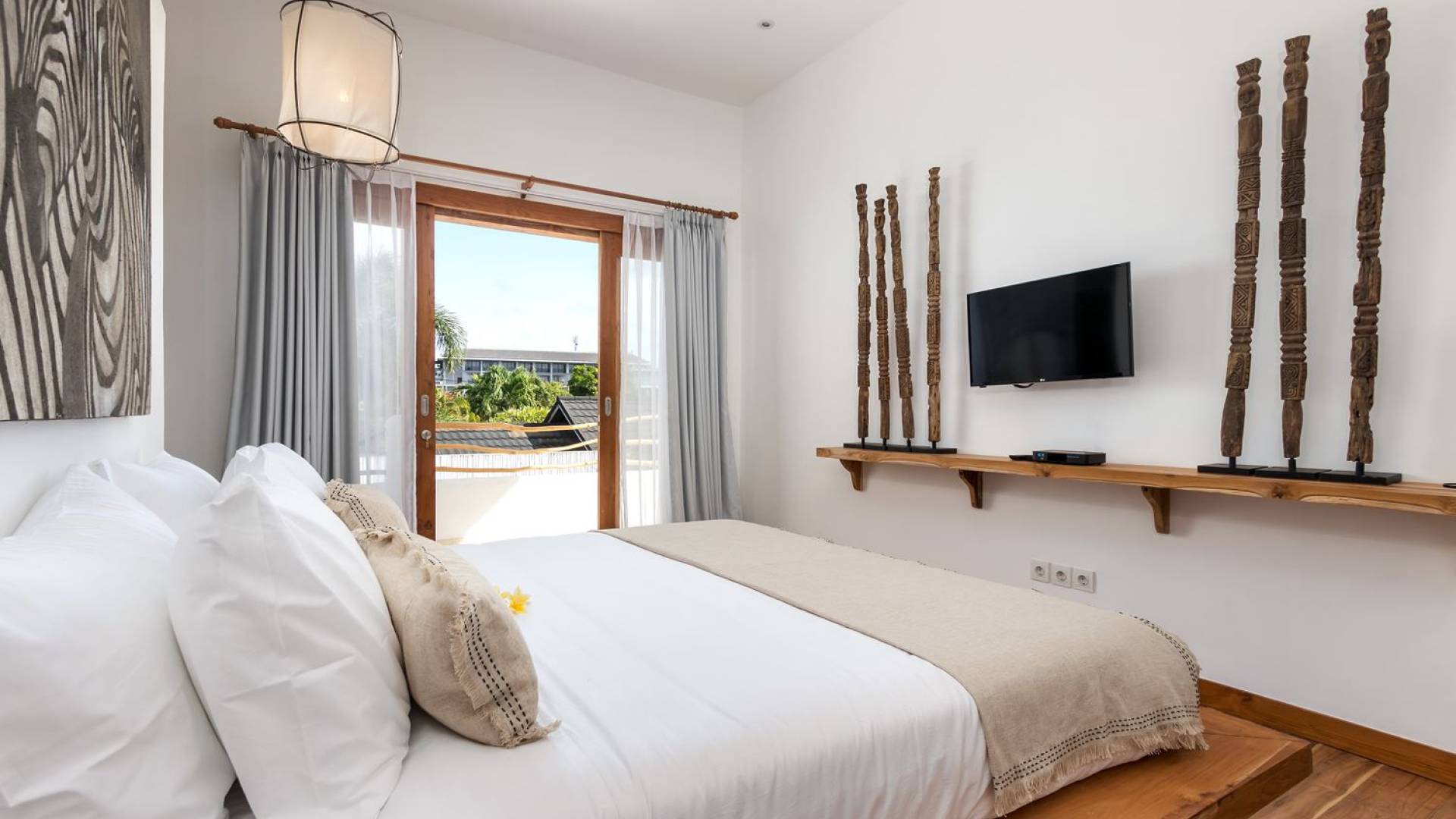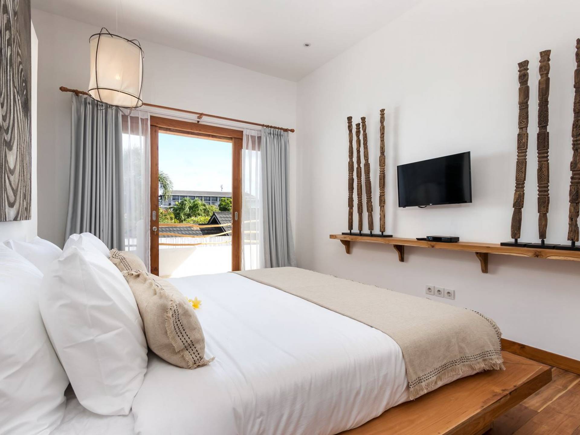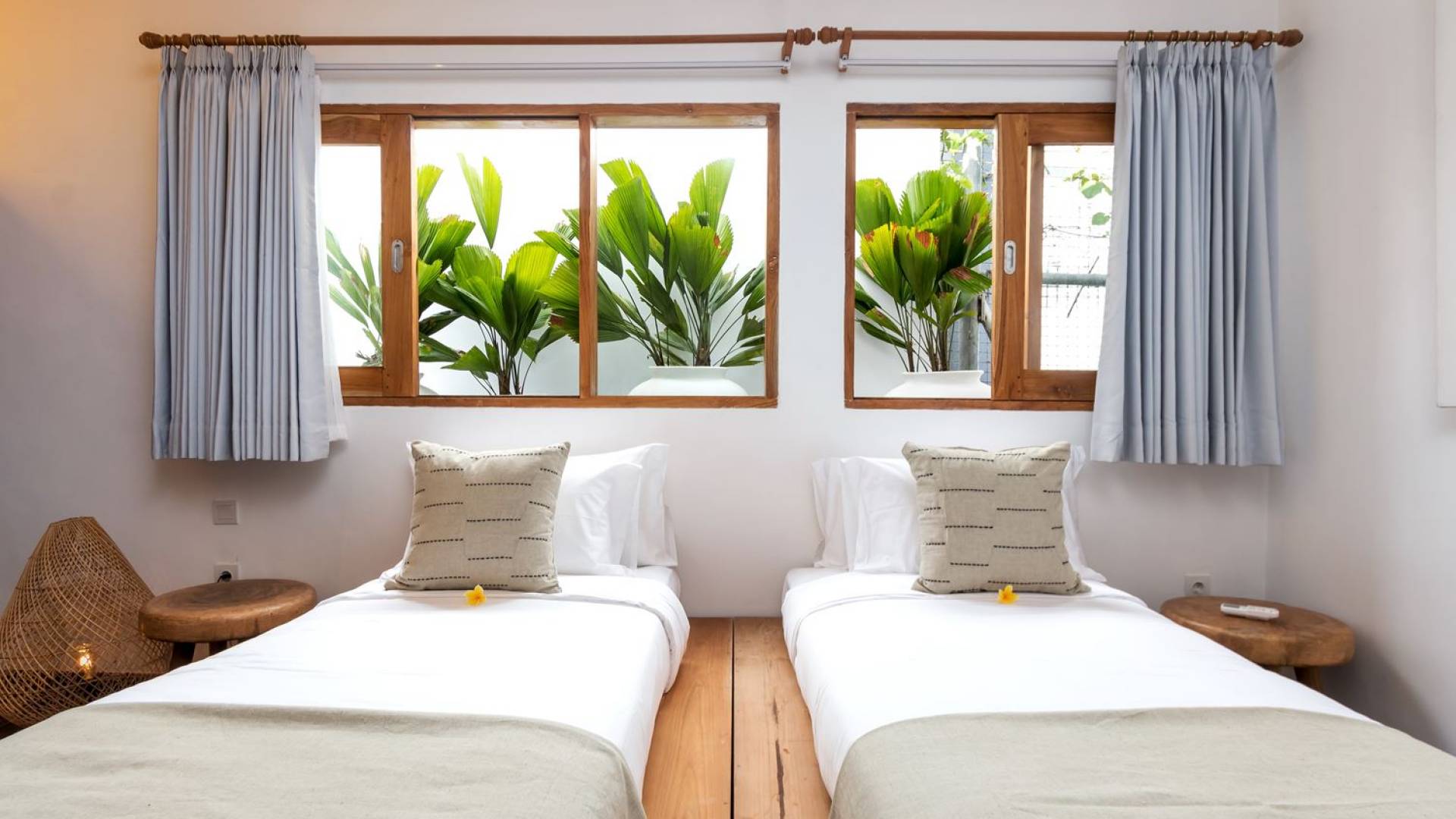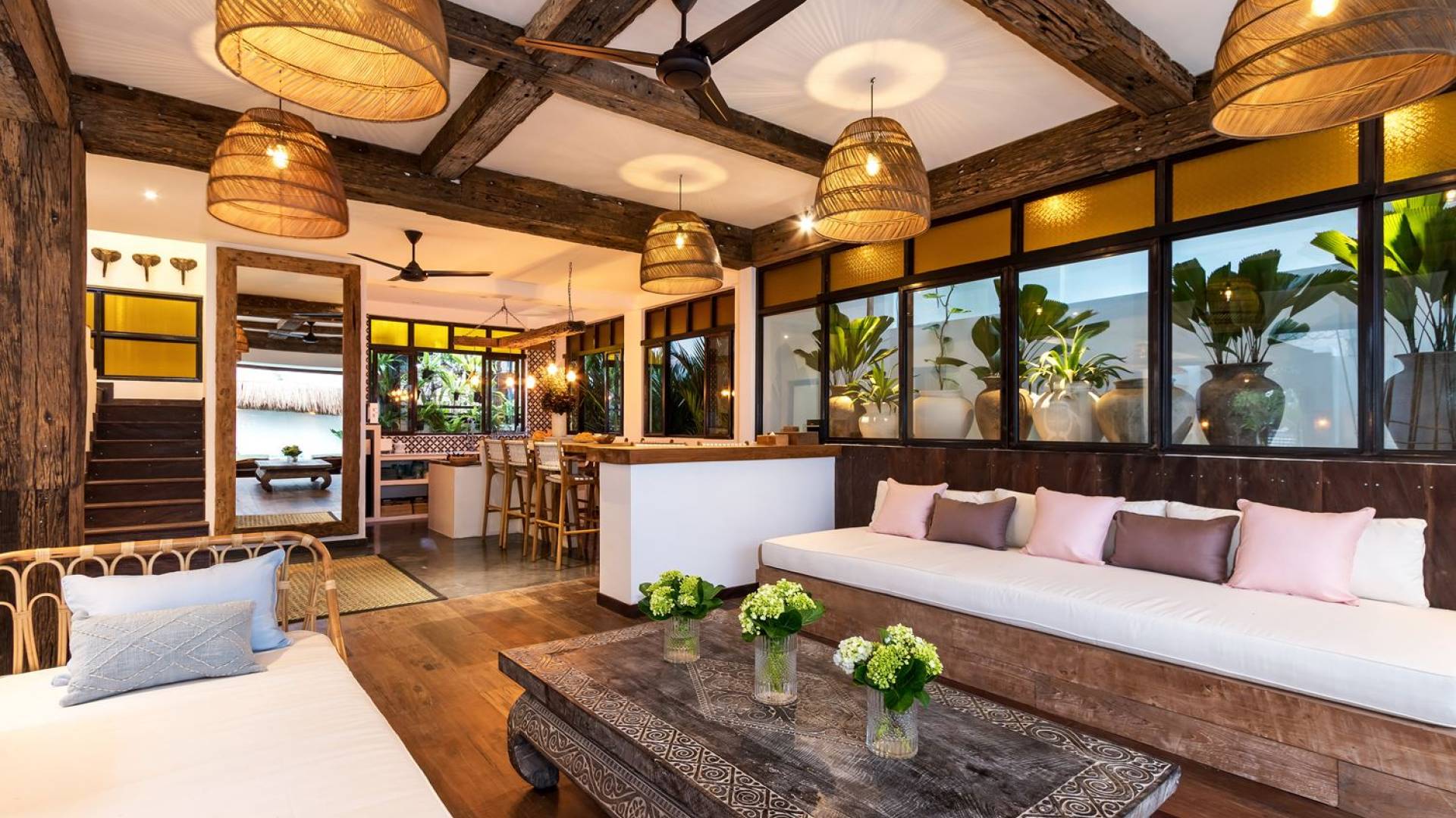 La scintillante piscina privata di 6 metri ha un'area poco profonda dove i bambini possono sguazzare e giocare e la piscina è fiancheggiata da cactus in grandi vasi di pietra dipinti di bianco e piante di bambù, aggiungendo solo l'atmosfera esotica che questa villa trasuda al rovescio. Inoltre, il giardino dispone di un laghetto e di una doccia naturale a cascata all'aperto per rinfrescarsi dopo una nuotata in piscina. Il soggiorno ventilato presenta un pavimento in legno rustico con un grande divano imbottito e un divano letto in bambù situato attorno a un tavolino da caffè finemente intagliato. Il bar bianco con seggioloni funge anche da punto di ristoro informale e dispone di prese elettriche laterali per collegare il laptop o i caricatori del telefono. A lato del soggiorno ci sono finestre aperte che consentono all'aria fresca di circolare in ogni momento. La cucina è caratterizzata da piastrelle dipinte a mano, che le conferiscono un aspetto davvero bello e unico. C'è una grande finestra che si apre su piante pendenti verdi tropicali sul retro e la cucina è attrezzata con tutto ciò di cui la tua casa vacanze Seminyak ha bisogno.