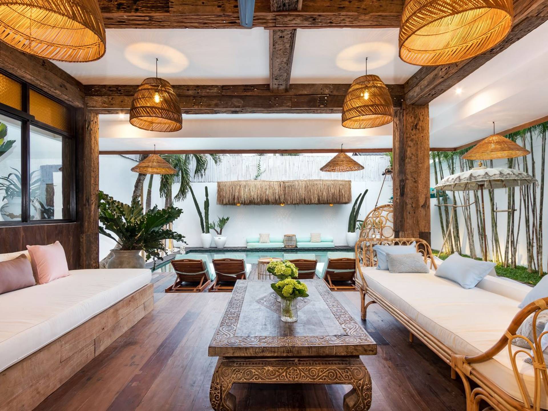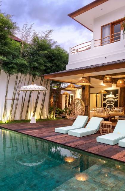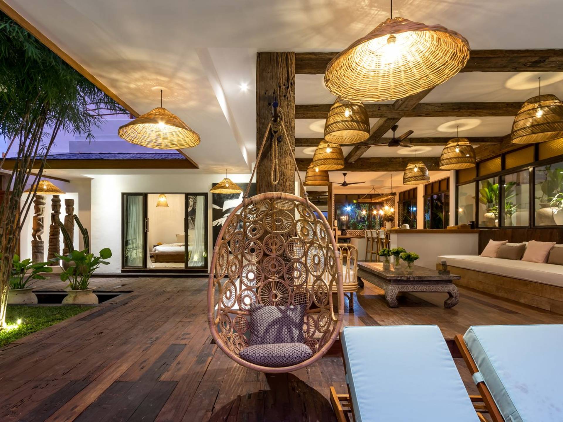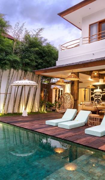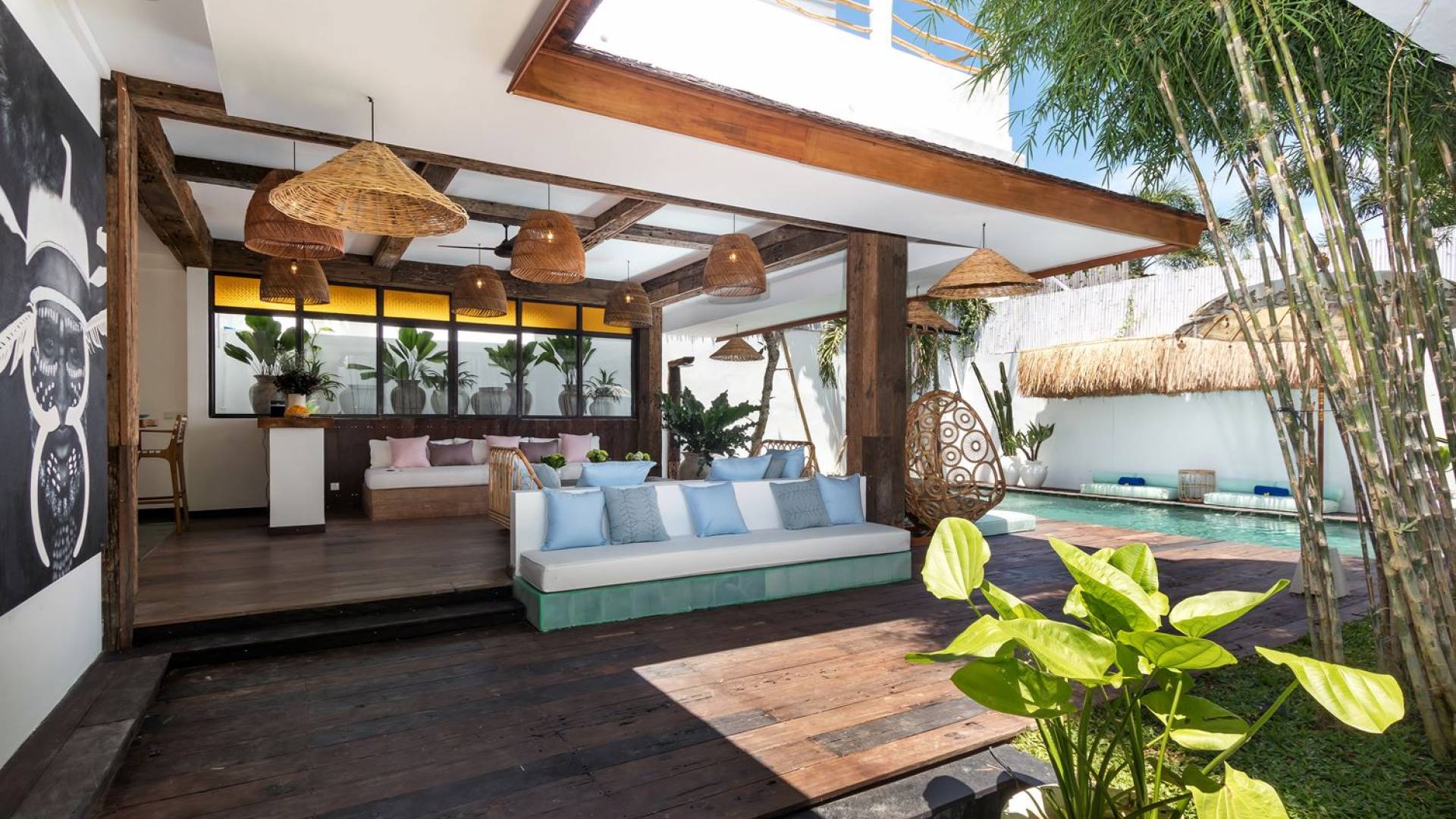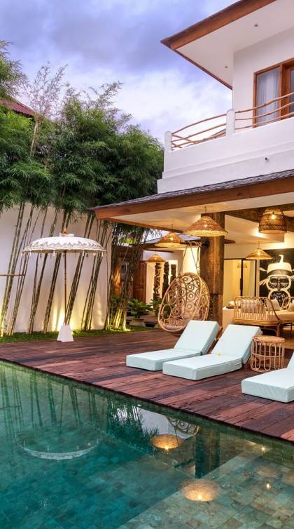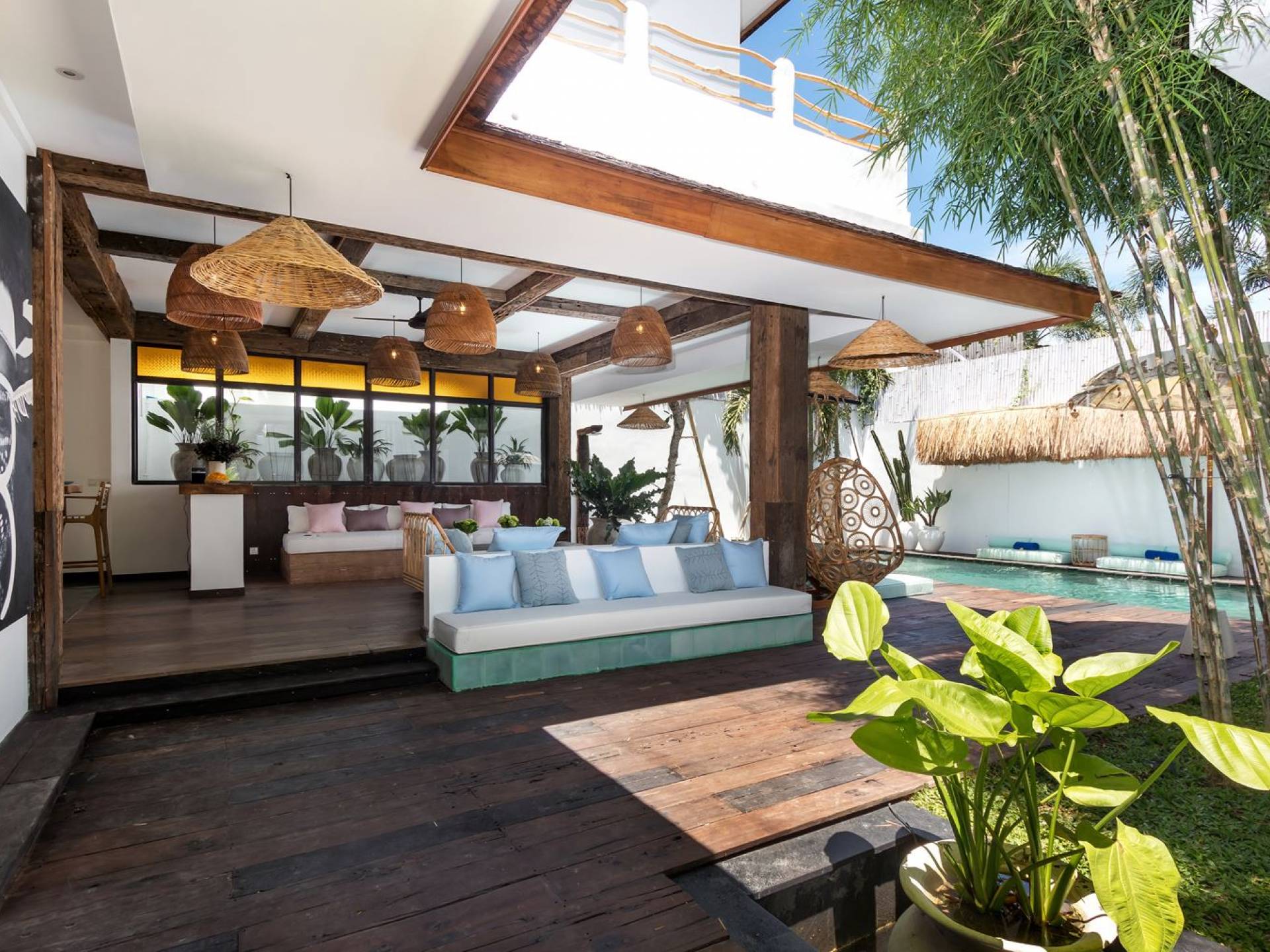 Villa Metisse si trova alla fine di una piccola banda nel centro di Seminyak, amorevolmente vicino alla spiaggia. Dal parcheggio privato, si accede a questa bellissima villa di lusso tropicale chic, entrando nel grazioso giardino privato. Le aree interne ed esterne sono infatti fuse in un unico grande e glorioso rifugio. Villa Metisse dispone di uno splendido soggiorno a pianta aperta, progettato con legno di teak, pietra naturale, rattan e bambù, tutto naturale. Il soggiorno è rialzato a solo un piccolo passo dalla terrazza coperta a bordo piscina, dove è possibile rilassarsi su comodi e eleganti lettini prendisole o rannicchiarsi sulla sedia a dondolo in bambù fatta a mano. Rilassati o sonnecchia un po', leggi un libro, ascolta musica o naviga in Internet gratuito sul tuo smartphone, lo farai in modi eleganti e tropicali. Questa elegante poltrona sospesa in bambù è anche un luogo incantevole per scattare alcune foto altamente compatibili con Instagram.