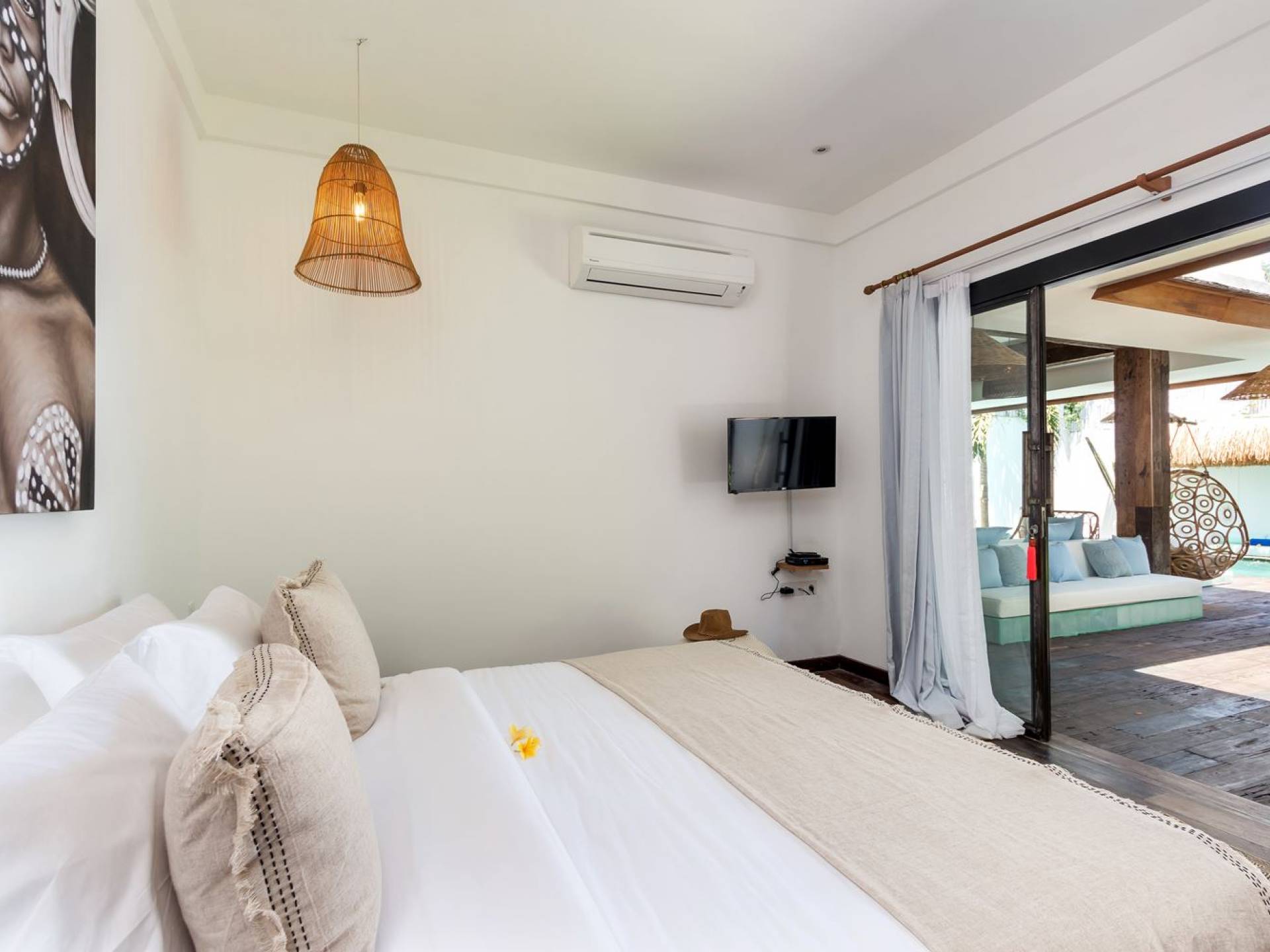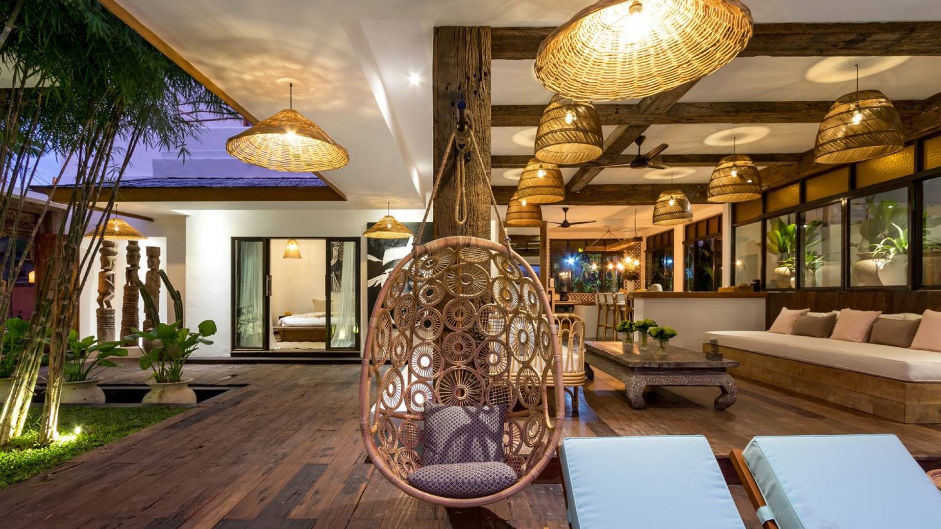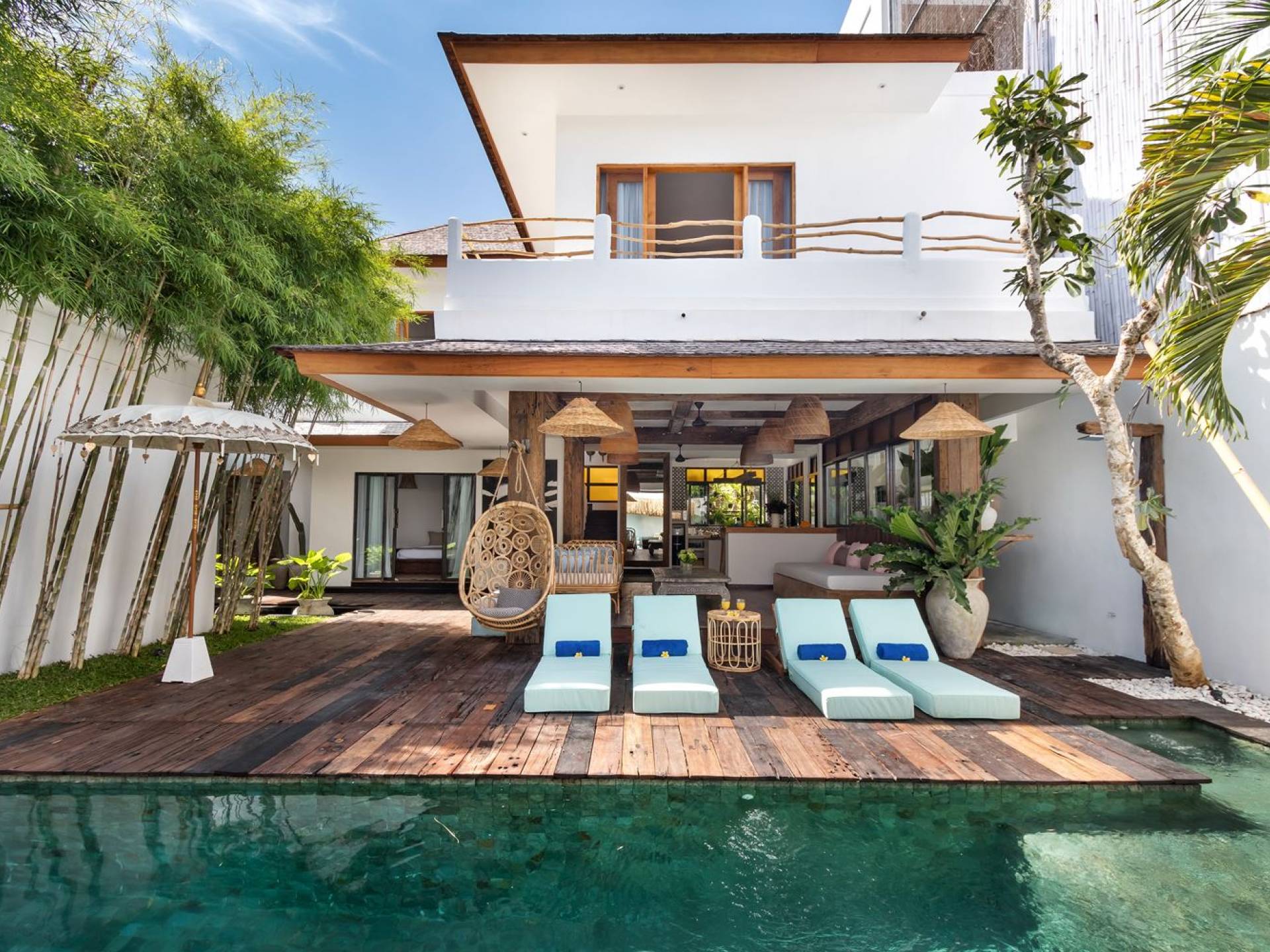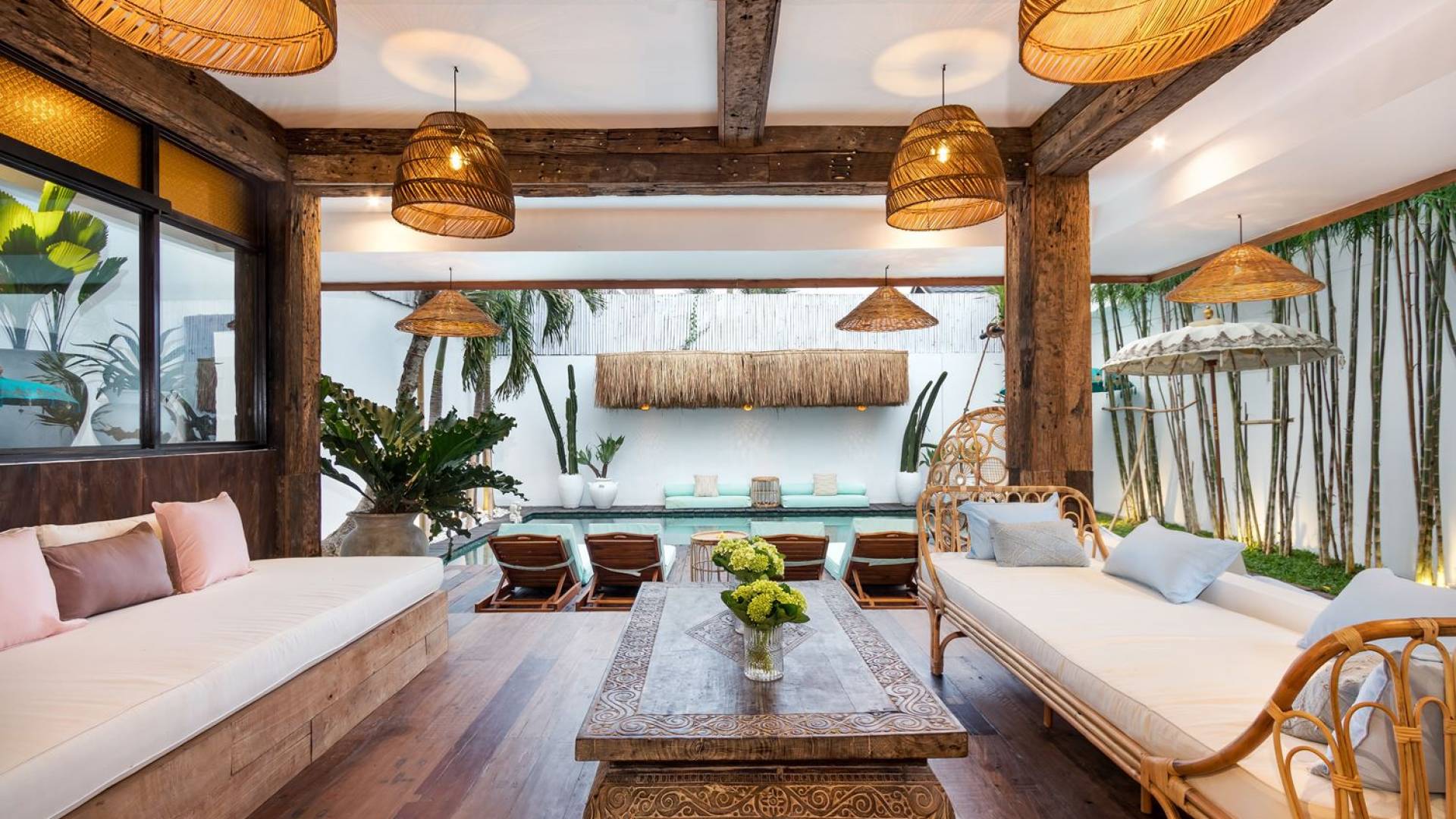 Villa Metisse si trova alla fine di una piccola banda nel centro di Seminyak, amorevolmente vicino alla spiaggia. Dal parcheggio privato, si accede a questa bellissima villa di lusso tropicale chic, entrando nel grazioso giardino privato. Le aree interne ed esterne sono infatti fuse in un unico grande e glorioso rifugio. Villa Metisse dispone di uno splendido soggiorno a pianta aperta, progettato con legno di teak, pietra naturale, rattan e bambù, tutto naturale. Il soggiorno è rialzato a solo un piccolo passo dalla terrazza coperta a bordo piscina, dove è possibile rilassarsi su comodi e eleganti lettini prendisole o rannicchiarsi sulla sedia a dondolo in bambù fatta a mano. Rilassati o sonnecchia un po', leggi un libro, ascolta musica o naviga in Internet gratuito sul tuo smartphone, lo farai in modi eleganti e tropicali. Questa elegante poltrona sospesa in bambù è anche un luogo incantevole per scattare alcune foto altamente compatibili con Instagram.