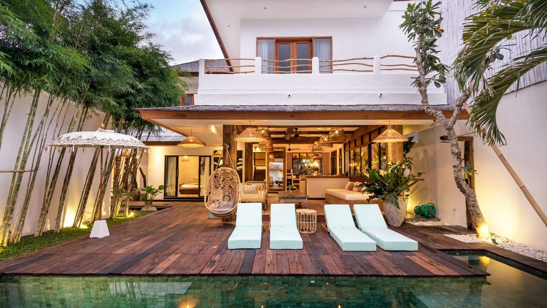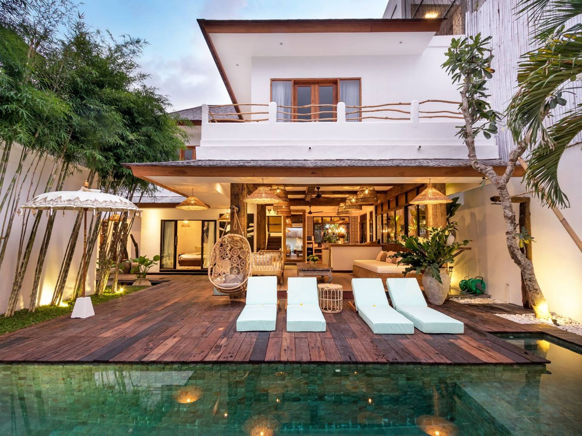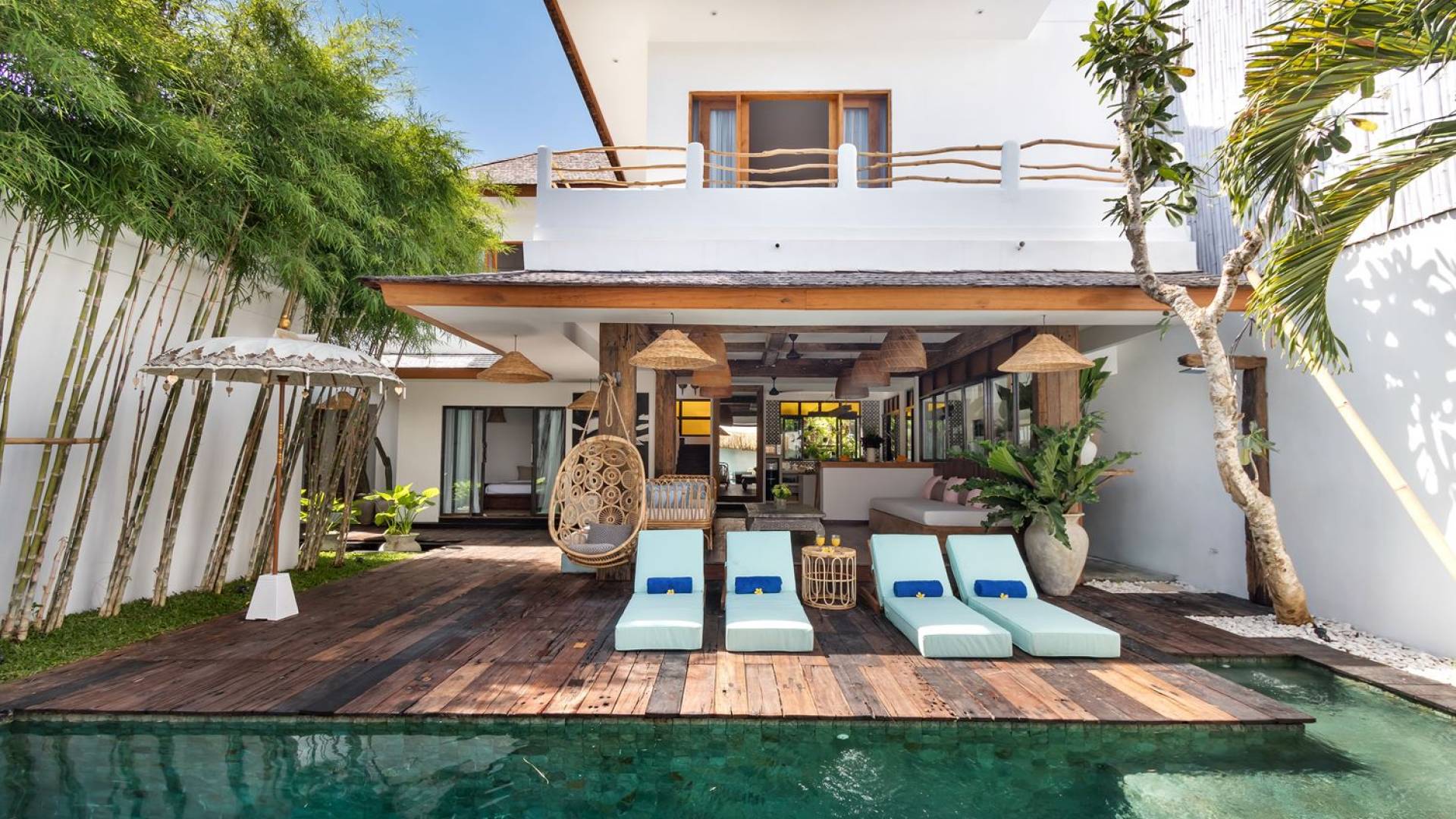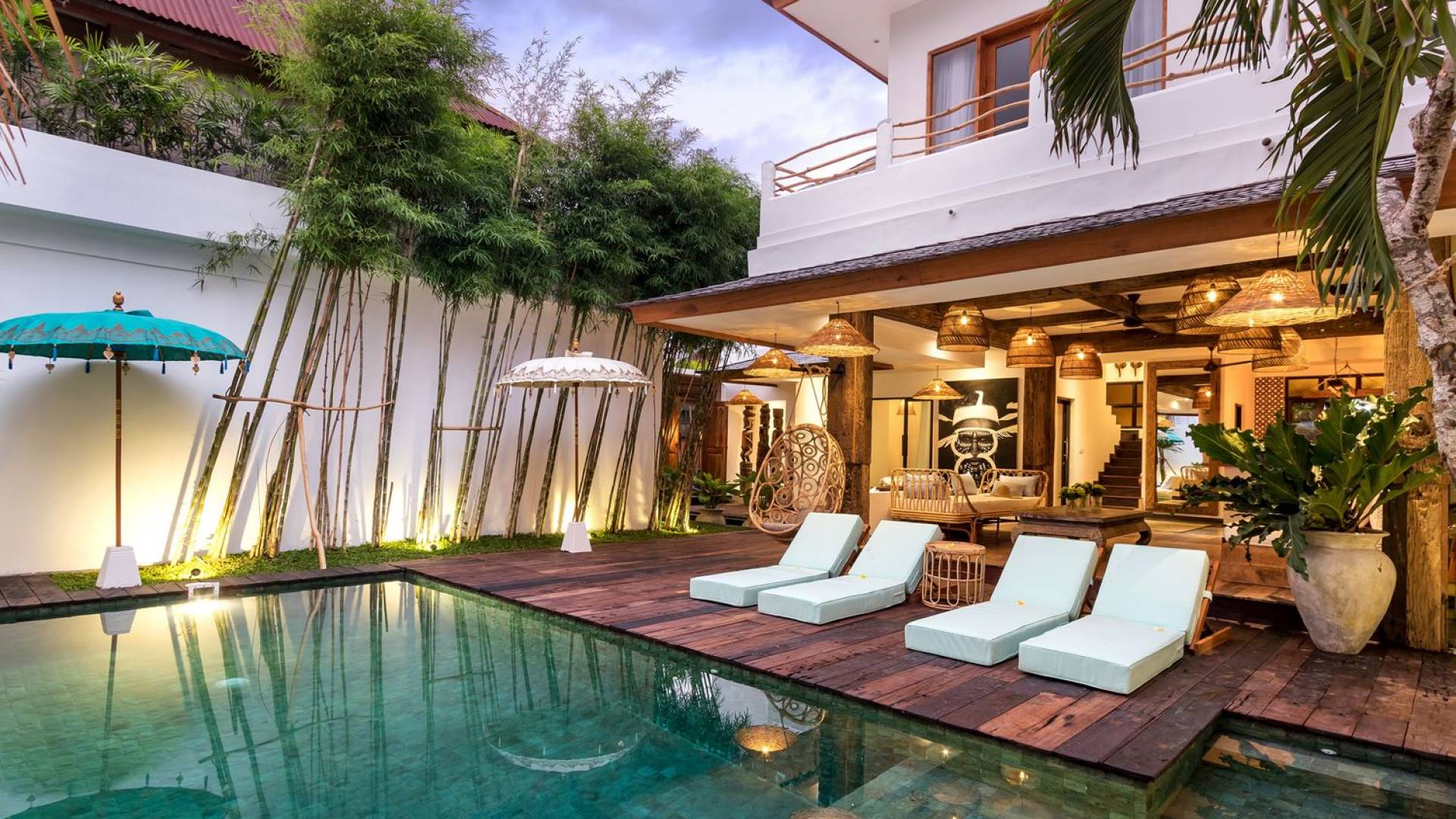 Villa Metisse si trova alla fine di una piccola banda nel centro di Seminyak, amorevolmente vicino alla spiaggia. Dal parcheggio privato, si accede a questa bellissima villa di lusso tropicale chic, entrando nel grazioso giardino privato. Le aree interne ed esterne sono infatti fuse in un unico grande e glorioso rifugio. Villa Metisse dispone di uno splendido soggiorno a pianta aperta, progettato con legno di teak, pietra naturale, rattan e bambù, tutto naturale. Il soggiorno è rialzato a solo un piccolo passo dalla terrazza coperta a bordo piscina, dove è possibile rilassarsi su comodi e eleganti lettini prendisole o rannicchiarsi sulla sedia a dondolo in bambù fatta a mano. Rilassati o sonnecchia un po', leggi un libro, ascolta musica o naviga in Internet gratuito sul tuo smartphone, lo farai in modi eleganti e tropicali. Questa elegante poltrona sospesa in bambù è anche un luogo incantevole per scattare alcune foto altamente compatibili con Instagram.
