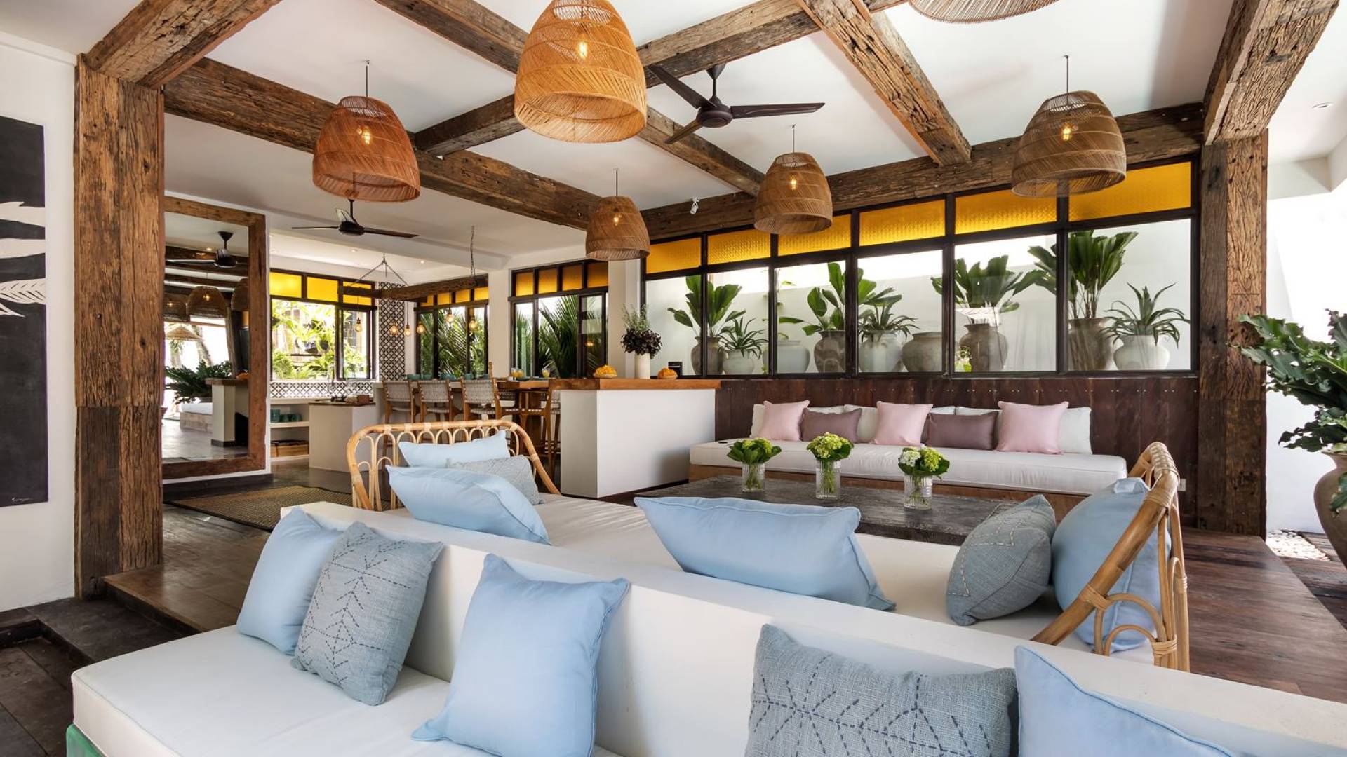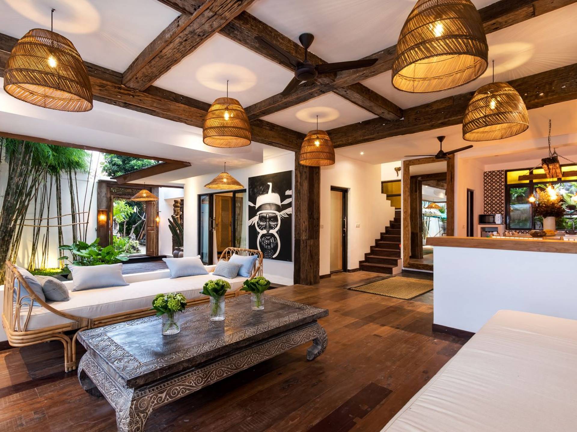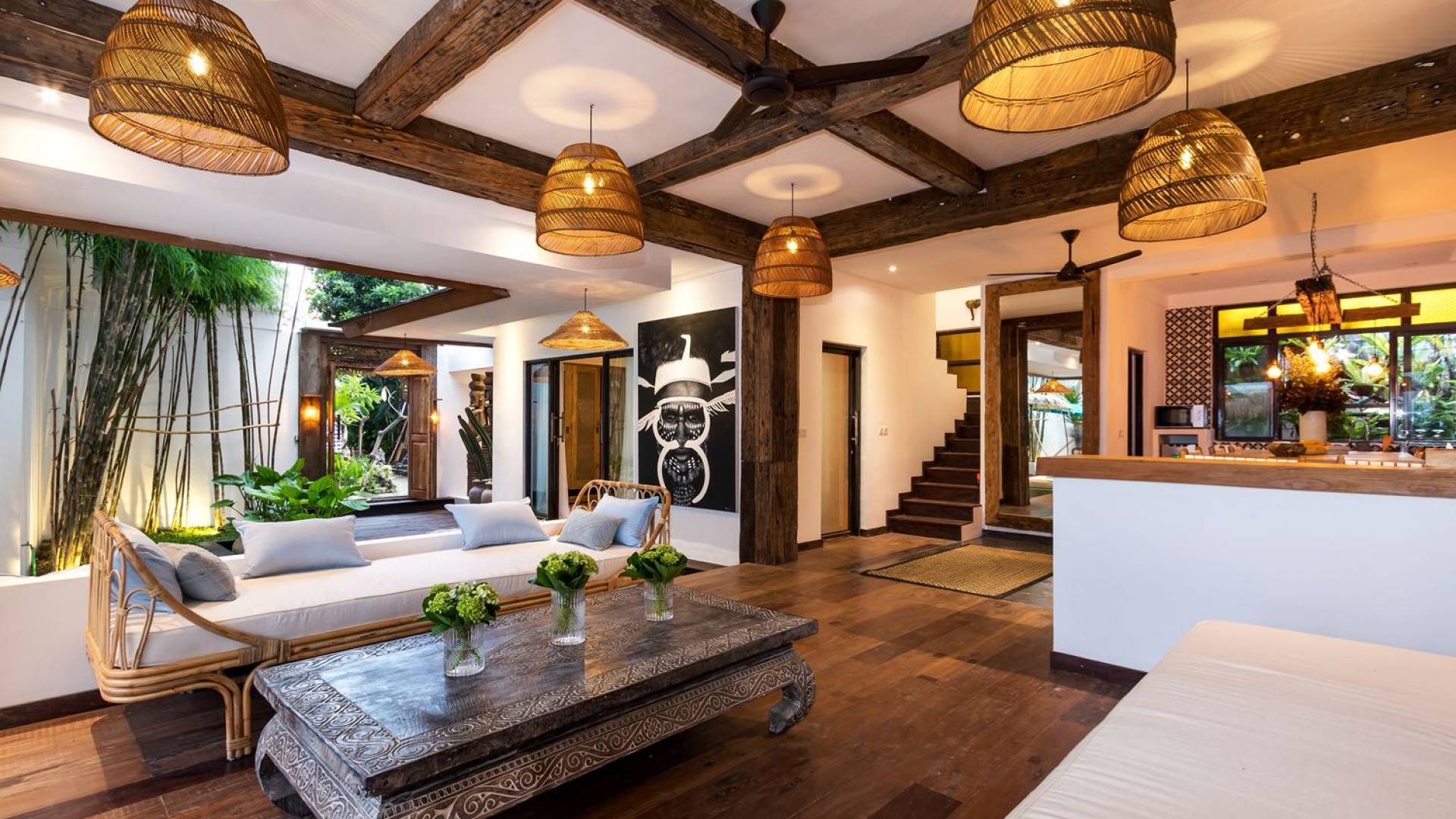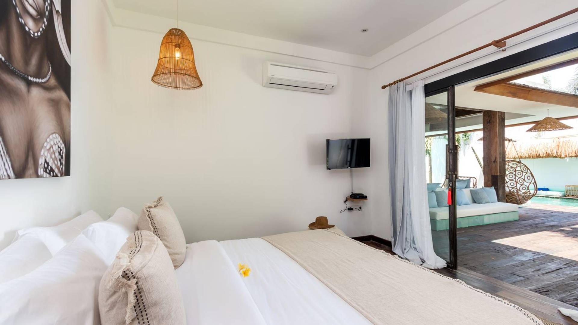 Villa Metisse si trova alla fine di una piccola banda nel centro di Seminyak, amorevolmente vicino alla spiaggia. Dal parcheggio privato, si accede a questa bellissima villa di lusso tropicale chic, entrando nel grazioso giardino privato. Le aree interne ed esterne sono infatti fuse in un unico grande e glorioso rifugio. Villa Metisse dispone di uno splendido soggiorno a pianta aperta, progettato con legno di teak, pietra naturale, rattan e bambù, tutto naturale. Il soggiorno è rialzato a solo un piccolo passo dalla terrazza coperta a bordo piscina, dove è possibile rilassarsi su comodi e eleganti lettini prendisole o rannicchiarsi sulla sedia a dondolo in bambù fatta a mano. Rilassati o sonnecchia un po', leggi un libro, ascolta musica o naviga in Internet gratuito sul tuo smartphone, lo farai in modi eleganti e tropicali. Questa elegante poltrona sospesa in bambù è anche un luogo incantevole per scattare alcune foto altamente compatibili con Instagram.