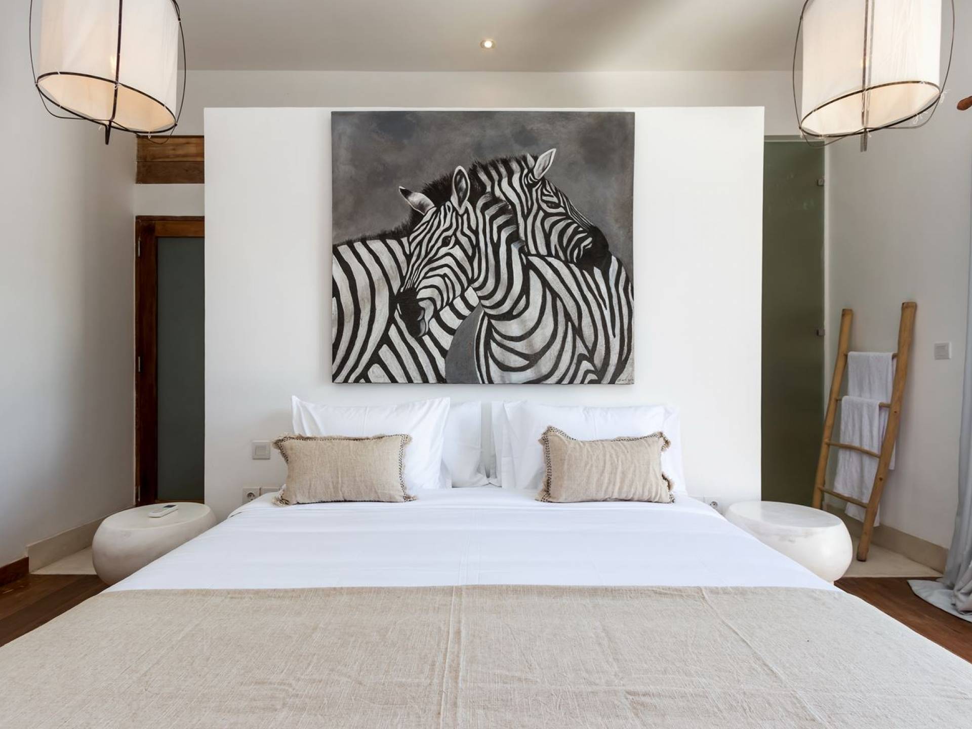 La villa ospita 4 camere da letto, 1 al piano terra e 3 al primo piano, comunicanti con un balcone in comune con splendida vista sul giardino. La tenuta dispone di un'ampia camera da letto principale e 3 camere da letto per gli ospiti. 3 camere sono dotate di letti matrimoniali queen size e 1 con due letti singoli. Tutte le 4 camere sono dotate di aria condizionata, cassette di sicurezza e TV satellitare. Ci sono armadi generosi e un bagno privato privato con lavabi, servizi igienici e lussuose docce a pioggia con acqua calda e fredda. Non importa in quale di queste 4 camere alloggerai, puoi essere certo di un sonno riposante e perfettamente confortevole.