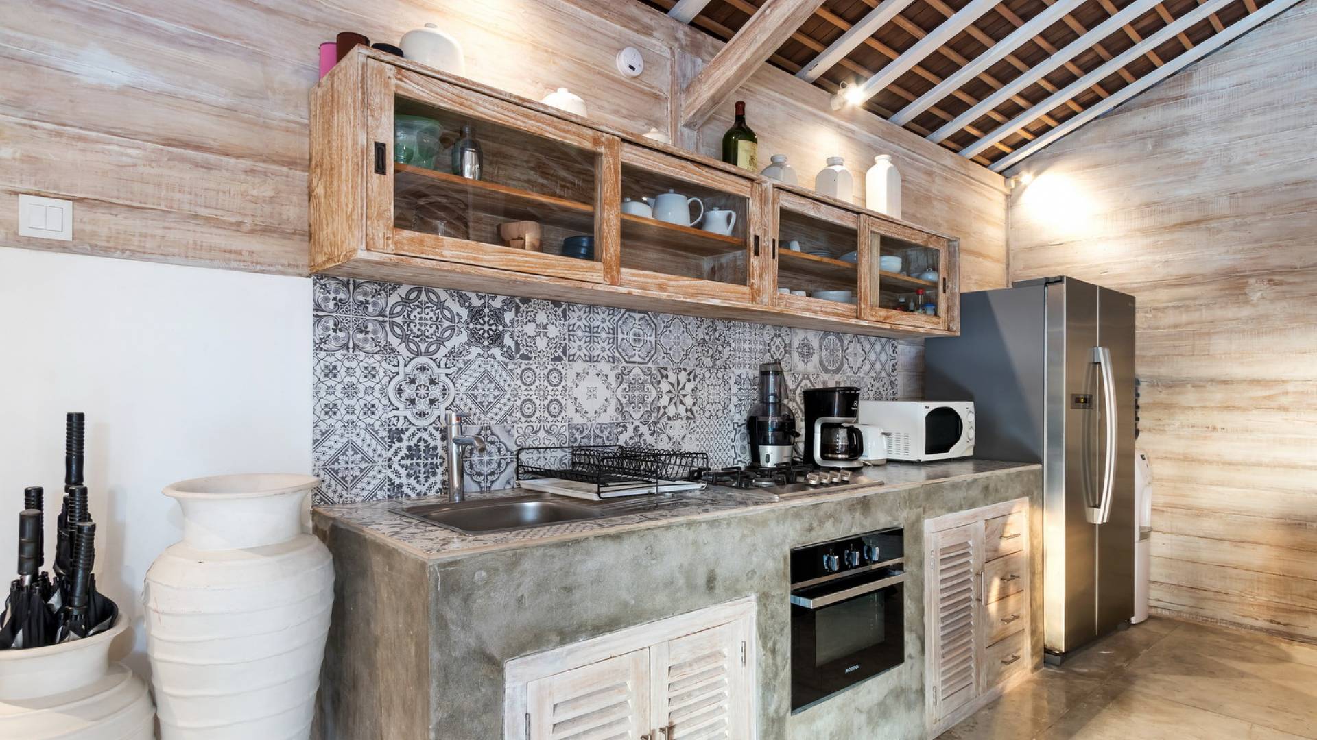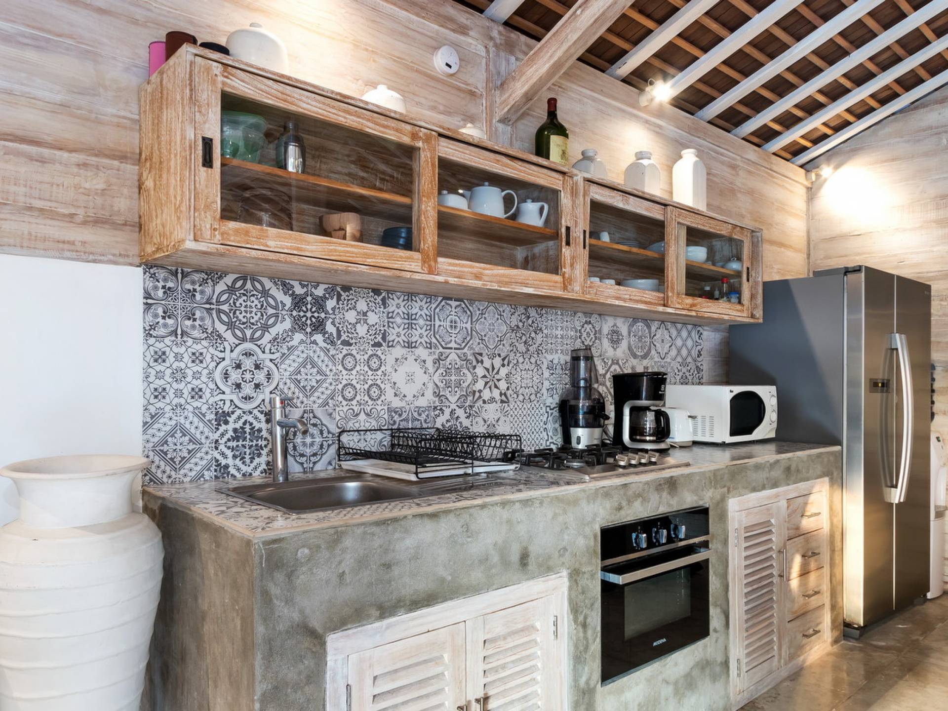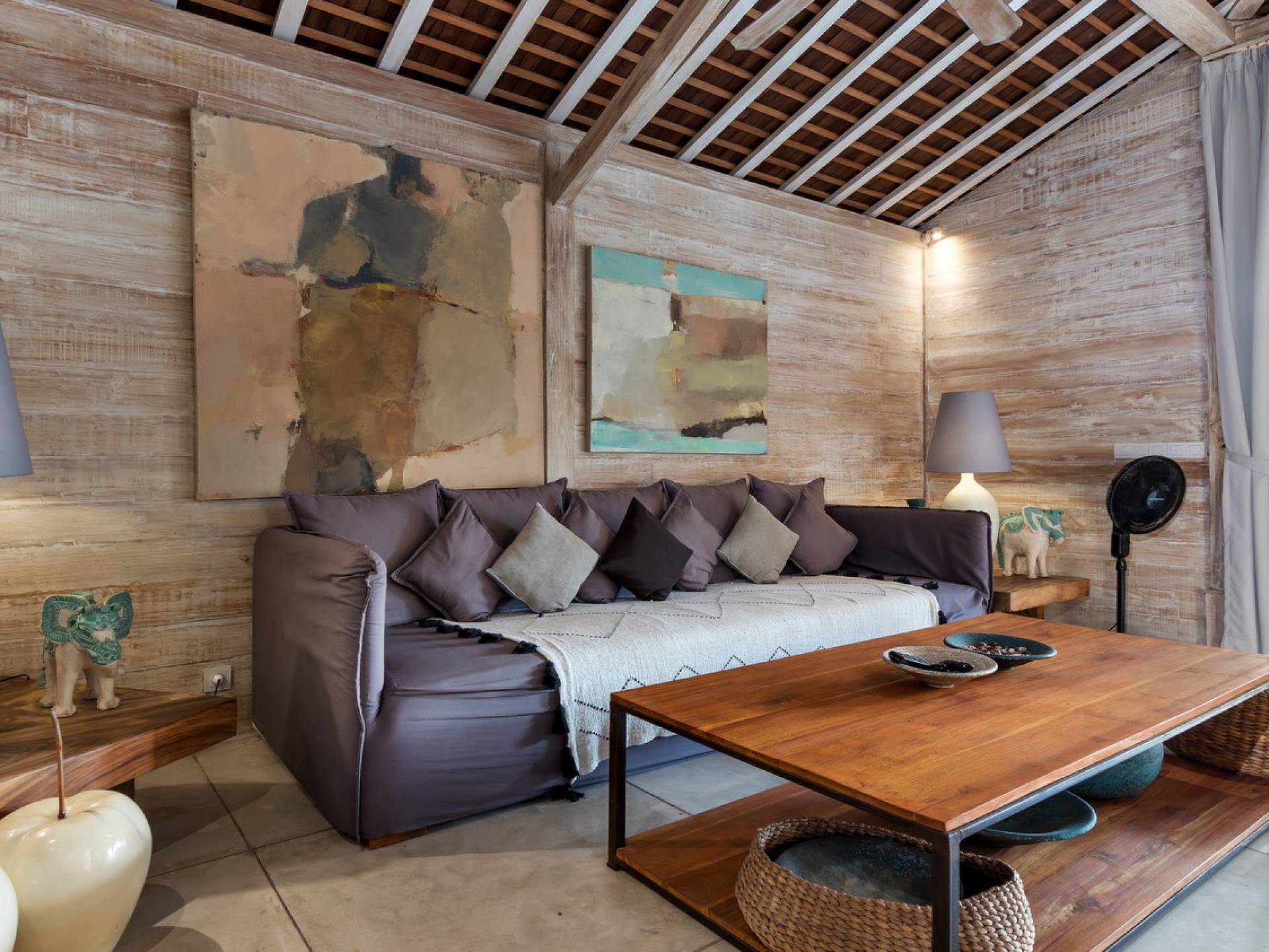 La zona giorno ha un aspetto moderno e luminoso con colori chiari caldi, oggetti artistici, mobili in legno e un pavimento in terrazzo. Al centro della stanza, sotto una struttura in legno sbiancato, si trova la zona pranzo che può essere separata dal resto della stanza chiudendo le sue tende bianche. C'è un bellissimo tavolo da pranzo in legno spesso con 6 sedie morbide e belle lampade eleganti sopra di esso per creare una bella atmosfera durante la tua deliziosa cena. Sulla destra, troverai l'area lounge con un grande e comodo divano viola, due sedie a sdraio abbinate, un tavolino in legno decorato con pentole e candele tradizionali e un televisore a schermo piatto con lettore DVD. Questo è un ottimo posto per sedersi insieme in una serata pigra e guardare un film. La moderna cucina a vista è dotata di tutto il necessario, compreso un forno, un grande frigorifero, un distributore d'acqua e un bancone all'americana.
