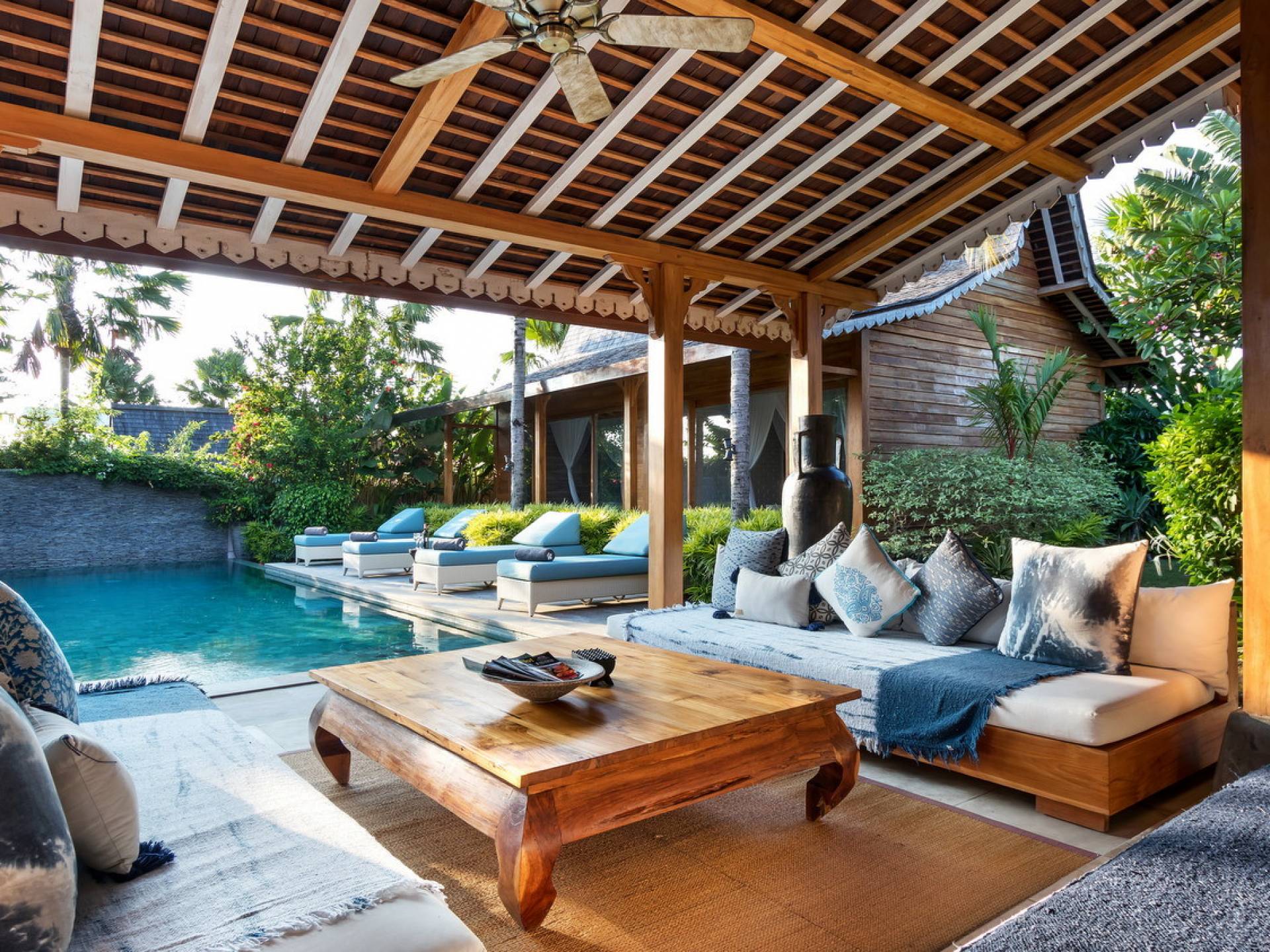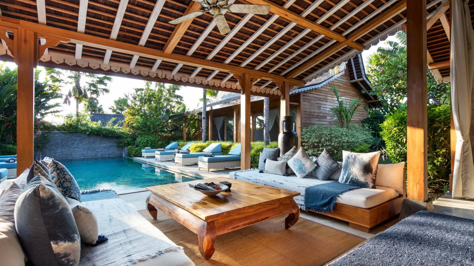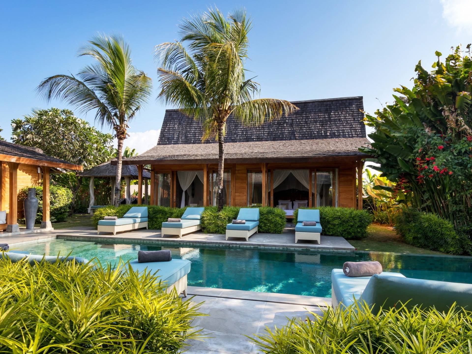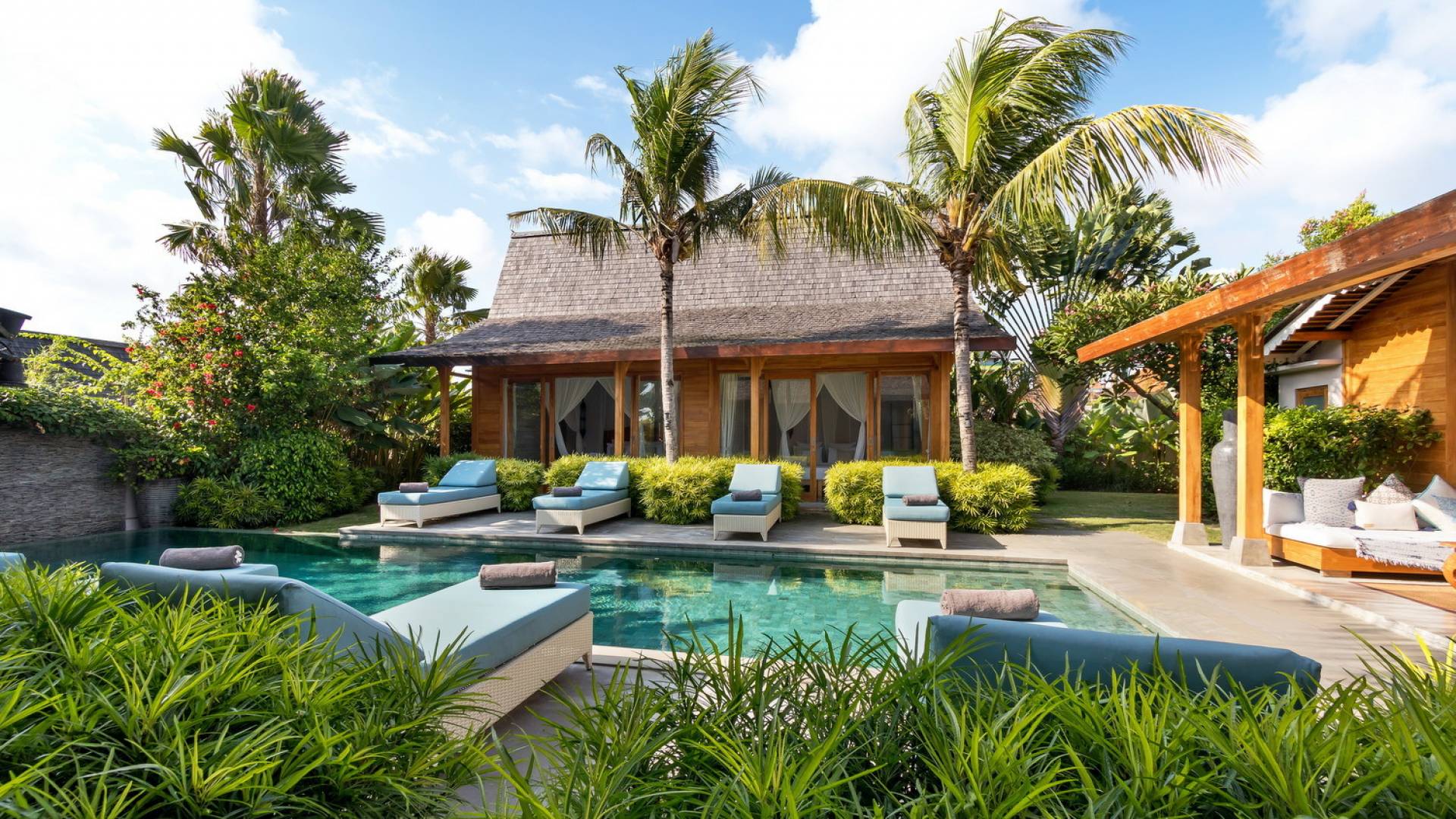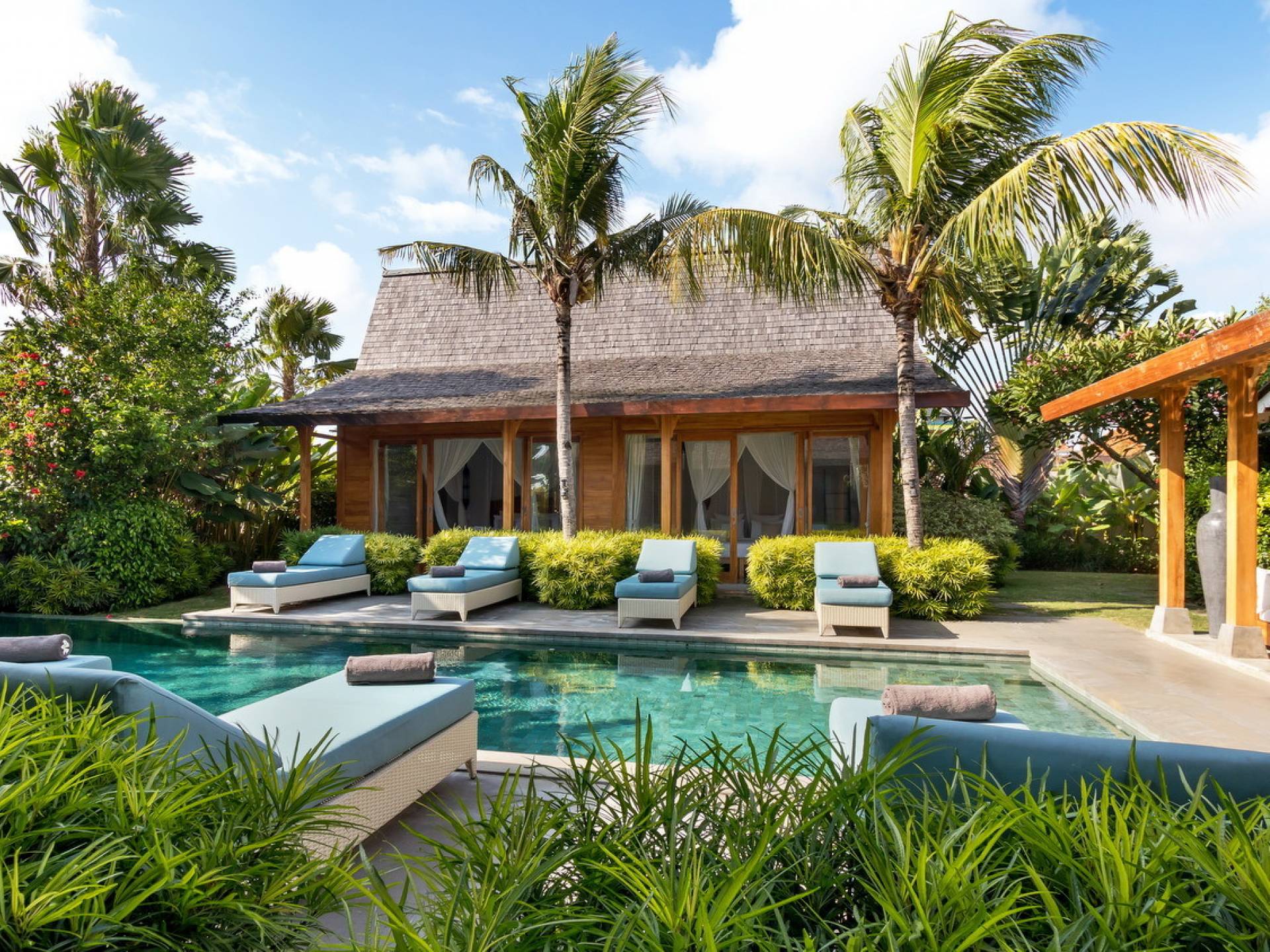 La veranda della villa offre una bella vista sul giardino ed è allestita con un'altra zona lounge con tre divani con cuscini bianchi e un tavolo in legno. Un ottimo posto per leggere un libro o semplicemente rilassarsi e sentire la leggera brezza del vento mentre i tuoi bambini giocano nell'acqua. Il bellissimo giardino tropicale dispone di una piscina in pietra naturale circondata da 8 lettini con cuscini azzurri e c'è anche un gazebo con un tradizionale tetto di paglia nascosto in un angolo del giardino.