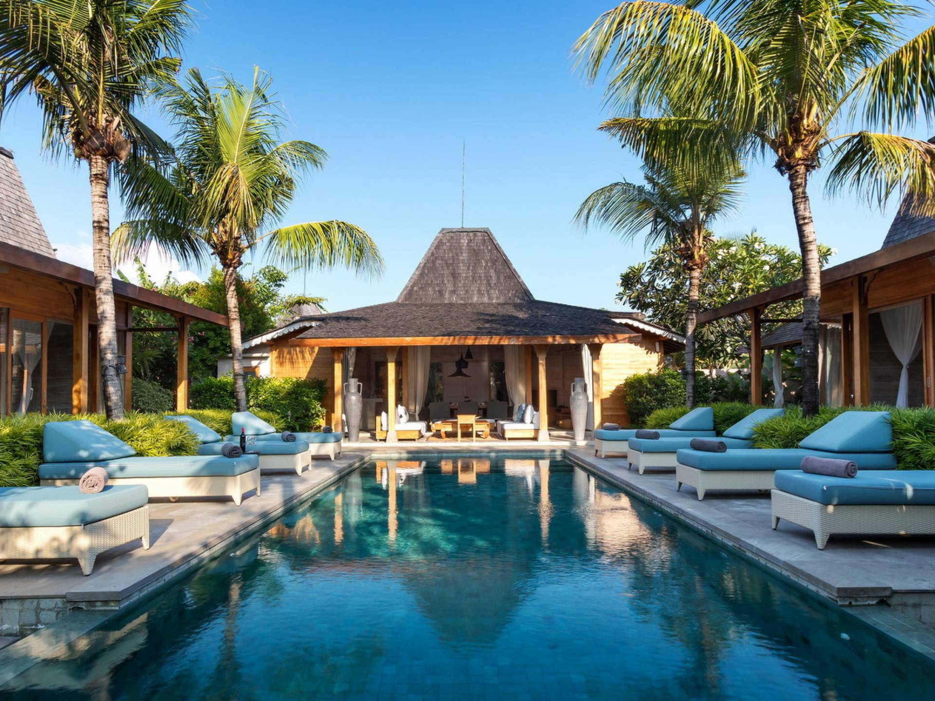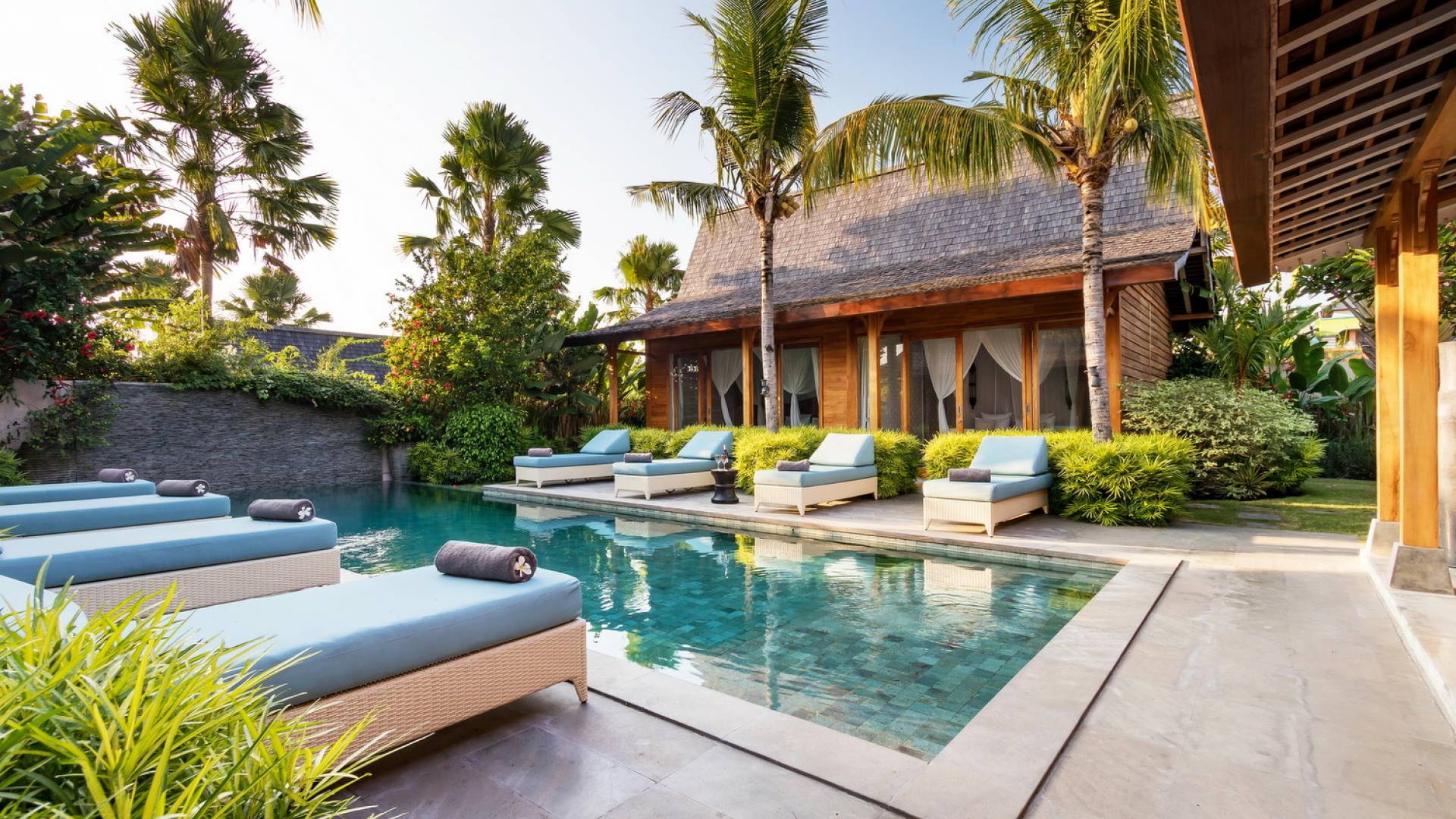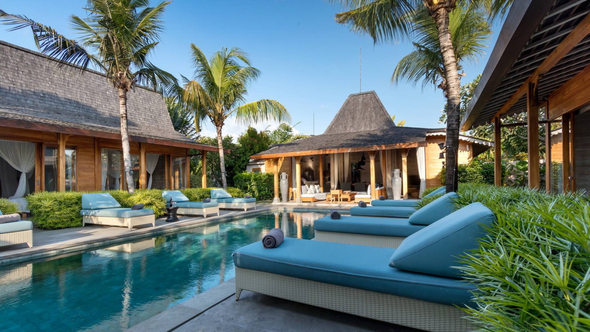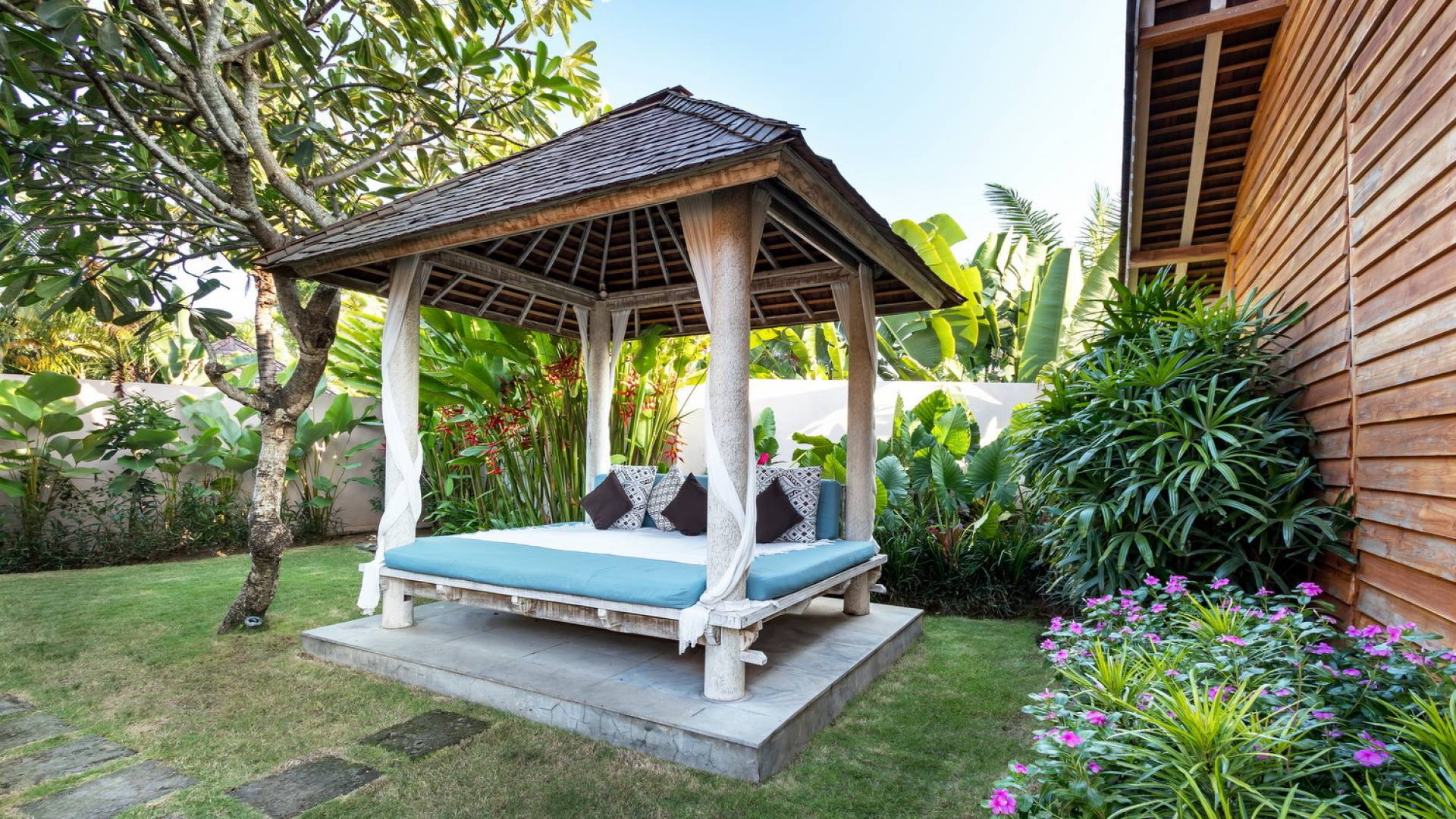 La veranda della villa offre una bella vista sul giardino ed è allestita con un'altra zona lounge con tre divani con cuscini bianchi e un tavolo in legno. Un ottimo posto per leggere un libro o semplicemente rilassarsi e sentire la leggera brezza del vento mentre i tuoi bambini giocano nell'acqua. Il bellissimo giardino tropicale dispone di una piscina in pietra naturale circondata da 8 lettini con cuscini azzurri e c'è anche un gazebo con un tradizionale tetto di paglia nascosto in un angolo del giardino.