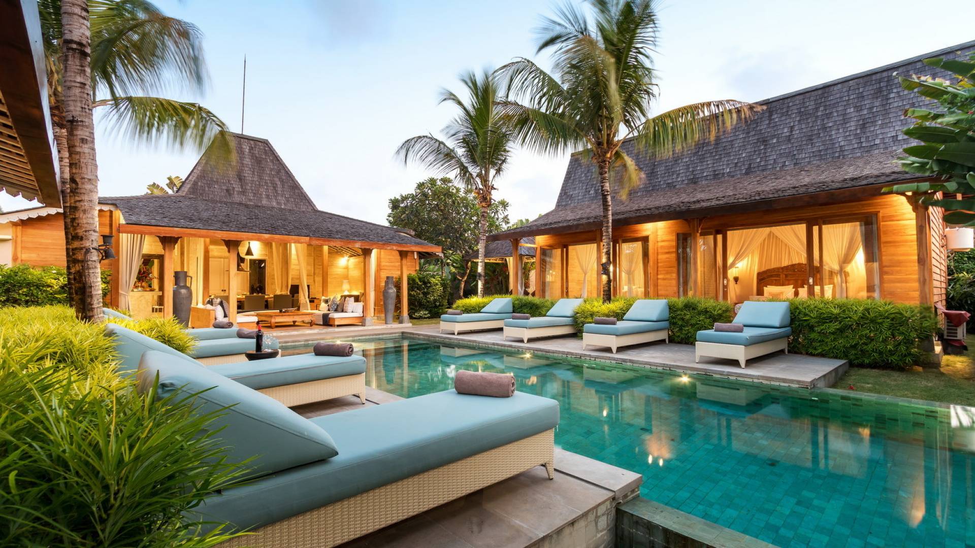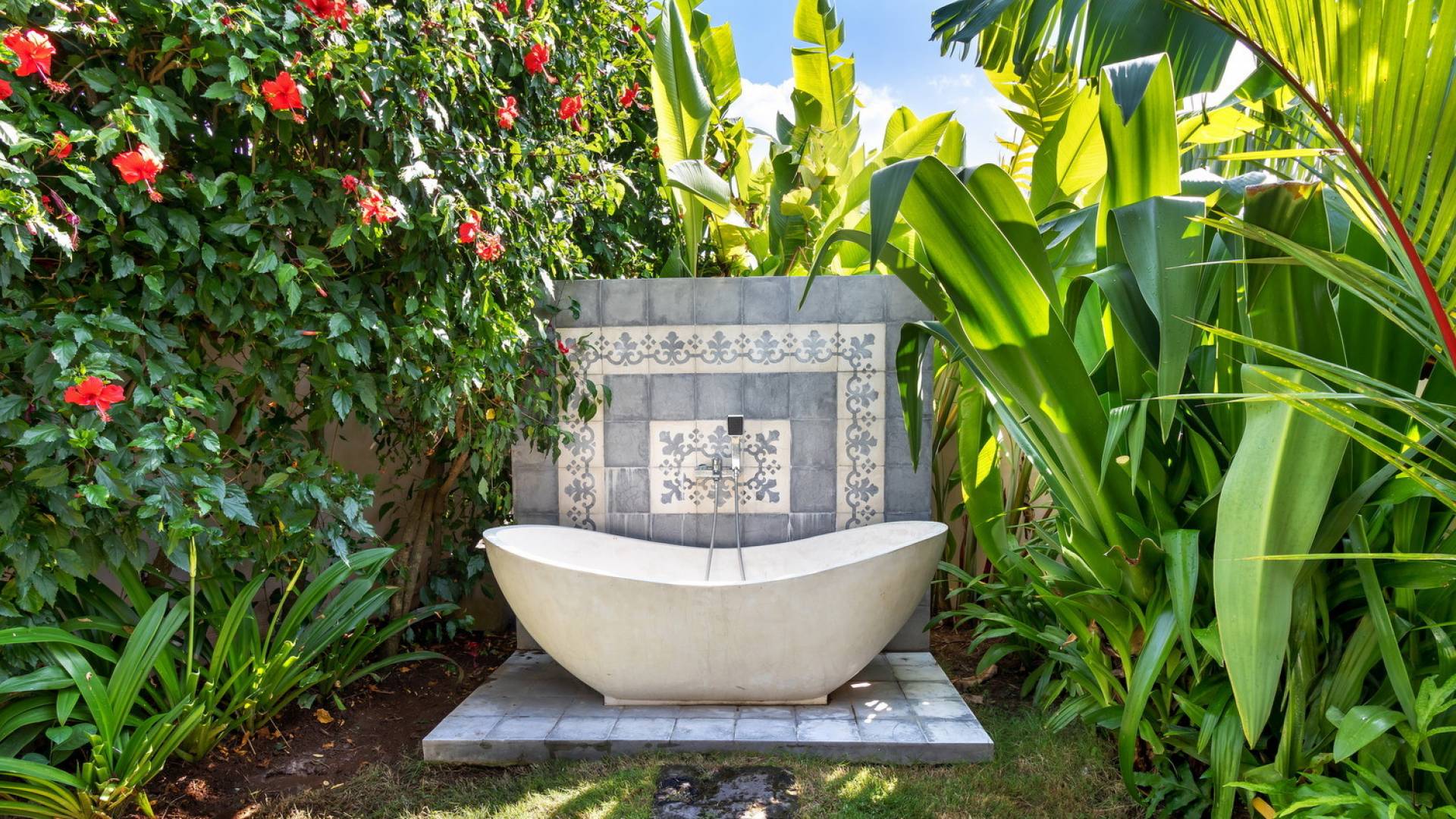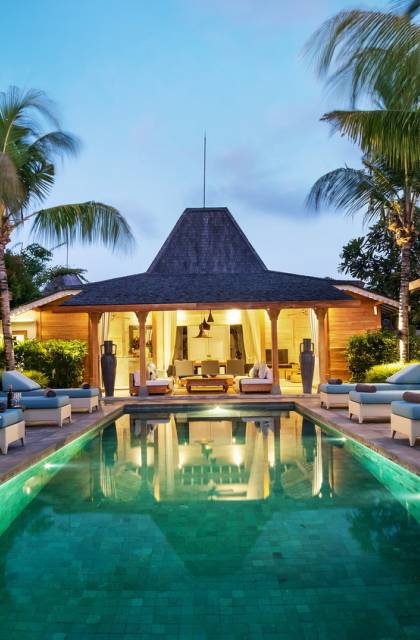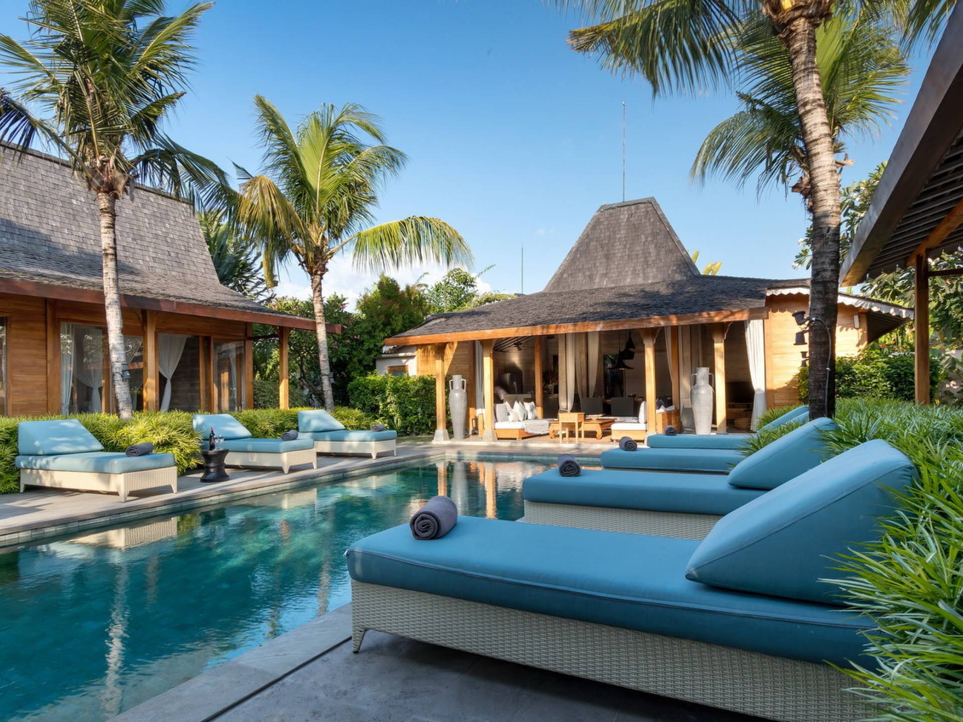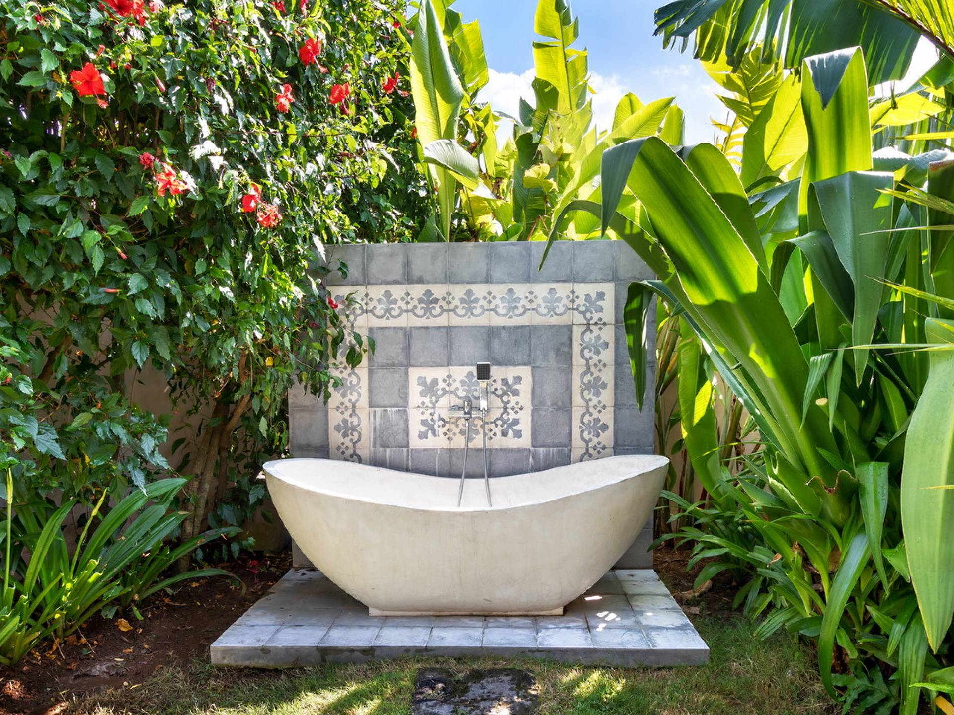La veranda della villa offre una bella vista sul giardino ed è allestita con un'altra zona lounge con tre divani con cuscini bianchi e un tavolo in legno. Un ottimo posto per leggere un libro o semplicemente rilassarsi e sentire la leggera brezza del vento mentre i tuoi bambini giocano nell'acqua. Il bellissimo giardino tropicale dispone di una piscina in pietra naturale circondata da 8 lettini con cuscini azzurri e c'è anche un gazebo con un tradizionale tetto di paglia nascosto in un angolo del giardino.