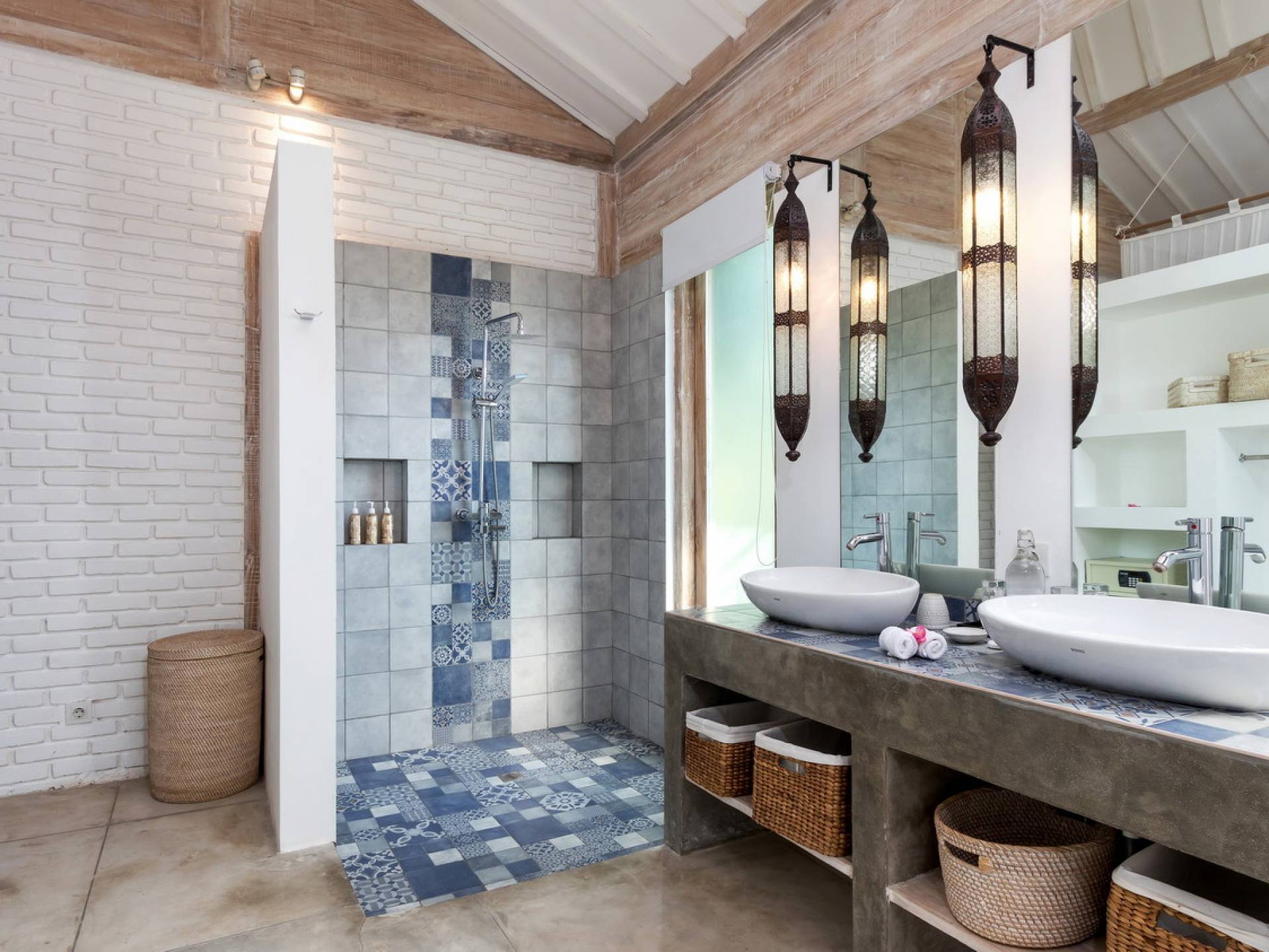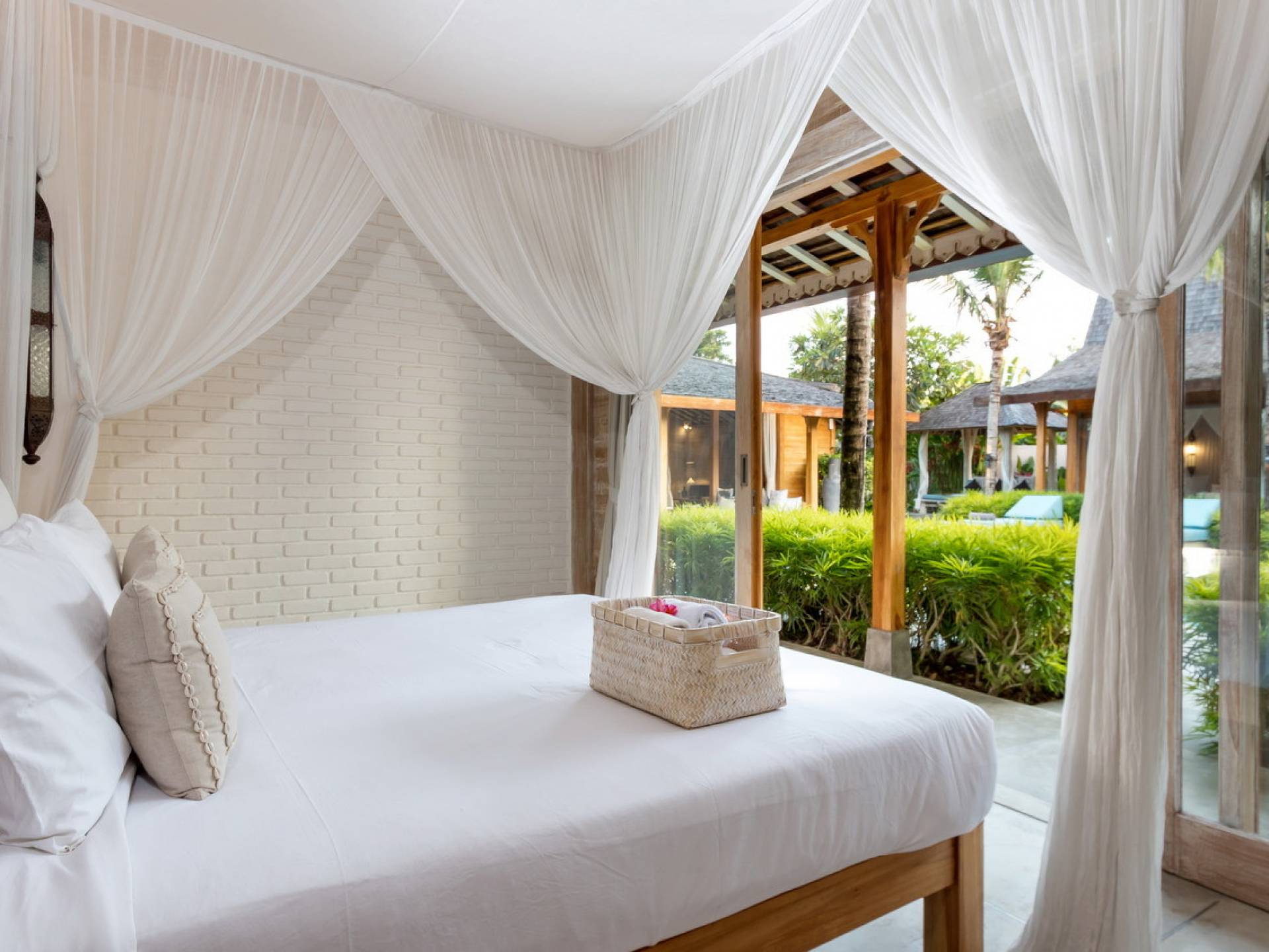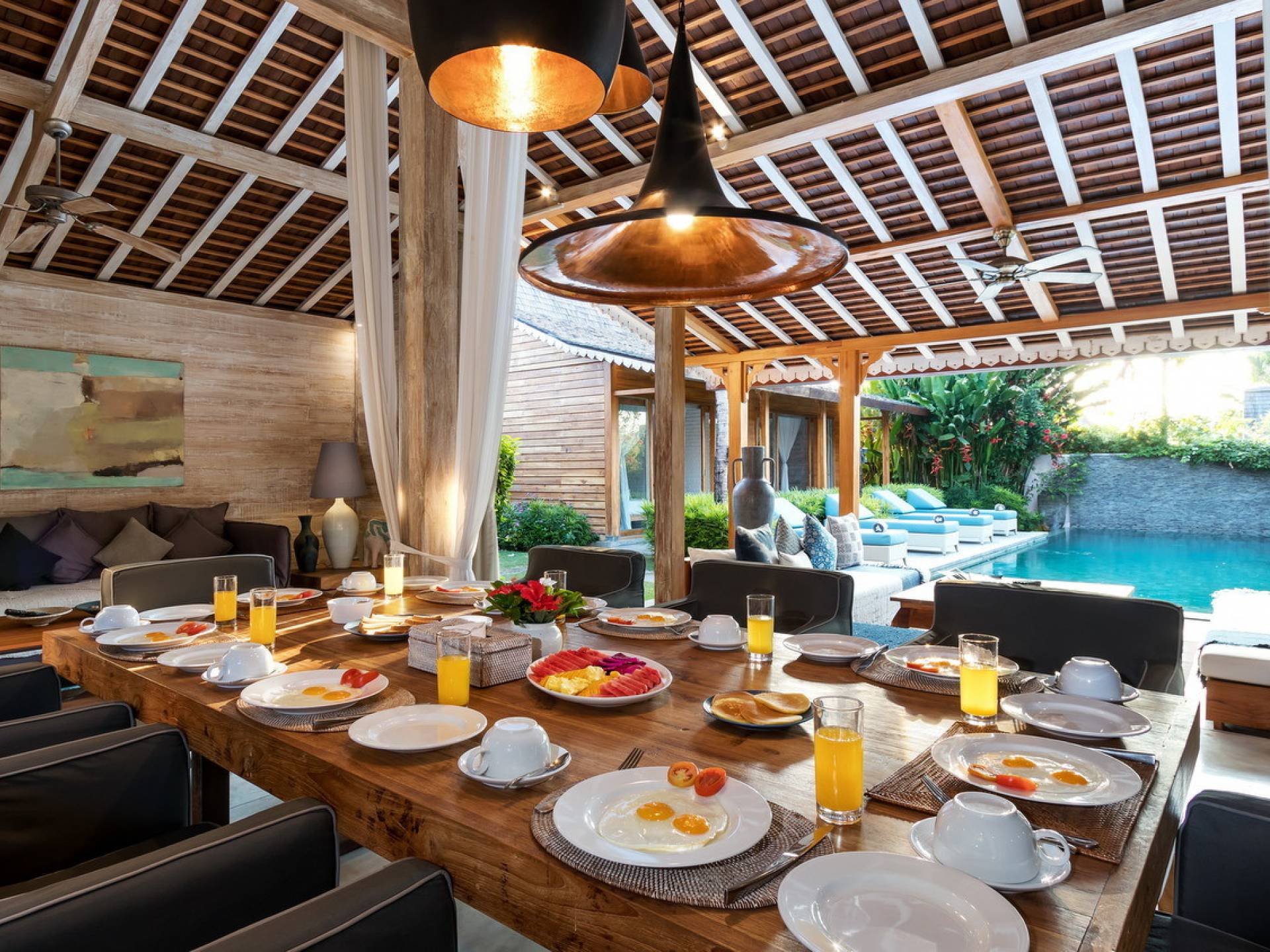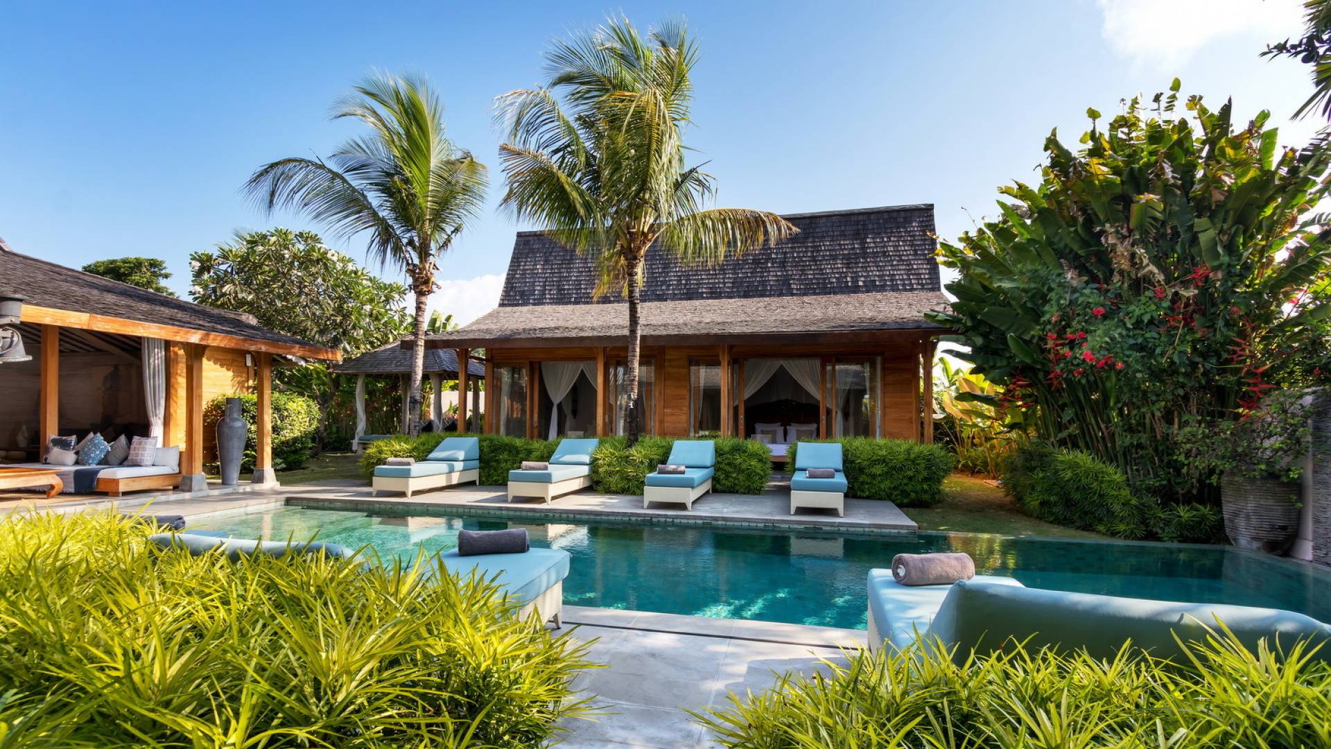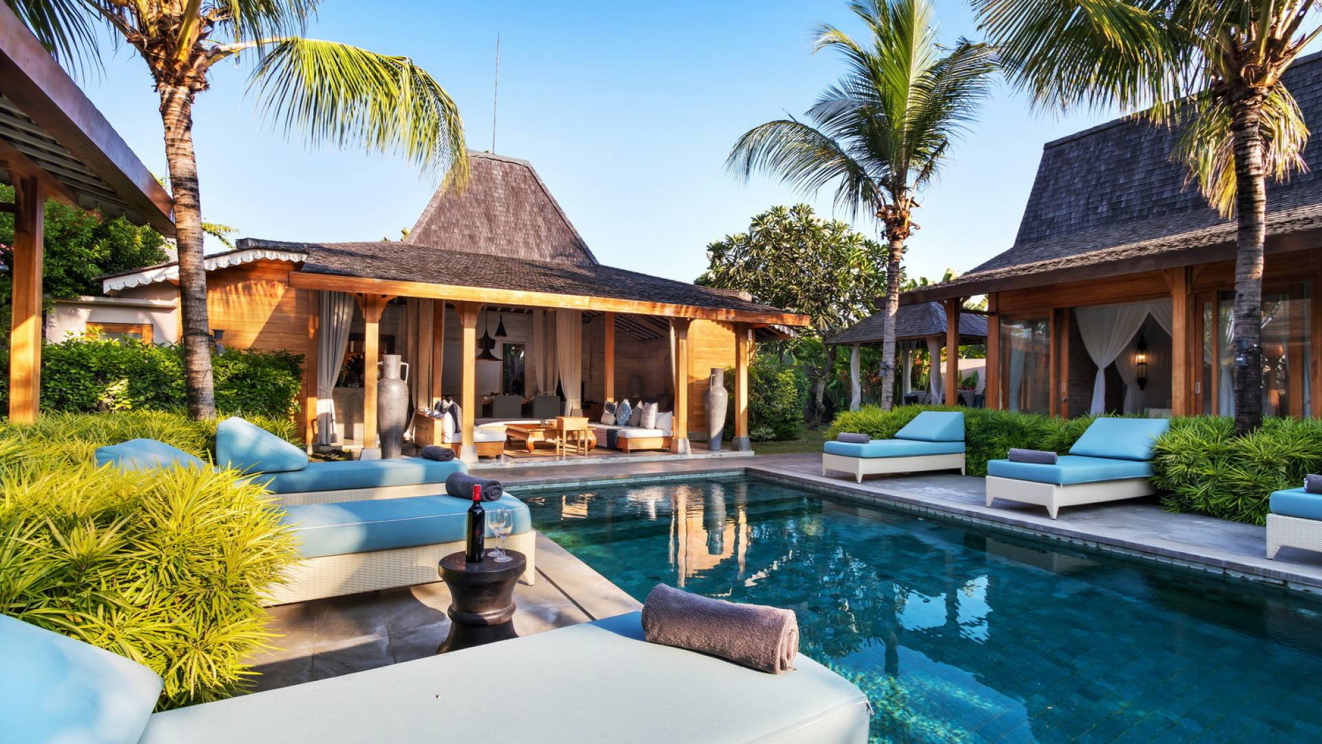 La veranda della villa offre una bella vista sul giardino ed è allestita con un'altra zona lounge con tre divani con cuscini bianchi e un tavolo in legno. Un ottimo posto per leggere un libro o semplicemente rilassarsi e sentire la leggera brezza del vento mentre i tuoi bambini giocano nell'acqua. Il bellissimo giardino tropicale dispone di una piscina in pietra naturale circondata da 8 lettini con cuscini azzurri e c'è anche un gazebo con un tradizionale tetto di paglia nascosto in un angolo del giardino.