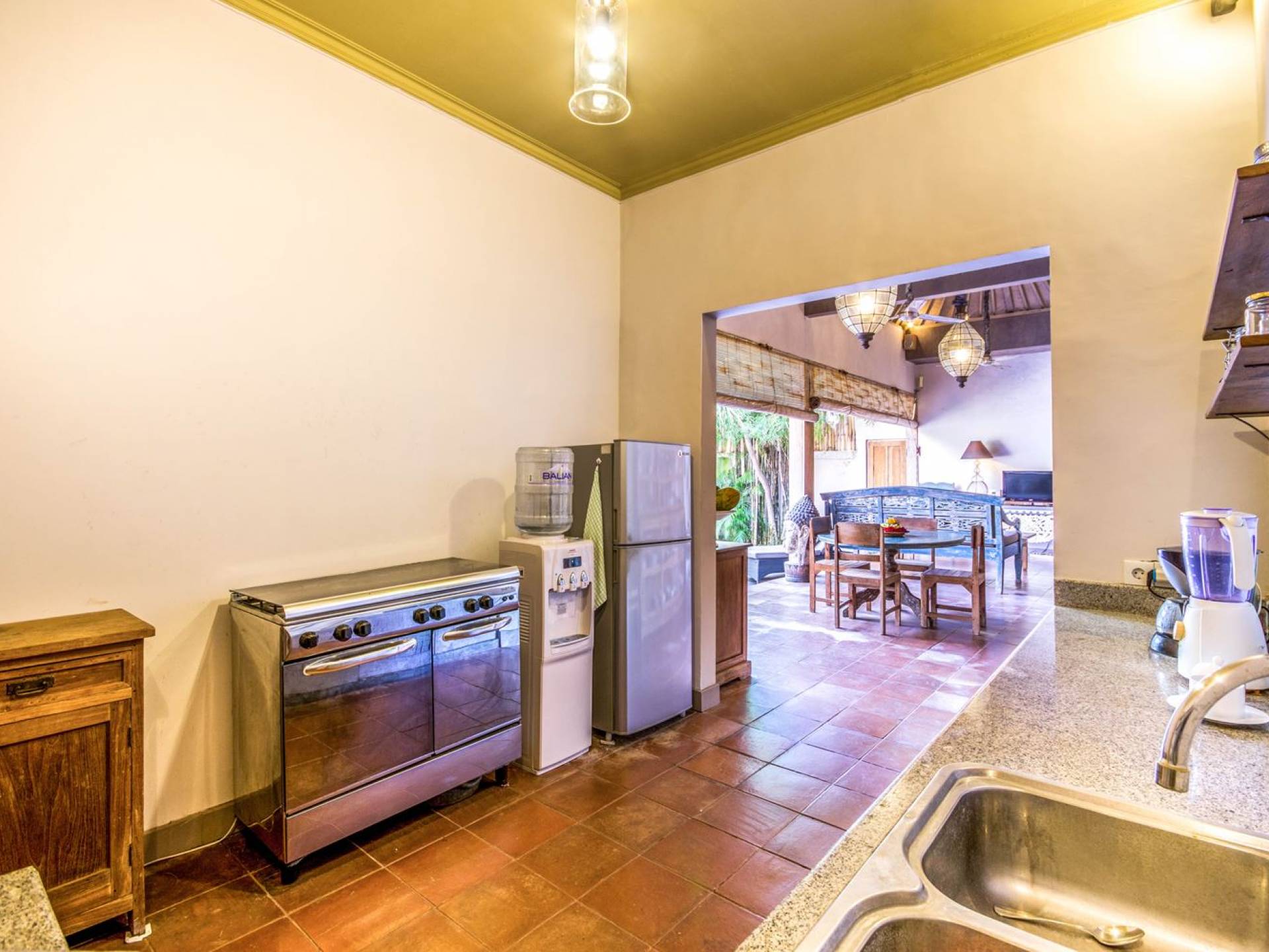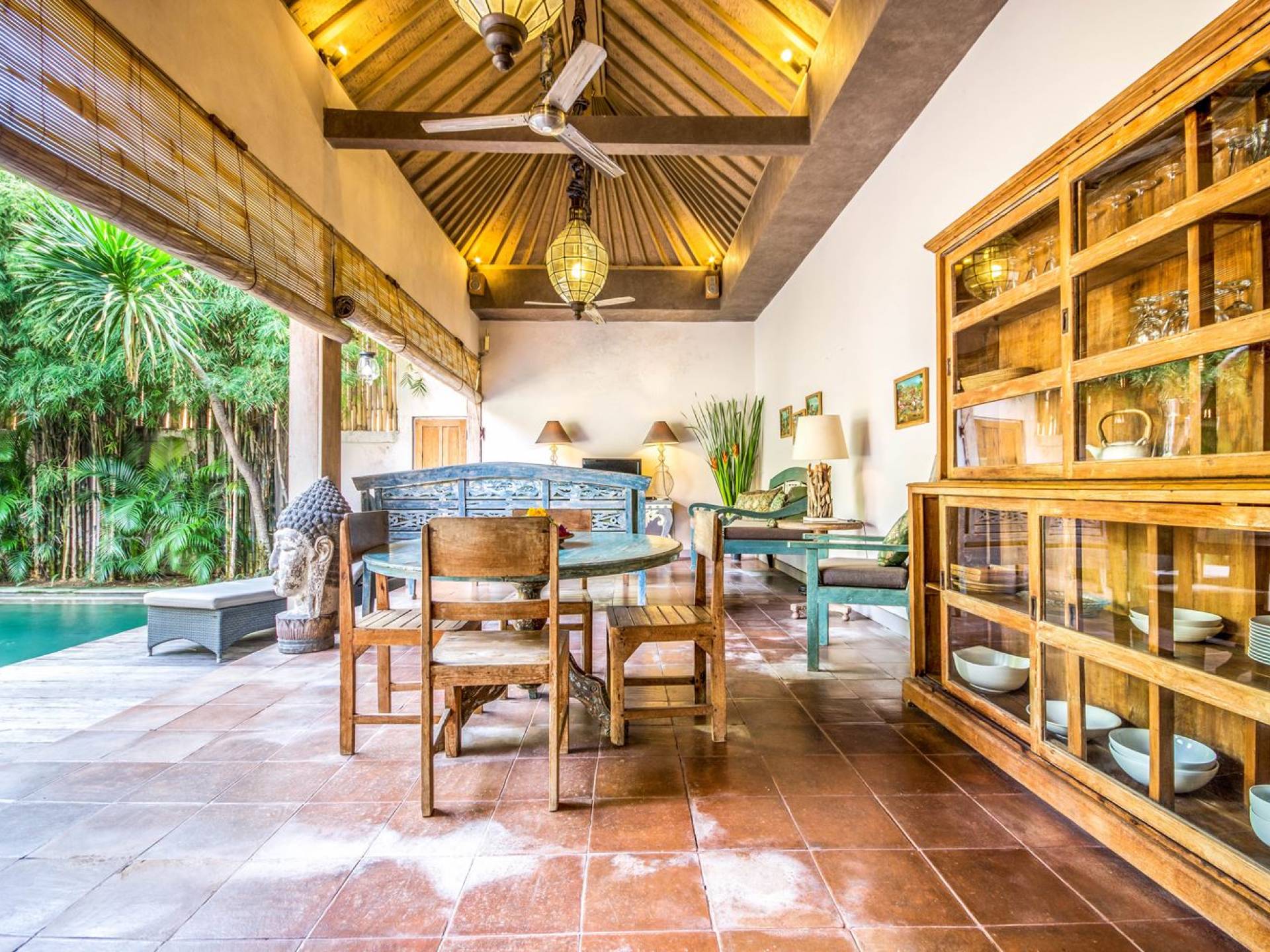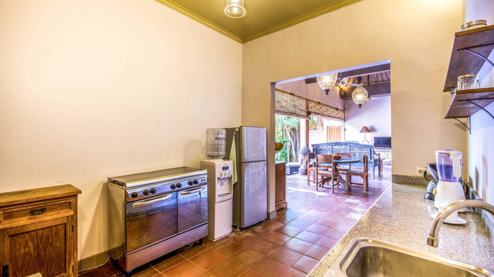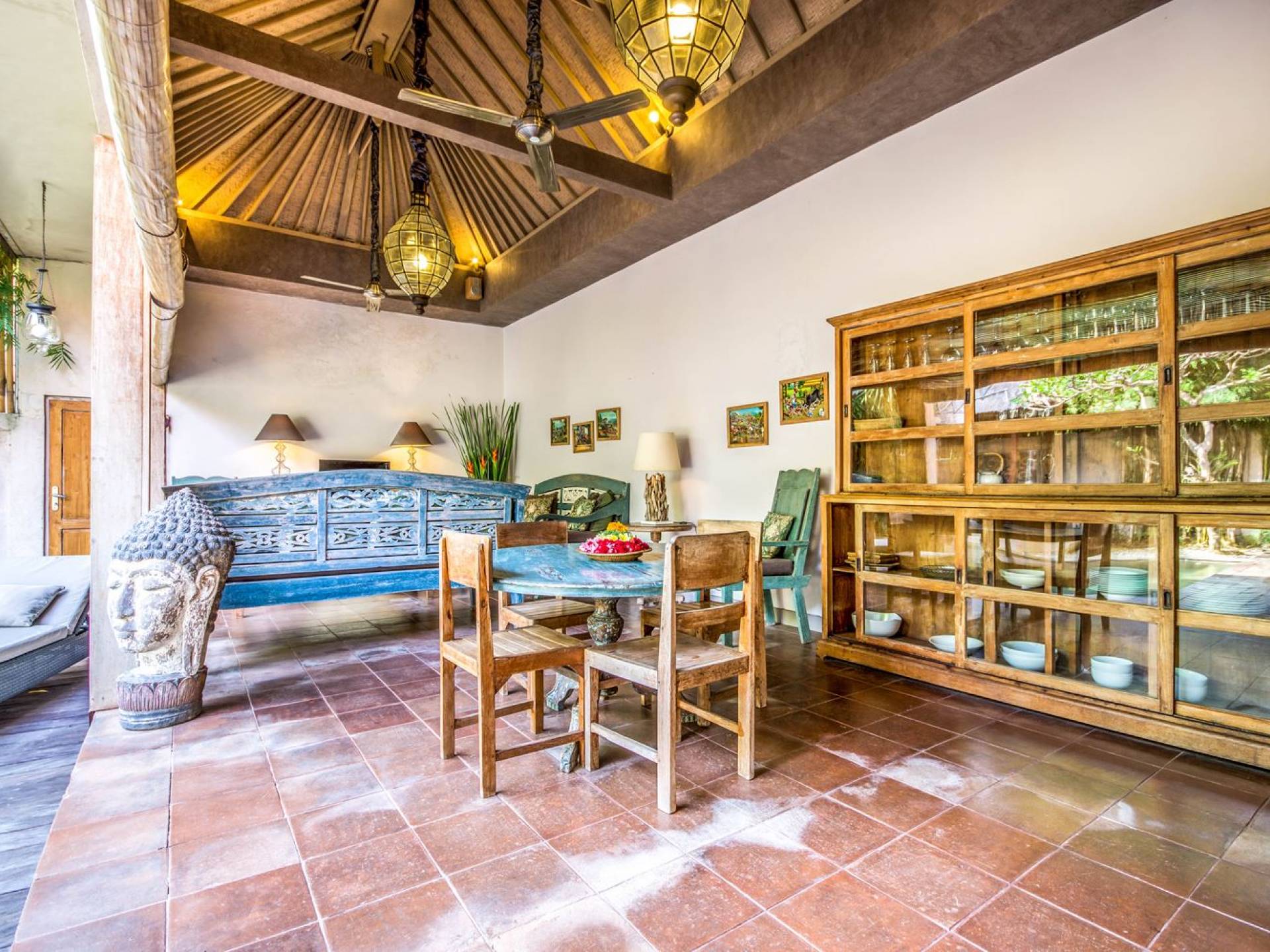 Per coloro che desiderano abbronzarsi al lavoro durante le vacanze, rilassarsi su una delle sedie reclinabili e ricordarsi di indossare la crema solare! Il soggiorno è caratterizzato da un progetto architettonico open-concept, quasi fuso con il giardino. Le persiane in bambù offrono la possibilità di creare un accogliente spazio abitativo chiuso la sera mentre si guarda un film o due all'interno. Lo spazio abitativo è arredato elegantemente con tradizionali divani letto balinesi intagliati in legno ed è decorato con opere d'arte tribale. Potete sedervi tutti insieme sui comodi divani letto a leggere una rivista o guardare film sulla TV a schermo piatto con lettore DVD. Al centro delle stanze si trova un tavolo circolare per cenare in villa sotto uno splendido lampadario. La cucina è completamente attrezzata con tutto ciò di cui ha bisogno la tua casa per le vacanze a Bali e c'è anche un forno per chi vuole cuocere.