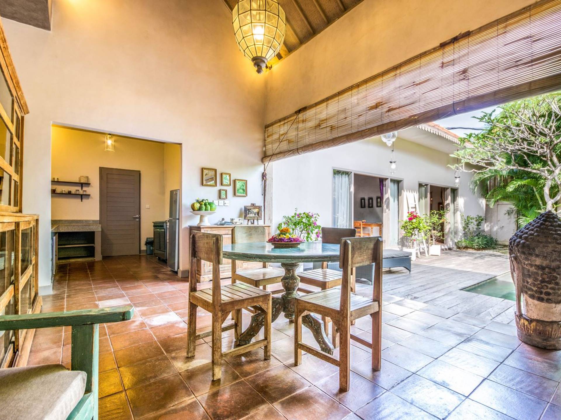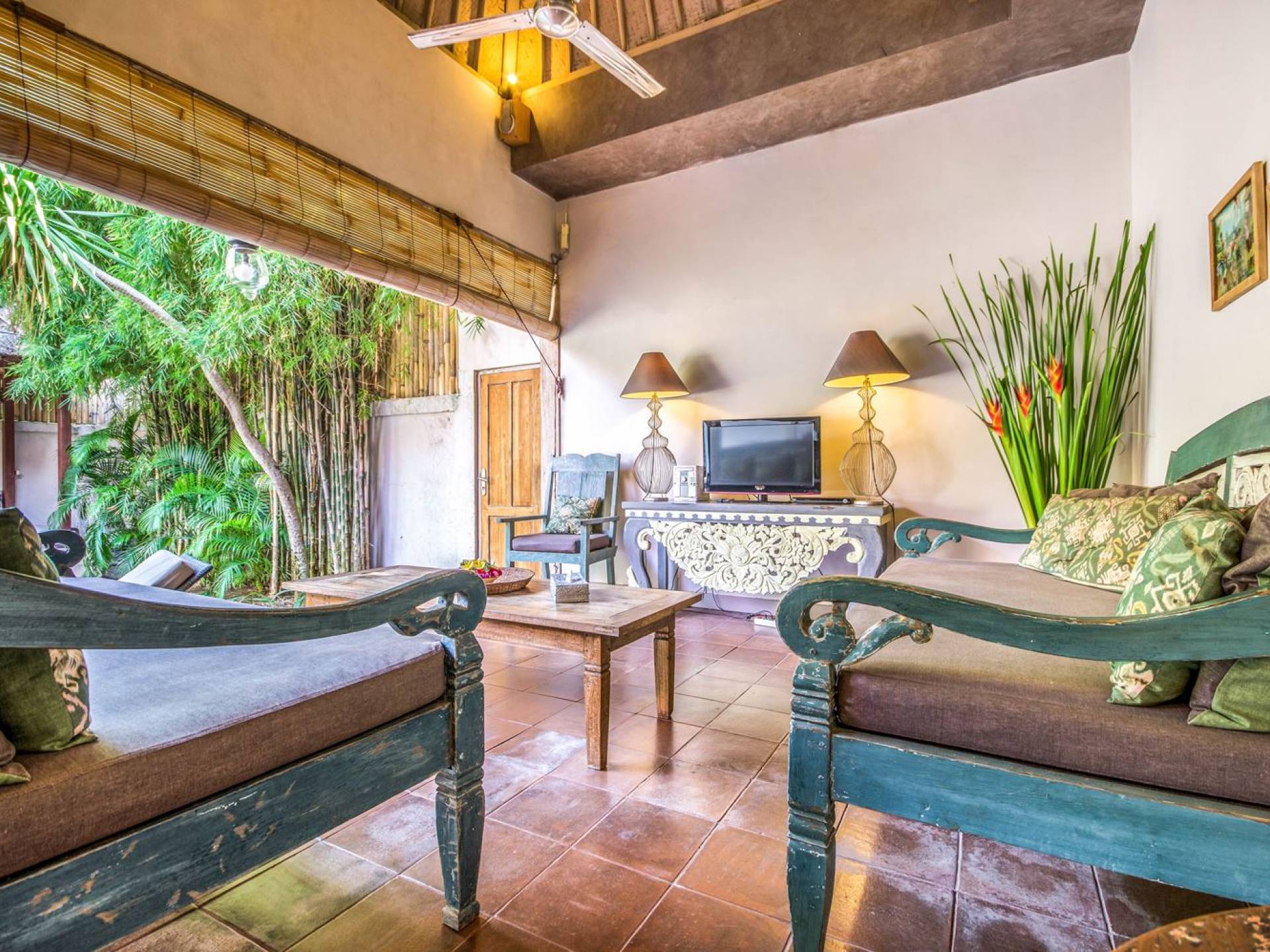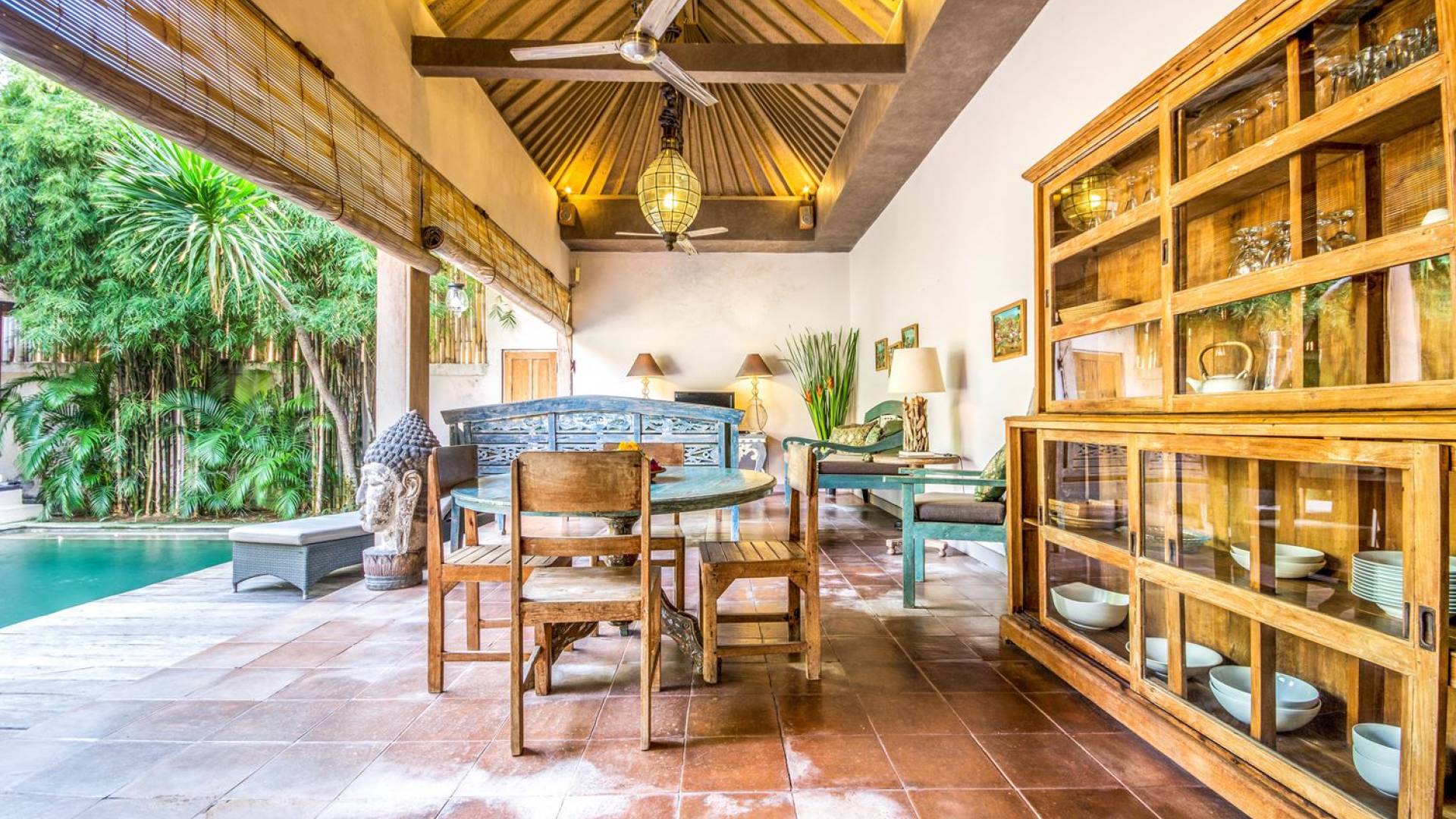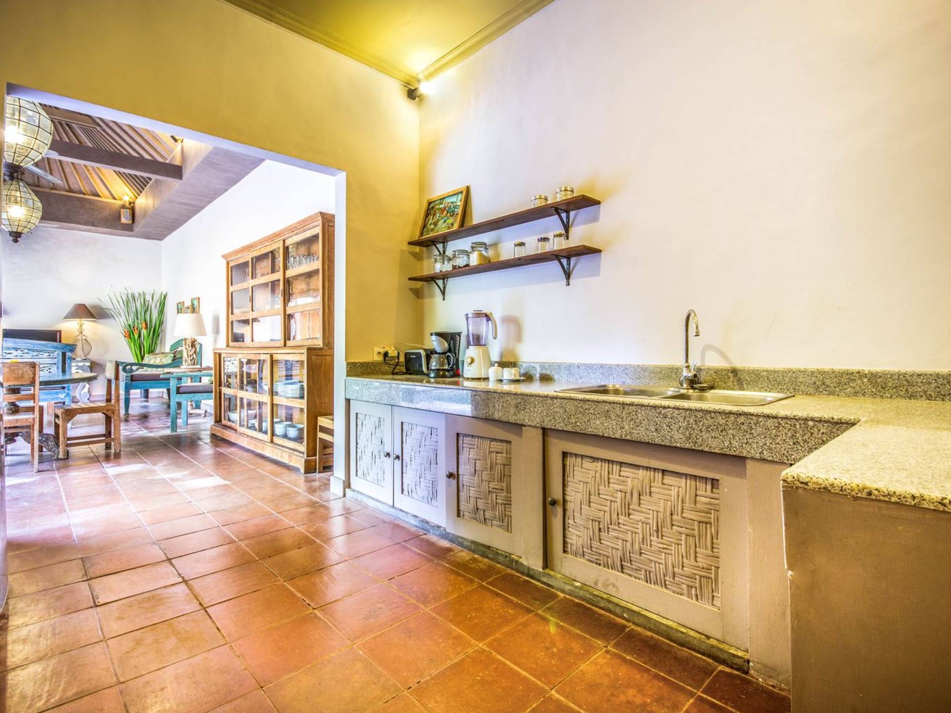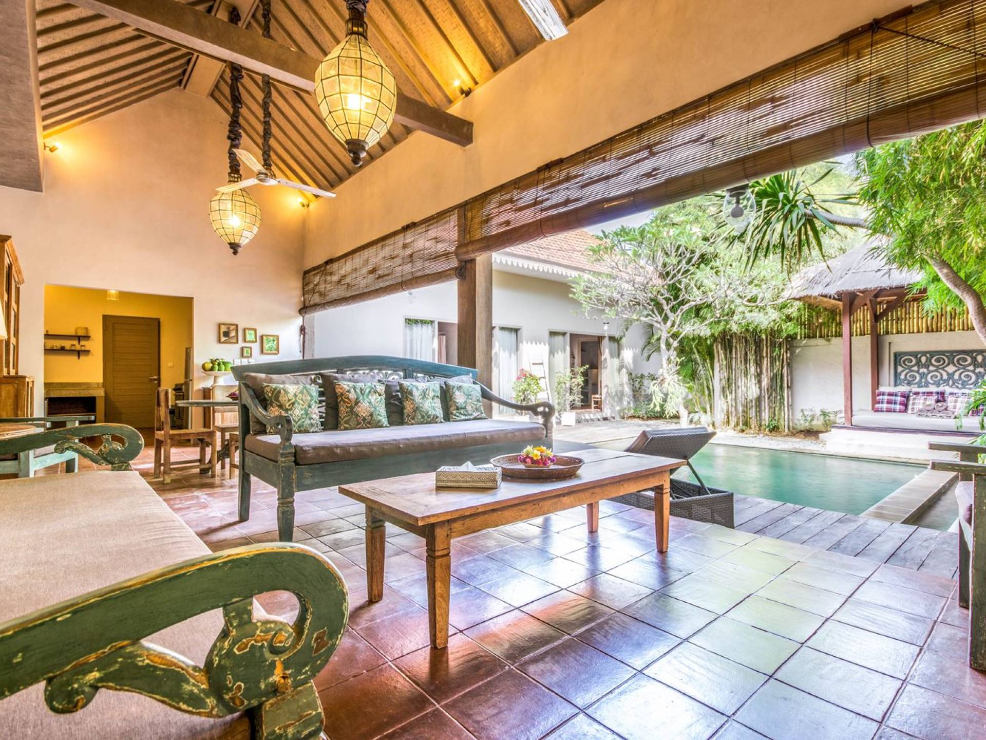 Per coloro che desiderano abbronzarsi al lavoro durante le vacanze, rilassarsi su una delle sedie reclinabili e ricordarsi di indossare la crema solare! Il soggiorno è caratterizzato da un progetto architettonico open-concept, quasi fuso con il giardino. Le persiane in bambù offrono la possibilità di creare un accogliente spazio abitativo chiuso la sera mentre si guarda un film o due all'interno. Lo spazio abitativo è arredato elegantemente con tradizionali divani letto balinesi intagliati in legno ed è decorato con opere d'arte tribale. Potete sedervi tutti insieme sui comodi divani letto a leggere una rivista o guardare film sulla TV a schermo piatto con lettore DVD. Al centro delle stanze si trova un tavolo circolare per cenare in villa sotto uno splendido lampadario. La cucina è completamente attrezzata con tutto ciò di cui ha bisogno la tua casa per le vacanze a Bali e c'è anche un forno per chi vuole cuocere.