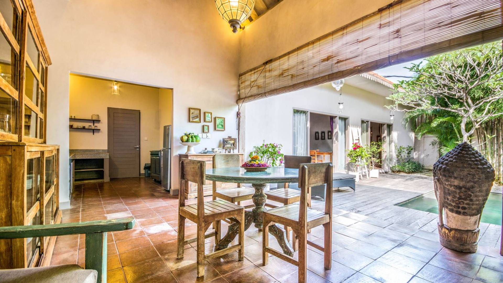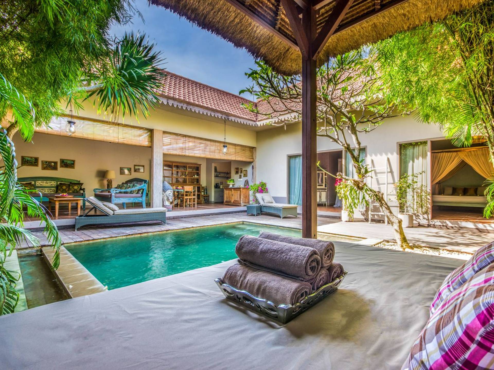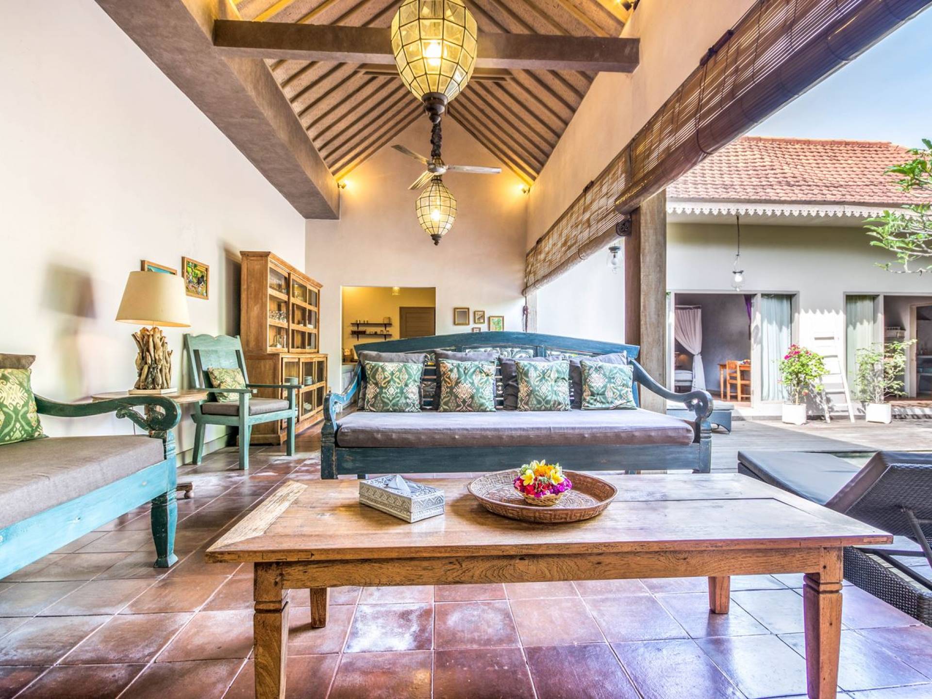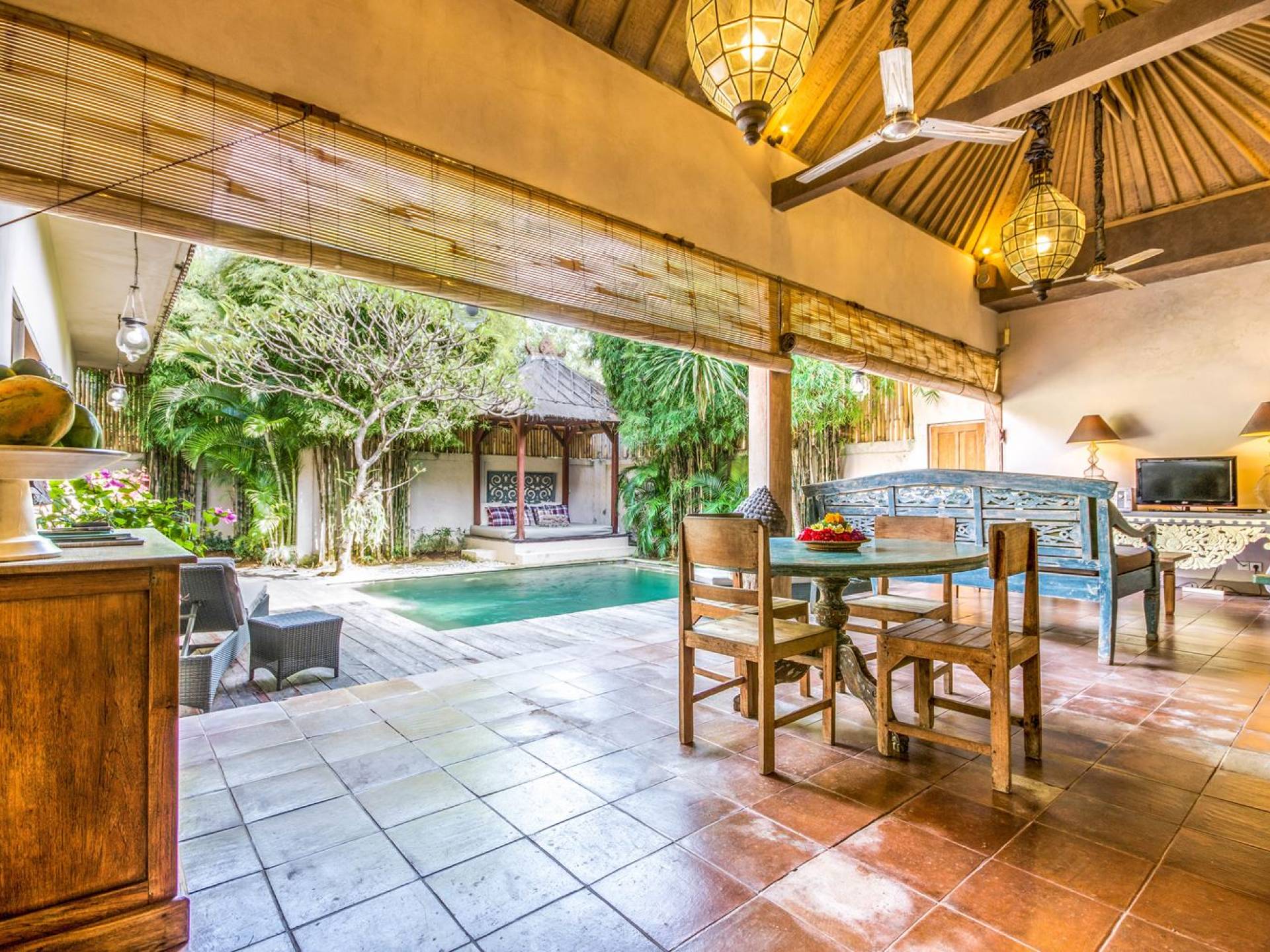 Per coloro che desiderano abbronzarsi al lavoro durante le vacanze, rilassarsi su una delle sedie reclinabili e ricordarsi di indossare la crema solare! Il soggiorno è caratterizzato da un progetto architettonico open-concept, quasi fuso con il giardino. Le persiane in bambù offrono la possibilità di creare un accogliente spazio abitativo chiuso la sera mentre si guarda un film o due all'interno. Lo spazio abitativo è arredato elegantemente con tradizionali divani letto balinesi intagliati in legno ed è decorato con opere d'arte tribale. Potete sedervi tutti insieme sui comodi divani letto a leggere una rivista o guardare film sulla TV a schermo piatto con lettore DVD. Al centro delle stanze si trova un tavolo circolare per cenare in villa sotto uno splendido lampadario. La cucina è completamente attrezzata con tutto ciò di cui ha bisogno la tua casa per le vacanze a Bali e c'è anche un forno per chi vuole cuocere.