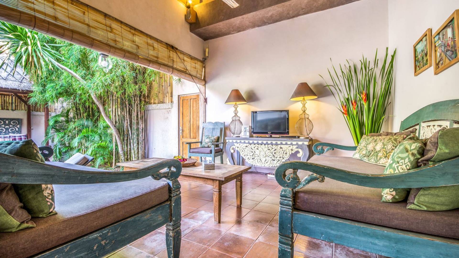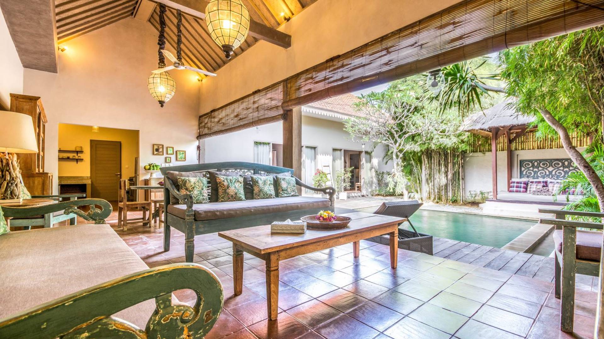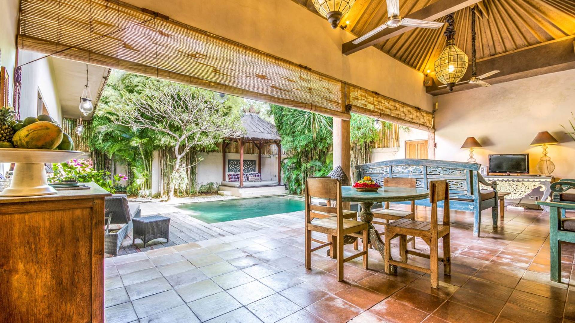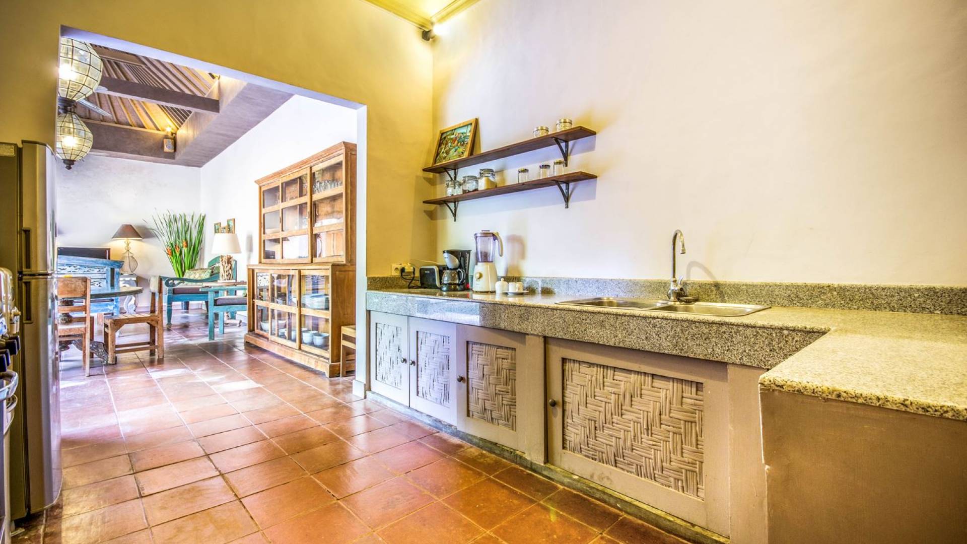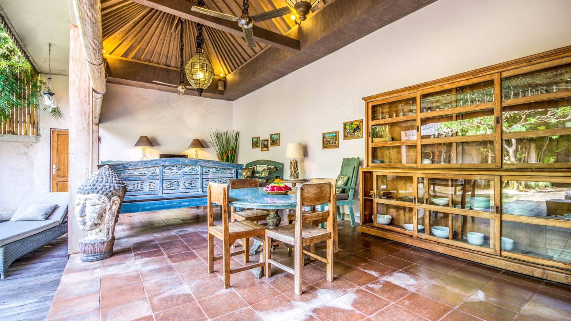 Per coloro che desiderano abbronzarsi al lavoro durante le vacanze, rilassarsi su una delle sedie reclinabili e ricordarsi di indossare la crema solare! Il soggiorno è caratterizzato da un progetto architettonico open-concept, quasi fuso con il giardino. Le persiane in bambù offrono la possibilità di creare un accogliente spazio abitativo chiuso la sera mentre si guarda un film o due all'interno. Lo spazio abitativo è arredato elegantemente con tradizionali divani letto balinesi intagliati in legno ed è decorato con opere d'arte tribale. Potete sedervi tutti insieme sui comodi divani letto a leggere una rivista o guardare film sulla TV a schermo piatto con lettore DVD. Al centro delle stanze si trova un tavolo circolare per cenare in villa sotto uno splendido lampadario. La cucina è completamente attrezzata con tutto ciò di cui ha bisogno la tua casa per le vacanze a Bali e c'è anche un forno per chi vuole cuocere.