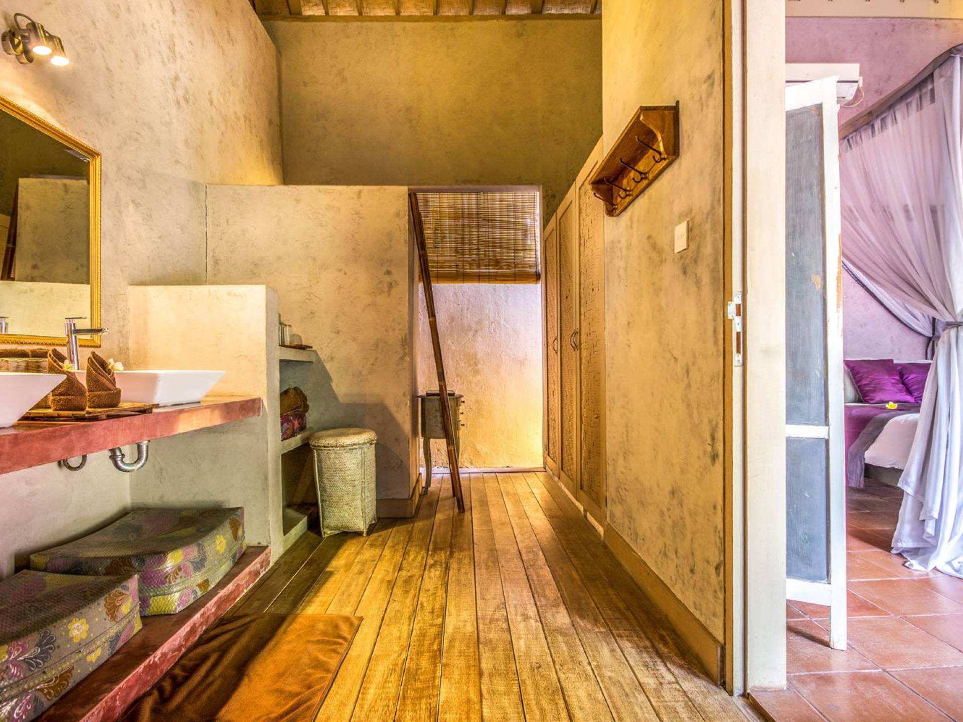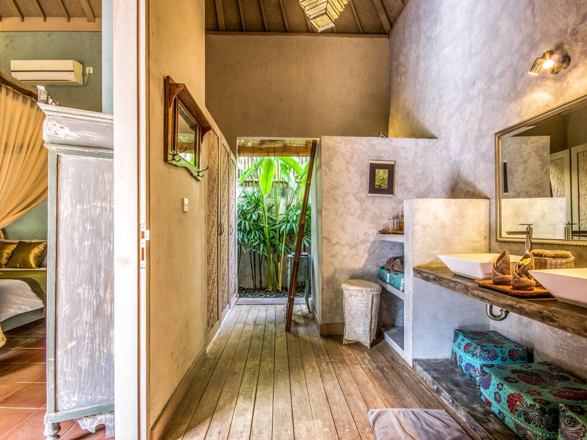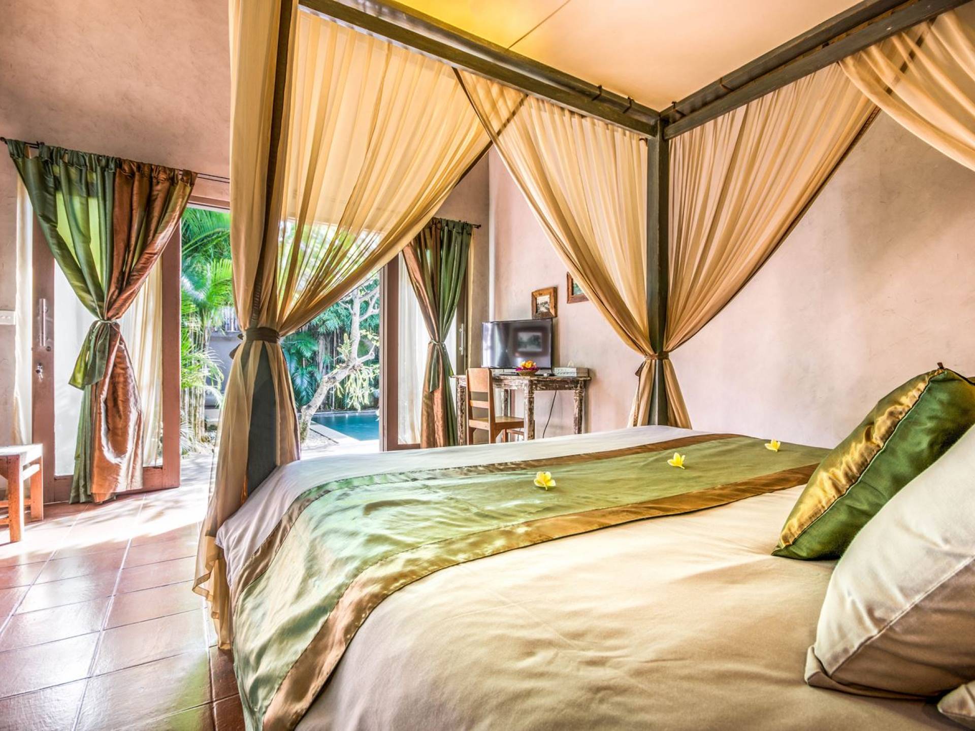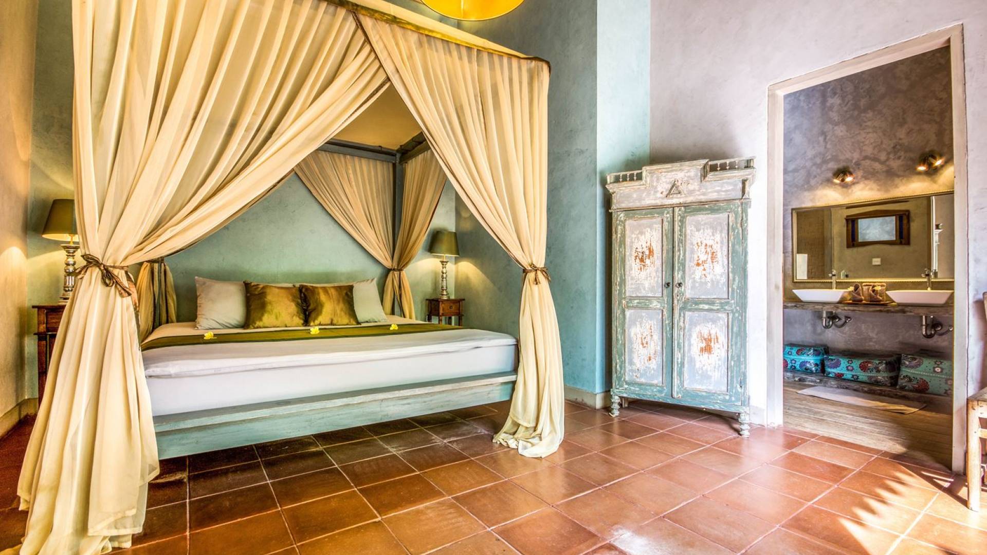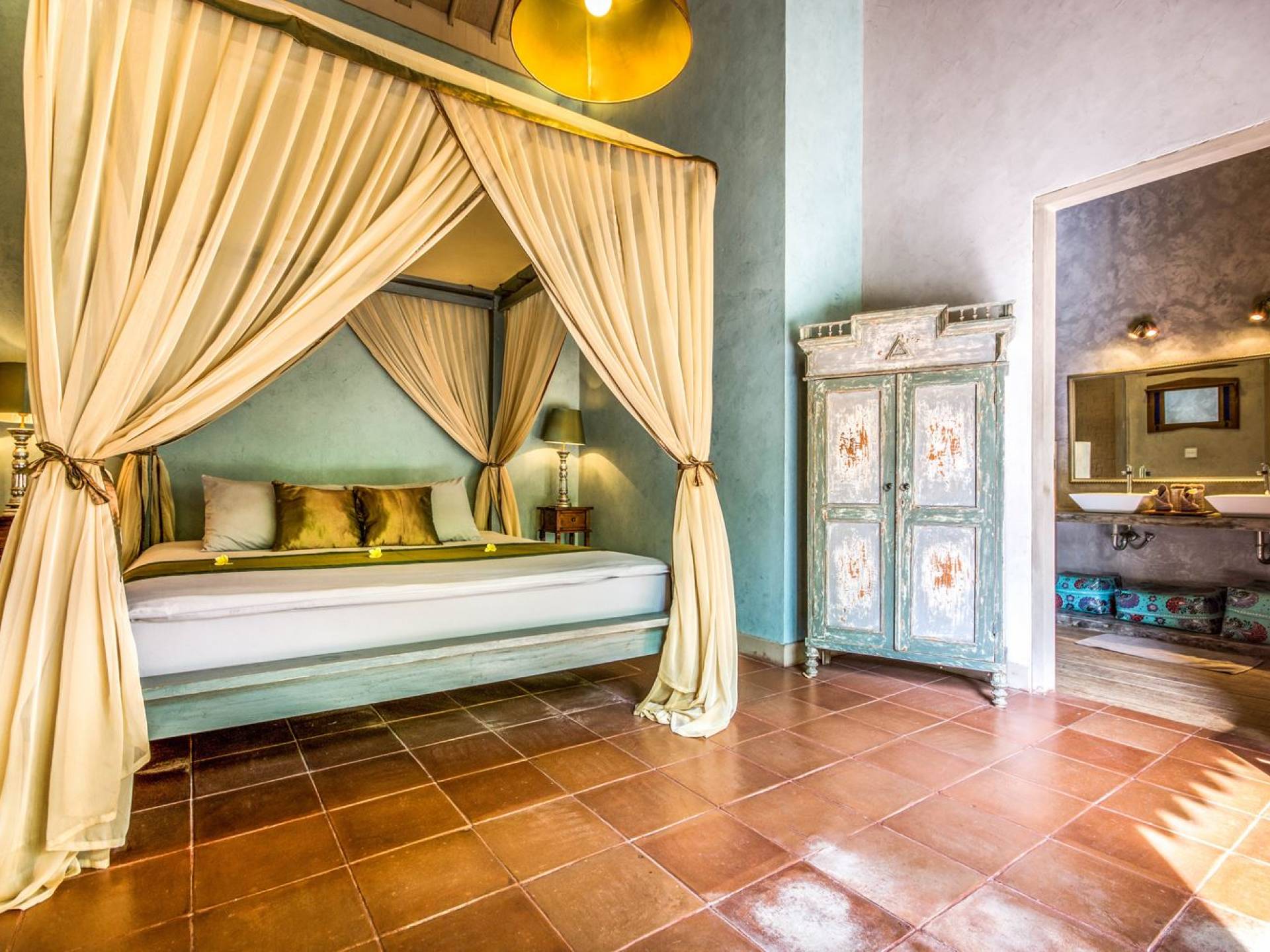 Le camere da letto sono nascoste in una struttura separata, che si apre sul giardino e sulla piscina. Le camere sono caratterizzate da temi cromatici individuali ma presentano gli stessi comfort e servizi moderni come aria condizionata e un letto king size a baldacchino di qualità. La camera da letto principale vanta anche una TV satellitare per guardare film in un ambiente più intimo. Ci sono armadi guardaroba in legno dipinto d'epoca e i bagni interni tropicali sono dotati di doppio lavabo e doccia a pioggia calda/fredda. Sono previsti servizi da bagno completi.