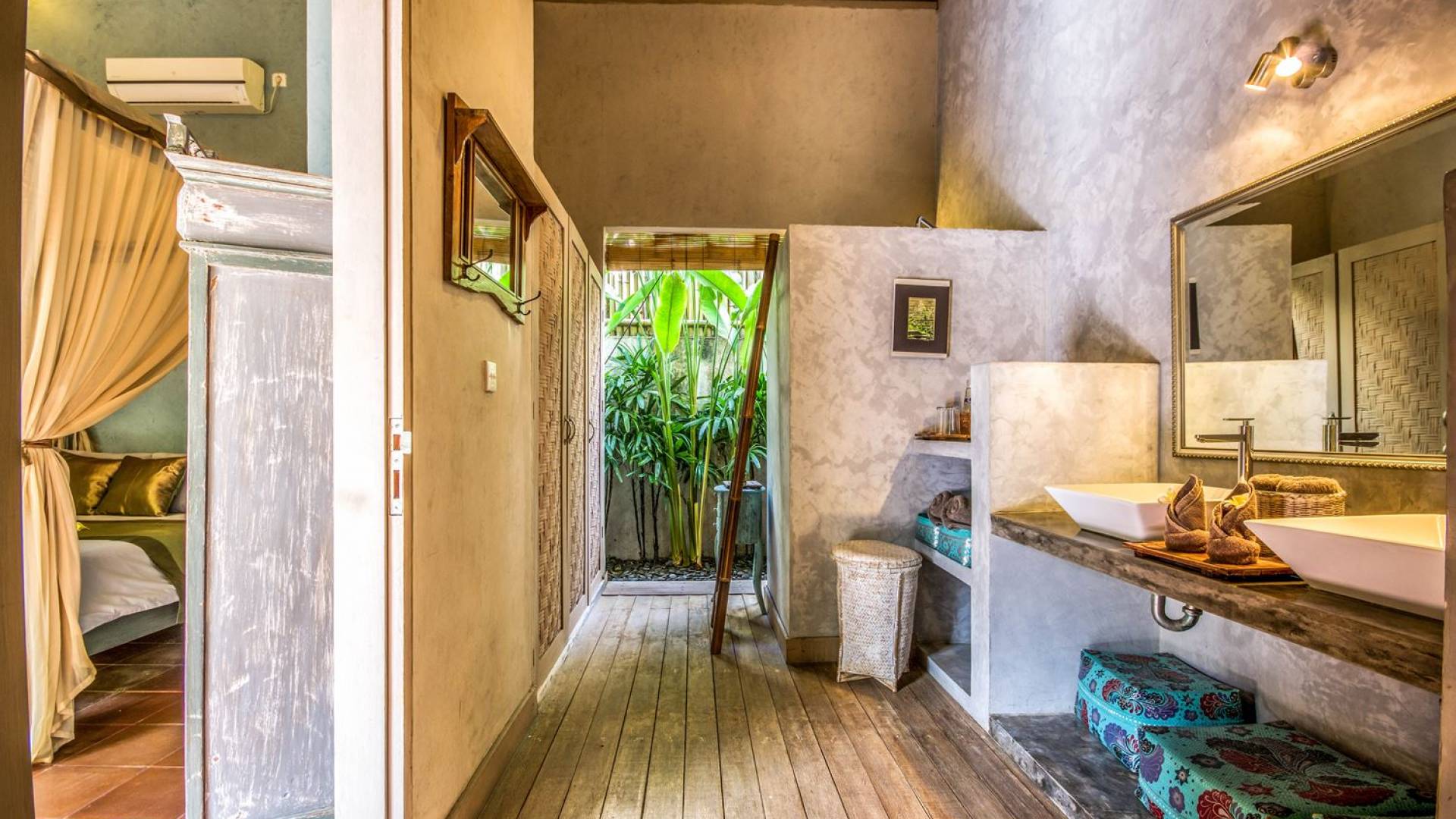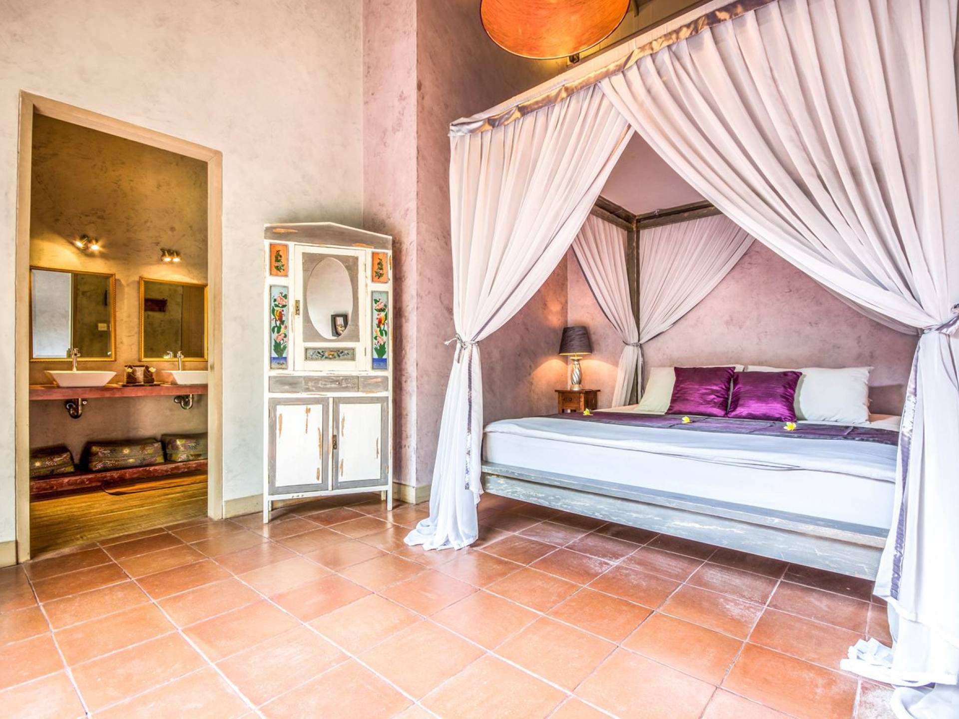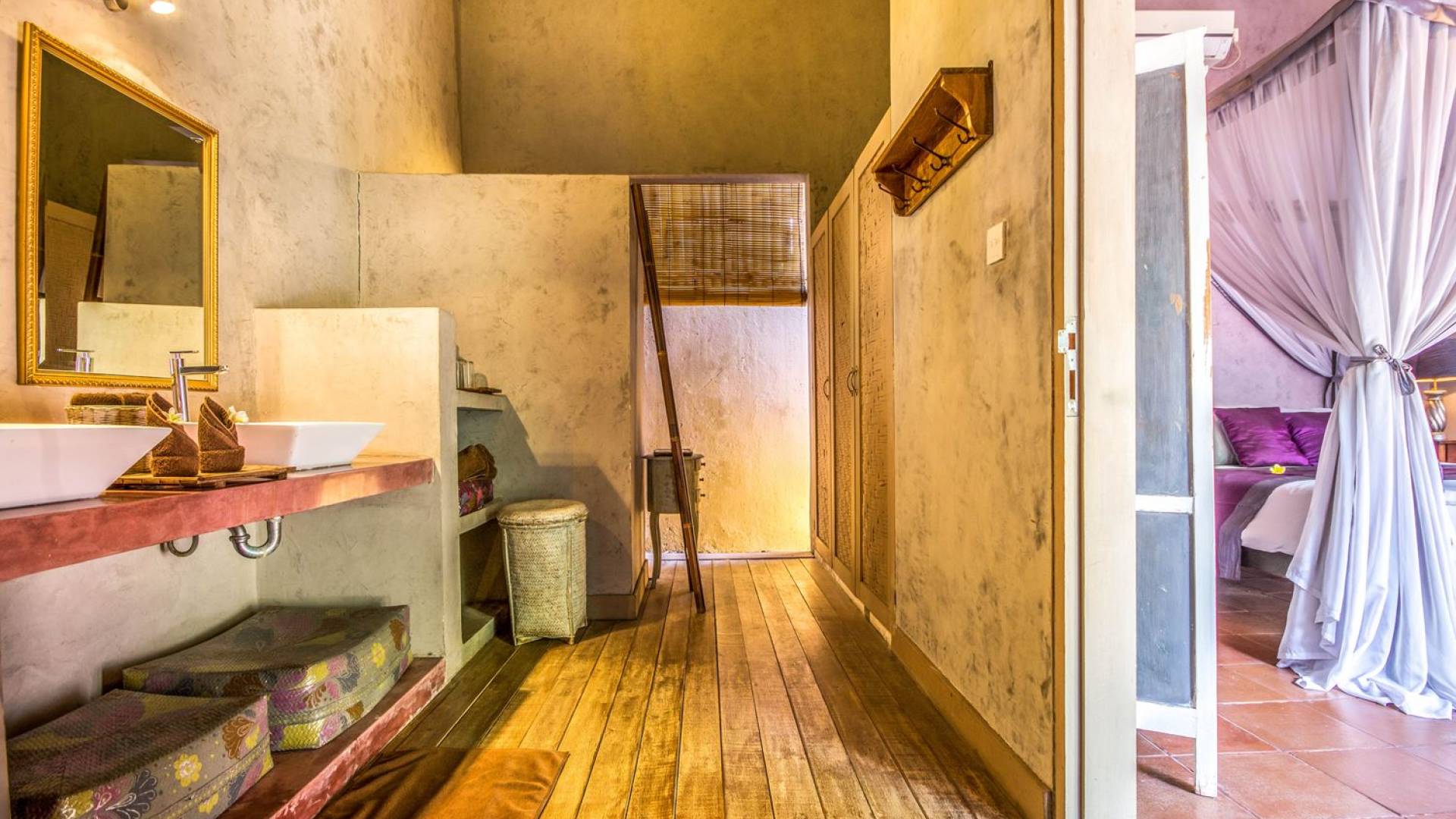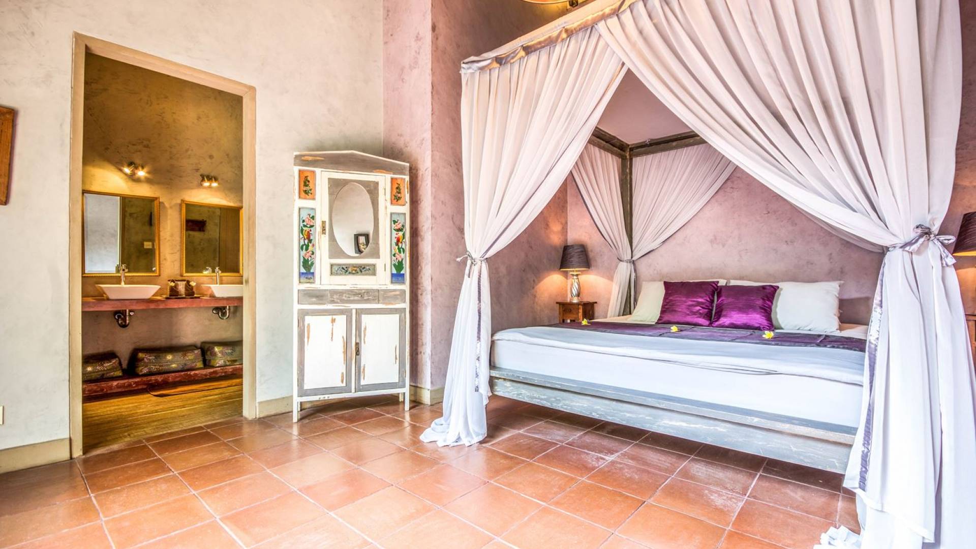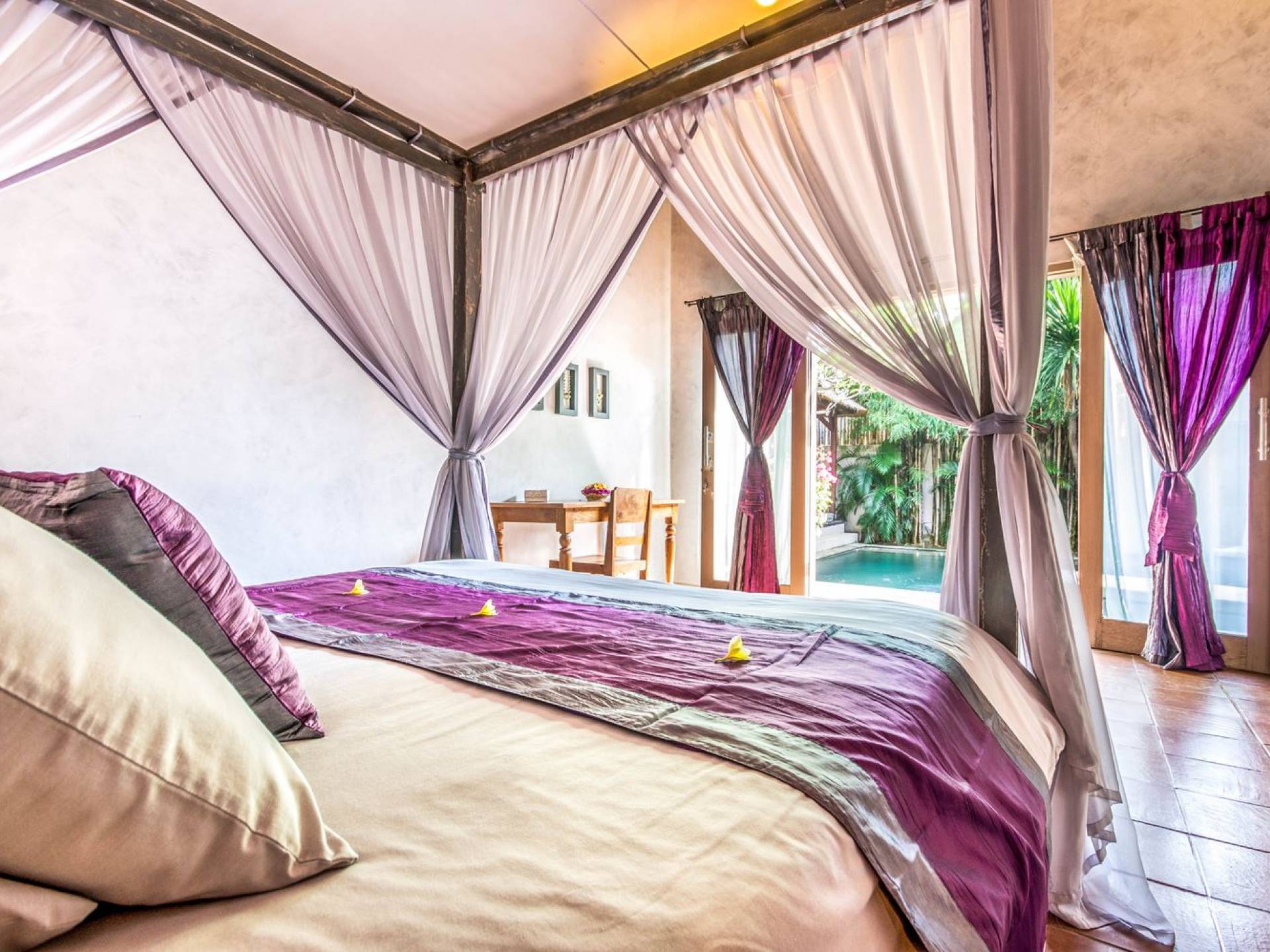 Le camere da letto sono nascoste in una struttura separata, che si apre sul giardino e sulla piscina. Le camere sono caratterizzate da temi cromatici individuali ma presentano gli stessi comfort e servizi moderni come aria condizionata e un letto king size a baldacchino di qualità. La camera da letto principale vanta anche una TV satellitare per guardare film in un ambiente più intimo. Ci sono armadi guardaroba in legno dipinto d'epoca e i bagni interni tropicali sono dotati di doppio lavabo e doccia a pioggia calda/fredda. Sono previsti servizi da bagno completi.