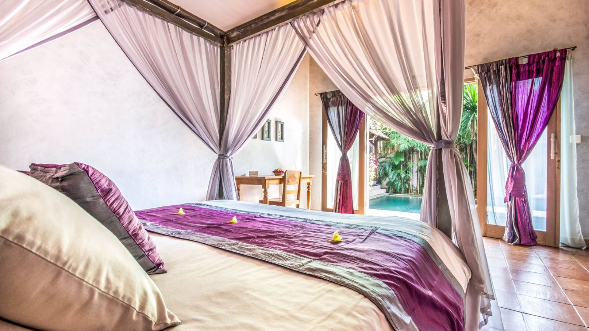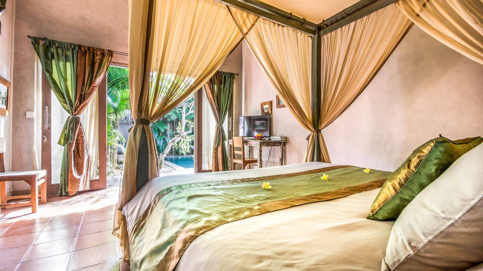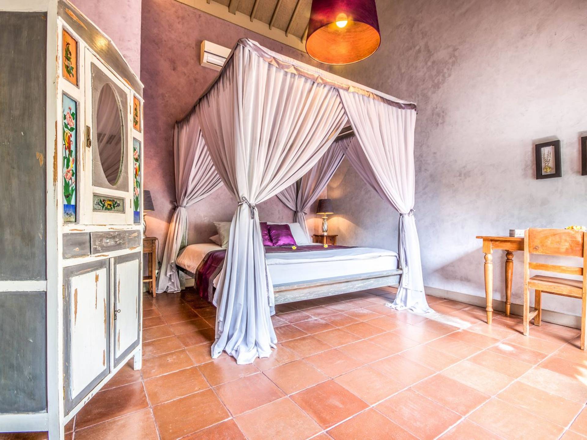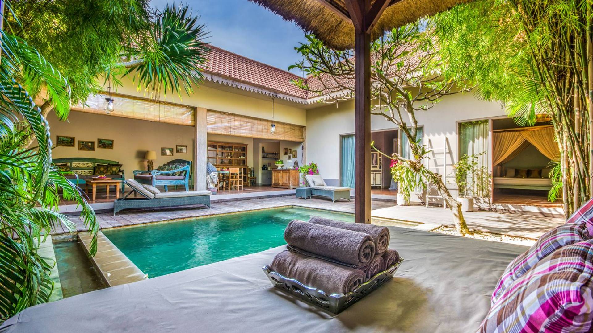 Le camere da letto sono nascoste in una struttura separata, che si apre sul giardino e sulla piscina. Le camere sono caratterizzate da temi cromatici individuali ma presentano gli stessi comfort e servizi moderni come aria condizionata e un letto king size a baldacchino di qualità. La camera da letto principale vanta anche una TV satellitare per guardare film in un ambiente più intimo. Ci sono armadi guardaroba in legno dipinto d'epoca e i bagni interni tropicali sono dotati di doppio lavabo e doccia a pioggia calda/fredda. Sono previsti servizi da bagno completi.