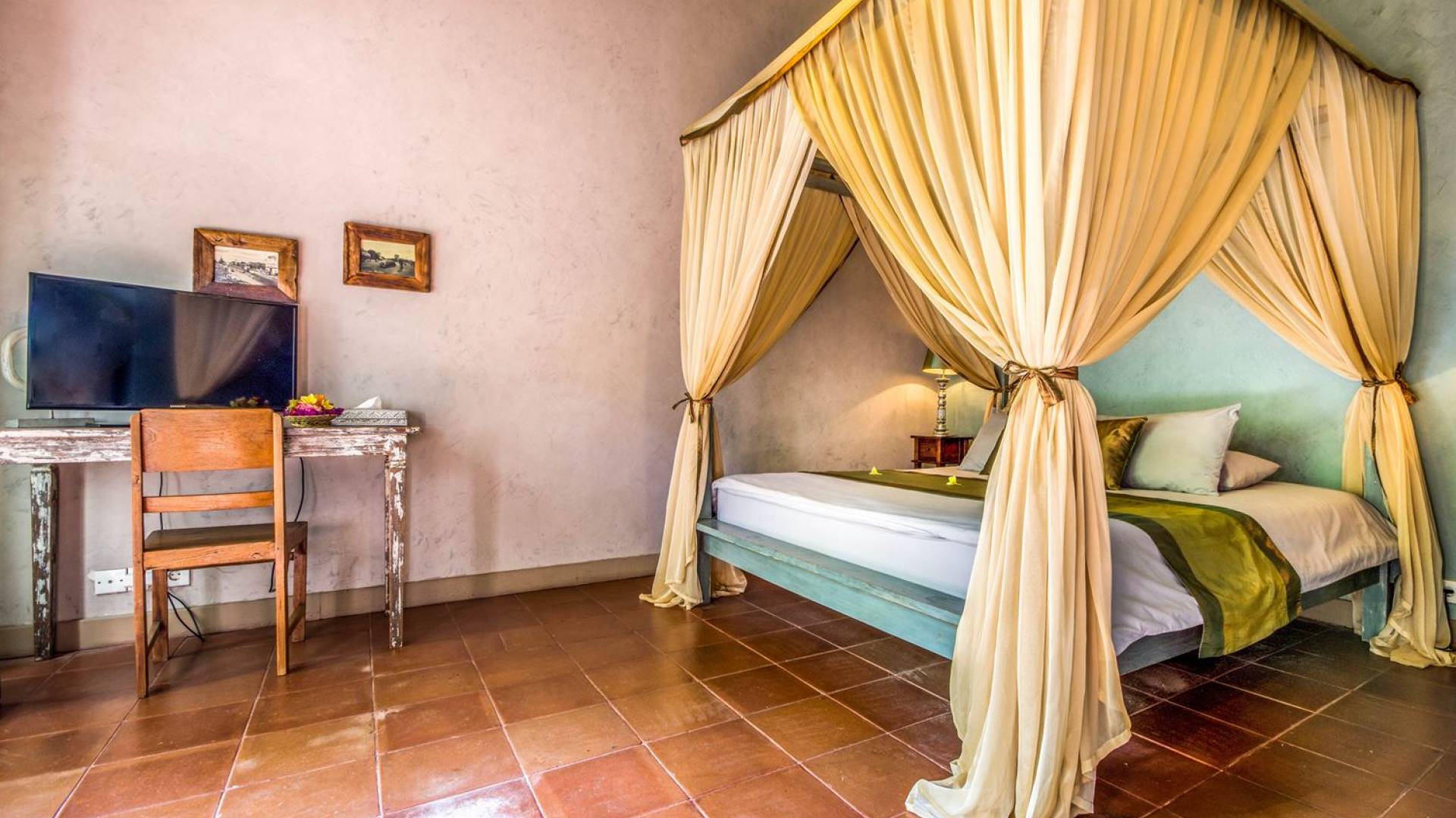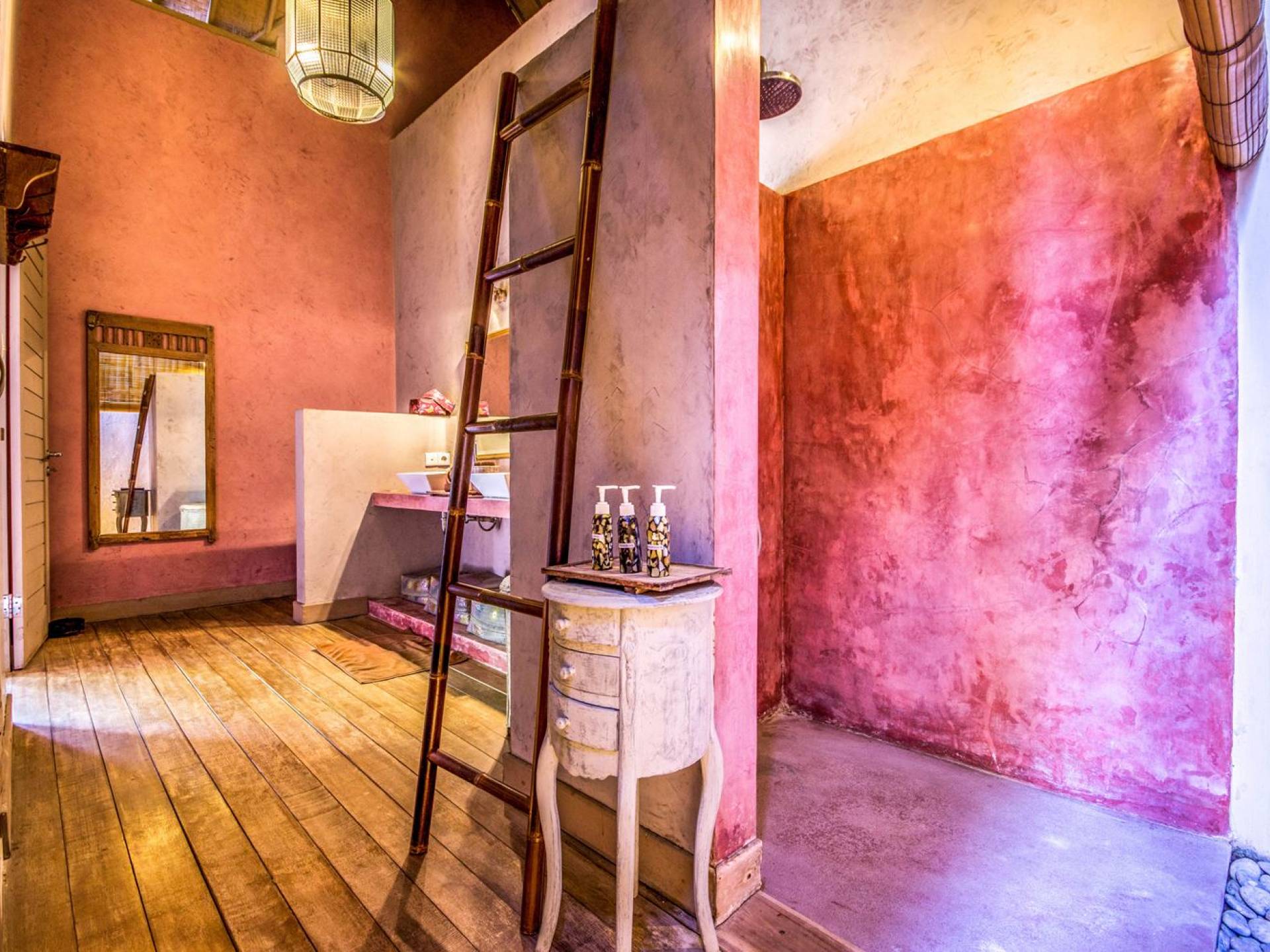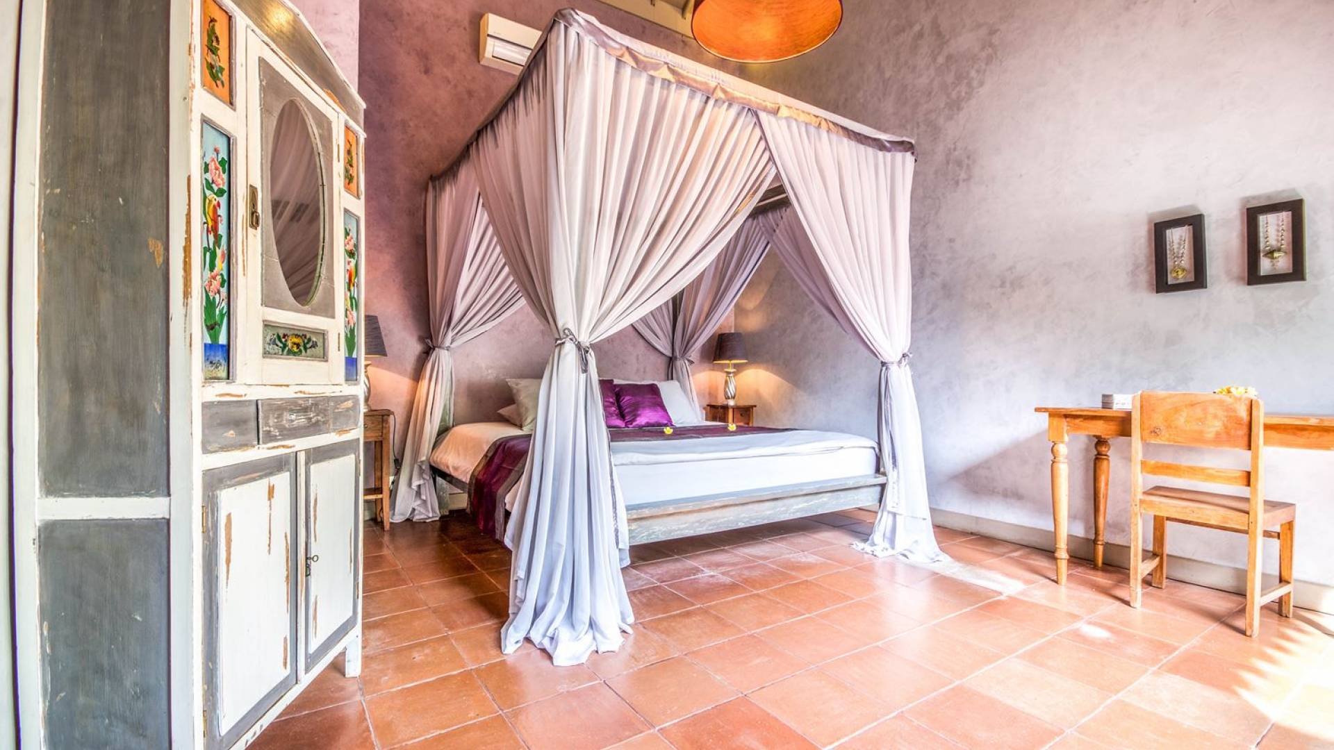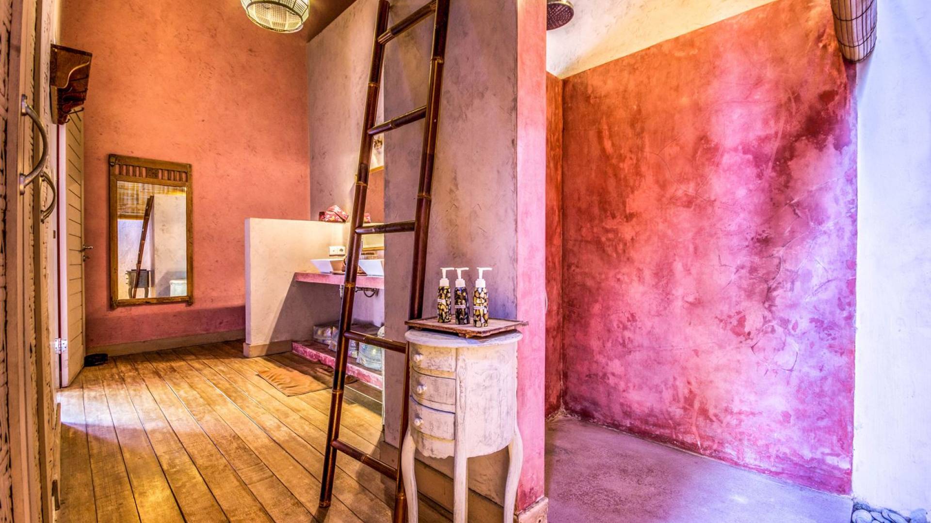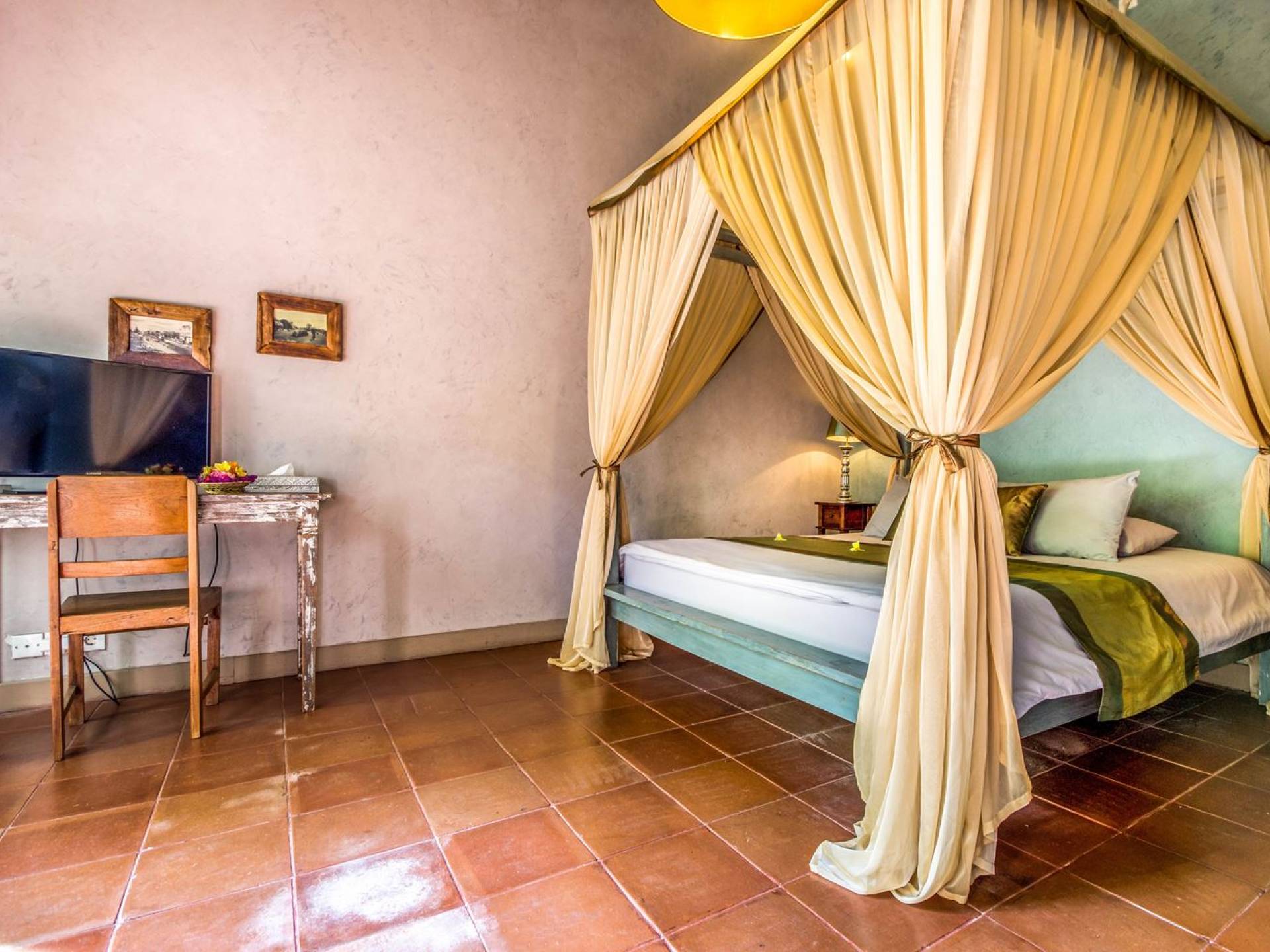 Le camere da letto sono nascoste in una struttura separata, che si apre sul giardino e sulla piscina. Le camere sono caratterizzate da temi cromatici individuali ma presentano gli stessi comfort e servizi moderni come aria condizionata e un letto king size a baldacchino di qualità. La camera da letto principale vanta anche una TV satellitare per guardare film in un ambiente più intimo. Ci sono armadi guardaroba in legno dipinto d'epoca e i bagni interni tropicali sono dotati di doppio lavabo e doccia a pioggia calda/fredda. Sono previsti servizi da bagno completi.