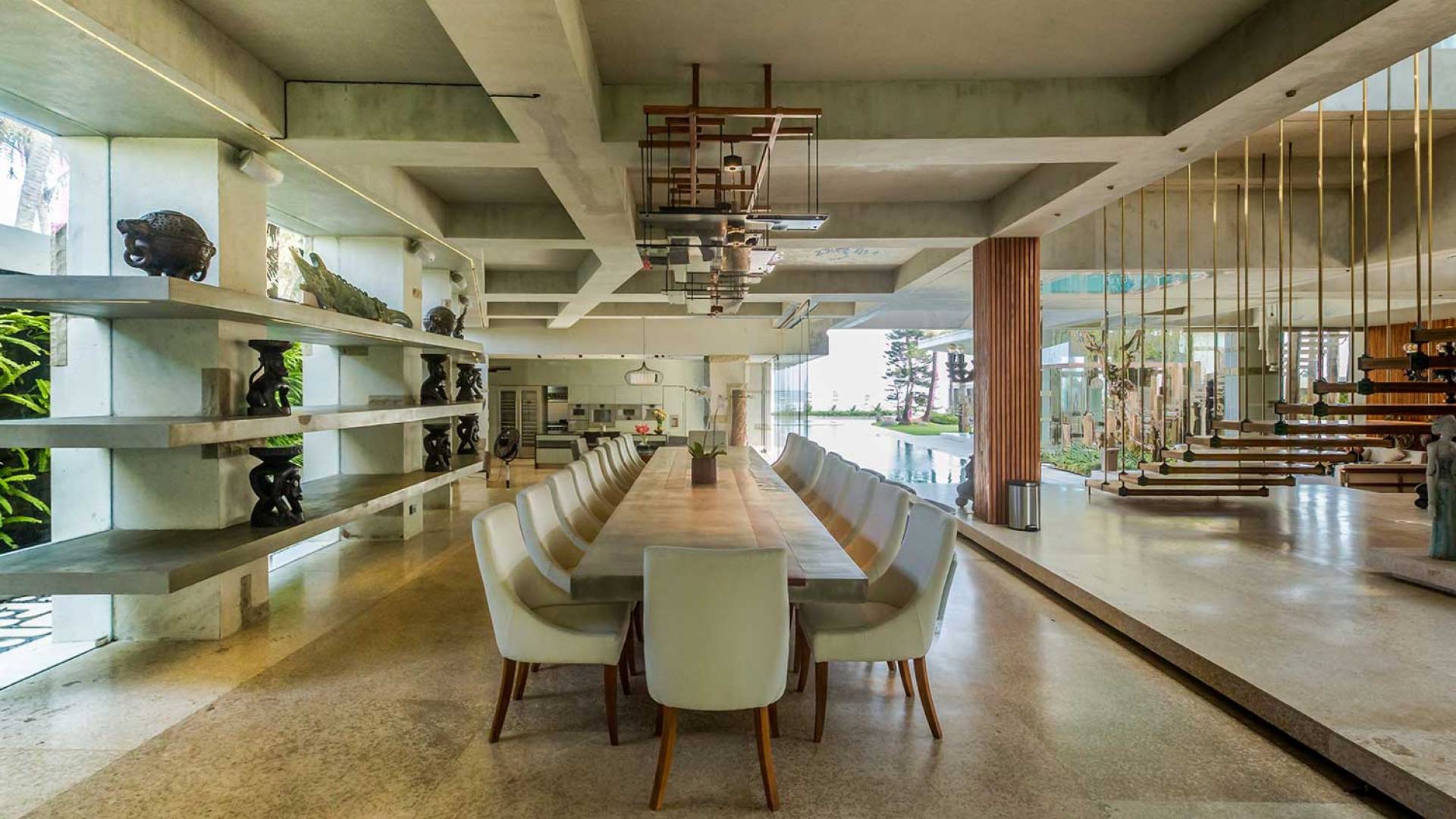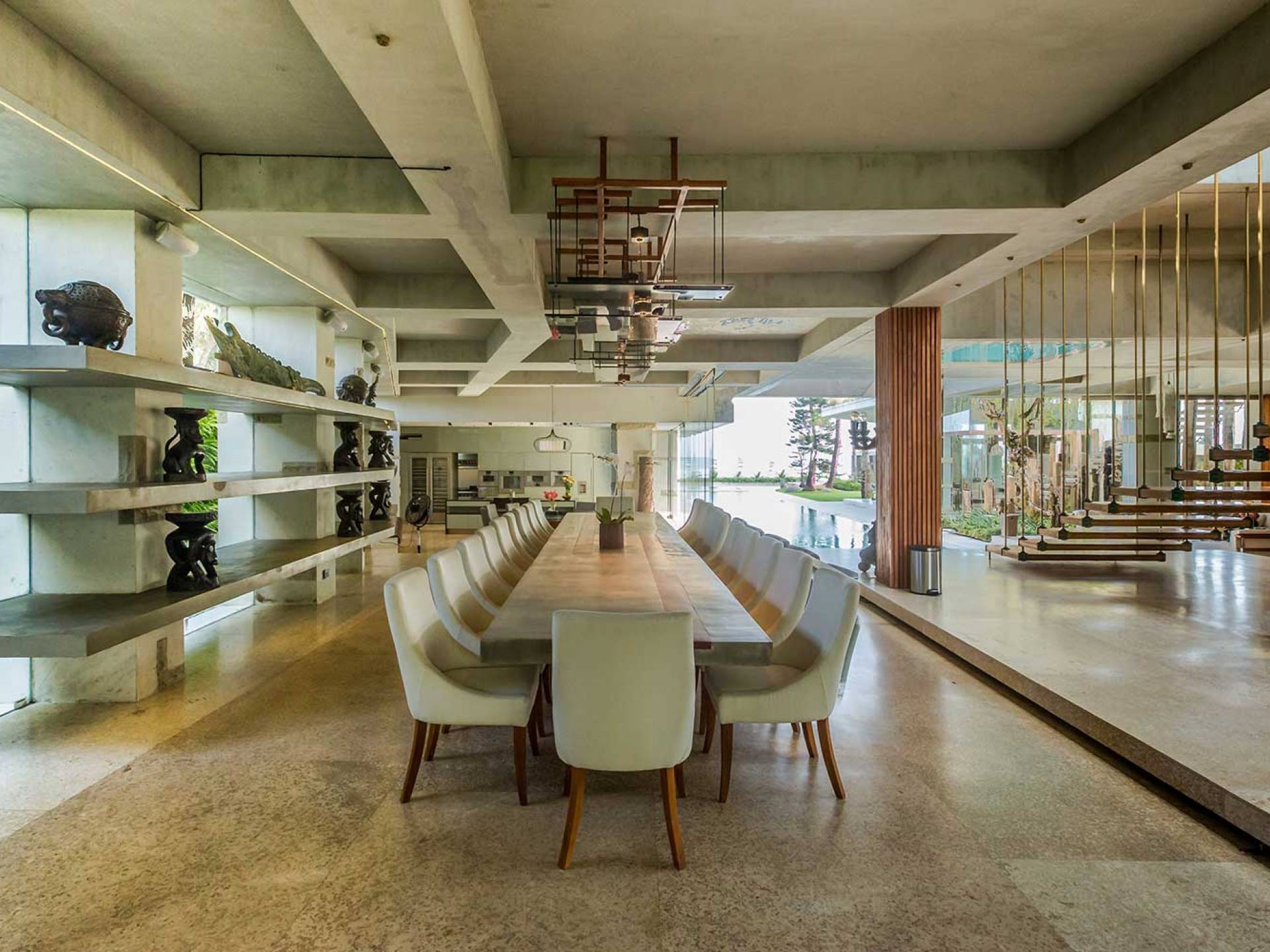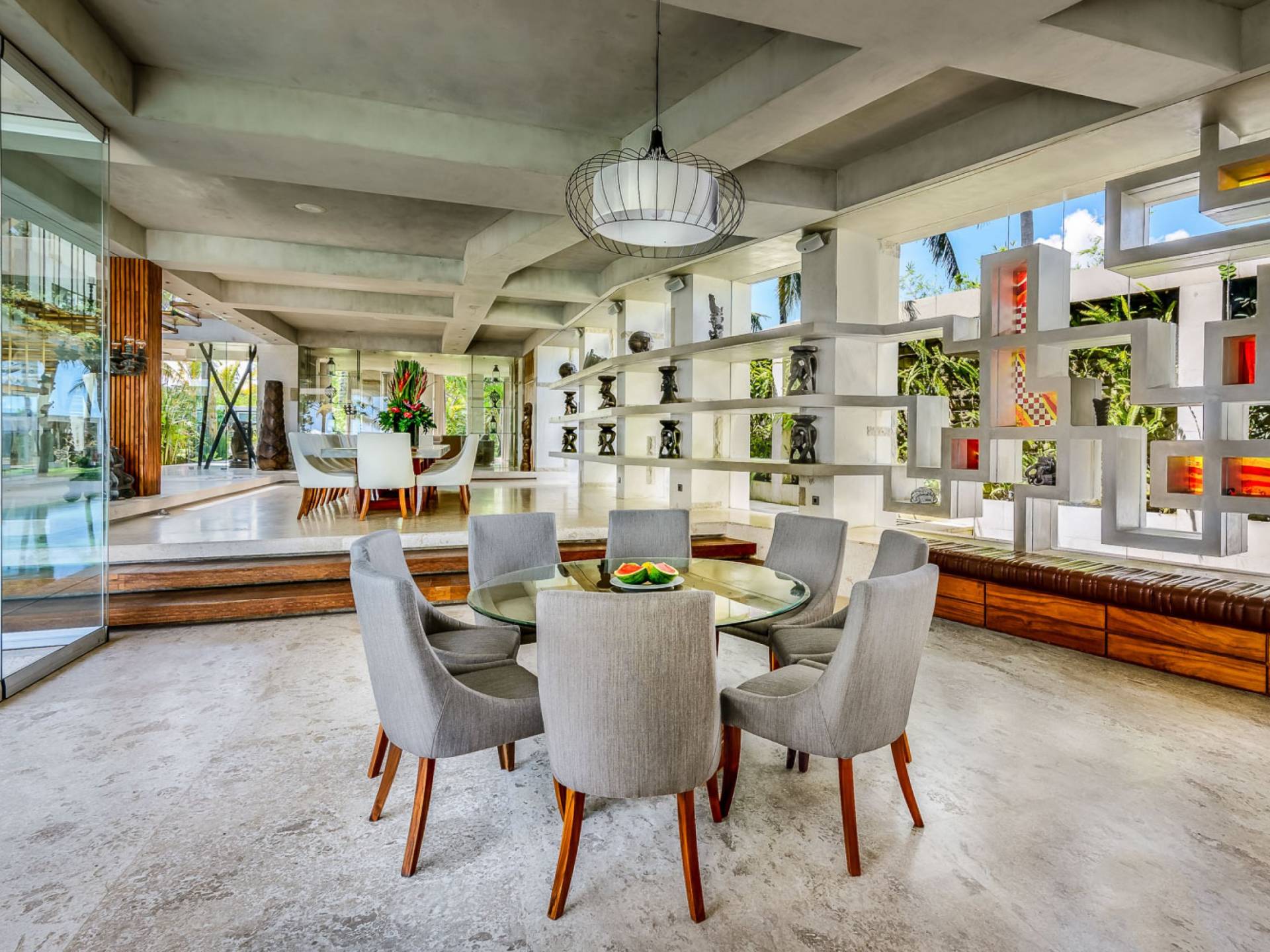 Il tavolo da pranzo formale può ospitare 20 persone e la balla di fronte all'oceano offre cene all'aperto con vista sull'Oceano Indiano. Villa Vedas Bali offre viste panoramiche in tutte le direzioni. Guardando il mare si vede Giava e il sole che tramonta, mentre antiche risaie circondano la villa a nord e a sud, e alle spalle si erge lo splendido vulcano Batukaru.