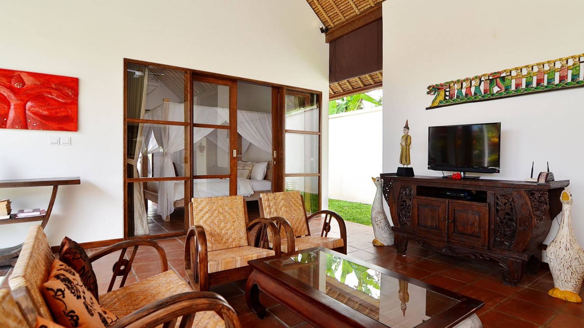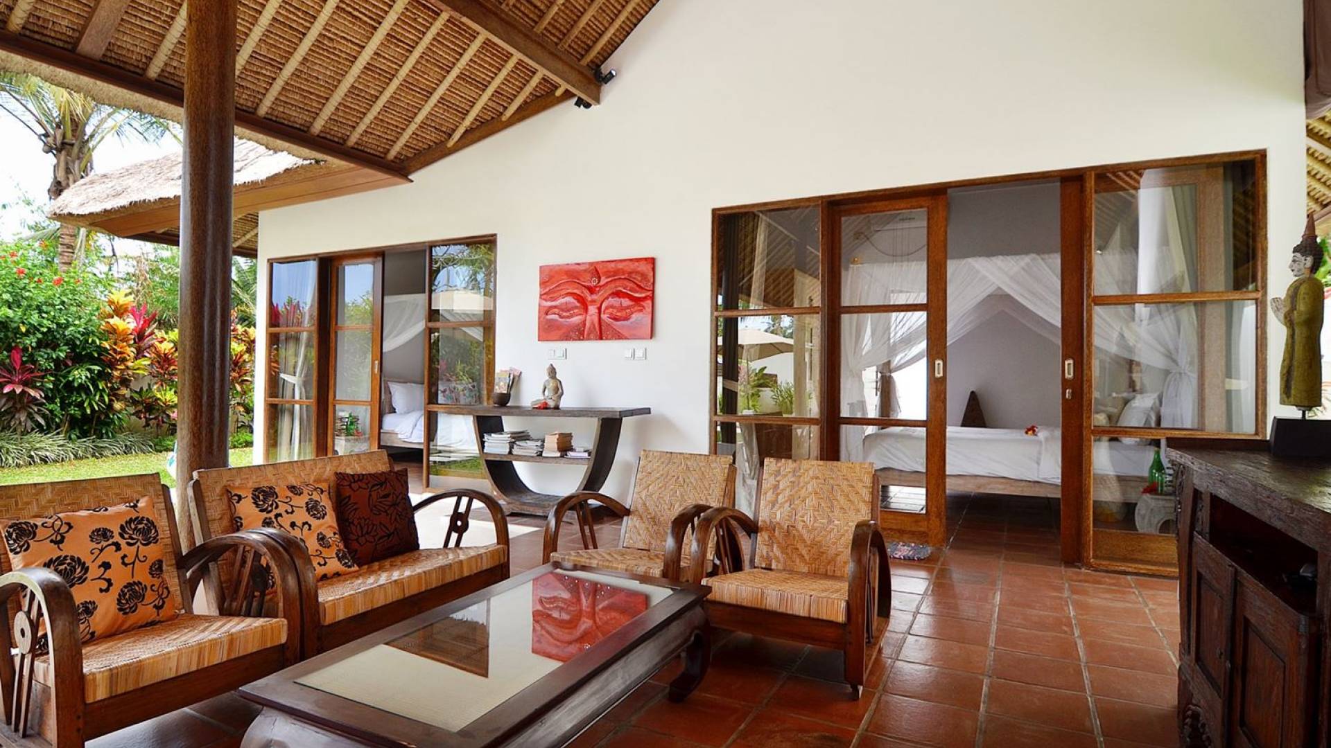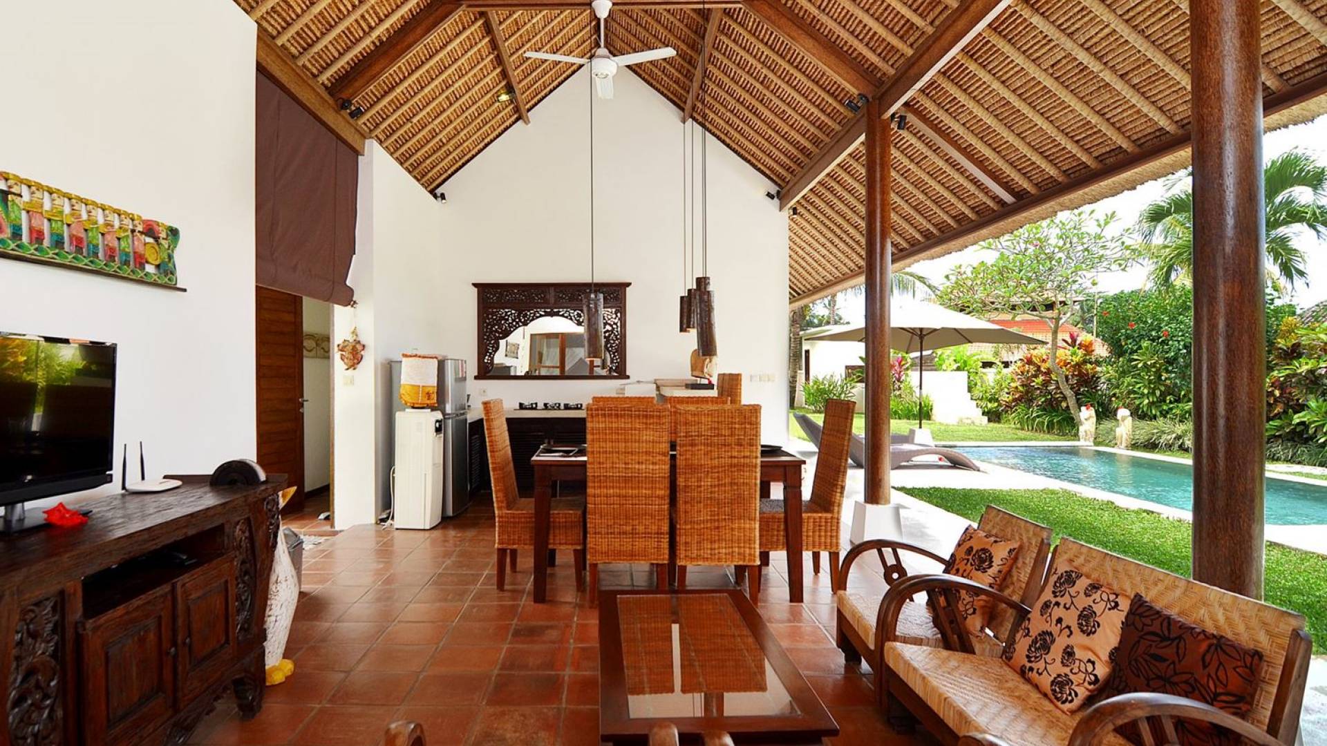 Il design degli interni è elegante e naturale, con un divano lounge in bambù dove tutta la famiglia può sedersi insieme a bevande e popcorn, guardando film la sera sulla TV a schermo piatto con lettore DVD. Al centro del soggiorno si trova un bel tavolo da pranzo in teak con sedie in rattan e c'è una cucina completamente attrezzata con un bar e sgabelli per godersi il caffè al mattino. Il padiglione è arricchito da alcuni raffinati manufatti tradizionali e i ventilatori a soffitto rendono il soggiorno un luogo piacevole e arioso dove rilassarsi in qualsiasi momento della giornata.