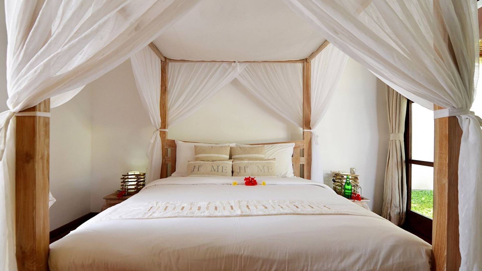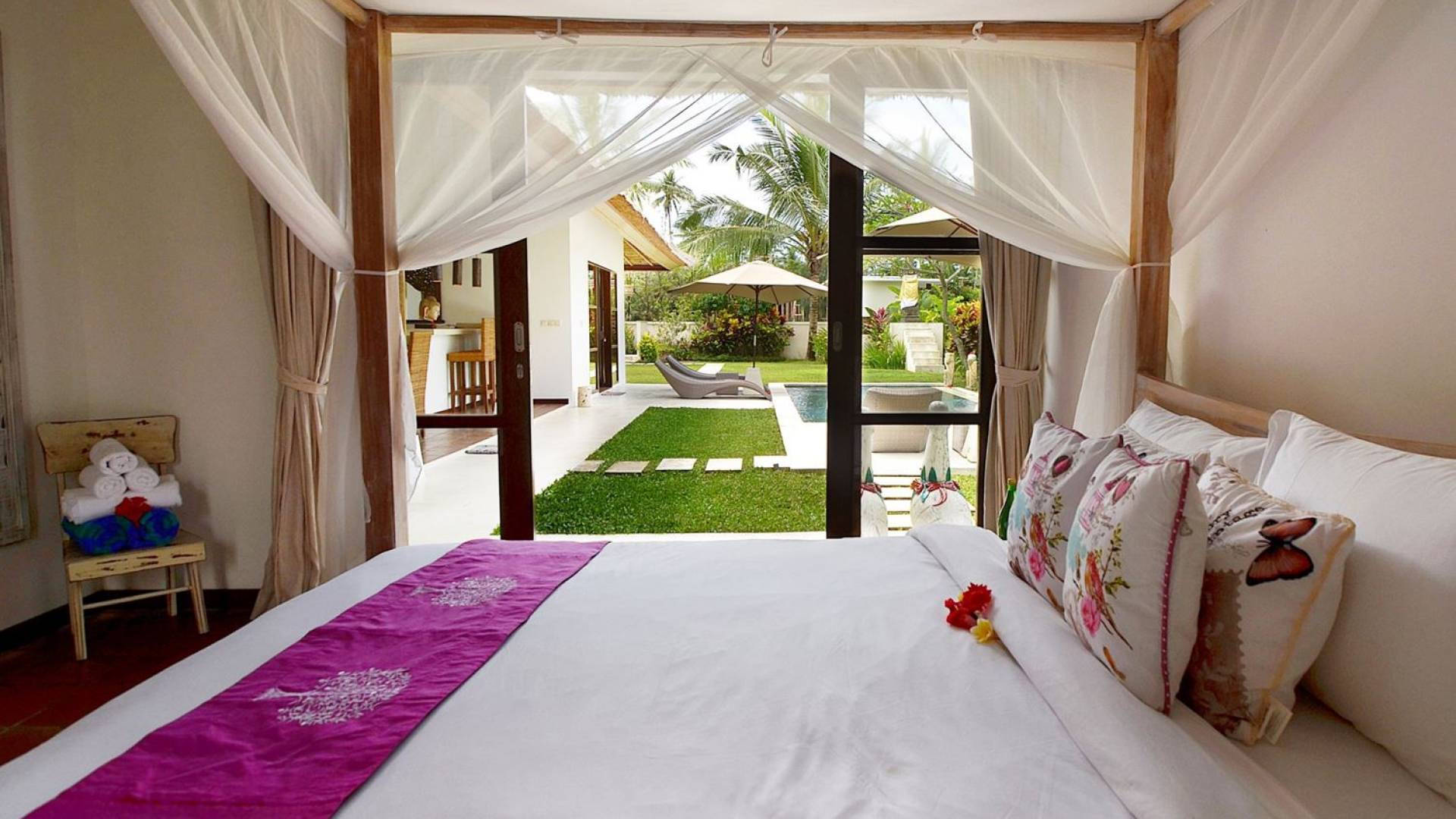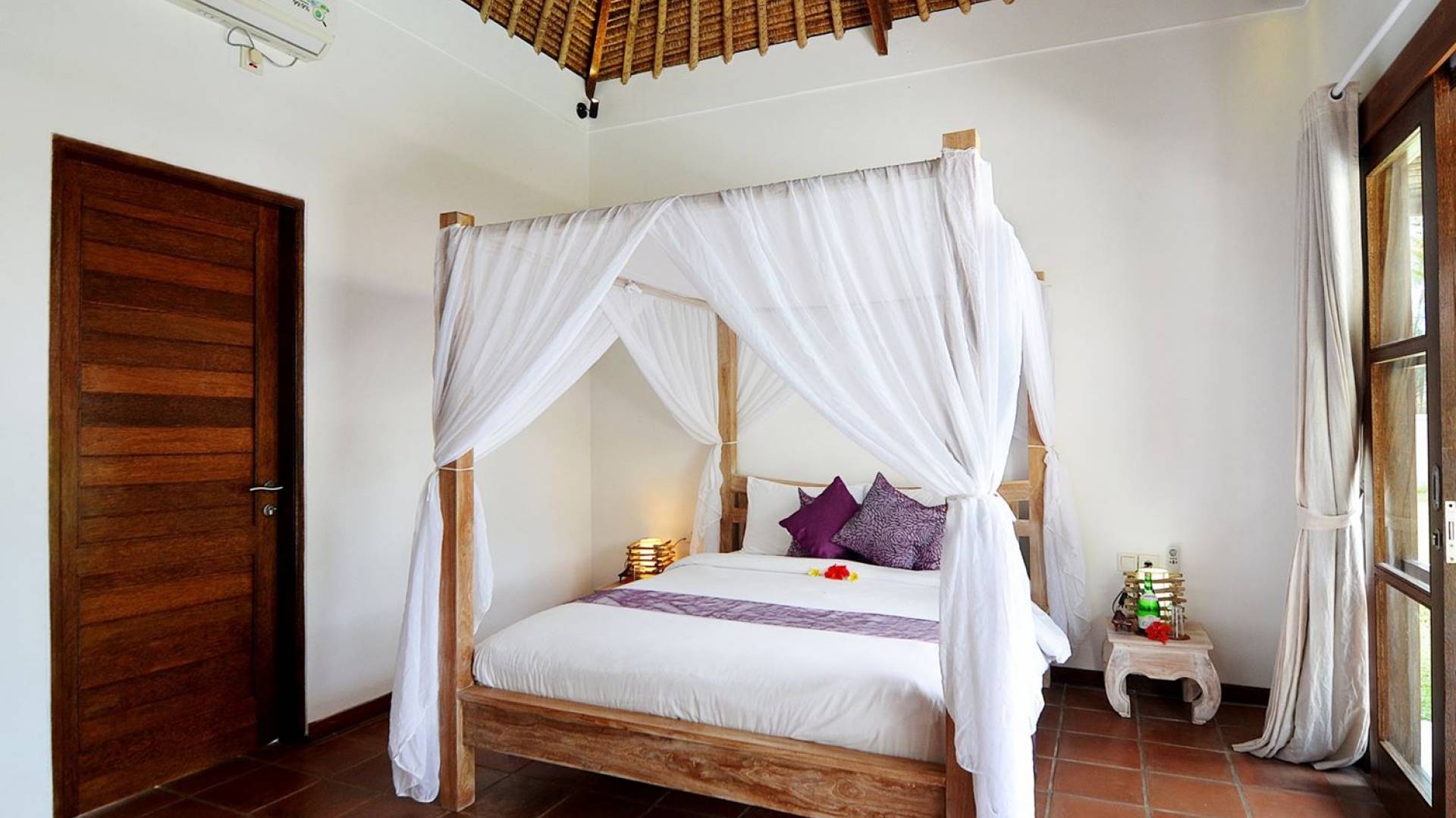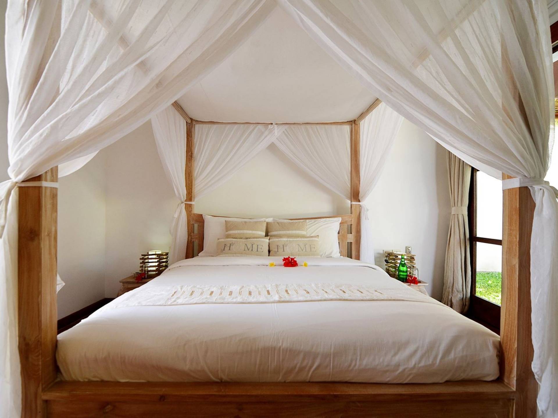 Tutte le tre camere da letto di Villa Candi Kecil Tiga sono dotate di porte in vetro dal pavimento al soffitto che si aprono sul giardino, offrendo agli ospiti una vista meravigliosa per svegliarsi ogni mattina durante il loro soggiorno. All'interno, le camere sono arredate con aria condizionata e letti a baldacchino a baldacchino drappeggiati da zanzariere bianche. I bagni privati presentano un design tropicale all'aperto per fare la doccia sotto le stelle. I prodotti da bagno sono forniti.