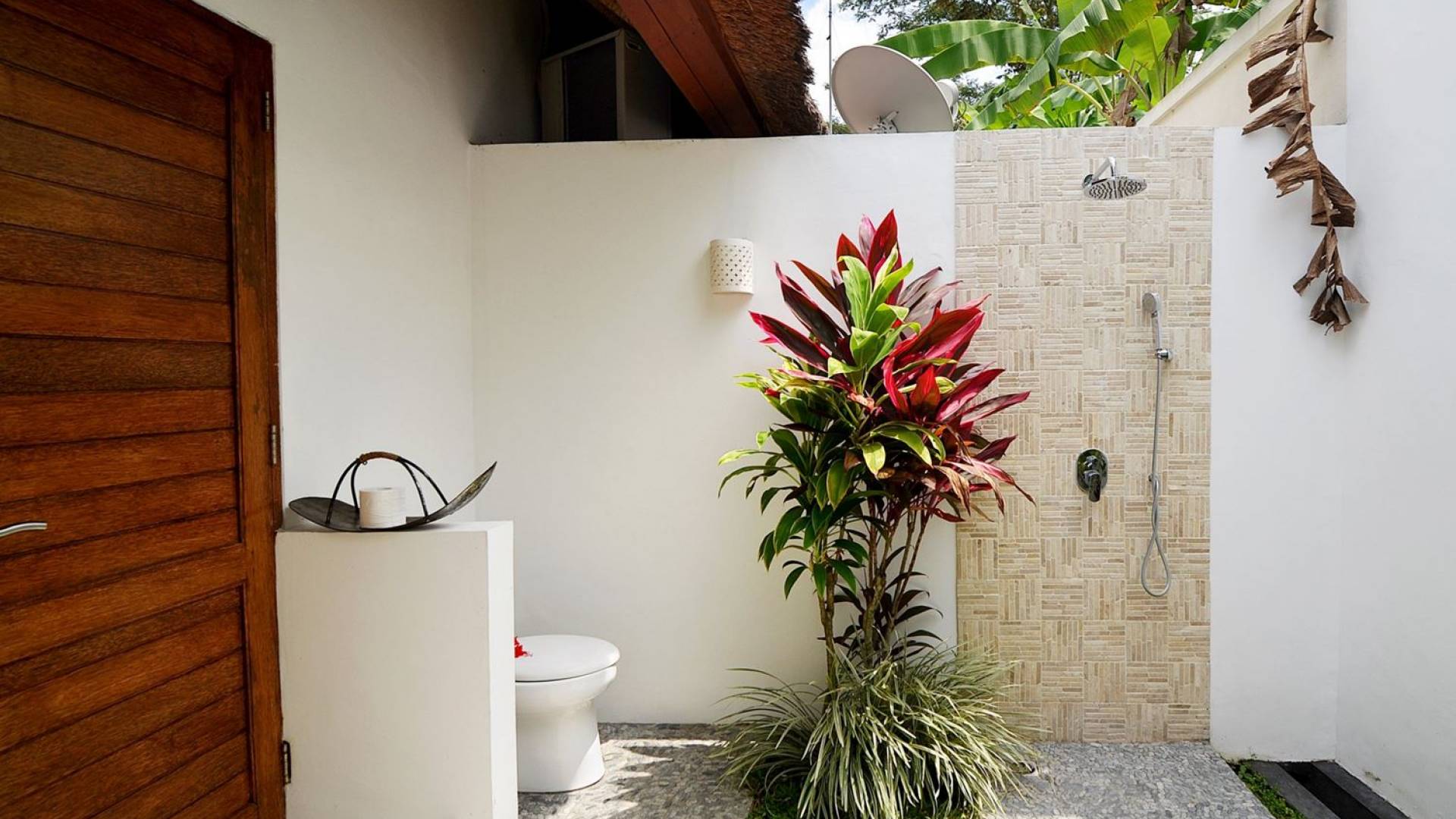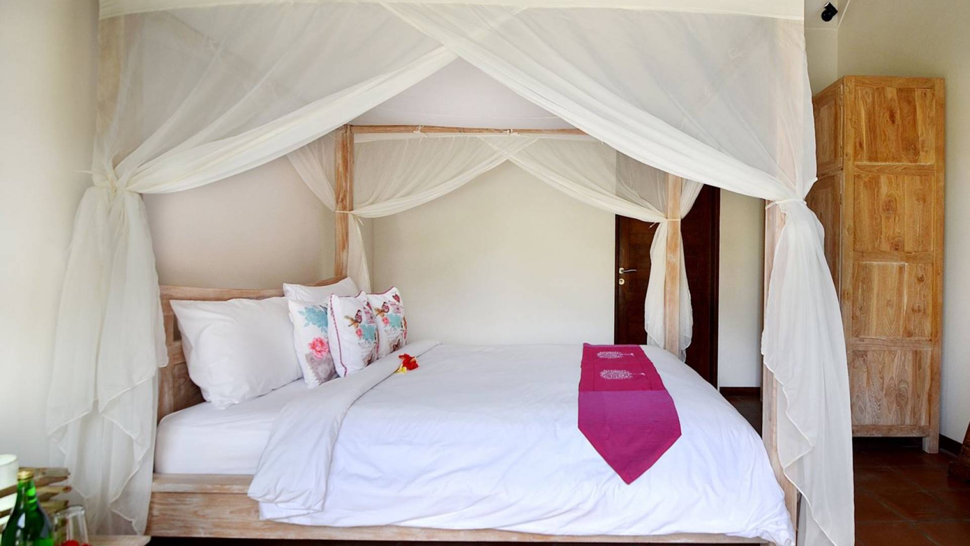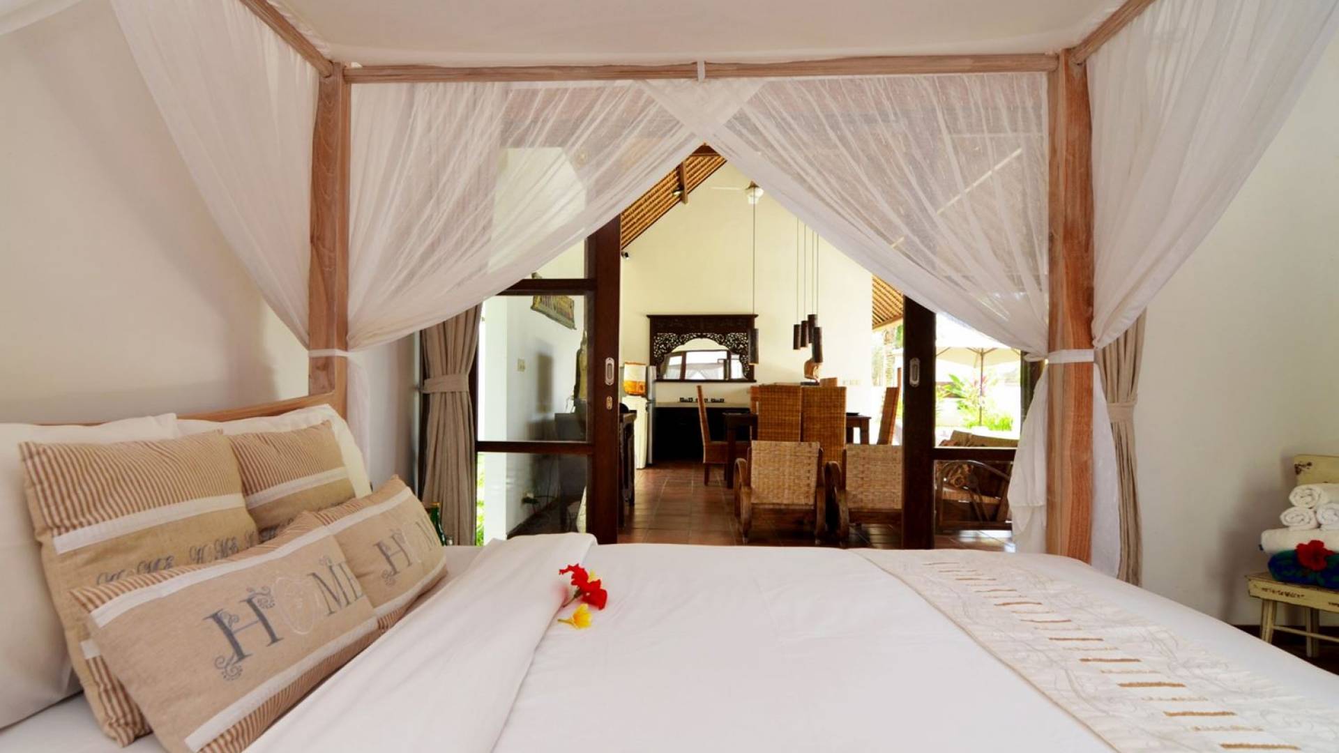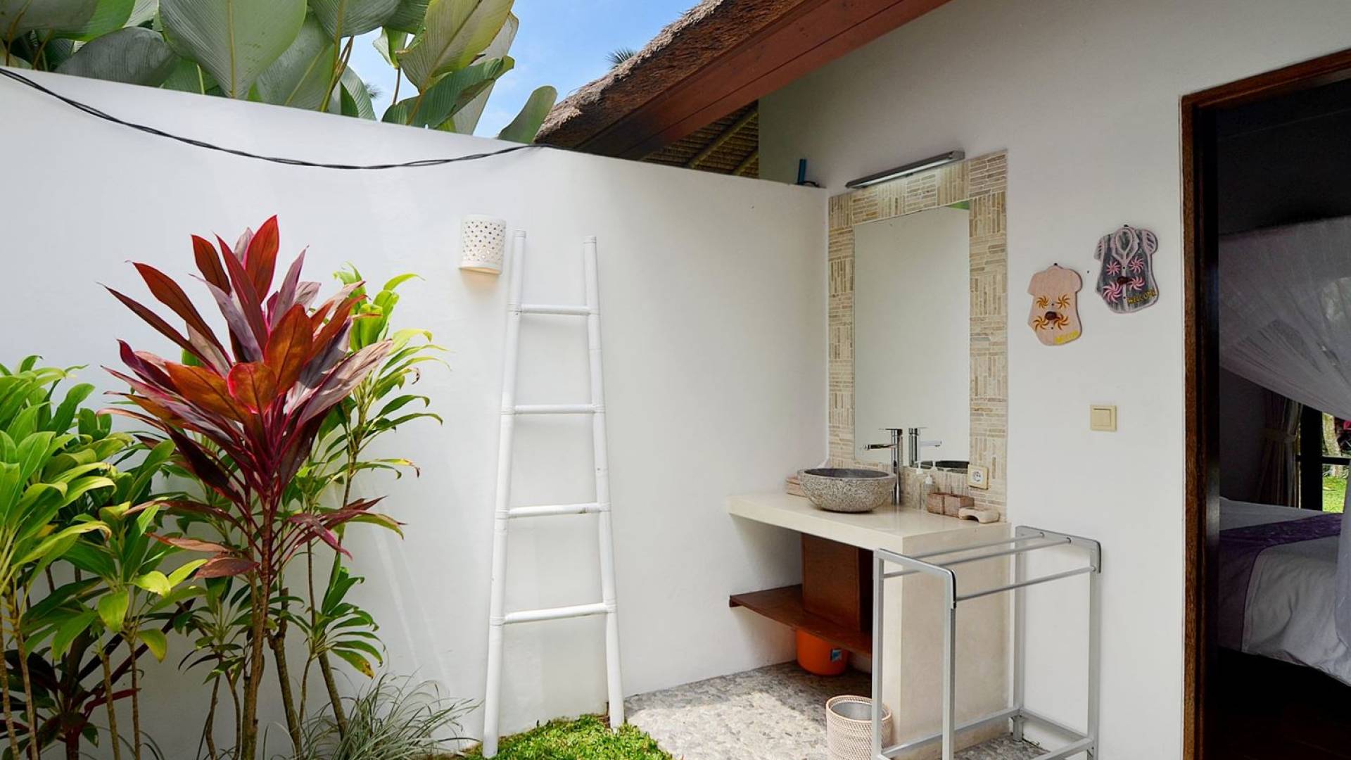Tutte le tre camere da letto di Villa Candi Kecil Tiga sono dotate di porte in vetro dal pavimento al soffitto che si aprono sul giardino, offrendo agli ospiti una vista meravigliosa per svegliarsi ogni mattina durante il loro soggiorno. All'interno, le camere sono arredate con aria condizionata e letti a baldacchino a baldacchino drappeggiati da zanzariere bianche. I bagni privati presentano un design tropicale all'aperto per fare la doccia sotto le stelle. I prodotti da bagno sono forniti.