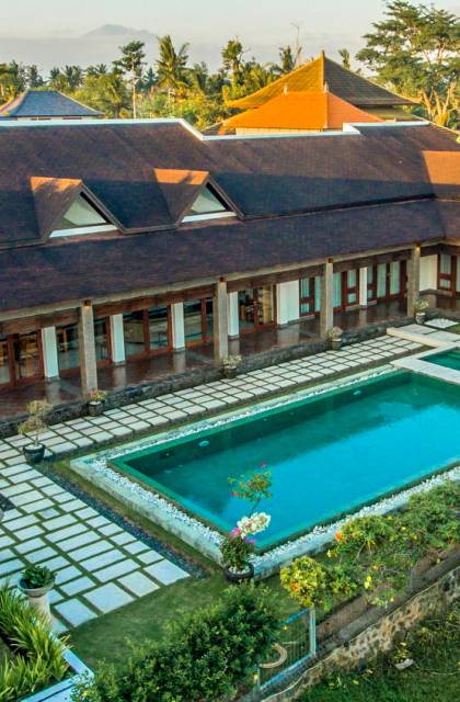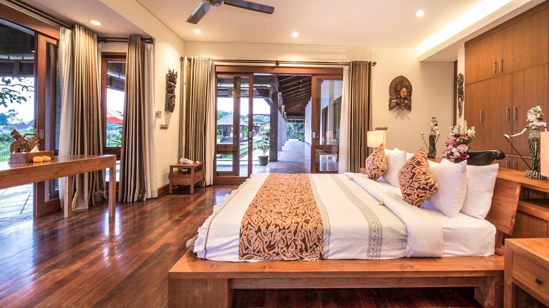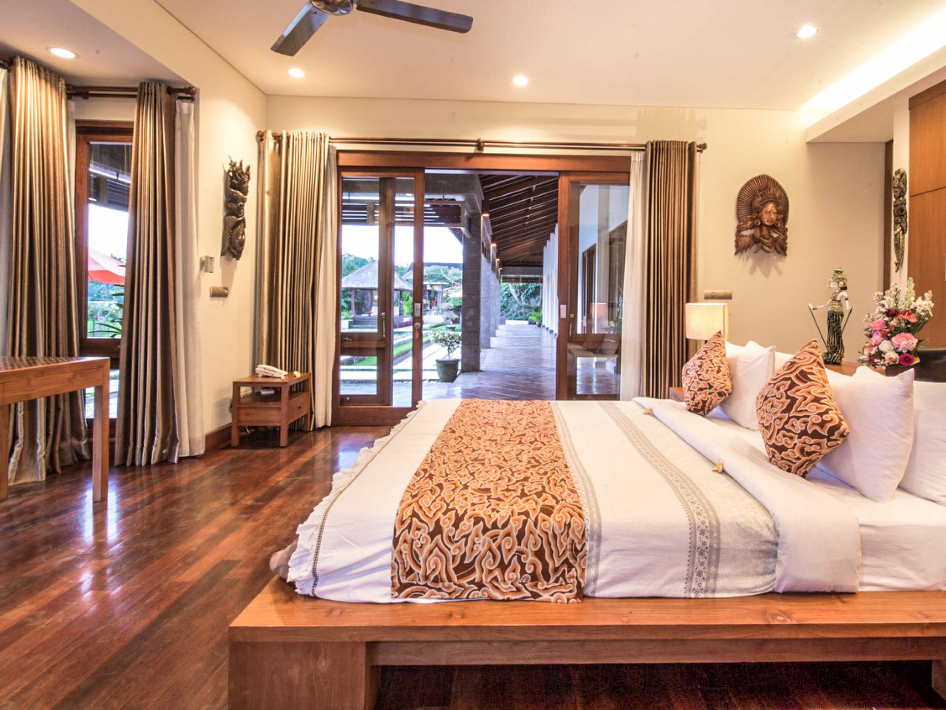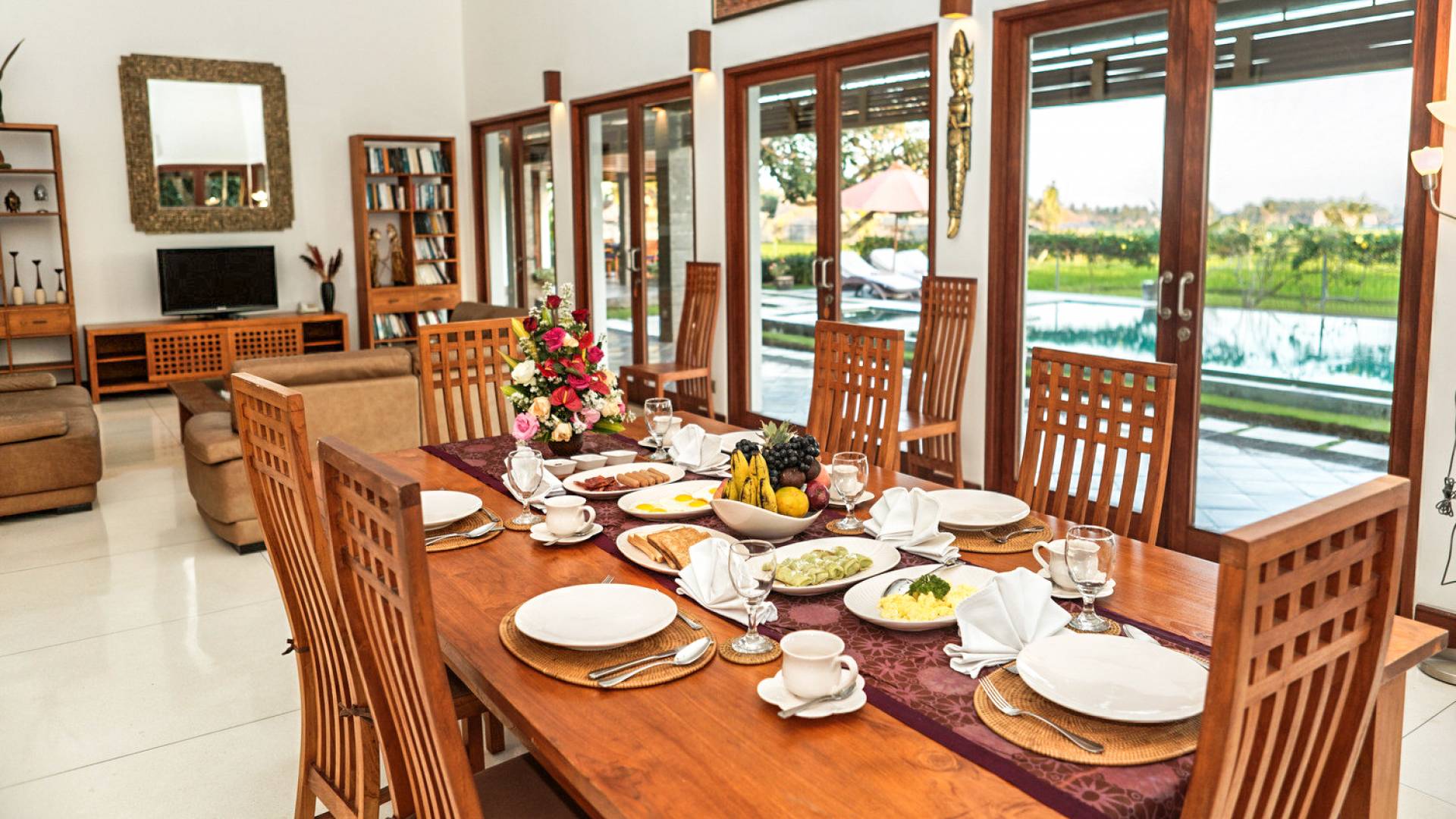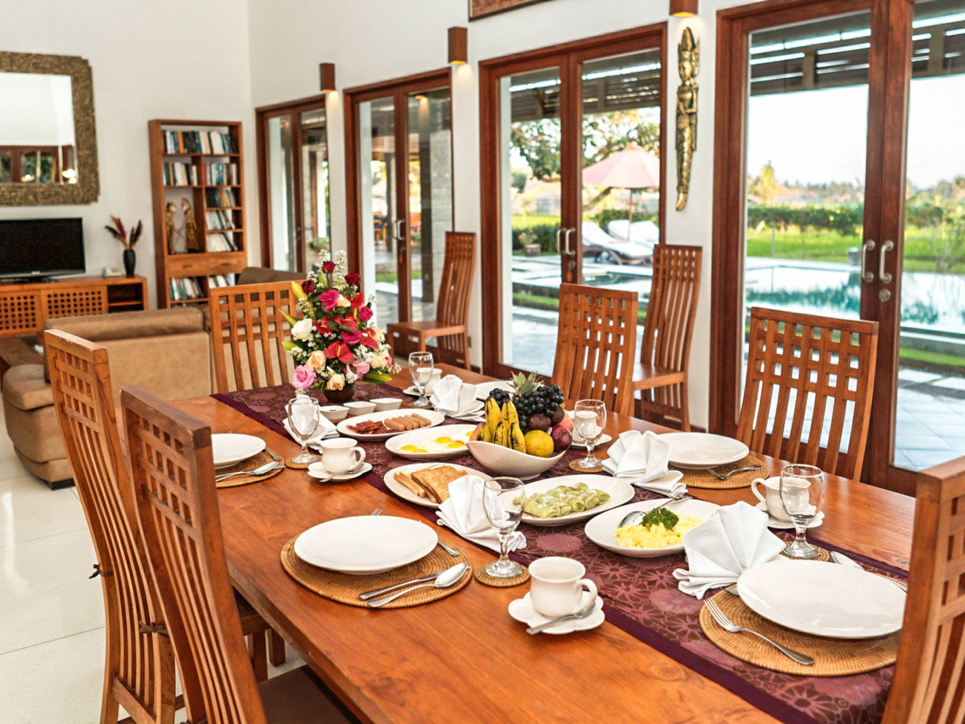 Le porte in vetro nelle zone giorno e pranzo conducono alla vista delle risaie e degli incantevoli giardini verdi. Tuttavia, se vuoi rinfrescarti, chiudi le porte e goditi un ambiente confortevole e climatizzato in tutta la villa. Con magnifiche opere d'arte tradizionali, un tavolo da pranzo in legno per dieci persone e un comodo divano in pelle di fronte a una parete di intrattenimento con un'enorme TV a schermo piatto, lettore DVD e libri, il design degli interni è una deliziosa combinazione di caratteristiche moderne e tradizionali. È inoltre disponibile una sala multimediale per una confortevole serata cinematografica interna.