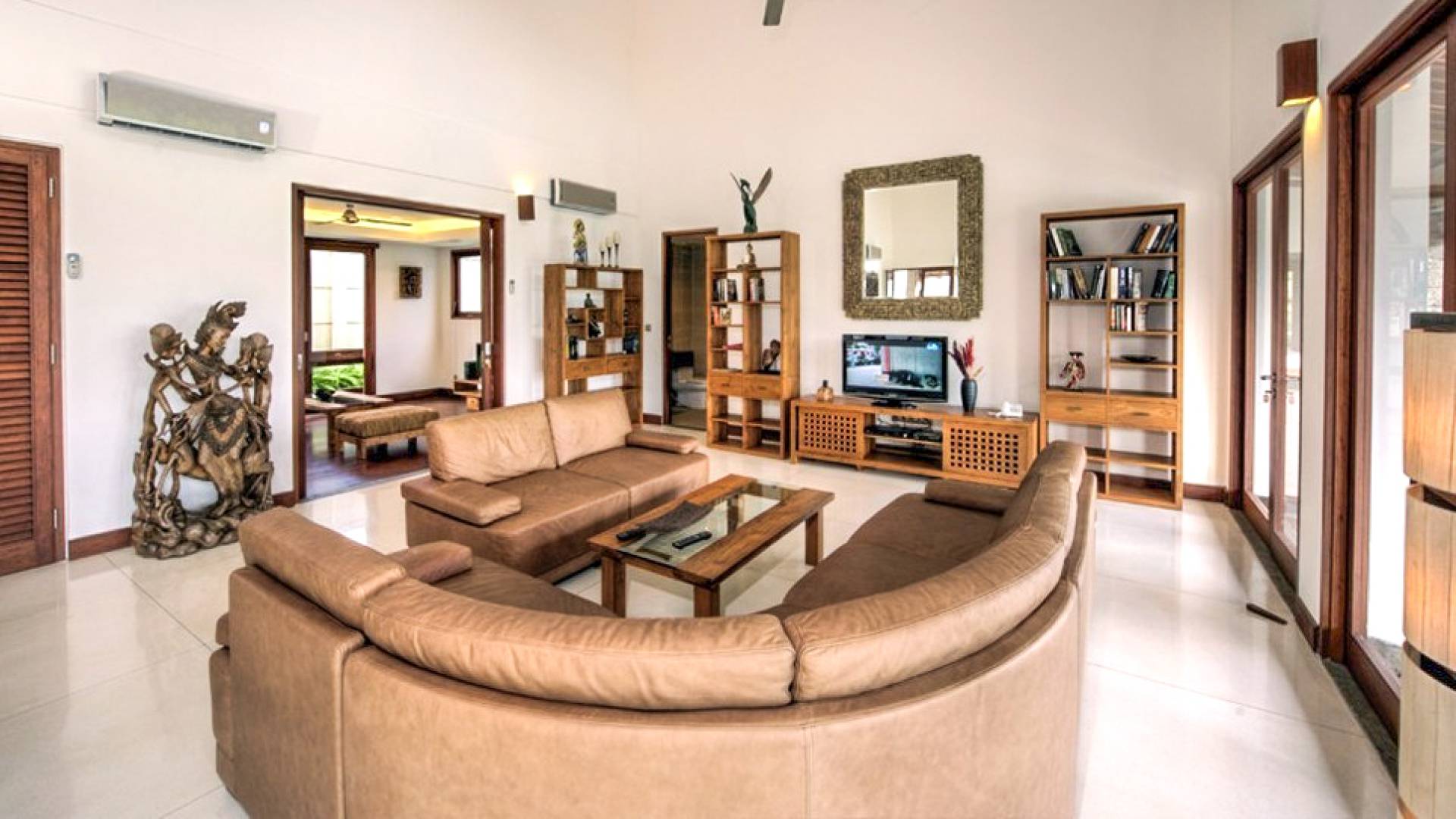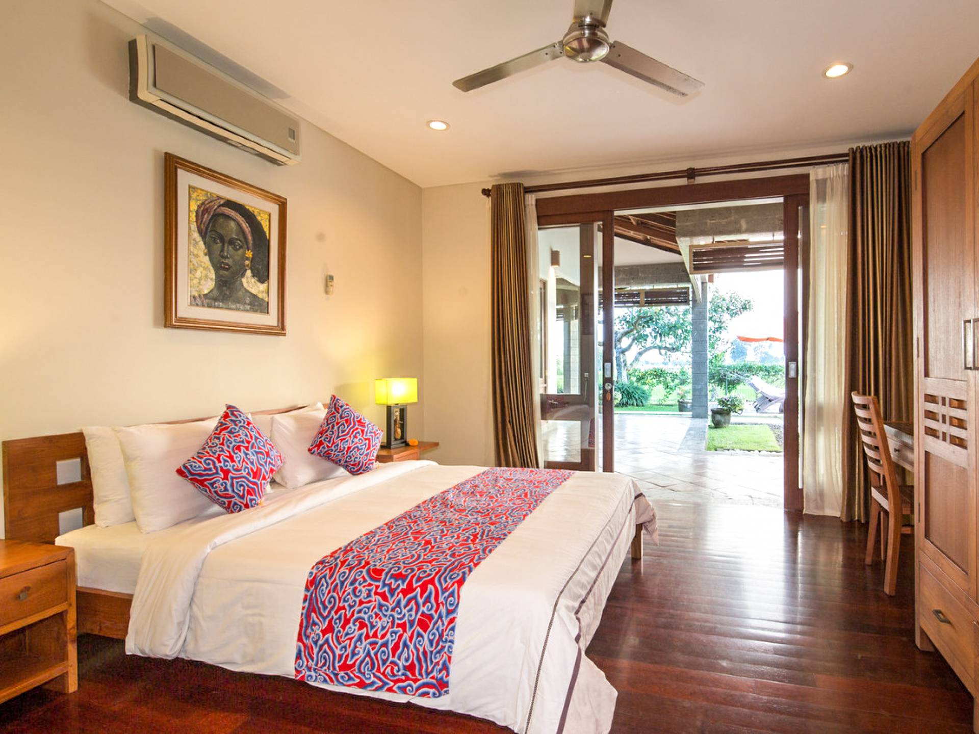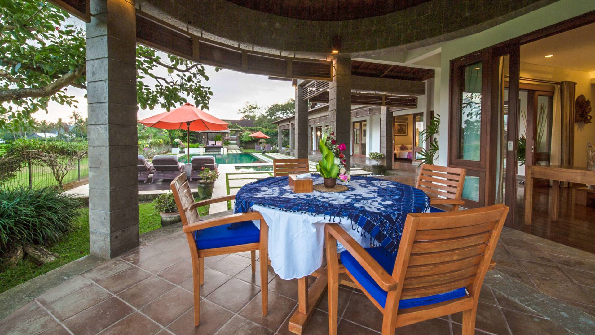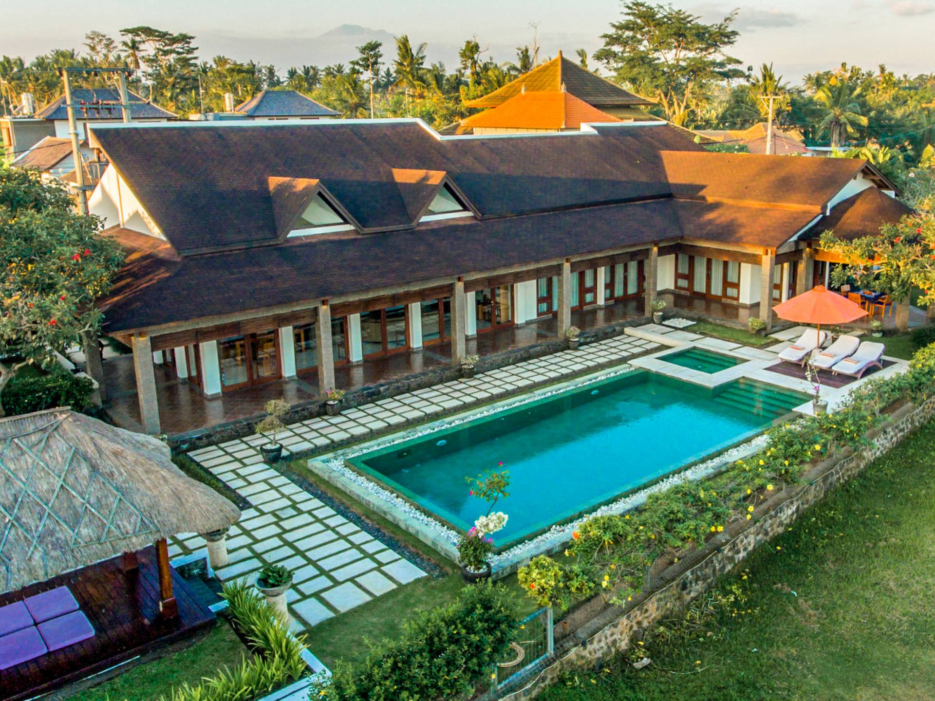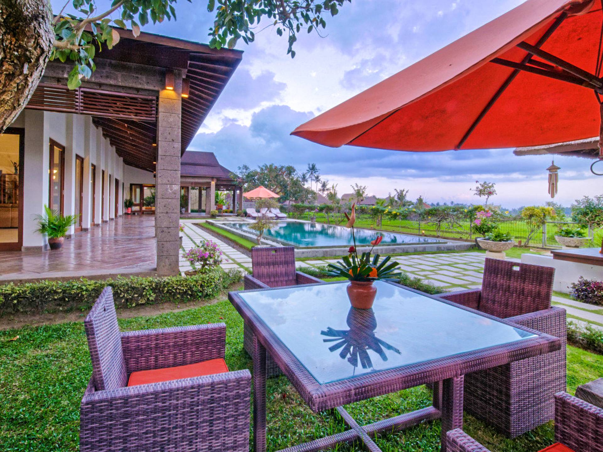 Le porte in vetro nelle zone giorno e pranzo conducono alla vista delle risaie e degli incantevoli giardini verdi. Tuttavia, se vuoi rinfrescarti, chiudi le porte e goditi un ambiente confortevole e climatizzato in tutta la villa. Con magnifiche opere d'arte tradizionali, un tavolo da pranzo in legno per dieci persone e un comodo divano in pelle di fronte a una parete di intrattenimento con un'enorme TV a schermo piatto, lettore DVD e libri, il design degli interni è una deliziosa combinazione di caratteristiche moderne e tradizionali. È inoltre disponibile una sala multimediale per una confortevole serata cinematografica interna.