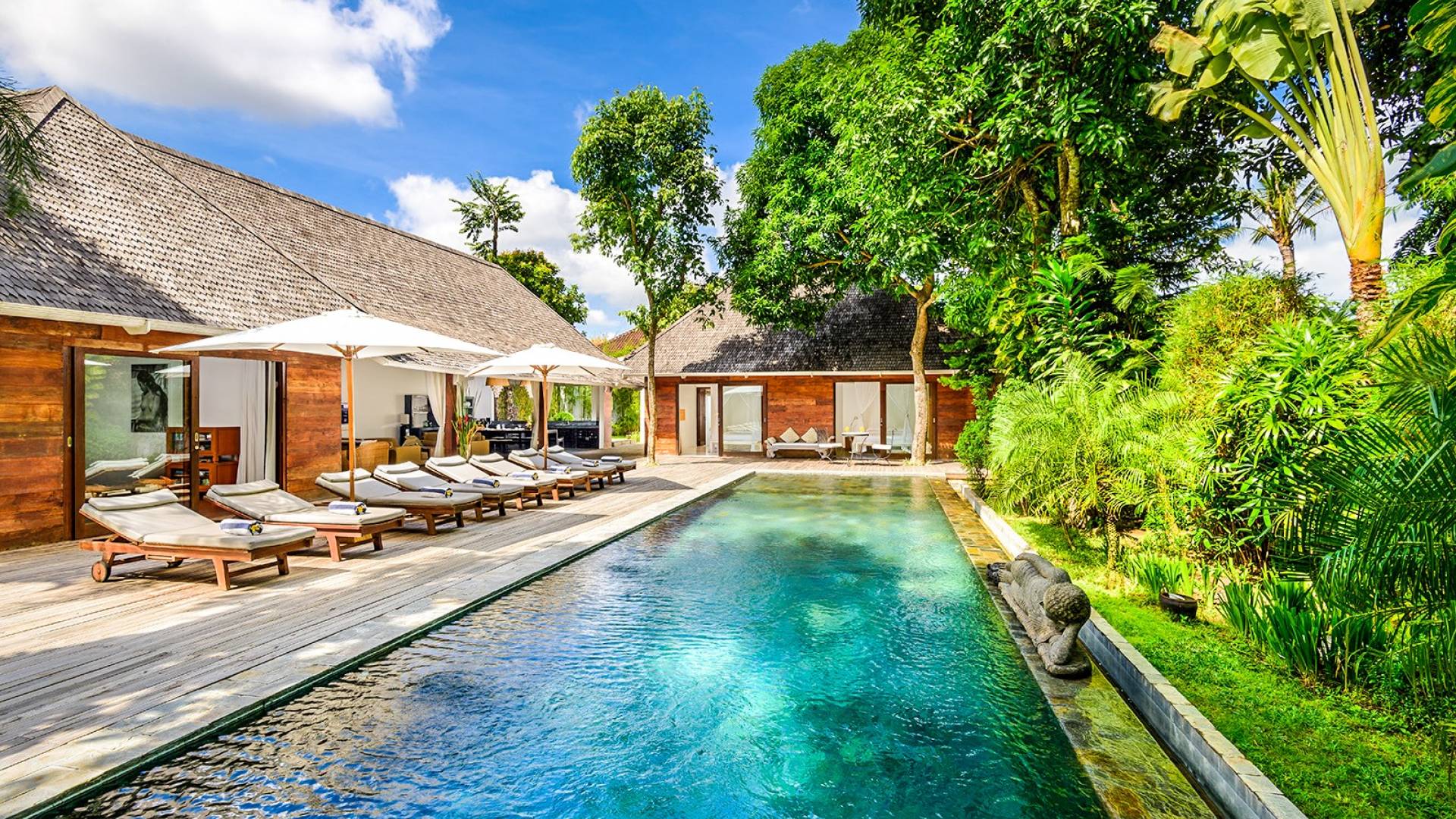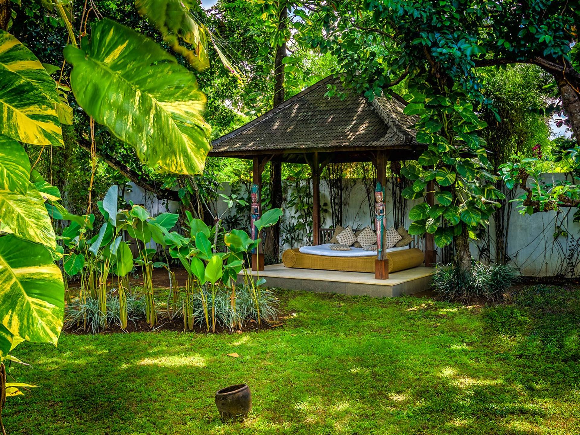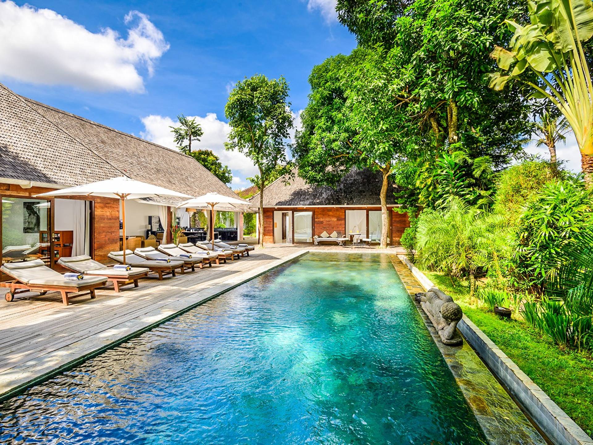 Le quattro camere da letto possono ospitare fino a 8 adulti e bambini ed è comunque abbastanza grande da offrire privacy a tutti. Il fulcro di Villa Liola è una piscina olimpionica di 15 m circondata da un generoso ponte in legno con lettini e ombrelloni per oziare durante la giornata. In fondo al giardino troverai un incantevole Bale Bengong, il luogo perfetto per ritirarsi, rilassarsi, fare un massaggio, scrivere un libro o solo una lettera, o semplicemente meditare sulla pace e la felicità.
