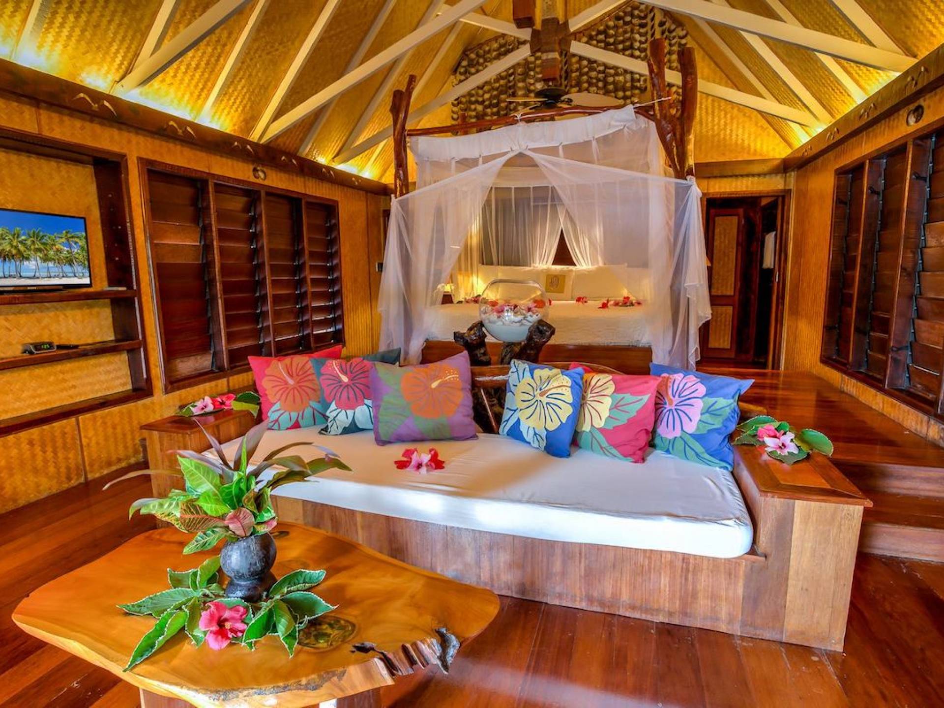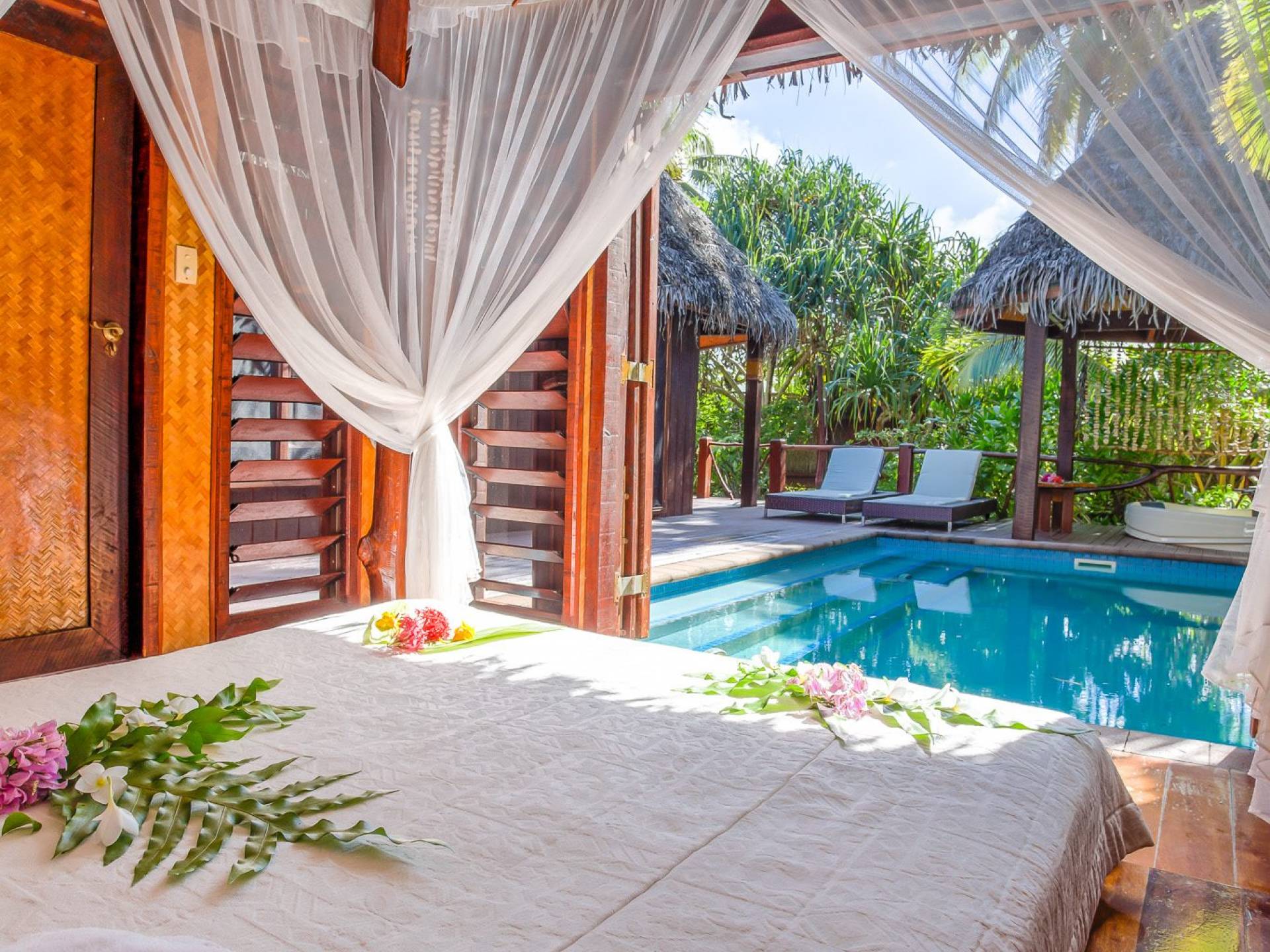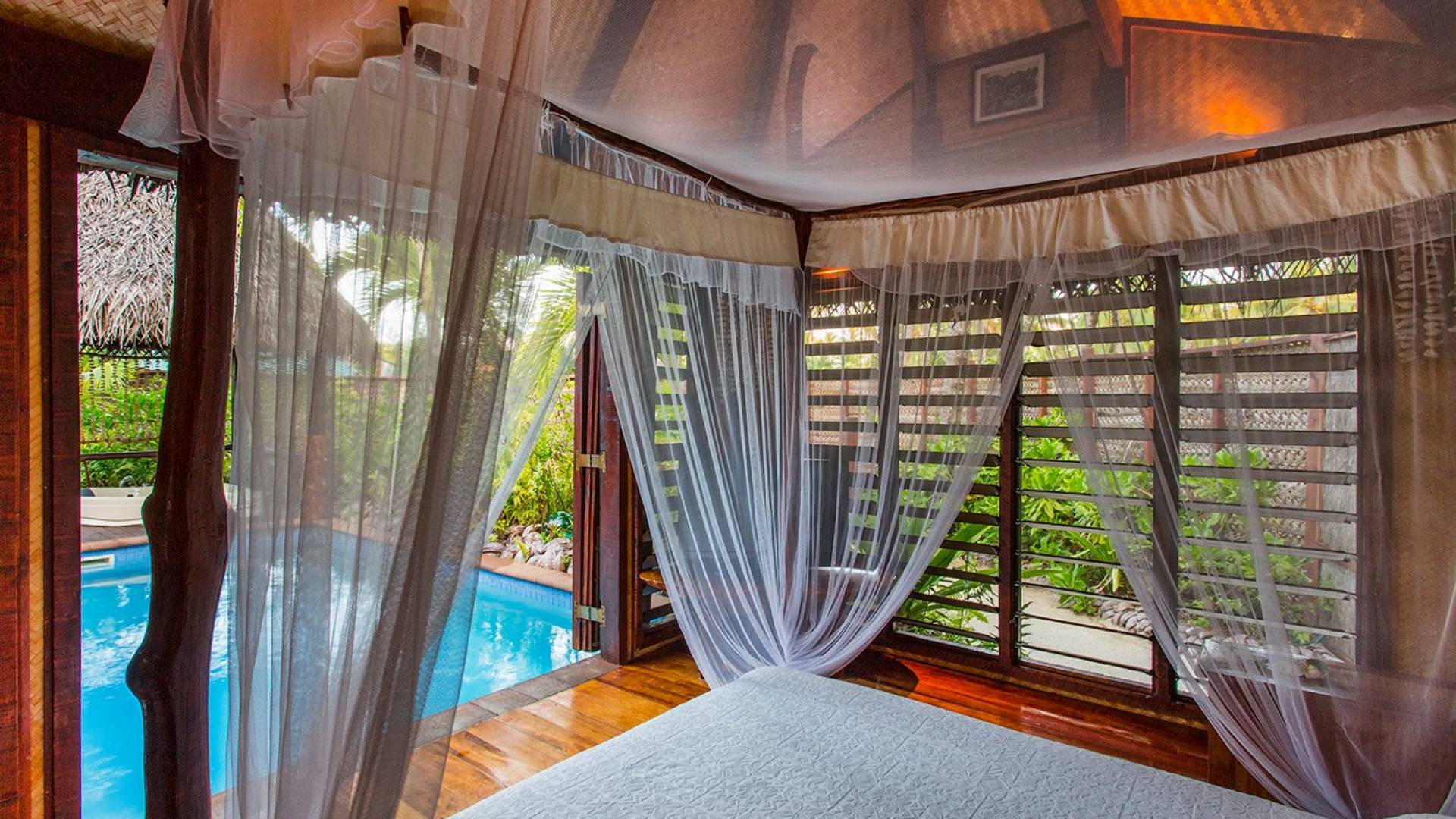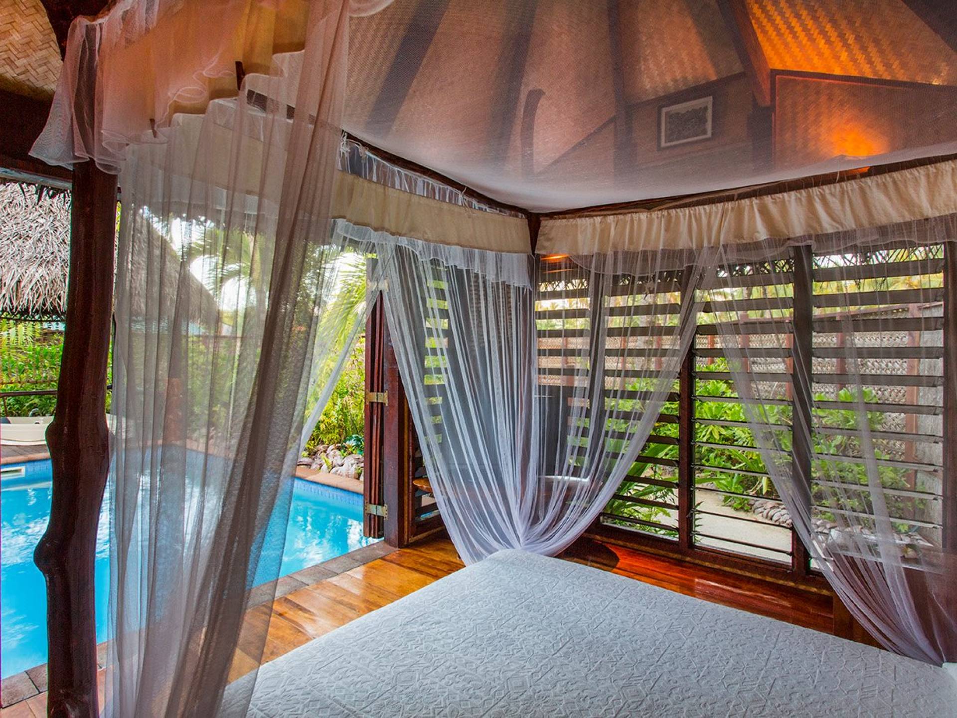 Immagina la laguna di Aitutaki, la laguna più bella del mondo. Ora immagina di soggiornare nella lussuosa villa con piscina privata di Aitutaki, Royal Honeymoon Pool Villa Te Arau, sulla tua incantevole isola privata, Motu Akitua Private Island. Royal Honeymoon Pool Villa Te Arau è uno splendido rifugio totalmente appartato adatto a un re e alla sua regina. Solo un viaggio di 2 minuti con un piccolo traghetto privato dall'isola principale di Aitutaki ti trasporta nel tuo esclusivo angolo di puro paradiso. Anche gli scrittori di viaggio stanchi insistono sul fatto che la laguna di Aitutaki è una destinazione "da vedere" prima di morire. Ora puoi davvero vivere la laguna più bella del mondo nel grembo di questa lussuosa villa con piscina totalmente privata. Chiamata Te Arau in onore della moglie preferita del leggendario navigatore polinesiano, Chief Ru, la Royal Honeymoon Pool Villa Te Arau è progettata per una lussuosa vita tropicale e dispone di un letto super king a baldacchino drappeggiato, bagno privato con gloriosa doccia all'aperto, aria condizionata, Wi-Fi, iPod dock + TV satellitare. La piscina privata è affiancata da una vasca idromassaggio idroterapica nel proprio padiglione da un lato e da un romantico padiglione con lettino in paglia dall'altro. Un terzo padiglione separato ospita la cucina di design completa con sala da pranzo interna/esterna. Completamente racchiusa nel suo lussureggiante giardino privato, la lussuosa Royal Honeymoon Pool Villa Te Arau, tropicale e tropicale, presenta legni pregiati dell'isola e conchiglie di perle nere accuratamente lavorate da artigiani locali per creare splendidi pavimenti e mobili.