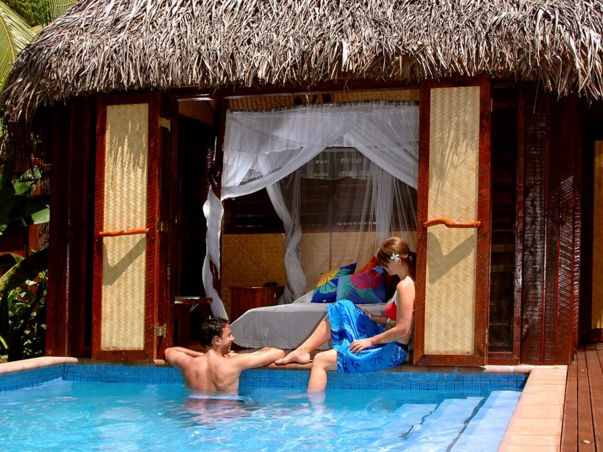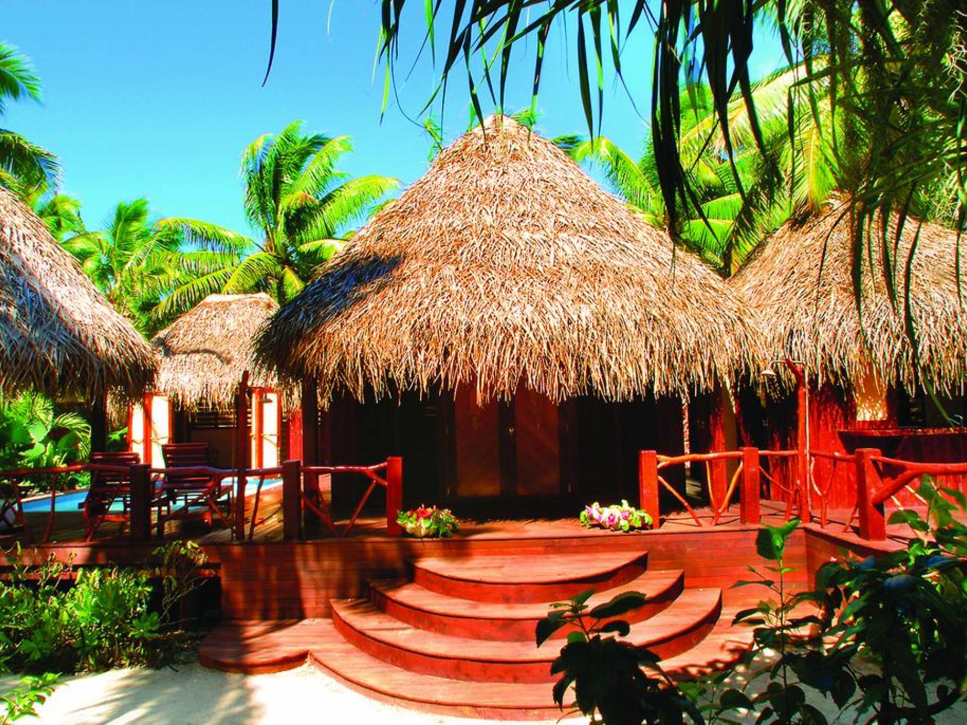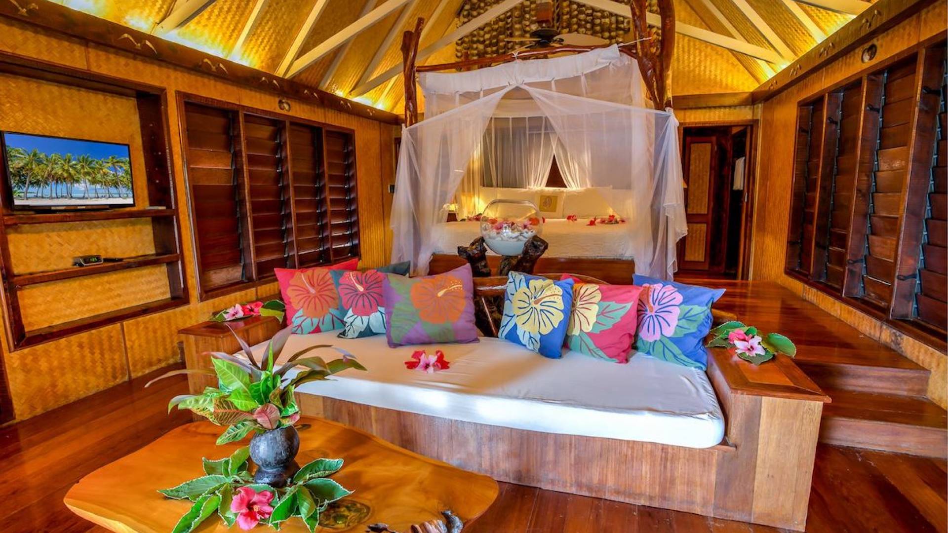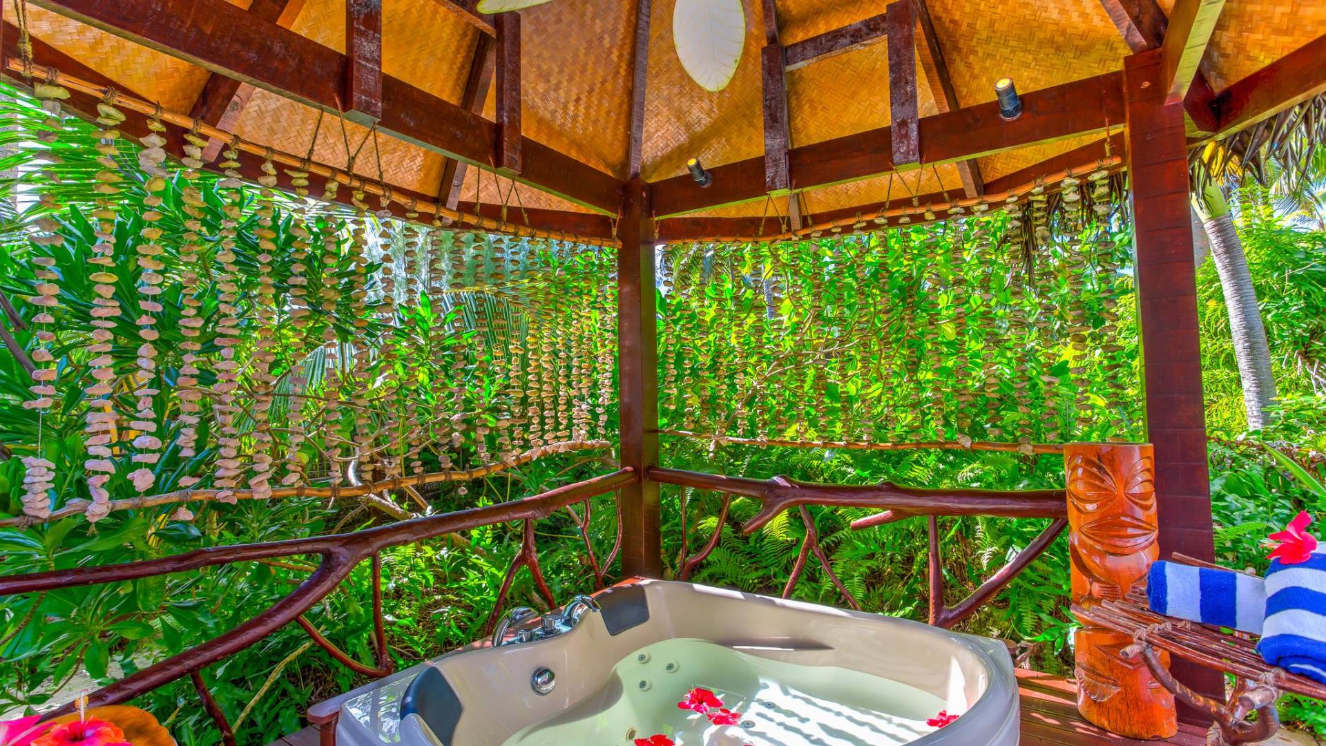 Immagina la laguna di Aitutaki, la laguna più bella del mondo. Ora immagina di soggiornare nella lussuosa villa con piscina privata di Aitutaki, Royal Honeymoon Pool Villa Te Arau, sulla tua incantevole isola privata, Motu Akitua Private Island. Royal Honeymoon Pool Villa Te Arau è uno splendido rifugio totalmente appartato adatto a un re e alla sua regina. Solo un viaggio di 2 minuti con un piccolo traghetto privato dall'isola principale di Aitutaki ti trasporta nel tuo esclusivo angolo di puro paradiso. Anche gli scrittori di viaggio stanchi insistono sul fatto che la laguna di Aitutaki è una destinazione "da vedere" prima di morire. Ora puoi davvero vivere la laguna più bella del mondo nel grembo di questa lussuosa villa con piscina totalmente privata. Chiamata Te Arau in onore della moglie preferita del leggendario navigatore polinesiano, Chief Ru, la Royal Honeymoon Pool Villa Te Arau è progettata per una lussuosa vita tropicale e dispone di un letto super king a baldacchino drappeggiato, bagno privato con gloriosa doccia all'aperto, aria condizionata, Wi-Fi, iPod dock + TV satellitare. La piscina privata è affiancata da una vasca idromassaggio idroterapica nel proprio padiglione da un lato e da un romantico padiglione con lettino in paglia dall'altro. Un terzo padiglione separato ospita la cucina di design completa con sala da pranzo interna/esterna. Completamente racchiusa nel suo lussureggiante giardino privato, la lussuosa Royal Honeymoon Pool Villa Te Arau, tropicale e tropicale, presenta legni pregiati dell'isola e conchiglie di perle nere accuratamente lavorate da artigiani locali per creare splendidi pavimenti e mobili.