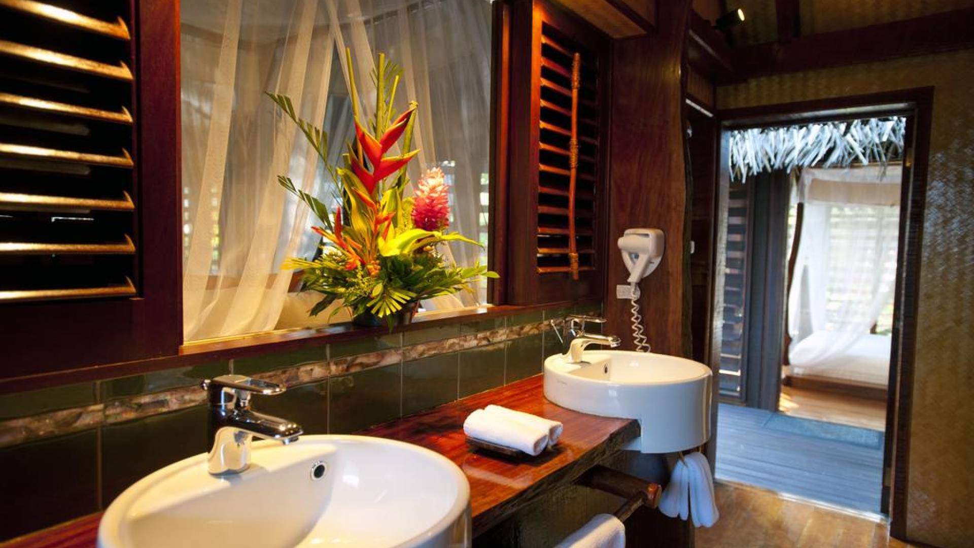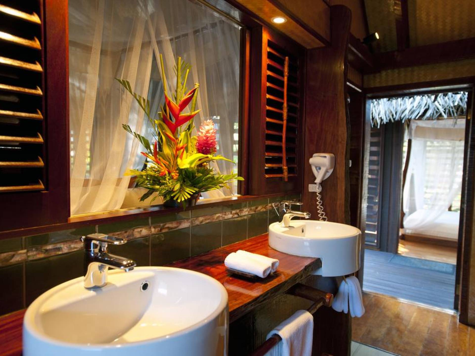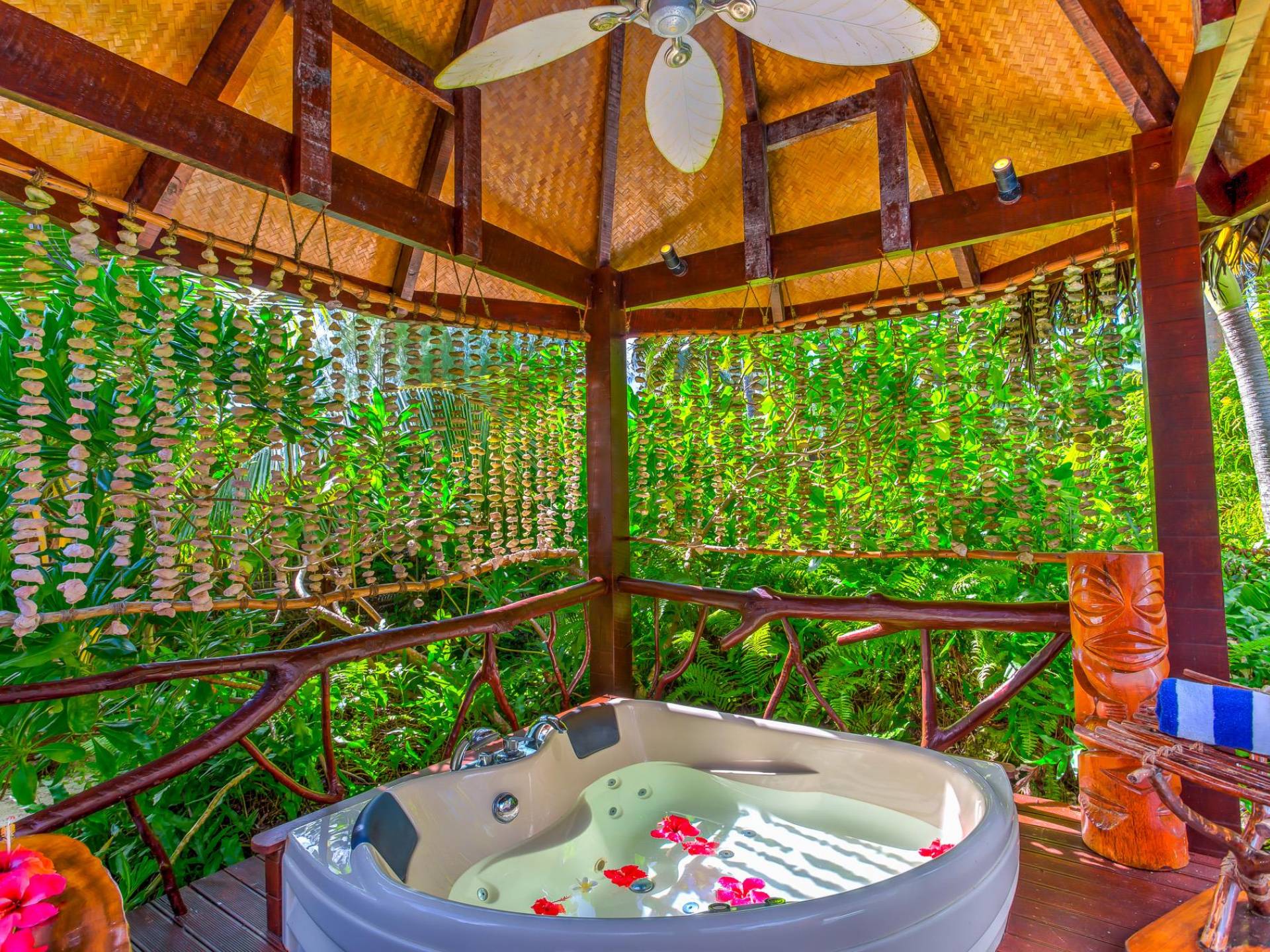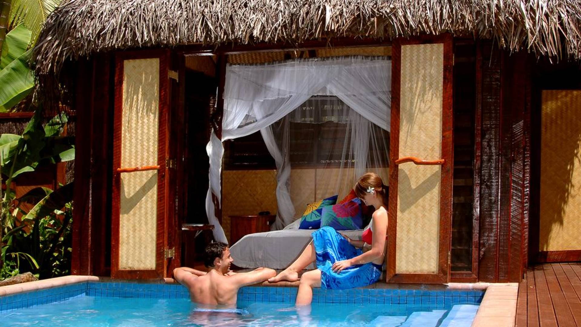 Immagina la laguna di Aitutaki, la laguna più bella del mondo. Ora immagina di soggiornare nella lussuosa villa con piscina privata di Aitutaki, Royal Honeymoon Pool Villa Te Arau, sulla tua incantevole isola privata, Motu Akitua Private Island. Royal Honeymoon Pool Villa Te Arau è uno splendido rifugio totalmente appartato adatto a un re e alla sua regina. Solo un viaggio di 2 minuti con un piccolo traghetto privato dall'isola principale di Aitutaki ti trasporta nel tuo esclusivo angolo di puro paradiso. Anche gli scrittori di viaggio stanchi insistono sul fatto che la laguna di Aitutaki è una destinazione "da vedere" prima di morire. Ora puoi davvero vivere la laguna più bella del mondo nel grembo di questa lussuosa villa con piscina totalmente privata. Chiamata Te Arau in onore della moglie preferita del leggendario navigatore polinesiano, Chief Ru, la Royal Honeymoon Pool Villa Te Arau è progettata per una lussuosa vita tropicale e dispone di un letto super king a baldacchino drappeggiato, bagno privato con gloriosa doccia all'aperto, aria condizionata, Wi-Fi, iPod dock + TV satellitare. La piscina privata è affiancata da una vasca idromassaggio idroterapica nel proprio padiglione da un lato e da un romantico padiglione con lettino in paglia dall'altro. Un terzo padiglione separato ospita la cucina di design completa con sala da pranzo interna/esterna. Completamente racchiusa nel suo lussureggiante giardino privato, la lussuosa Royal Honeymoon Pool Villa Te Arau, tropicale e tropicale, presenta legni pregiati dell'isola e conchiglie di perle nere accuratamente lavorate da artigiani locali per creare splendidi pavimenti e mobili.