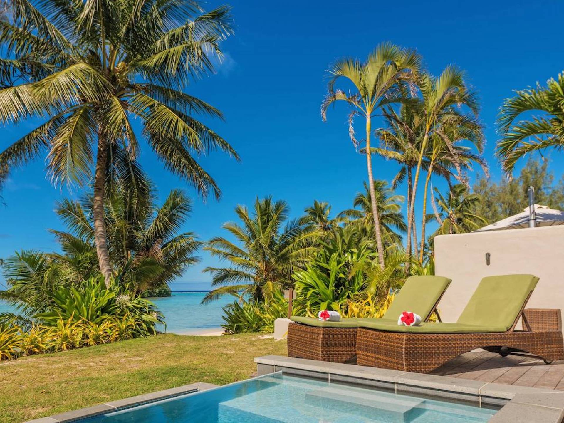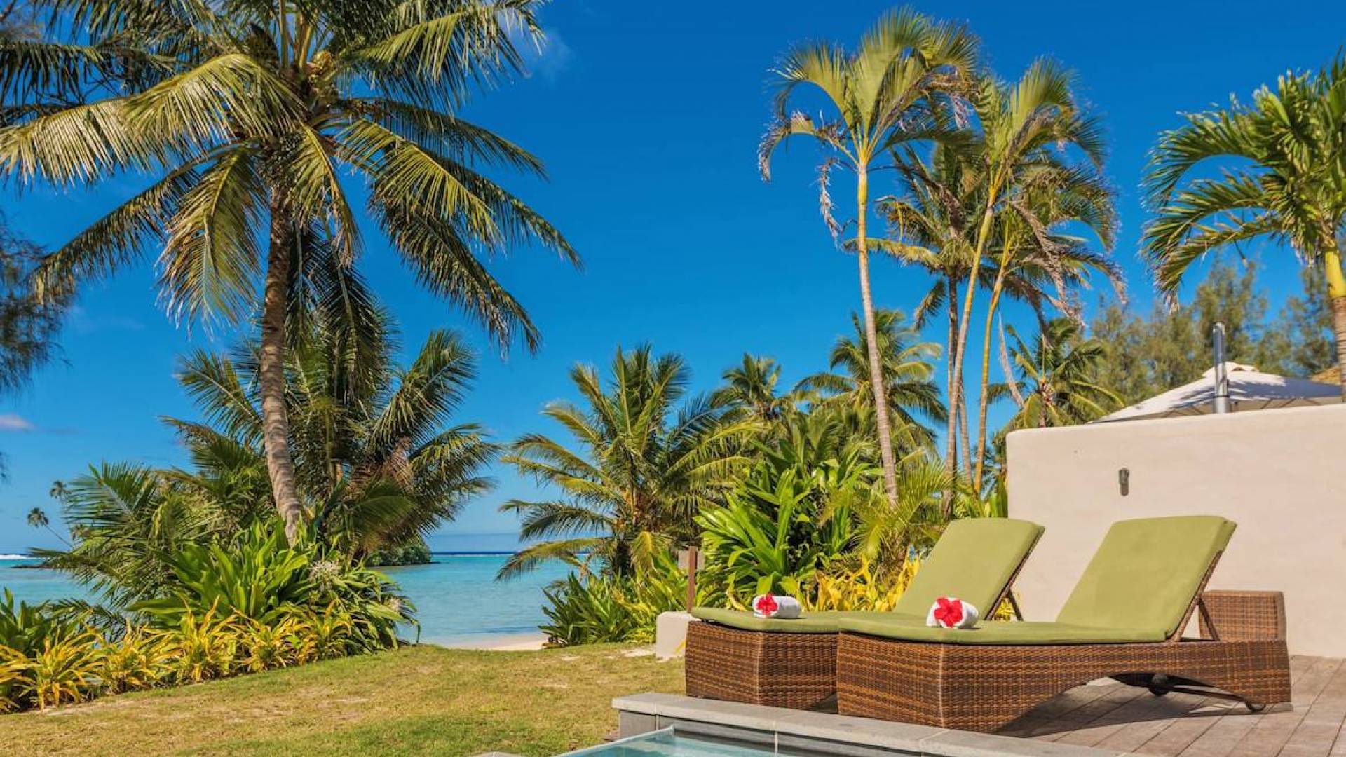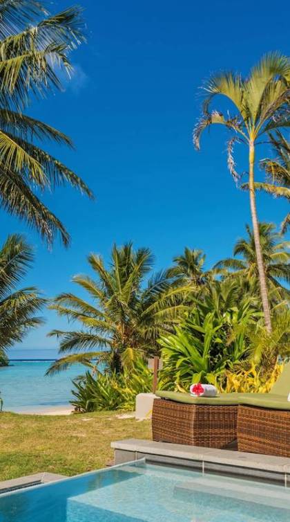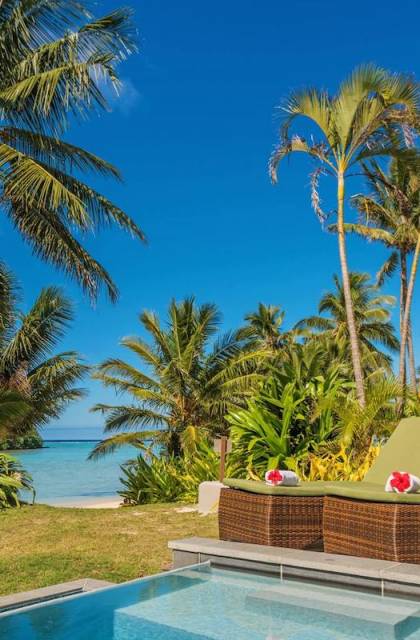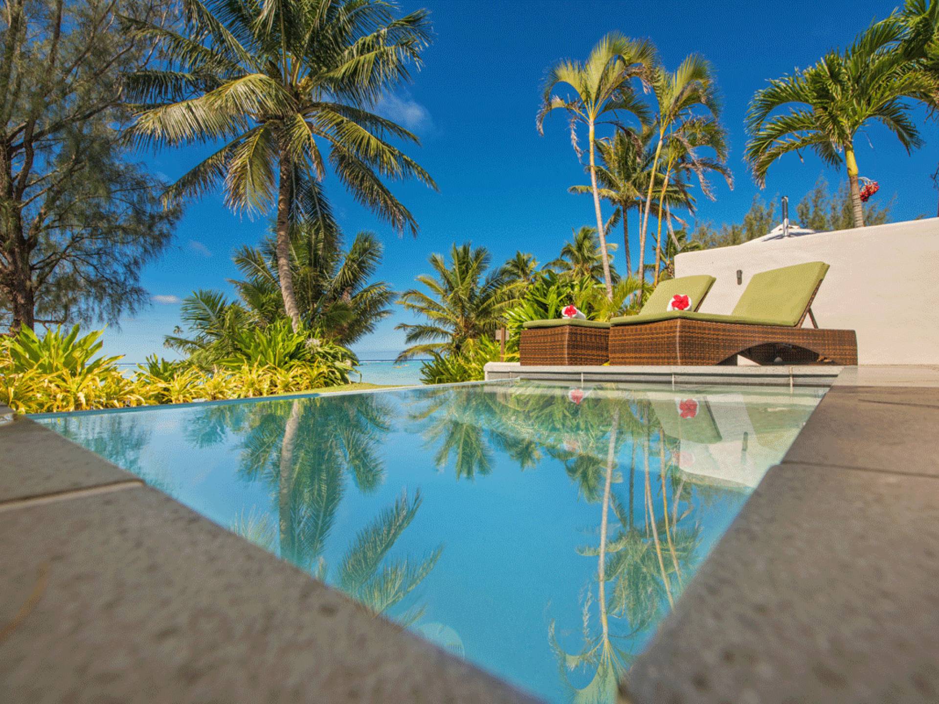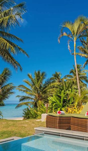 Immerso tra le palme con la vista più straordinaria sulle acque turchesi della laguna di Muri e a un passo dalle sabbie bianche, i tuoi 120 m²/1290 mq. ft. L'esclusiva suite in stile polinesiano Are'si apre su un ampio ponte che incorpora la tua piscina di acqua salata e con lettini prendisole e sala da pranzo riccamente arredati.