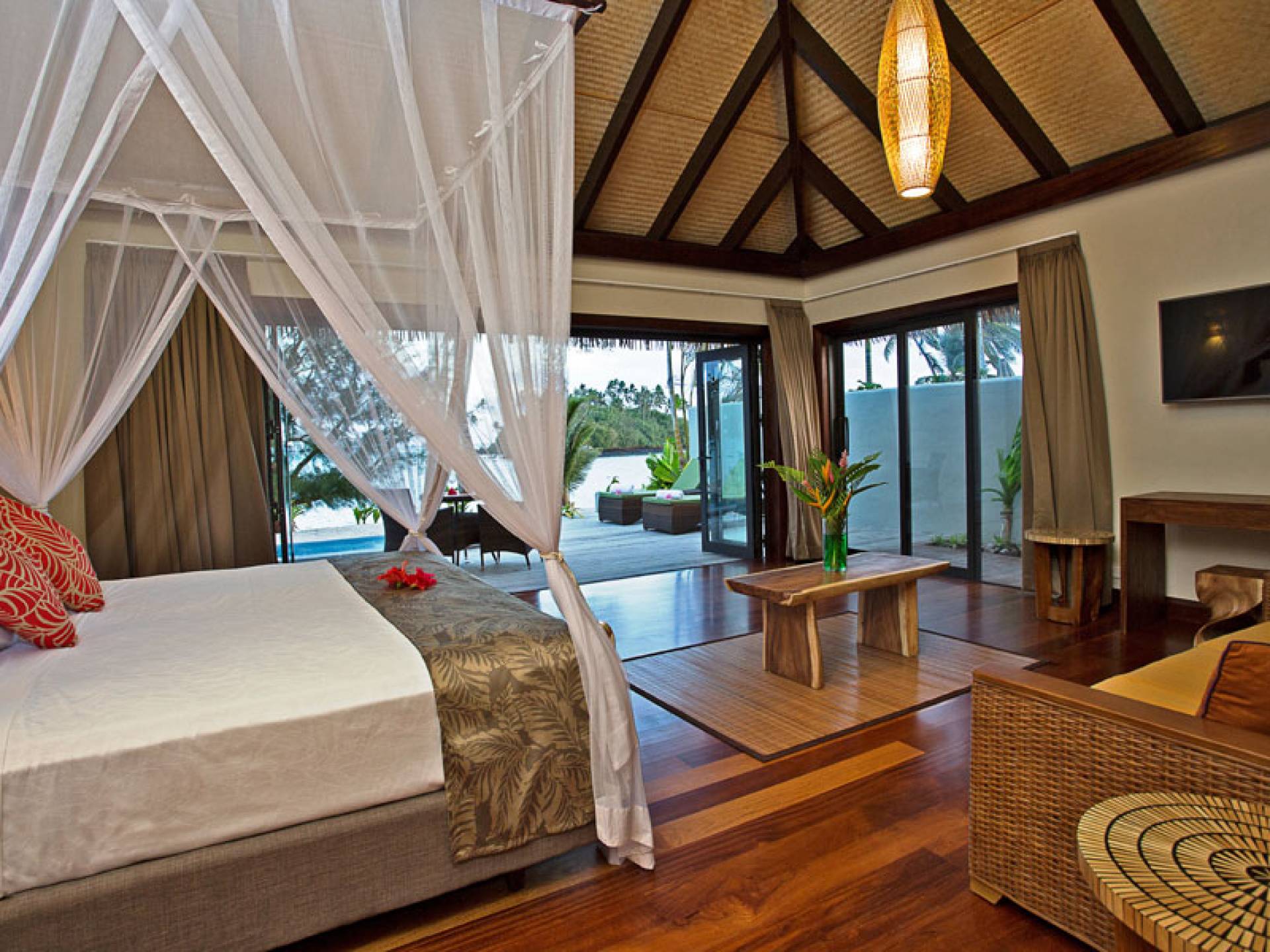 La privacy è fondamentale in queste ville progettate con cura. Gli spaziosi interni delle ville sono stati progettati e decorati per riflettere la posizione dell'isola tropicale e il clima abbracciando importanti caratteristiche del design polinesiano come una transizione senza soluzione di continuità dall'interno all'esterno e soffitti alti per garantire il massimo comfort in condizioni tropicali.