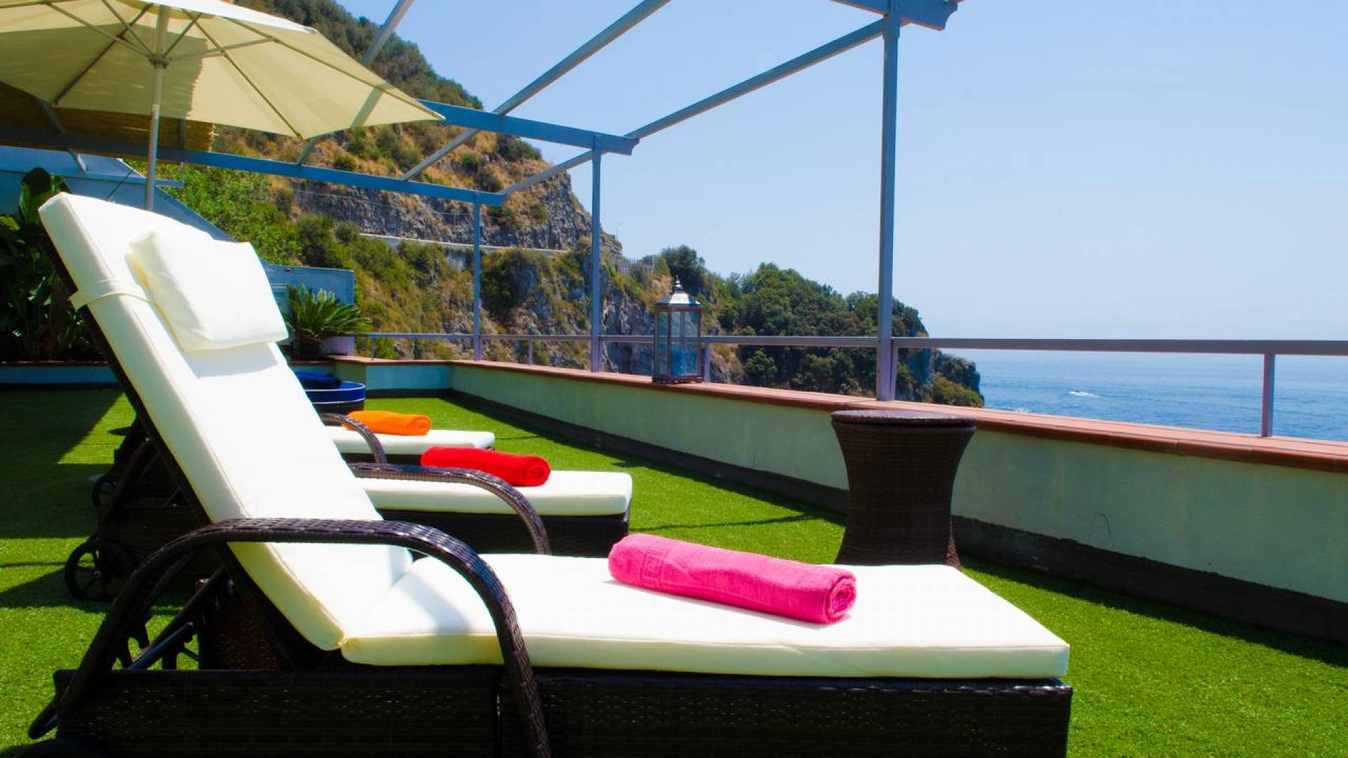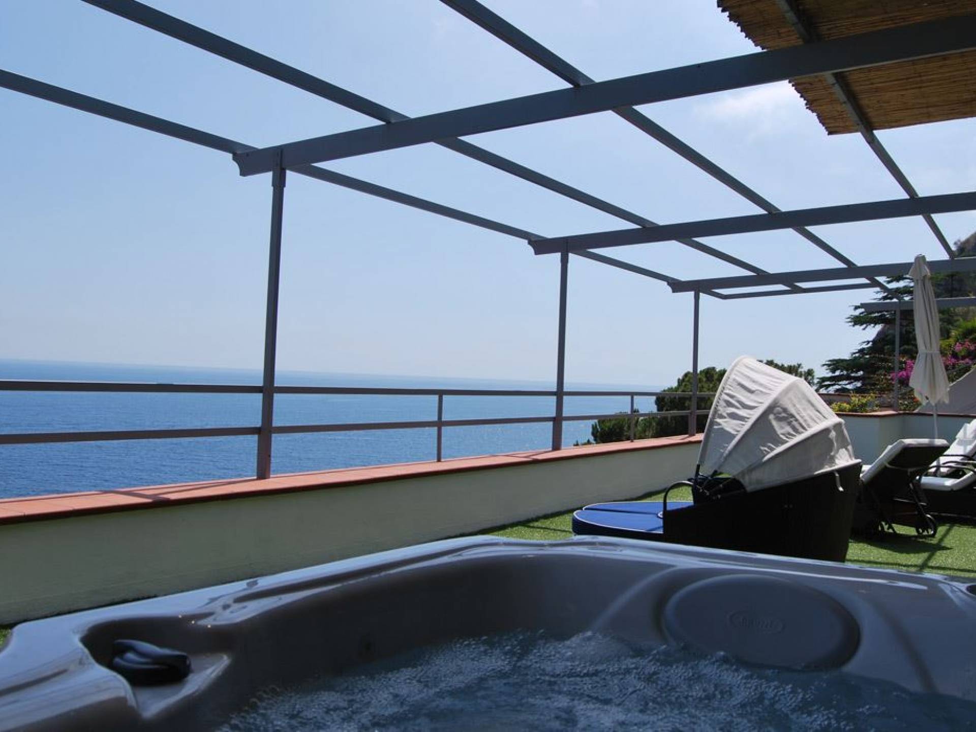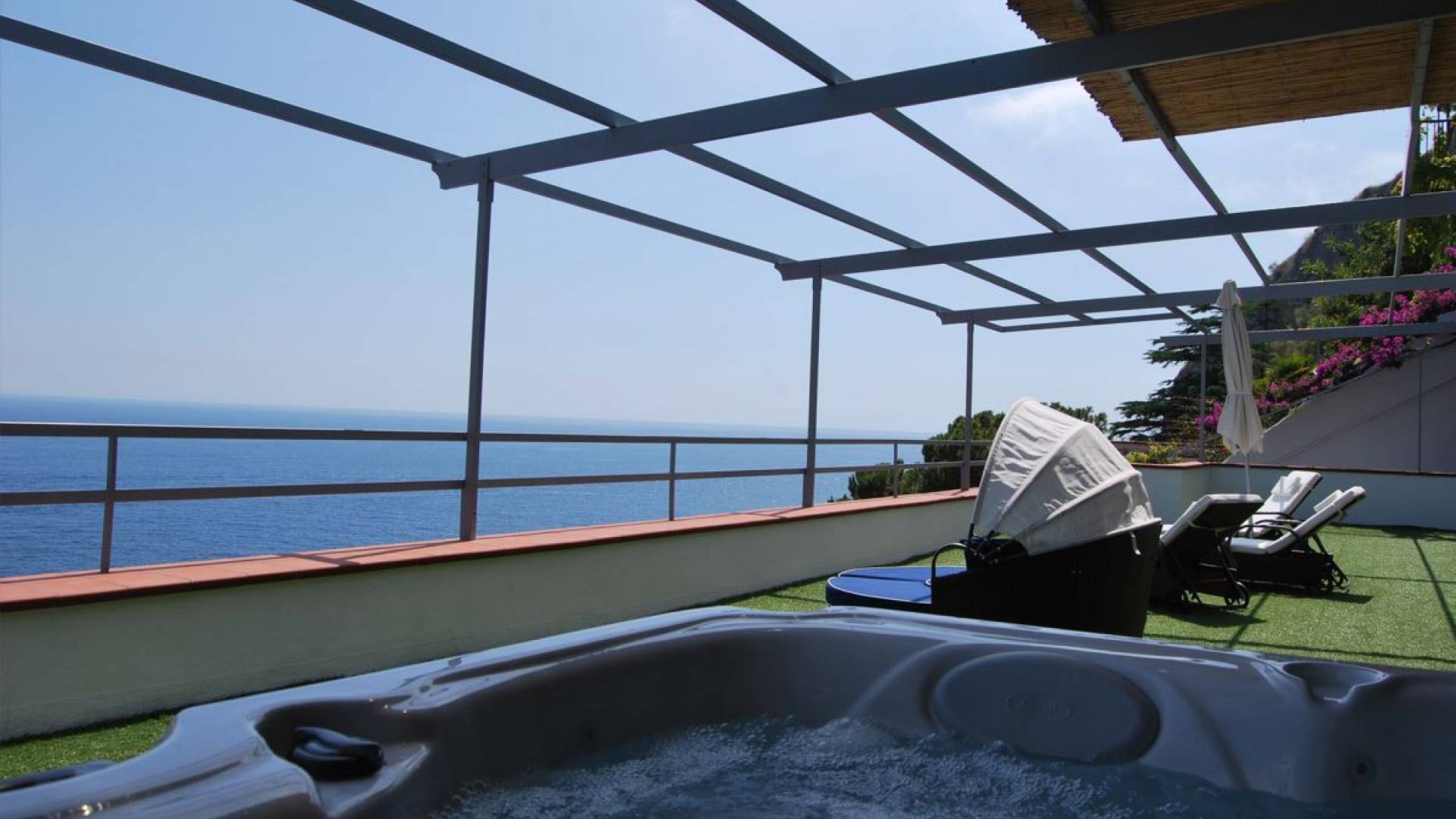 Le emozioni continuano all'esterno, dove gli ospiti hanno a disposizione tre terrazze ben attrezzate con vista mare. Il primo è arredato con vasca idromassaggio Jacuzzi 6 posti + chaise longue, doccia, sdraio, e un comodo grande divano circolare. La terrazza principale di Villa Elizabeth è uno spettacolo di pura suggestione, con i suoi colori e la vista a 180 gradi sul mare della Costiera Amalfitana. Rifinito con un pregiato pavimento in cotto, il terrazzo è attrezzato con un grande tavolo circolare in marmo decorato a mano e sedie in ferro battuto, per offrire agli ospiti la possibilità di trascorrere momenti indimenticabili a cena o in qualsiasi altro momento della giornata. Sulla terrazza principale si trova anche un angolo con frigorifero esterno, lavabo, piano di lavoro e barbecue in acciaio, ideale per fare una grigliata al chiaro di luna.