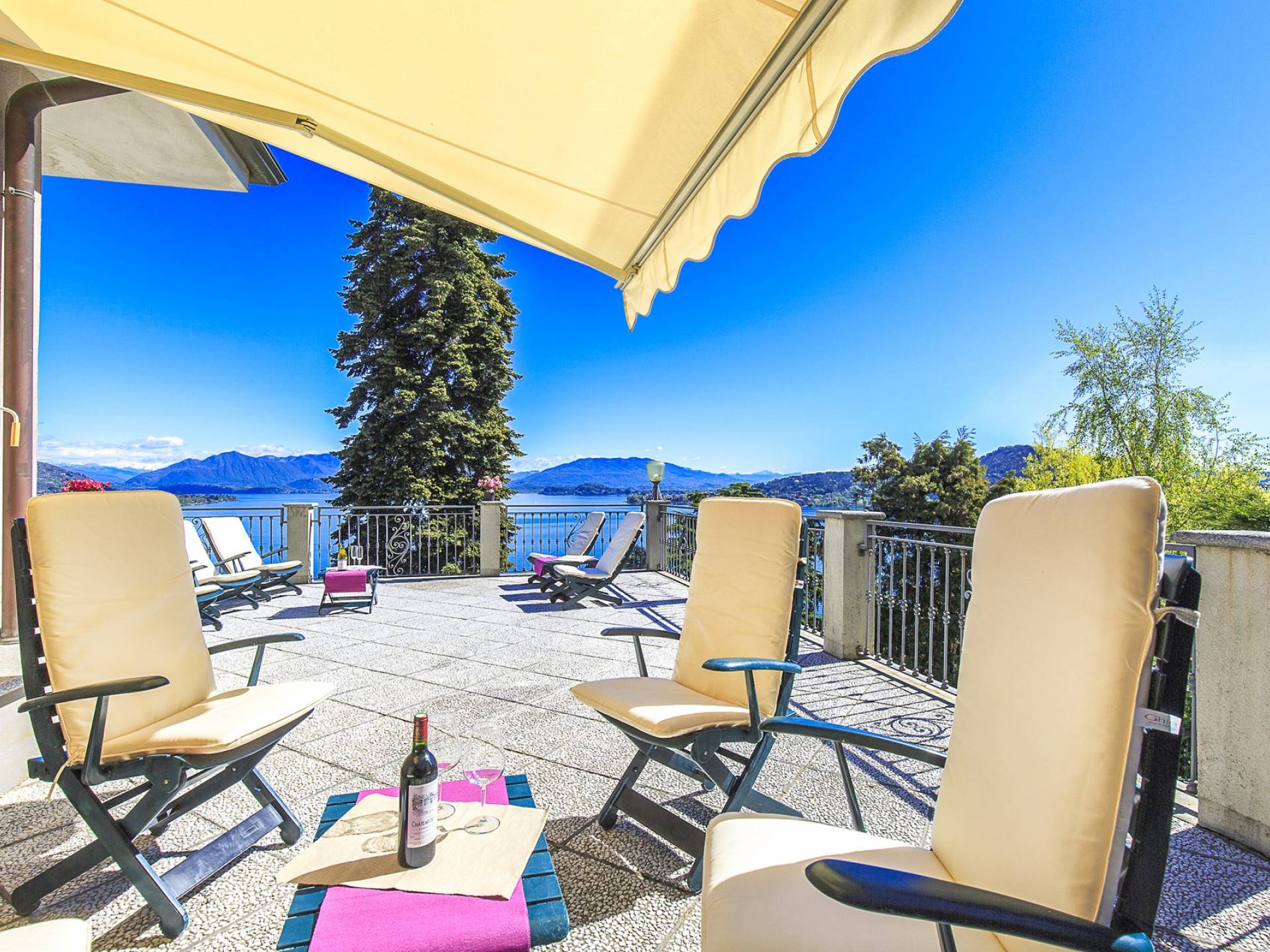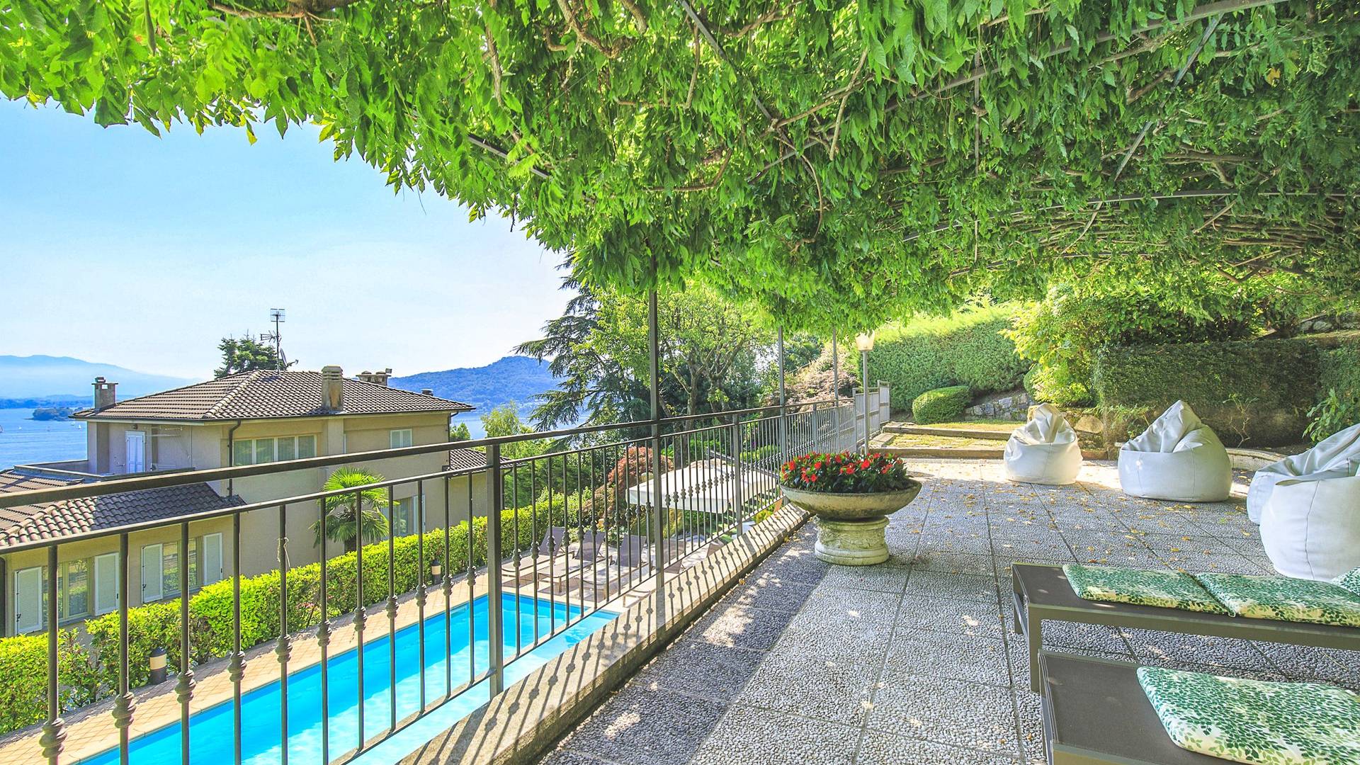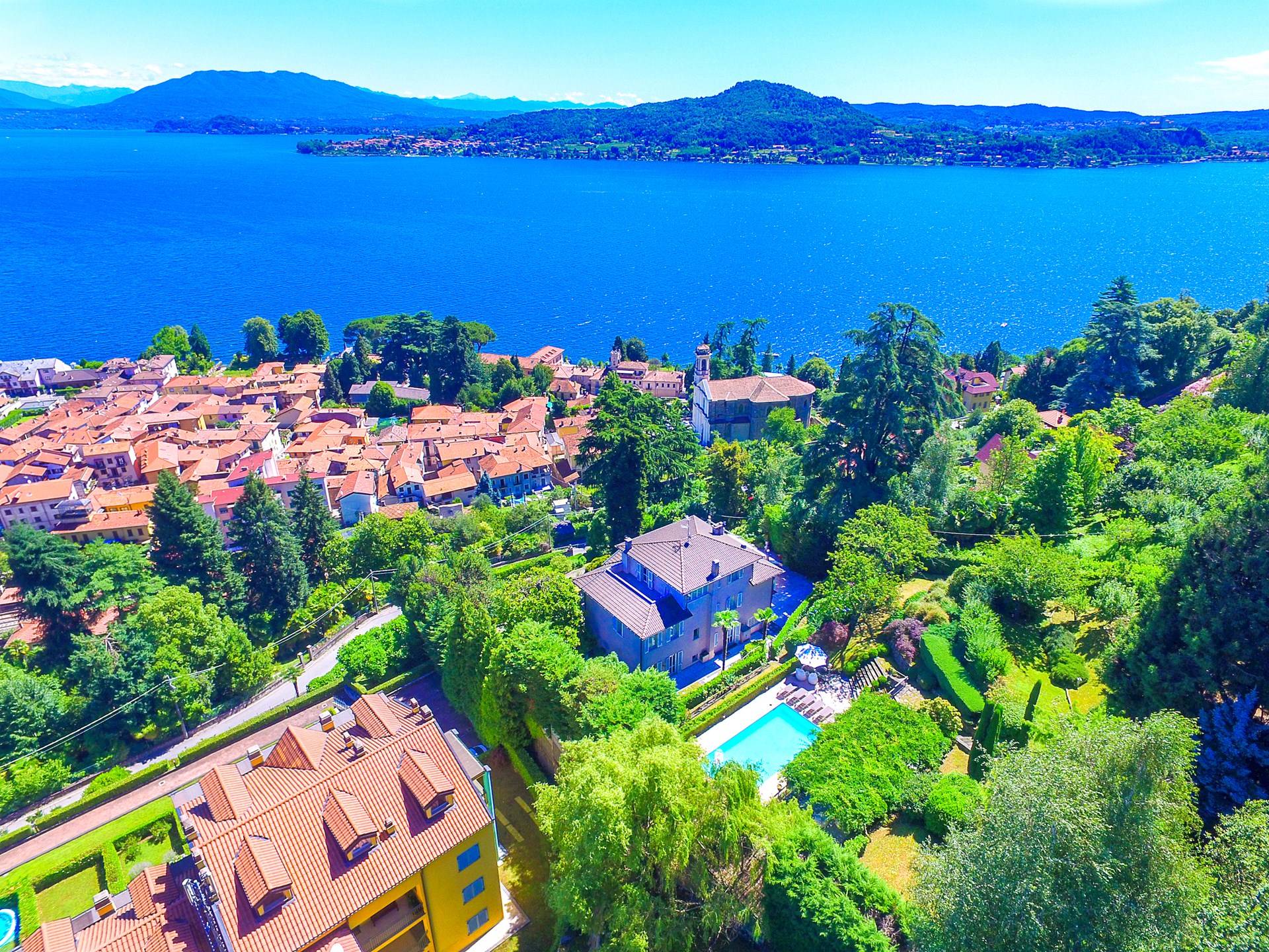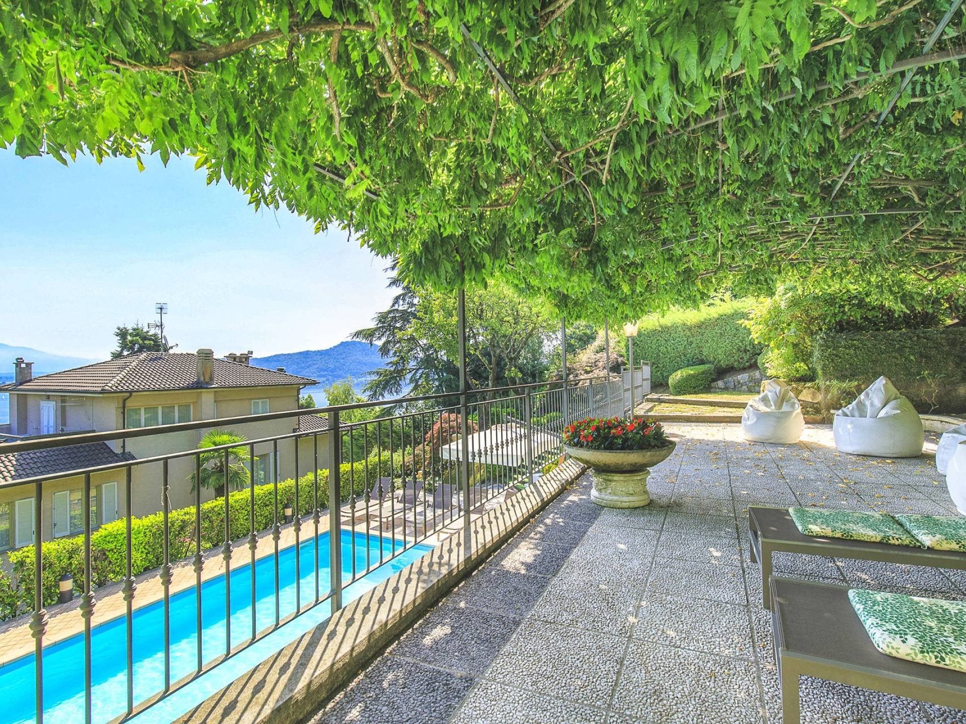 Il cortile a terrazze (4000 m²) è ben curato con un roseto, angoli appartati e una piscina con annesso pool house con spogliatoio, bagno e frigorifero. Affacciata sulla piscina è una grande terrazza ricoperta di viti con sedie a sdraio e pouf e viste mozzafiato. Puoi goderti la musica in piscina grazie al sistema Bluetooth e alla connessione internet wireless. La villa per vacanze Belvedere è situata su una collina panoramica a pochi passi (400m) dal centro del paese di Meina, dove si trovano un supermercato con un reparto salumeria, un giornalaio e tabacchi, una macelleria, un parrucchiere, un panificio, un negozio di souvenir, un'eccellente cantina di vini e alcuni ristoranti. A pochi passi dal centro si trovano la spiaggia pubblica di Meina e il suo ristorante-pizzeria alla moda Meina Beach. La stazione ferroviaria di Meina dista solo 1 km.