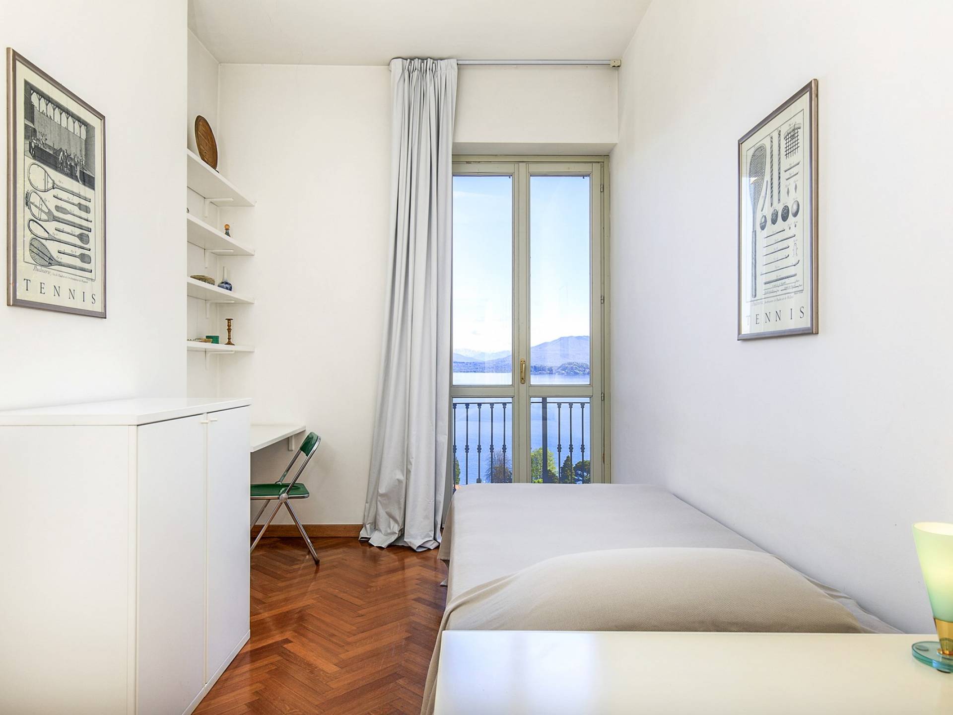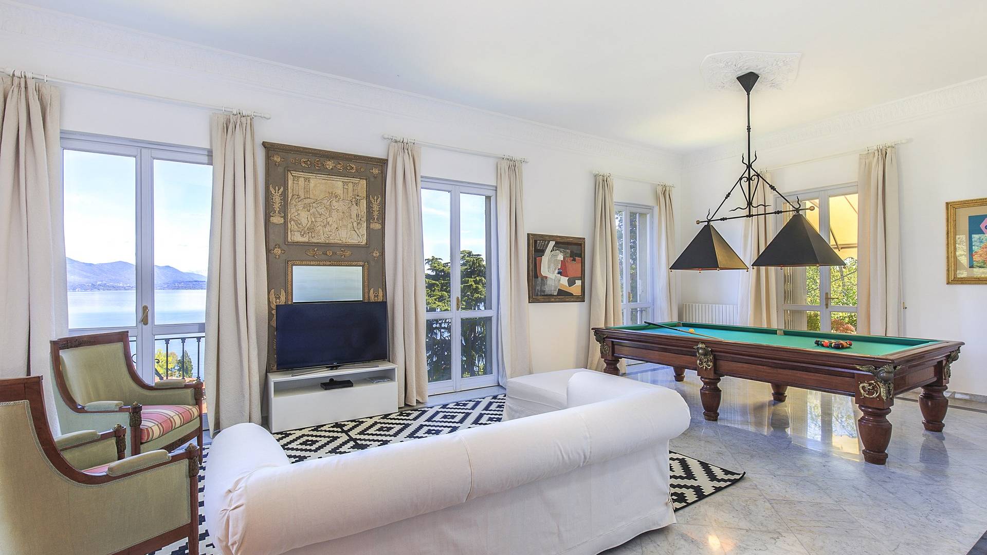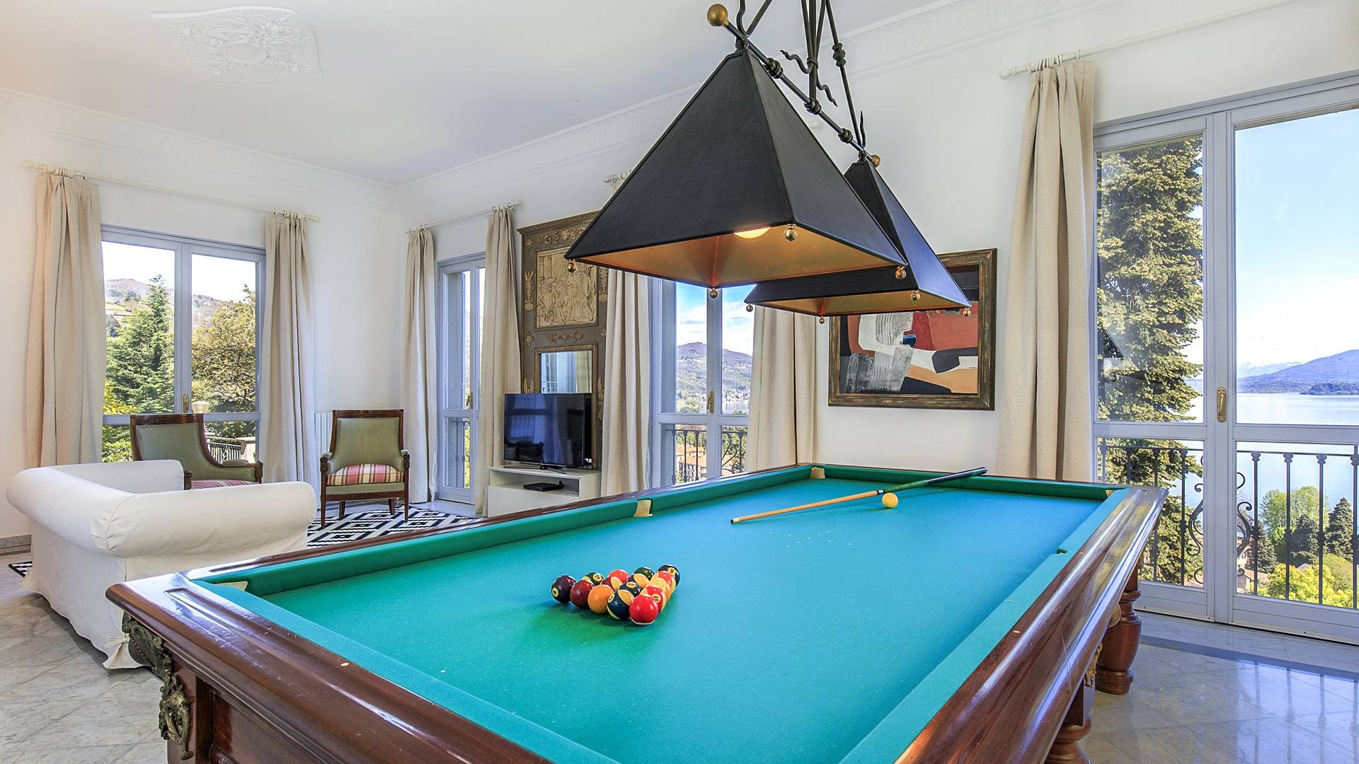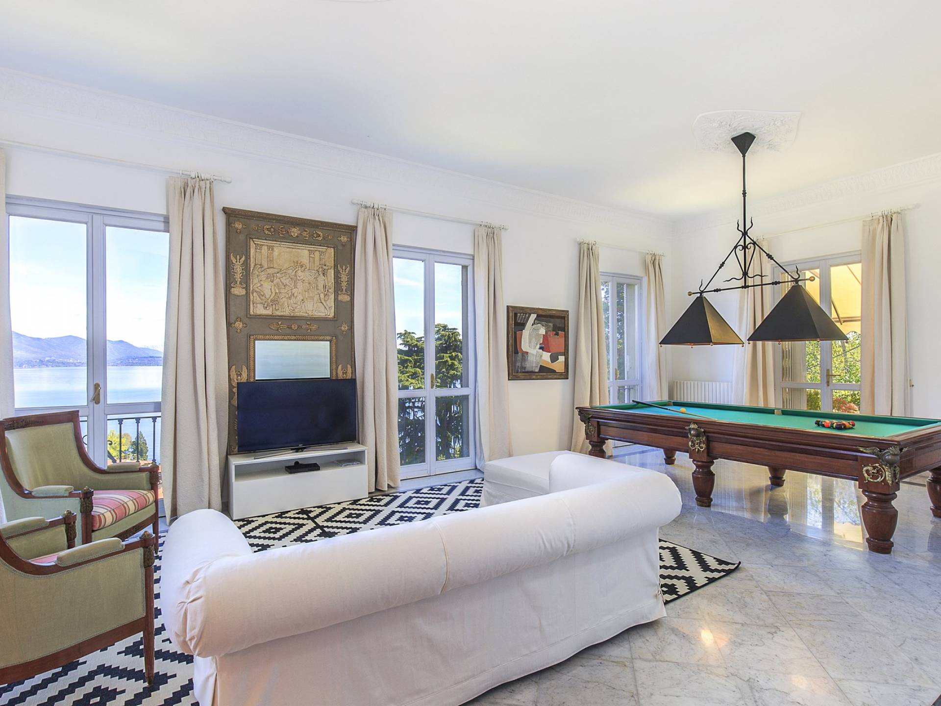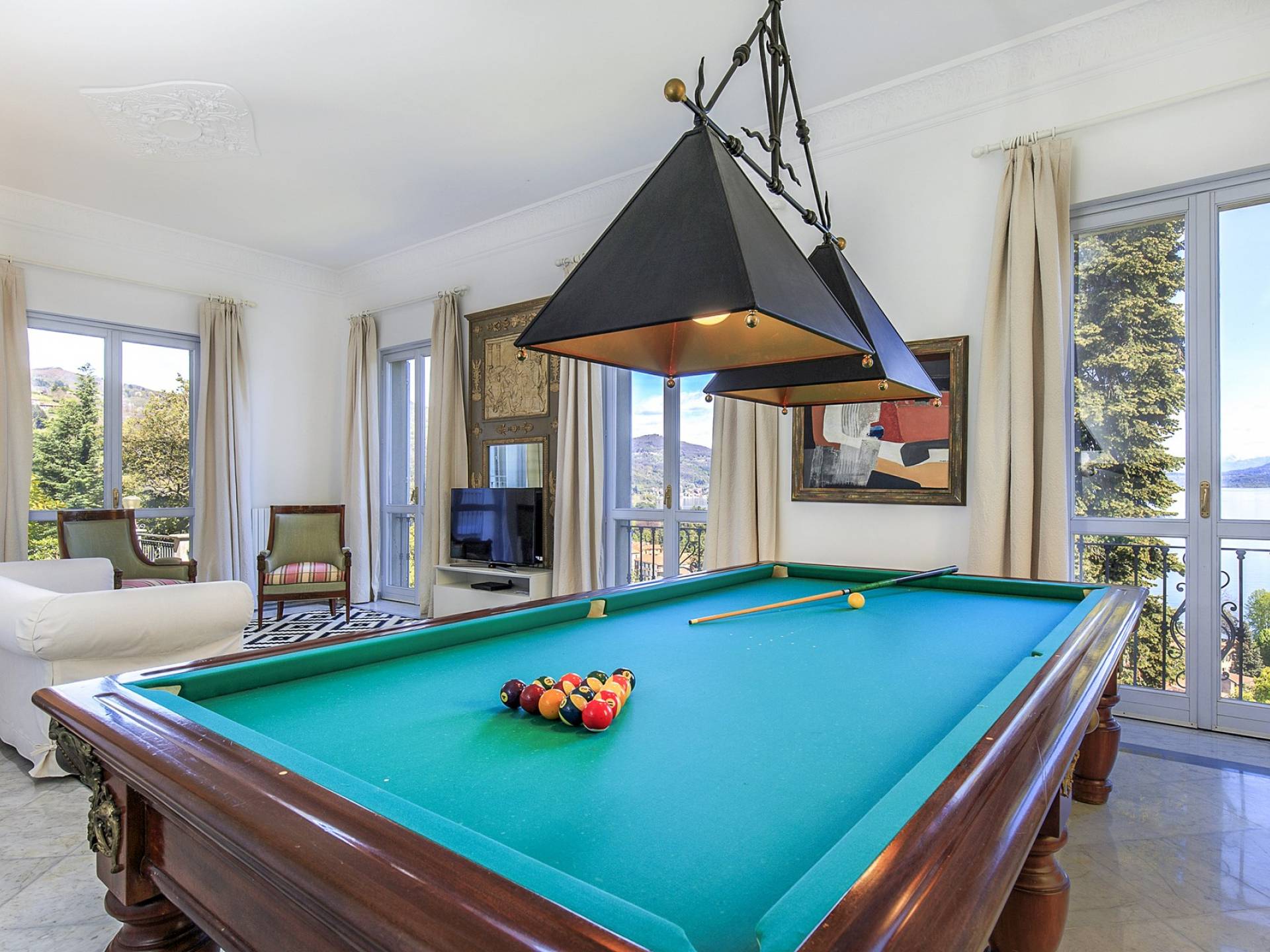 Al piano terra troverete un salone con camino, una biblioteca attrezzata con TV e PlayStation, una sala ufficio con scrivania, una cucina completamente attrezzata con adiacente zona colazione, una spaziosa sala da pranzo e un ampio soggiorno camera. La sala da pranzo ha un tavolo che può ospitare 10 persone e ha accesso alla terrazza laterale per gustare i pasti all'aperto. Il soggiorno è luminoso e accogliente con divani, smart tv, tavolo da biliardo e ampie finestre vista lago. Al primo piano si trovano 6 camere da letto climatizzate e 4 bellissimi bagni in marmo: una camera padronale con letto matrimoniale e TV e accesso a due bagni adiacenti (uno con vasca e uno con doccia) e ad una camera con letto a castello (un extra singolo letto aggiunto su richiesta), due camere con 2 letti singoli (una camera ha anche la TV), una camera con letto singolo, una camera con letto matrimoniale, due bagni ciascuno con doccia e vasca. C'è anche un ampio terrazzo fronte lago con mobili da esterno per rilassarsi e ammirare il panorama sul Lago Maggiore. Al piano seminterrato troverete una lavanderia con lavatrice e asciugatrice e un garage con parcheggio per 2 auto.