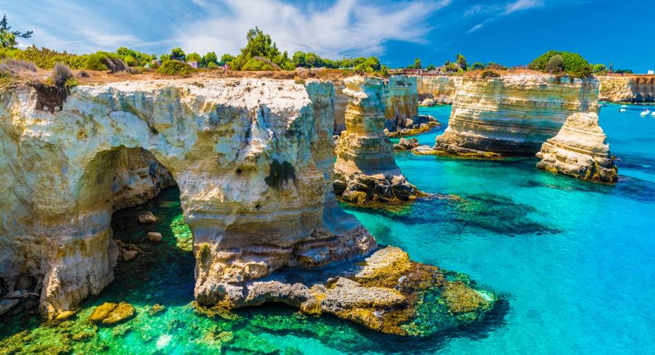 Sede di alcune delle splendide spiagge italiane e della costa rocciosa più spettacolare, il Salento è un paradiso per gli amanti del mare. Da Leuca a Gallipoli e oltre, la striscia di sabbia dorata di acque azzurre trasparenti affascinerà ogni visitatore. A est, la costa adriatica è più varia, offrendo spiagge sabbiose, grotte, scogliere e lagune di acqua salata. Grazie alla temperatura calda durante tutto l'anno, il Salento è una meta ideale non solo sui monti estivi ma tutto l'anno. Quindi, se stai cercando una meta di vacanza con un clima fantastico, spiagge da sogno, bellissime città storiche, cibo e vino delizioso e divertimento per tutta la famiglia, hai trovato la tua destinazione ideale!