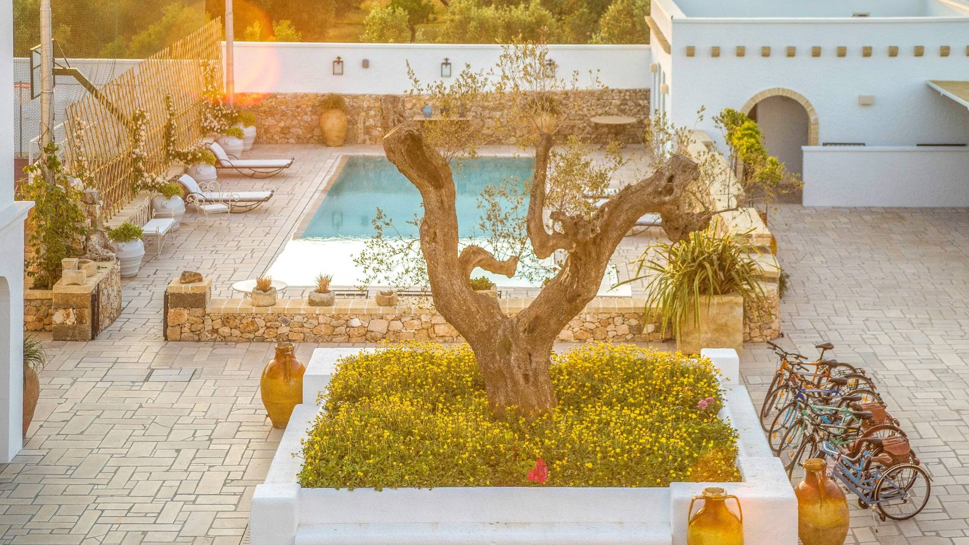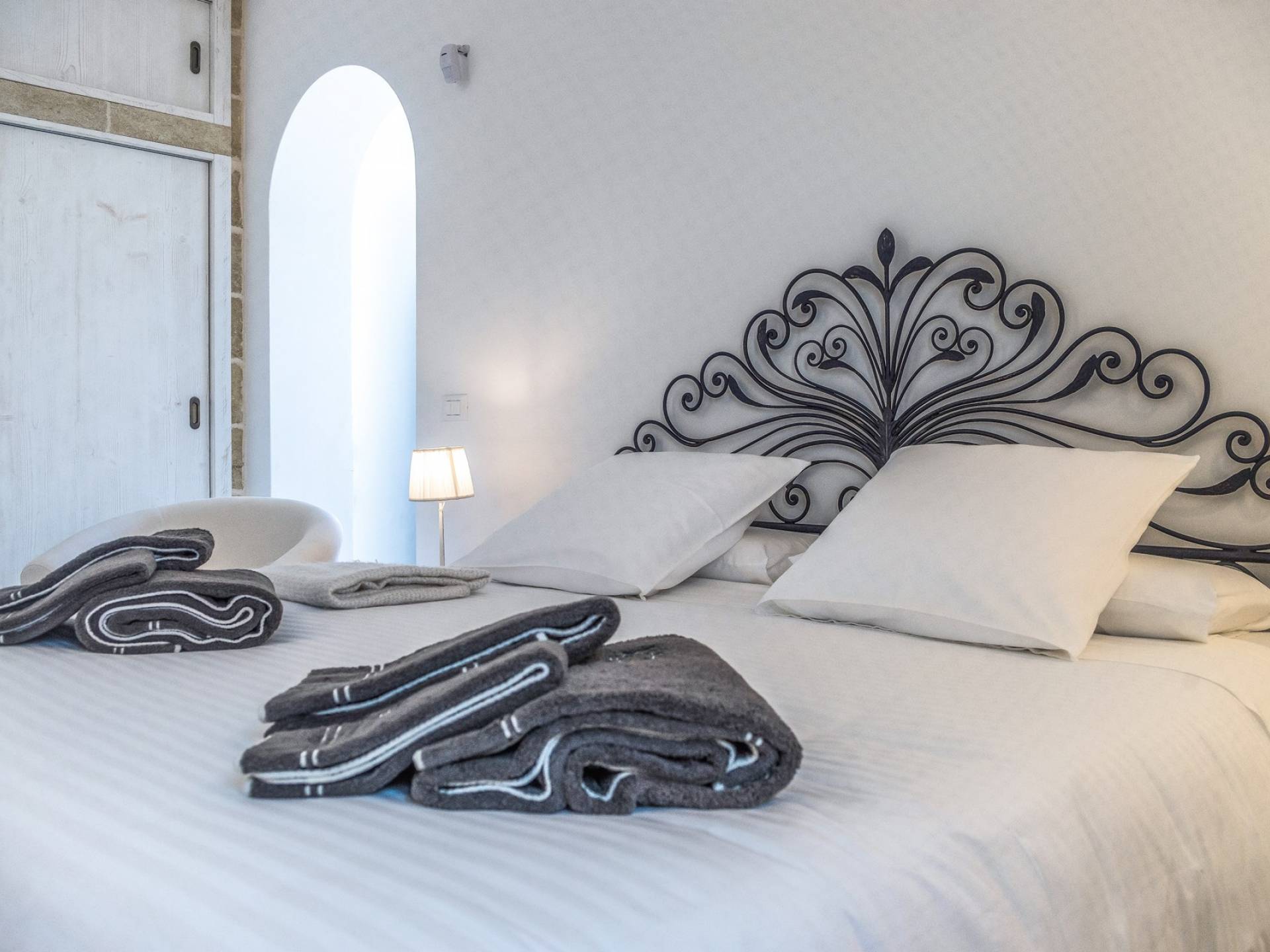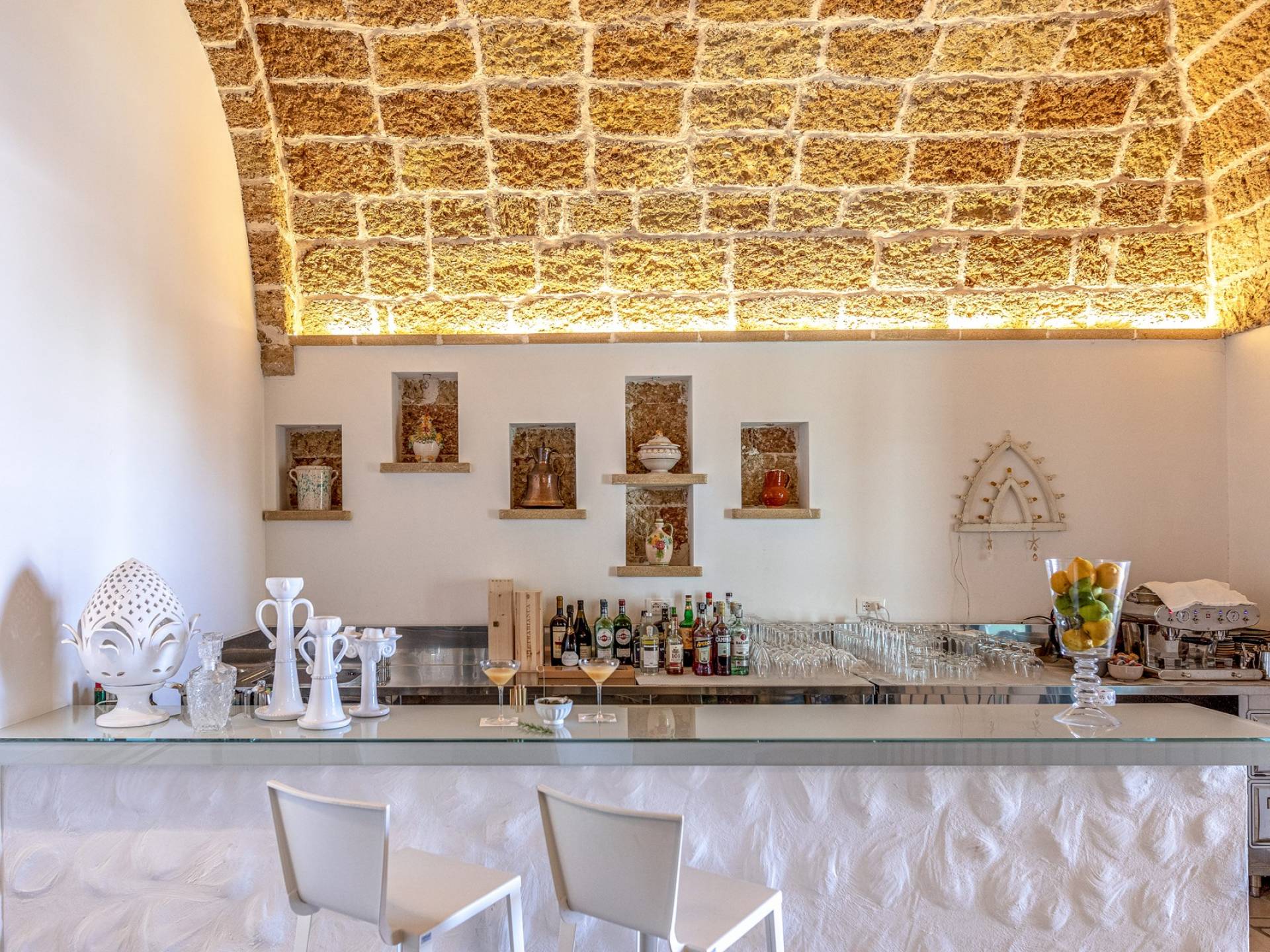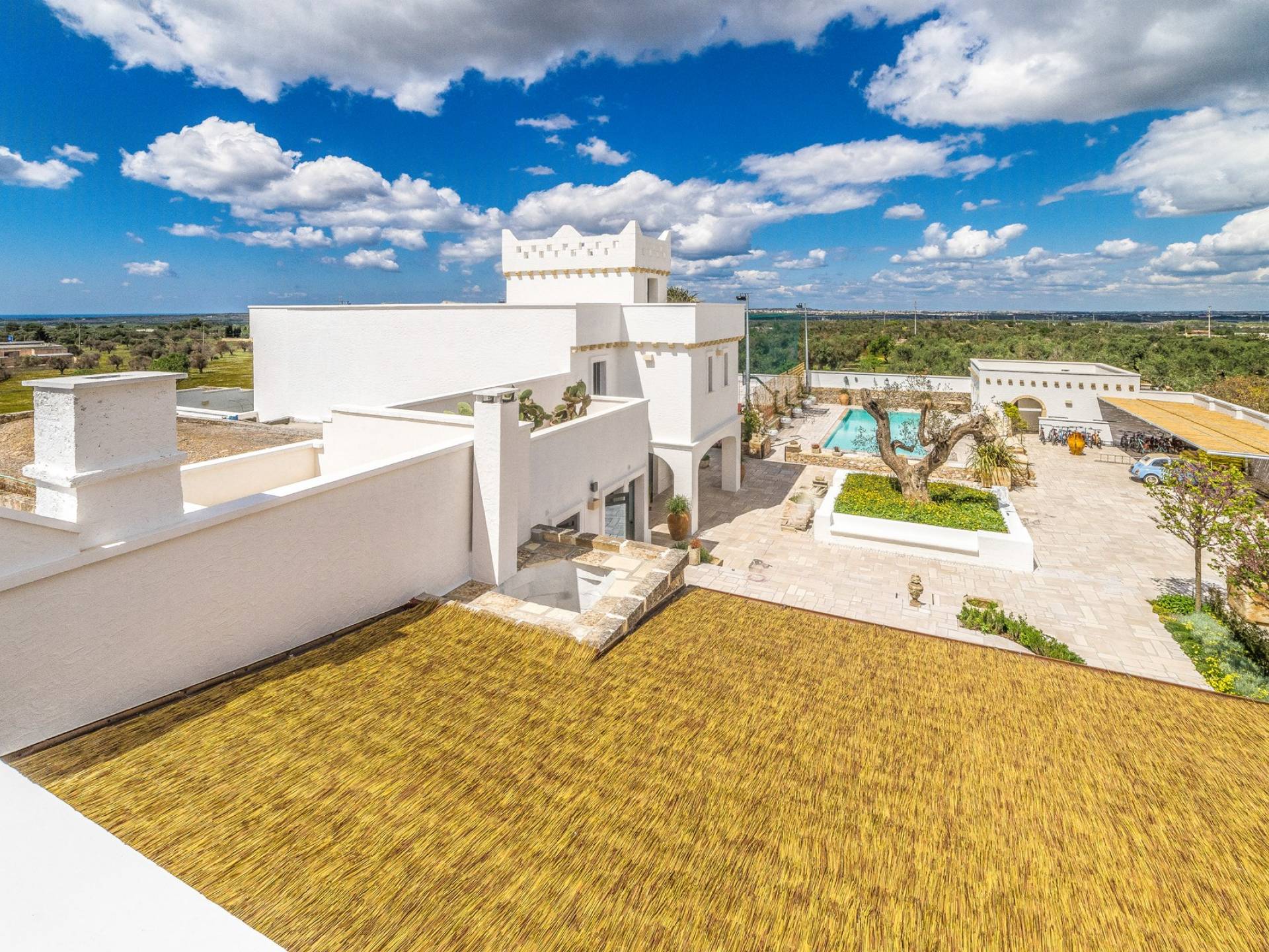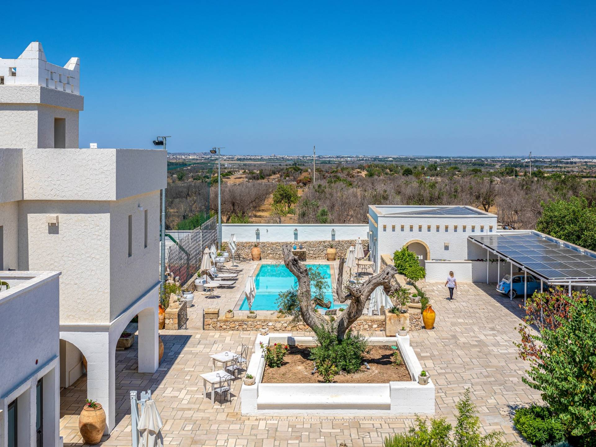 Sull'ampio terreno, c'è una piscina a sfioro con lettini per tutti gli ospiti, un campo sportivo e un cortile interno che ospita un ulivo centenario. A ridosso del centro cittadino, gli interni della Masseria comprendono un soggiorno, un lounge bar, una sala colazione/pranzo, una palestra e un totale di quattordici camere matrimoniali di diversa tipologia. Il design della casa, affrontato con ricerca nel contesto storico, mescola mobili di design ed elementi restaurati con le caratteristiche originali che questa proprietà conserva, risultando in uno stile eclettico con pietra locale di alta qualità e intonaco bianco incontaminato. I soffitti a volta immacolati conferiscono un tocco leggero agli interni.